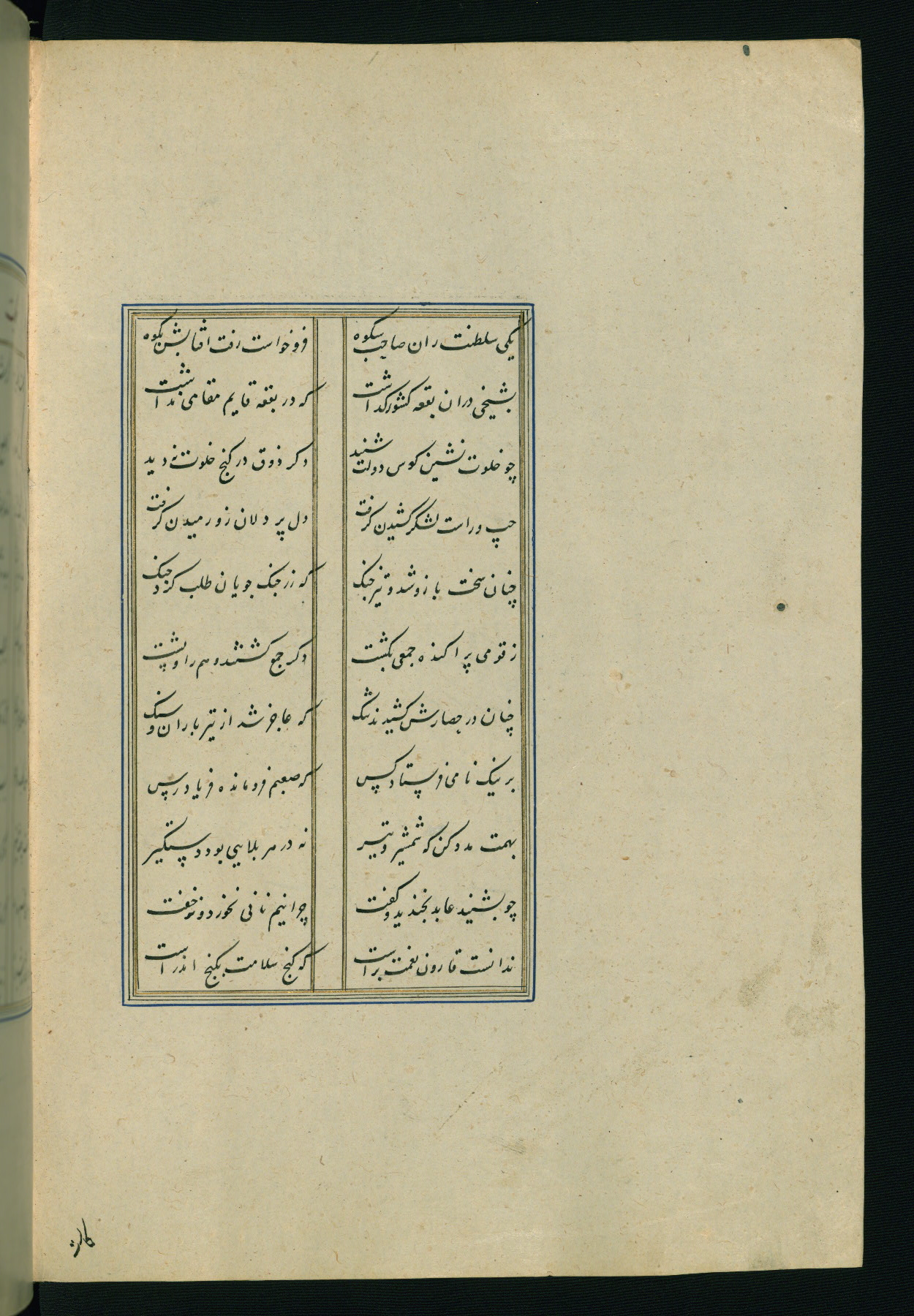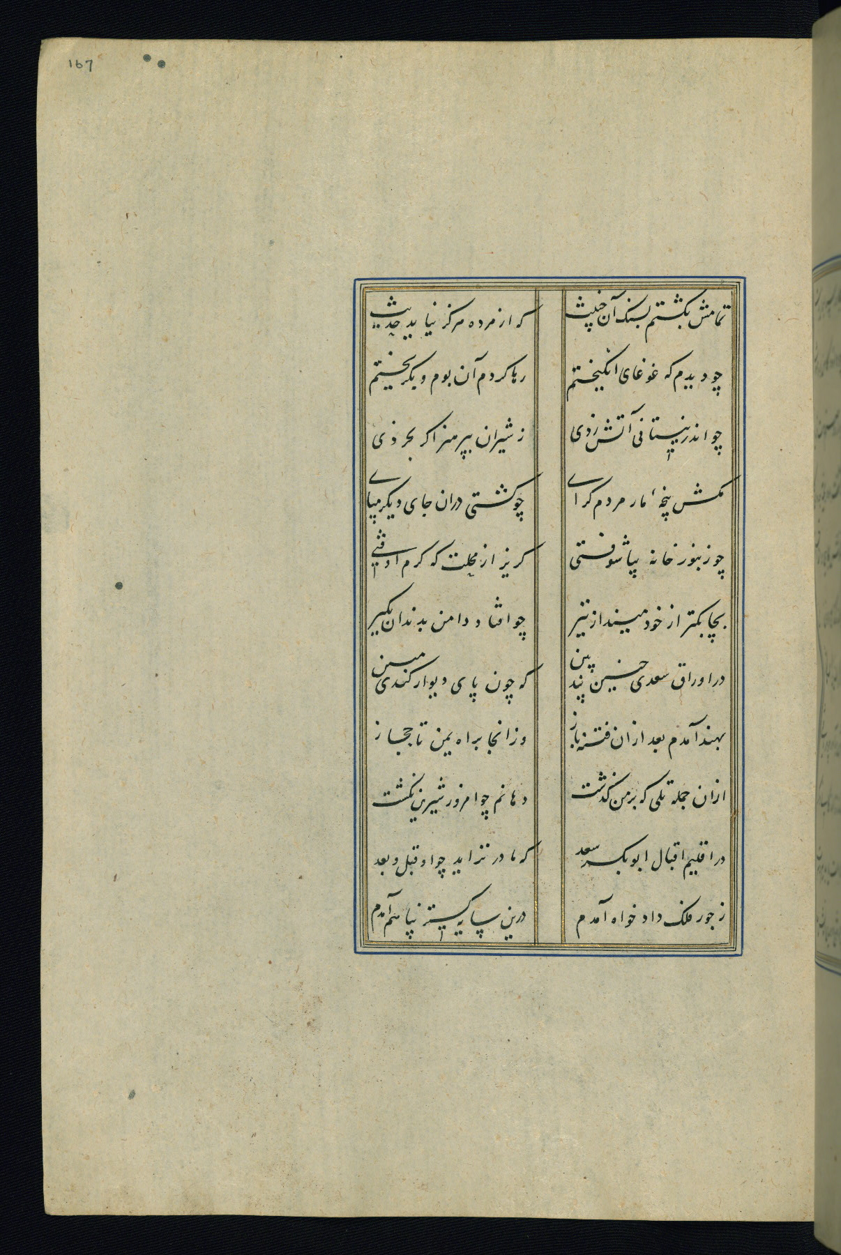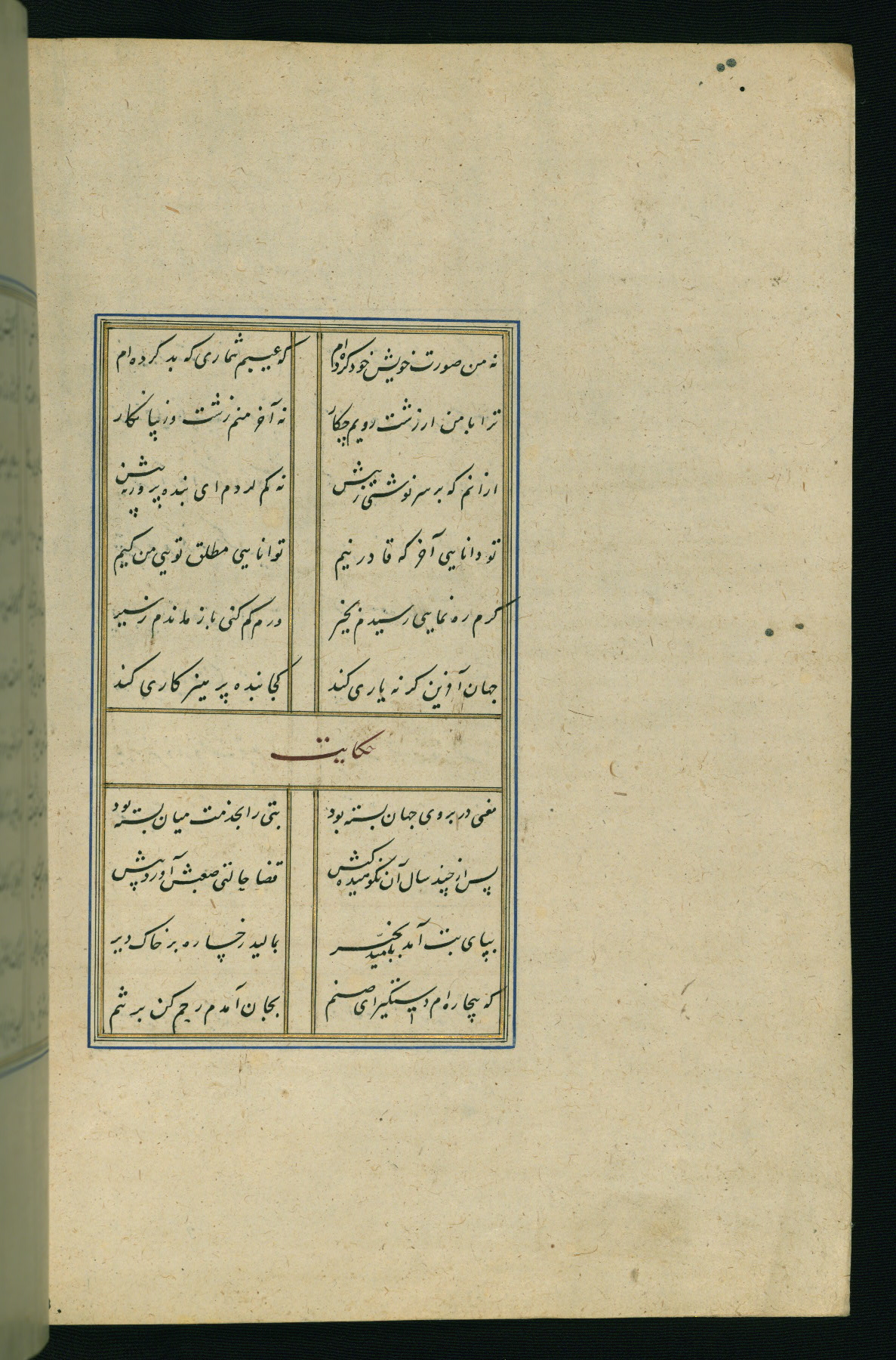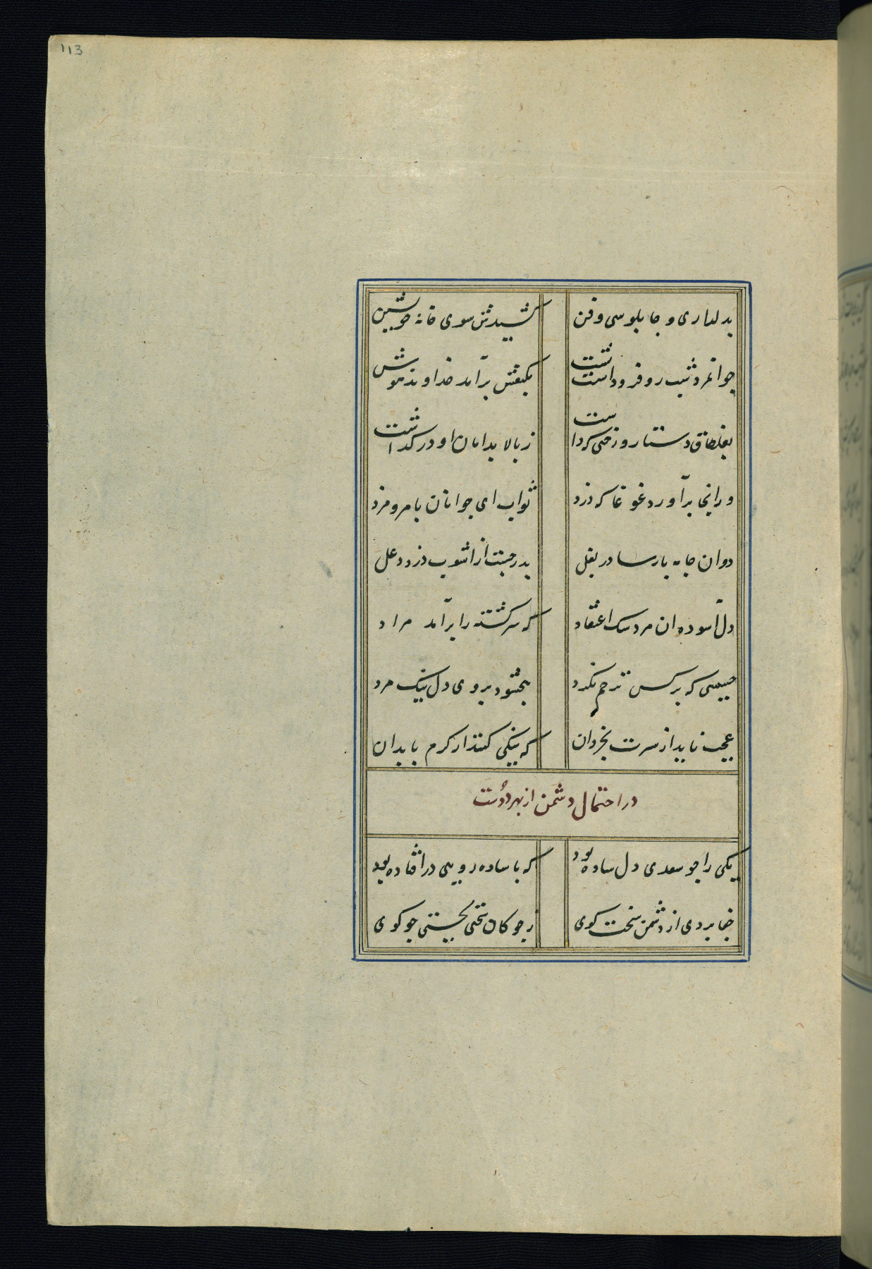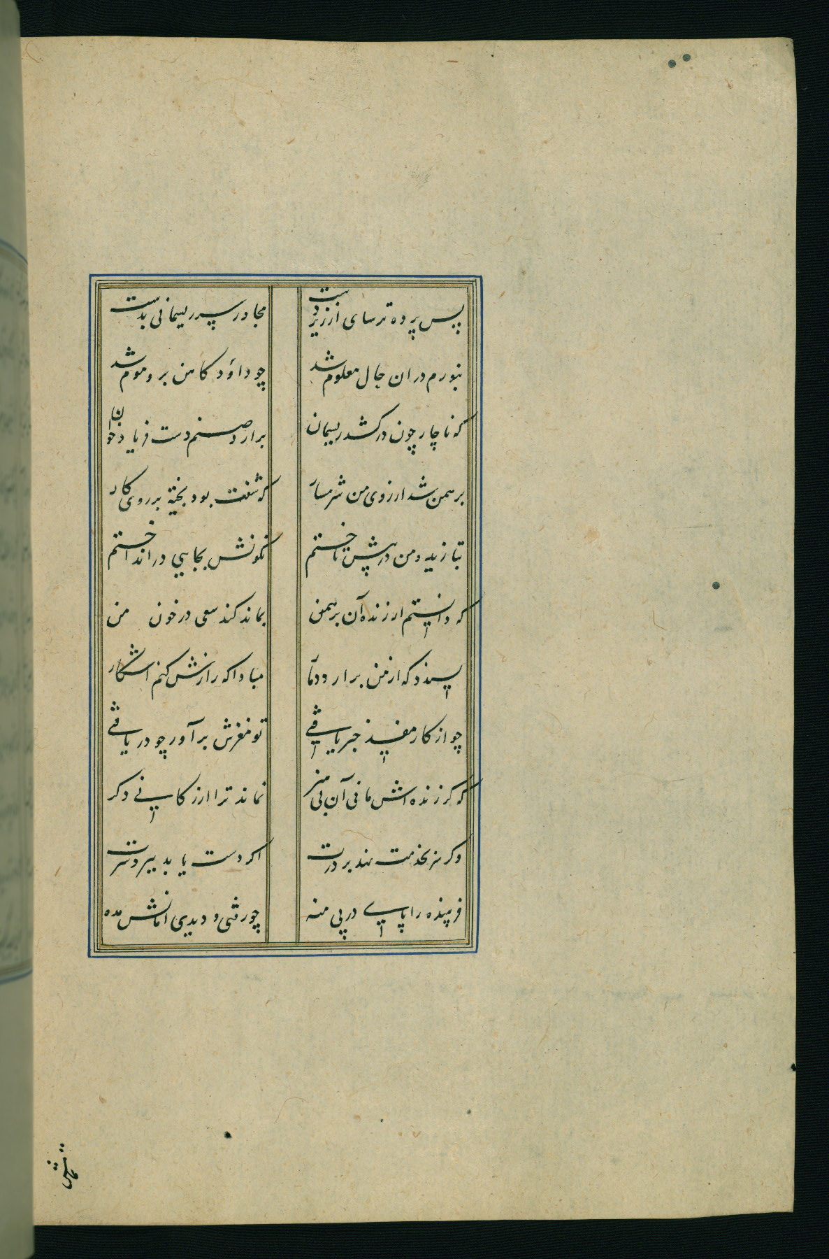 This is an illuminated and illustrated Safavid copy of the Būstān (The garden or The orchard), composed by Sa’dī (d. 691 AH / 1292 CE). It was written in black nasta’līq script in the ninth century AH / sixteenth CE in Iran. The codex opens with a frontispiece with the title Kitāb-i būstān inscribed in an illuminated medallion (fol. 1a), followed by a double-page illustration of a banquet scene in a landscape (fols. 1b-2a). Additionally, there are five paintings illustrating the text (fols. 25a, 55b, 58a, 93b, and 119b). The brown leather, blind-stamped binding decorated with a central oval and pendants is not contemporary with the manuscript.