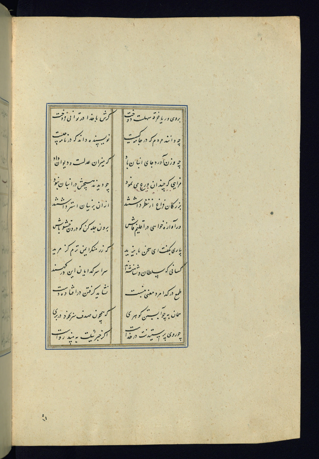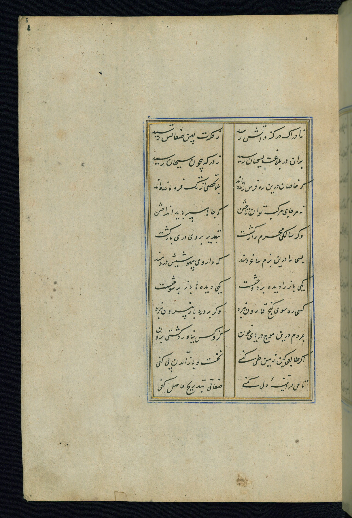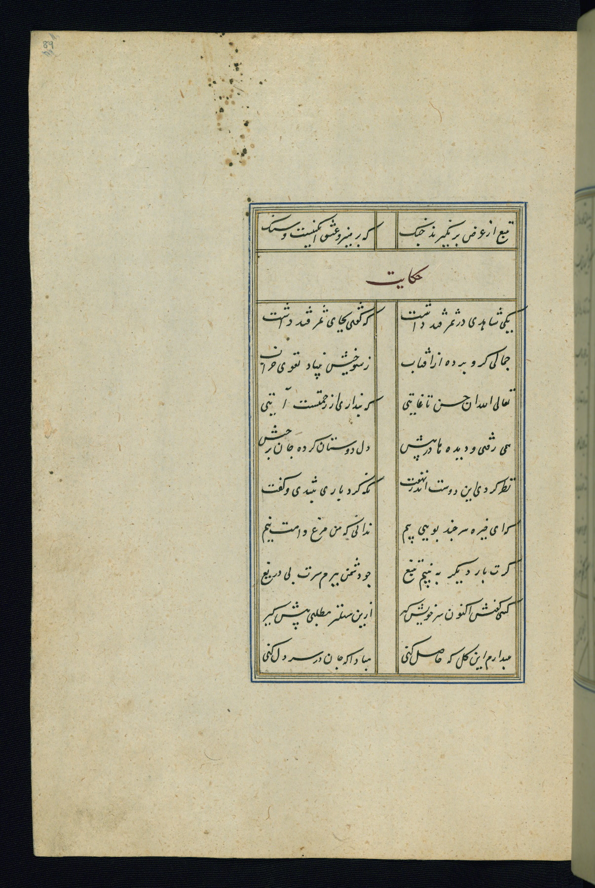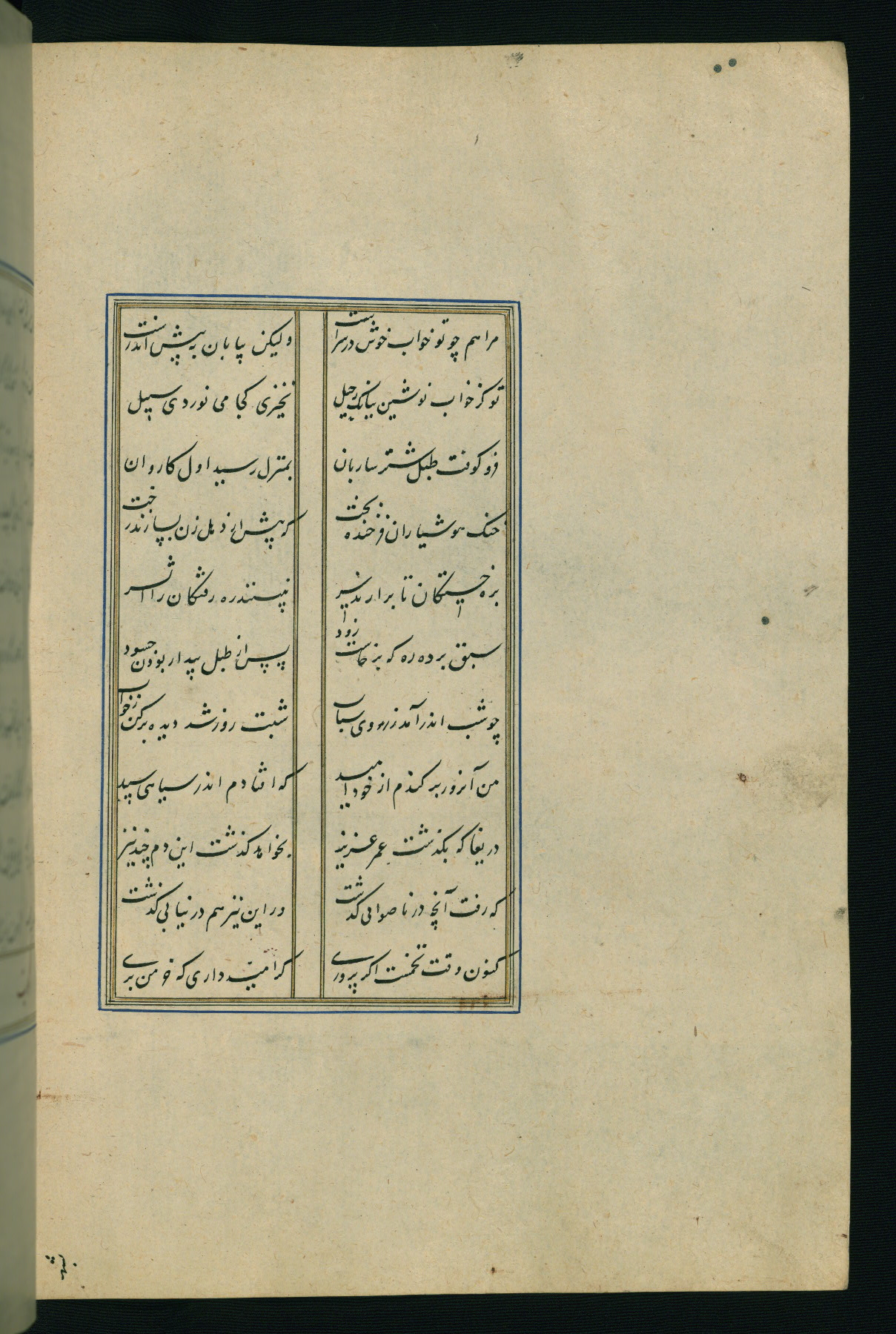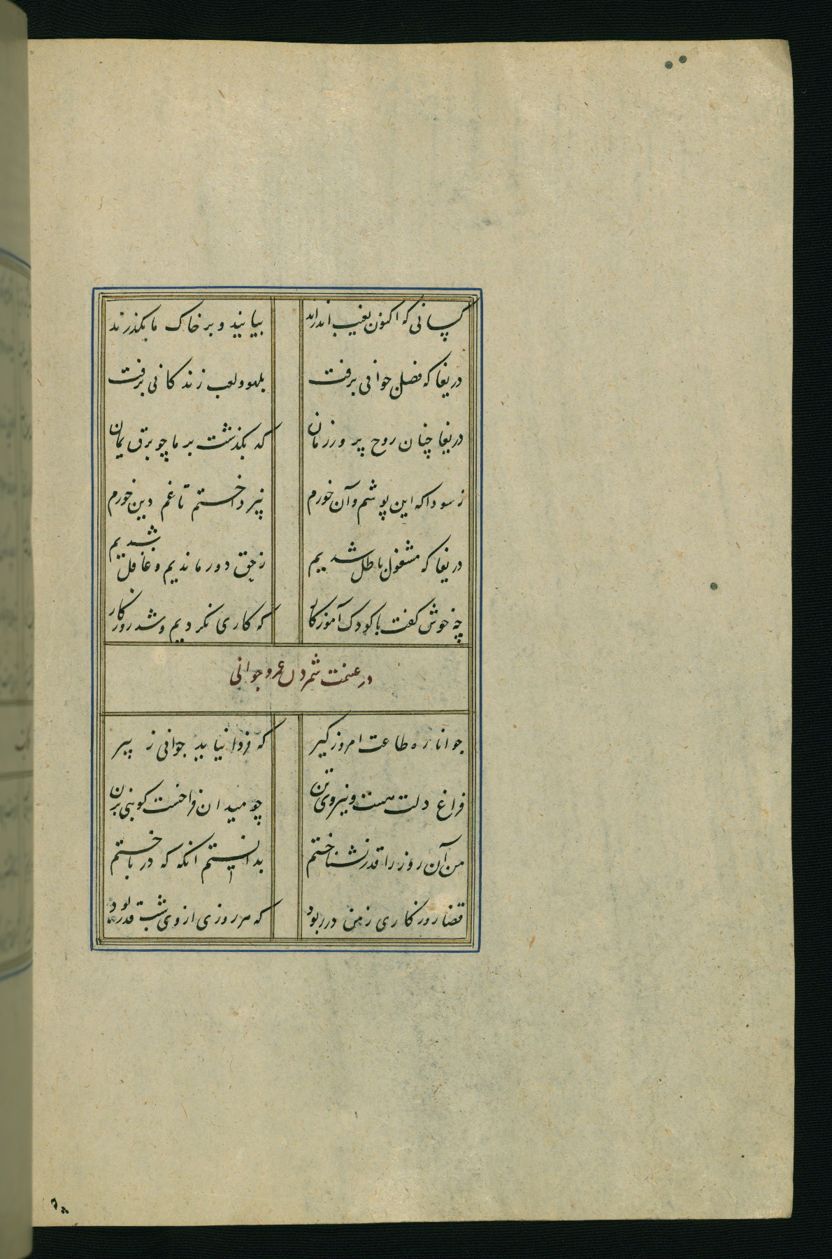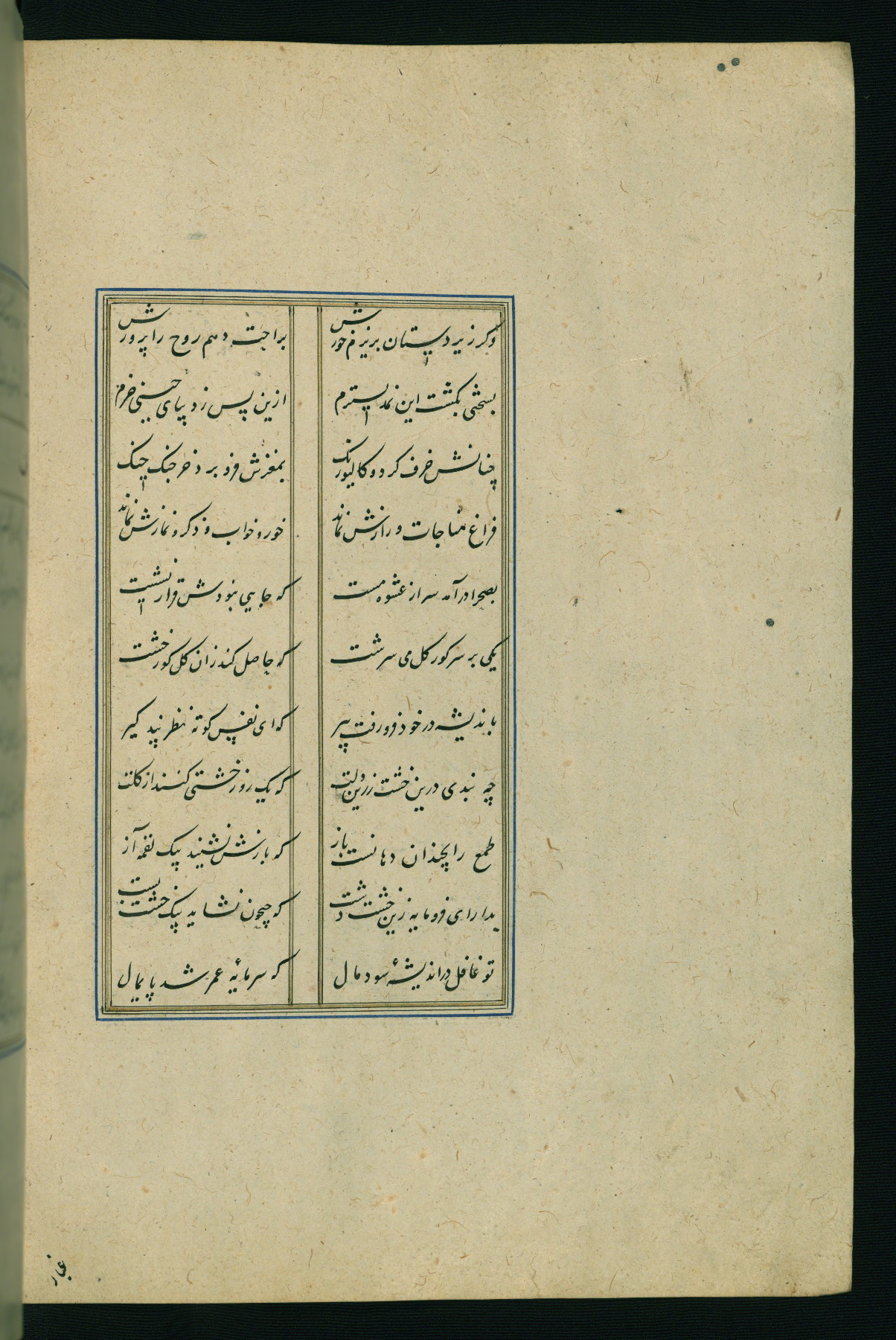 This is an illuminated and illustrated Safavid copy of the Būstān (The garden or The orchard), composed by Sa’dī (d. 691 AH / 1292 CE). It was written in black nasta’līq script in the ninth century AH / sixteenth CE in Iran. The codex opens with a frontispiece with the title Kitāb-i būstān inscribed in an illuminated medallion (fol. 1a), followed by a double-page illustration of a banquet scene in a landscape (fols. 1b-2a). Additionally, there are five paintings illustrating the text (fols. 25a, 55b, 58a, 93b, and 119b). The brown leather, blind-stamped binding decorated with a central oval and pendants is not contemporary with the manuscript.