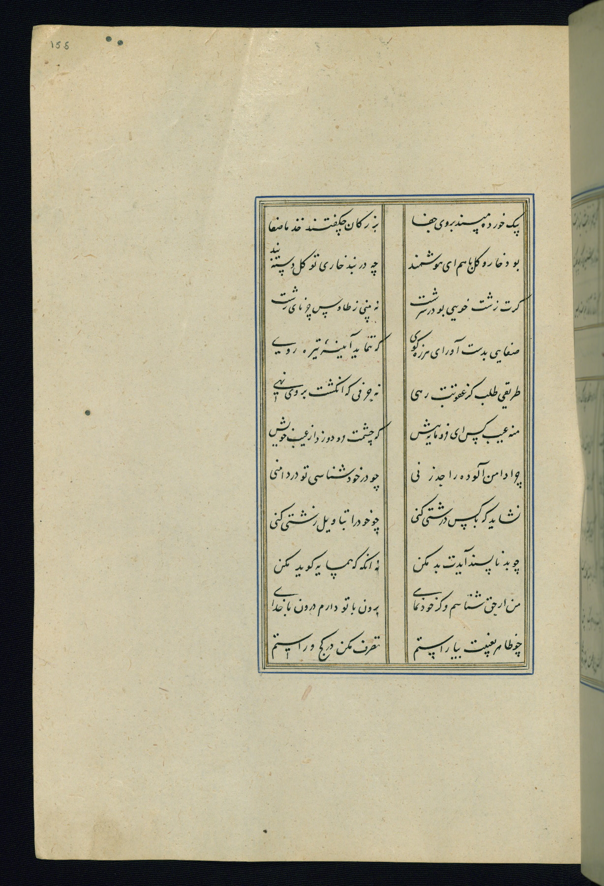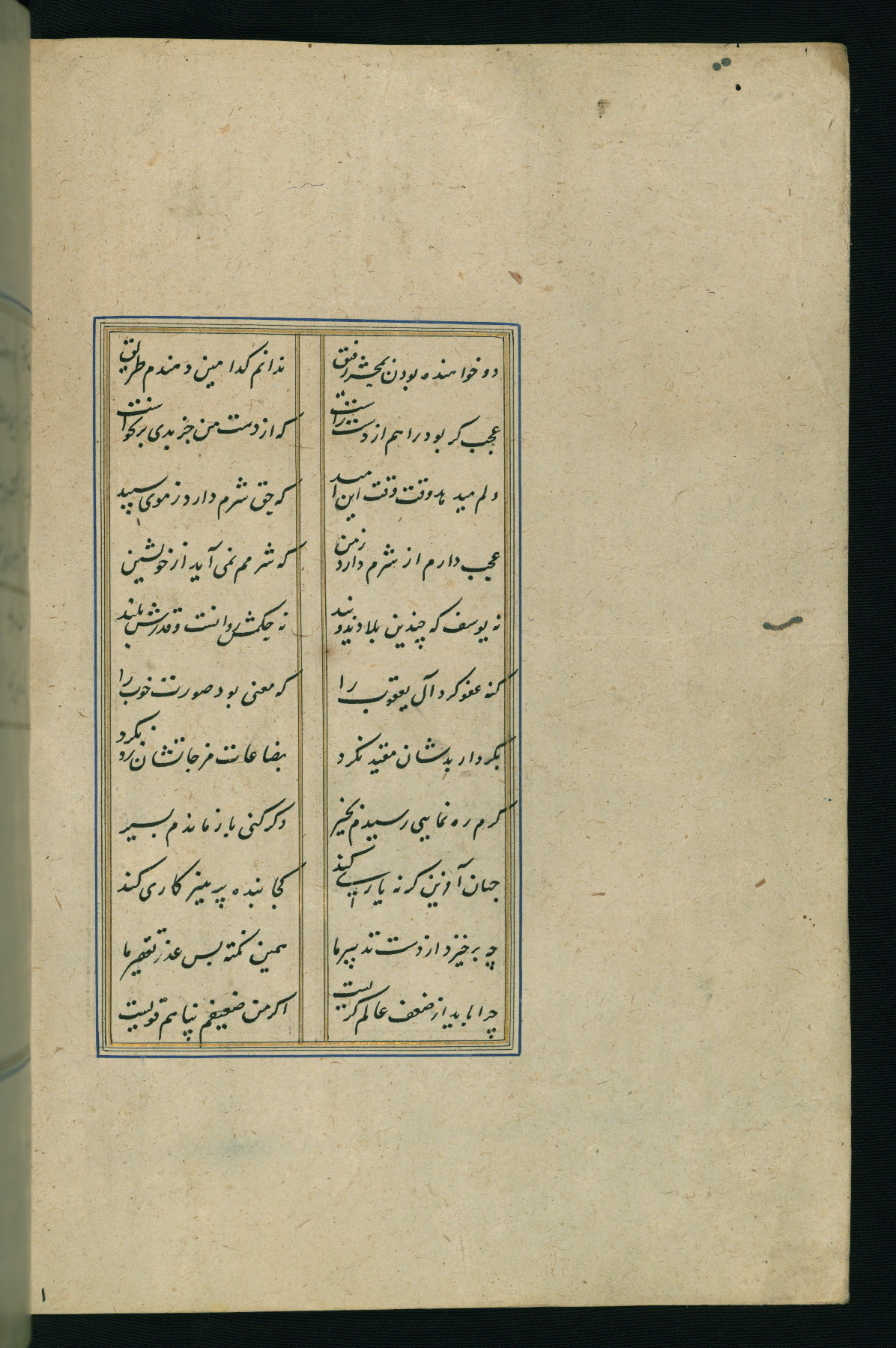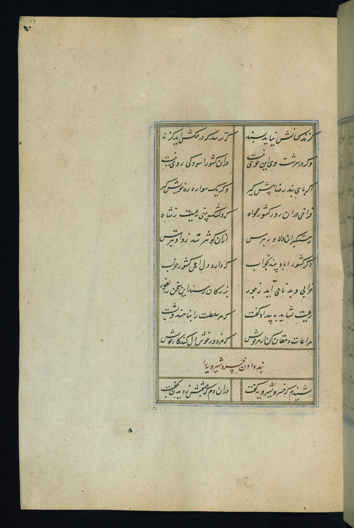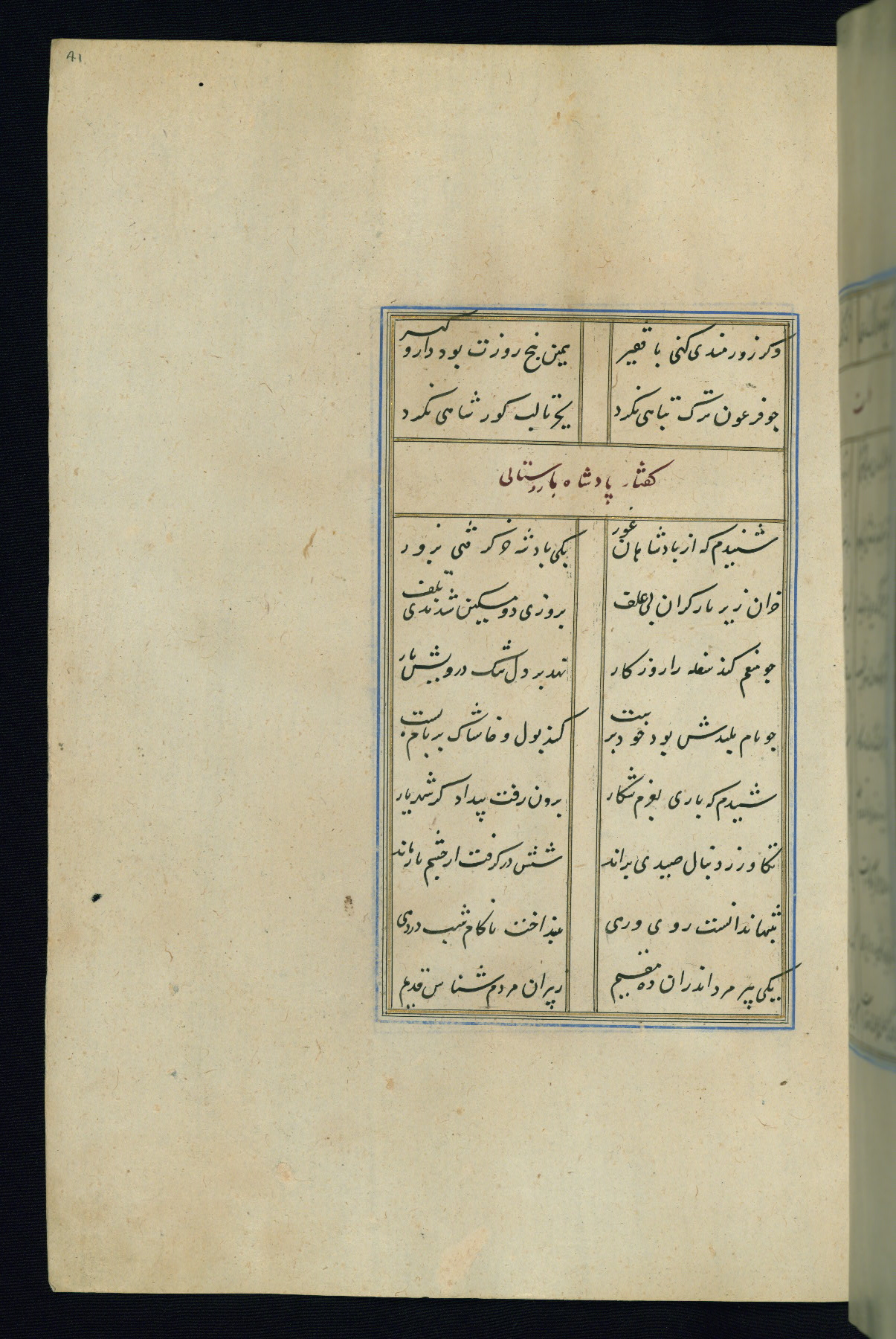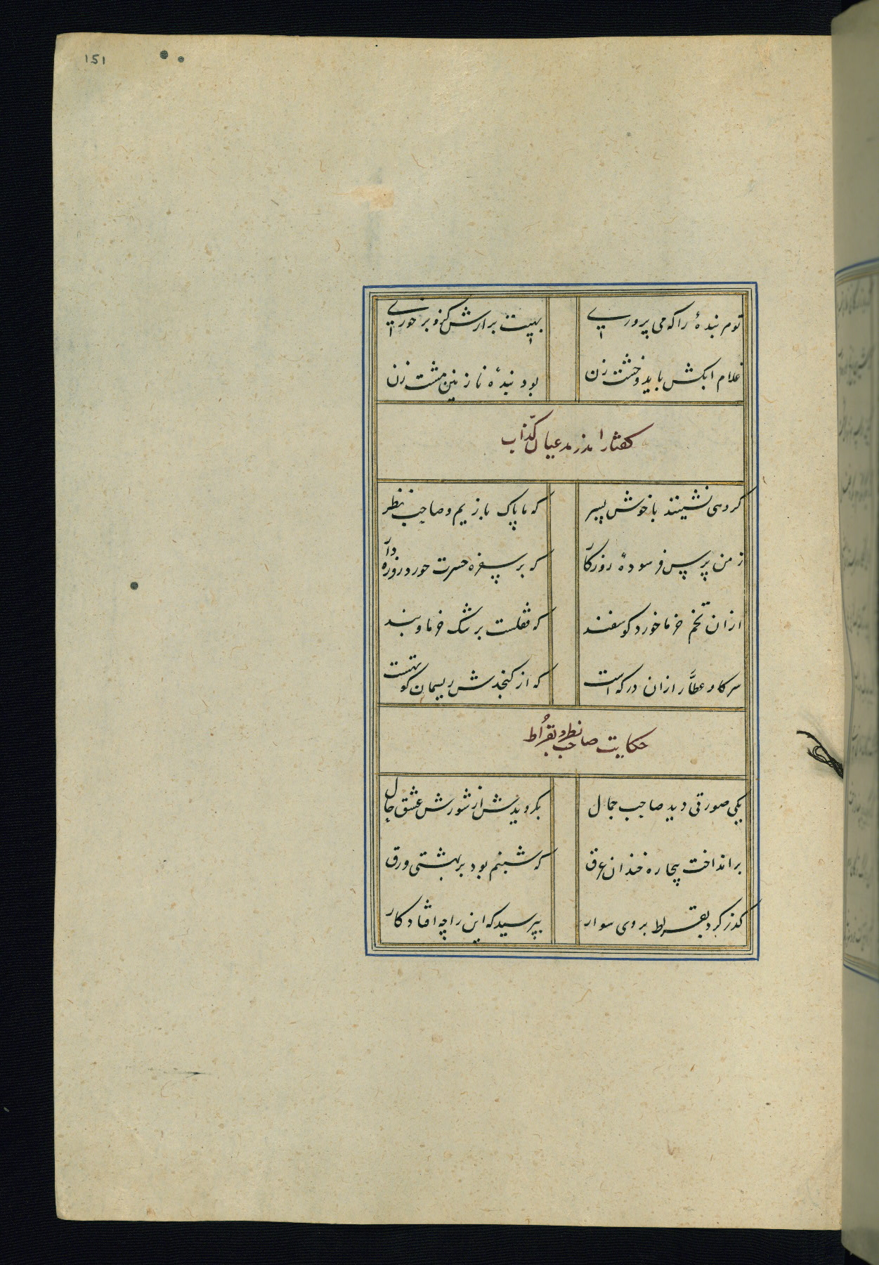 This is an illuminated and illustrated Safavid copy of the Būstān (The garden or The orchard), composed by Sa’dī (d. 691 AH / 1292 CE). It was written in black nasta’līq script in the ninth century AH / sixteenth CE in Iran. The codex opens with a frontispiece with the title Kitāb-i būstān inscribed in an illuminated medallion (fol. 1a), followed by a double-page illustration of a banquet scene in a landscape (fols. 1b-2a). Additionally, there are five paintings illustrating the text (fols. 25a, 55b, 58a, 93b, and 119b). The brown leather, blind-stamped binding decorated with a central oval and pendants is not contemporary with the manuscript.