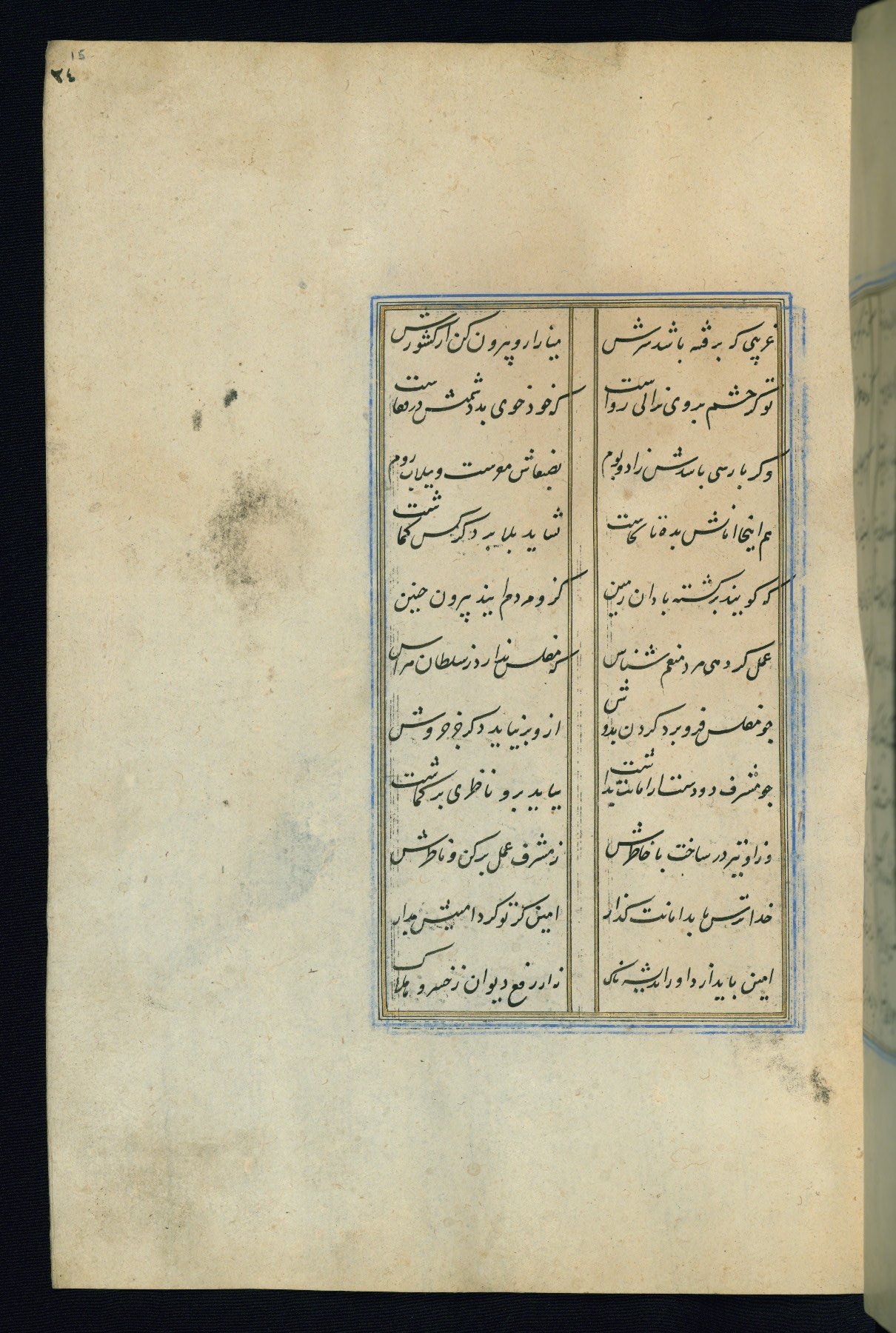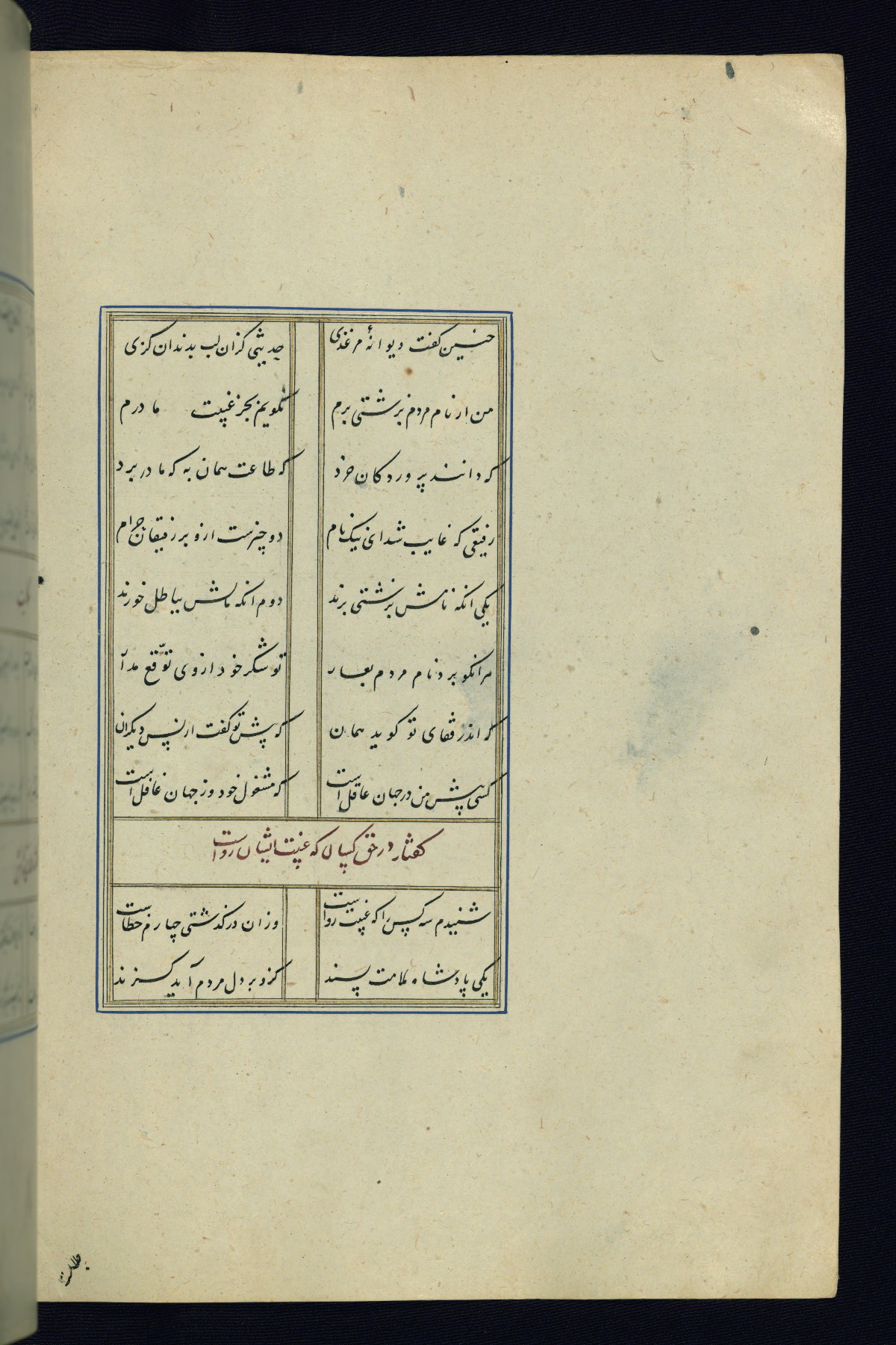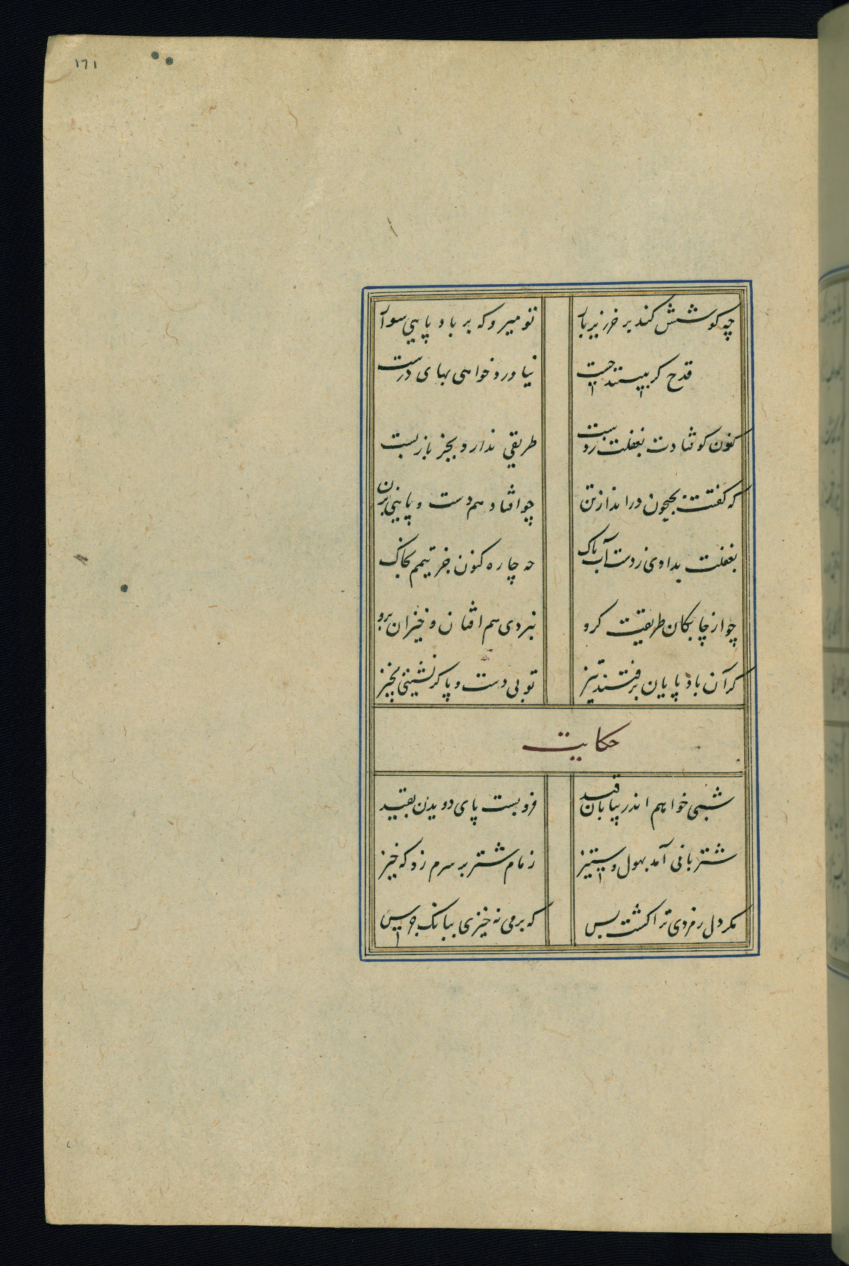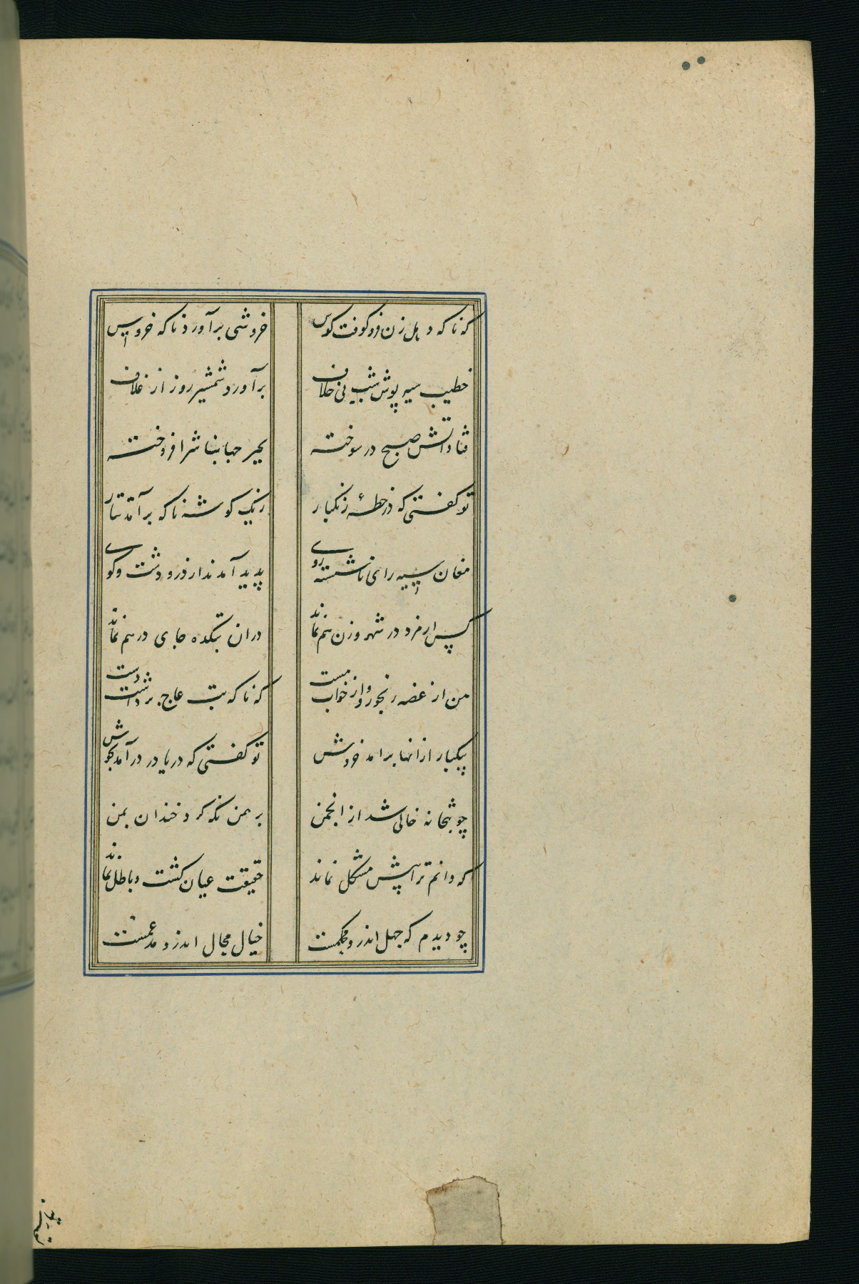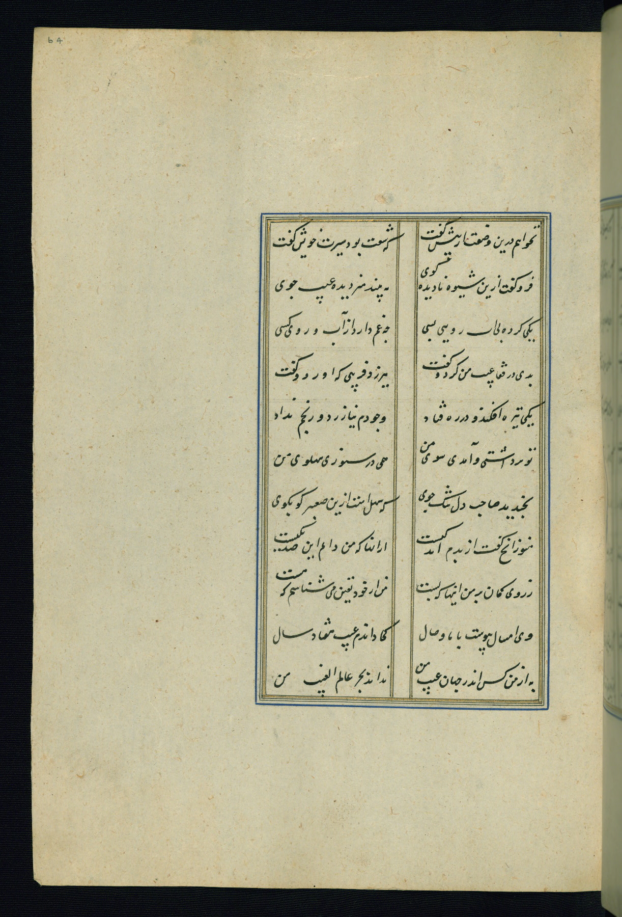 This is an illuminated and illustrated Safavid copy of the Būstān (The garden or The orchard), composed by Sa’dī (d. 691 AH / 1292 CE). It was written in black nasta’līq script in the ninth century AH / sixteenth CE in Iran. The codex opens with a frontispiece with the title Kitāb-i būstān inscribed in an illuminated medallion (fol. 1a), followed by a double-page illustration of a banquet scene in a landscape (fols. 1b-2a). Additionally, there are five paintings illustrating the text (fols. 25a, 55b, 58a, 93b, and 119b). The brown leather, blind-stamped binding decorated with a central oval and pendants is not contemporary with the manuscript.