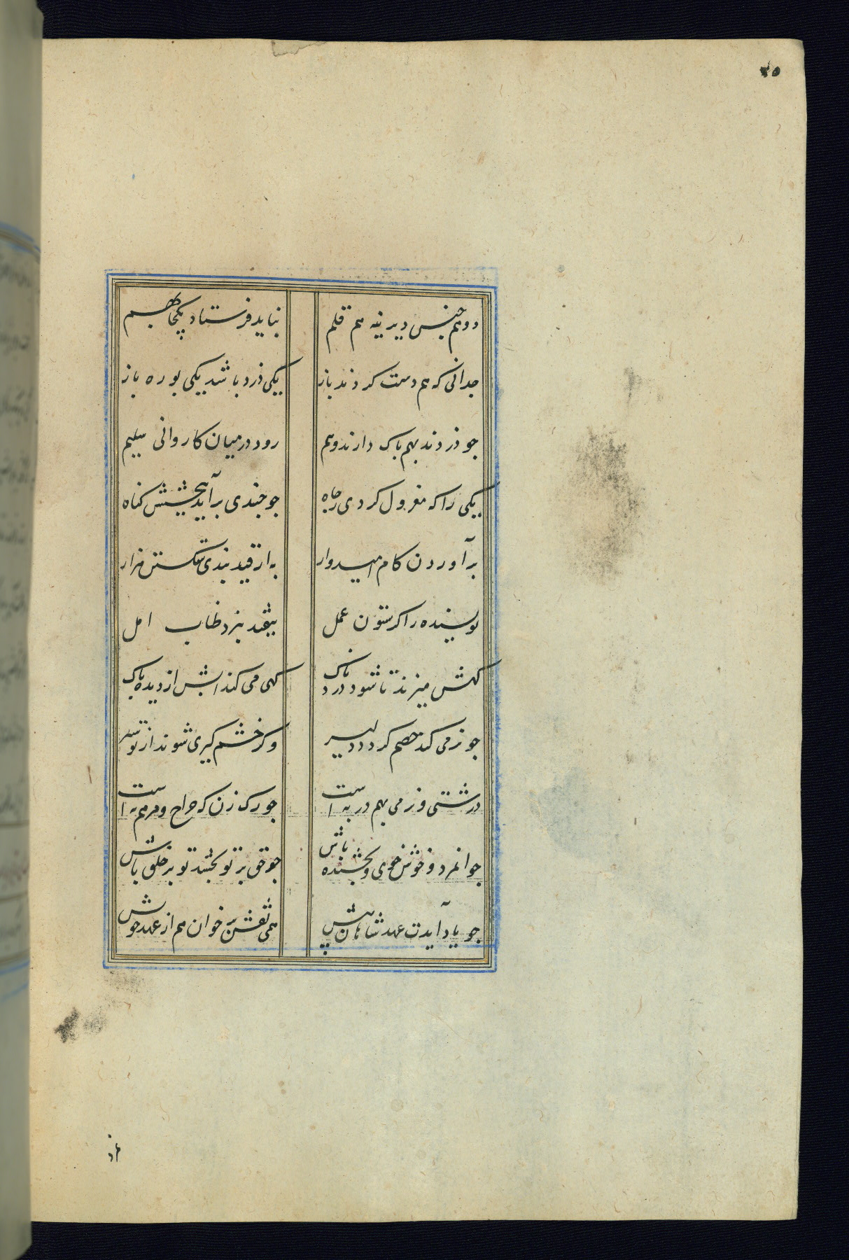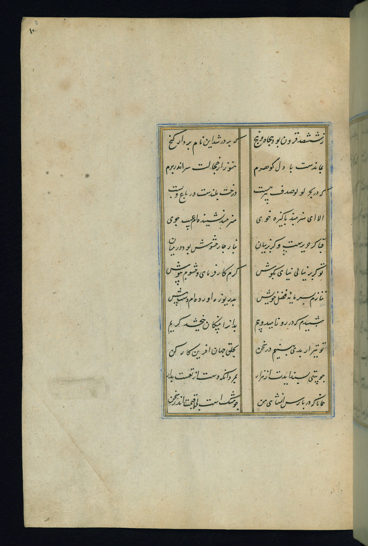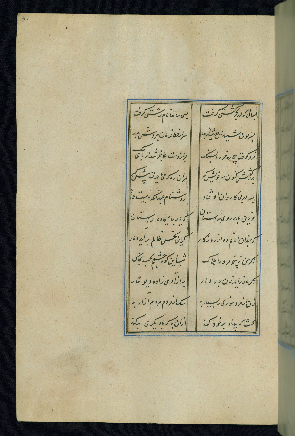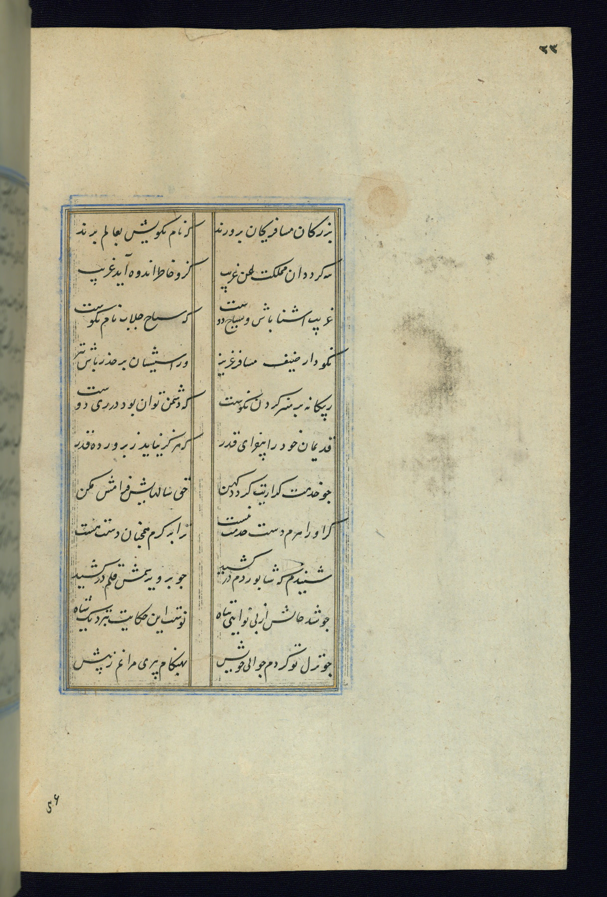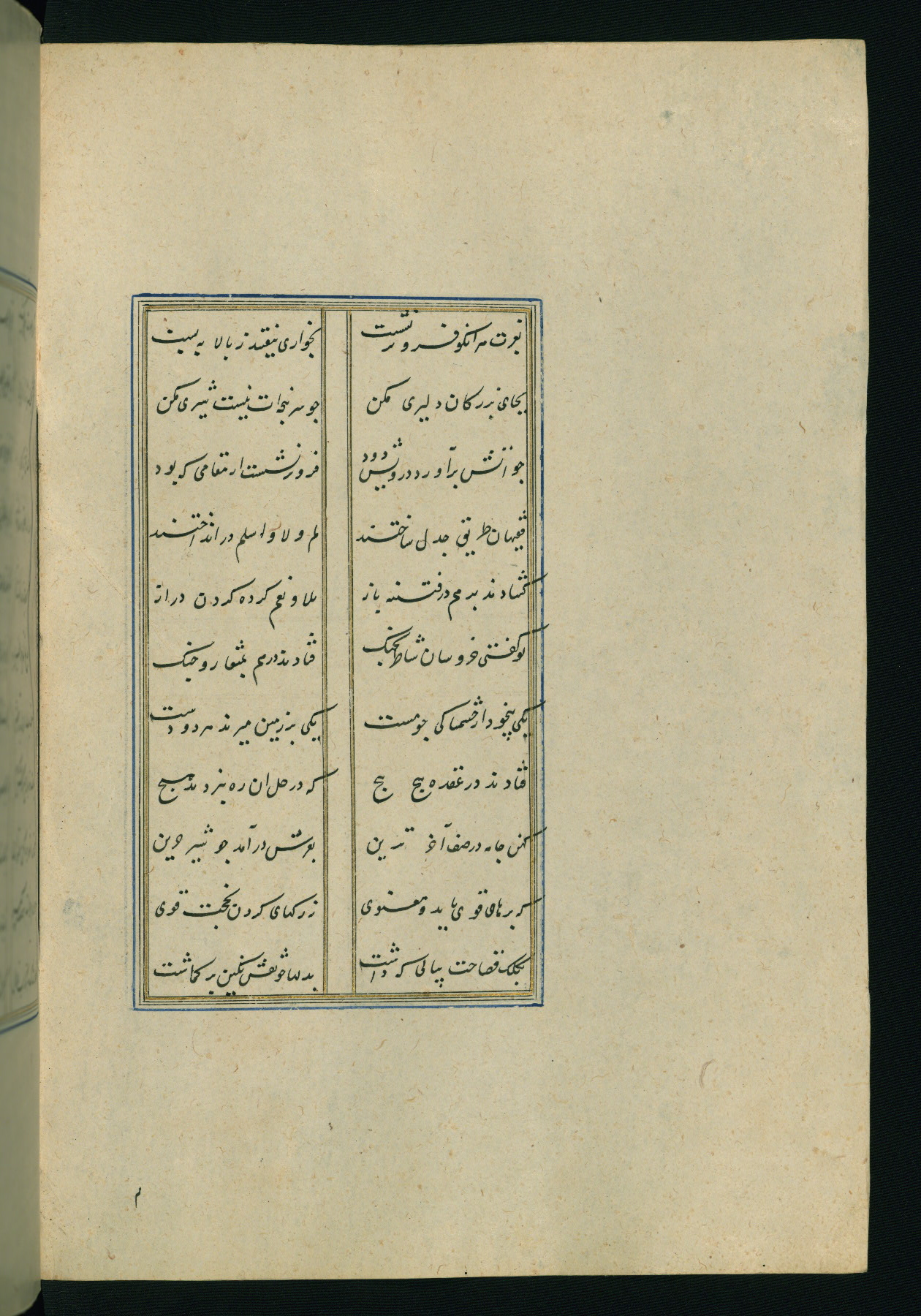 This is an illuminated and illustrated Safavid copy of the Būstān (The garden or The orchard), composed by Sa’dī (d. 691 AH / 1292 CE). It was written in black nasta’līq script in the ninth century AH / sixteenth CE in Iran. The codex opens with a frontispiece with the title Kitāb-i būstān inscribed in an illuminated medallion (fol. 1a), followed by a double-page illustration of a banquet scene in a landscape (fols. 1b-2a). Additionally, there are five paintings illustrating the text (fols. 25a, 55b, 58a, 93b, and 119b). The brown leather, blind-stamped binding decorated with a central oval and pendants is not contemporary with the manuscript.