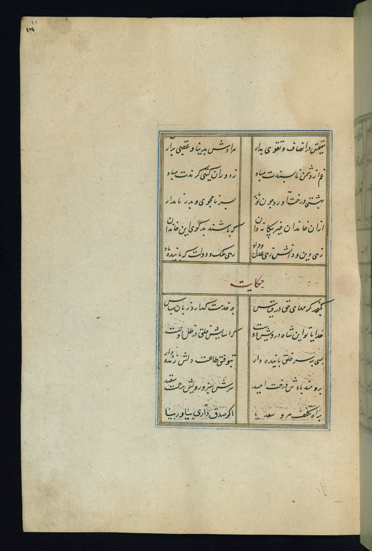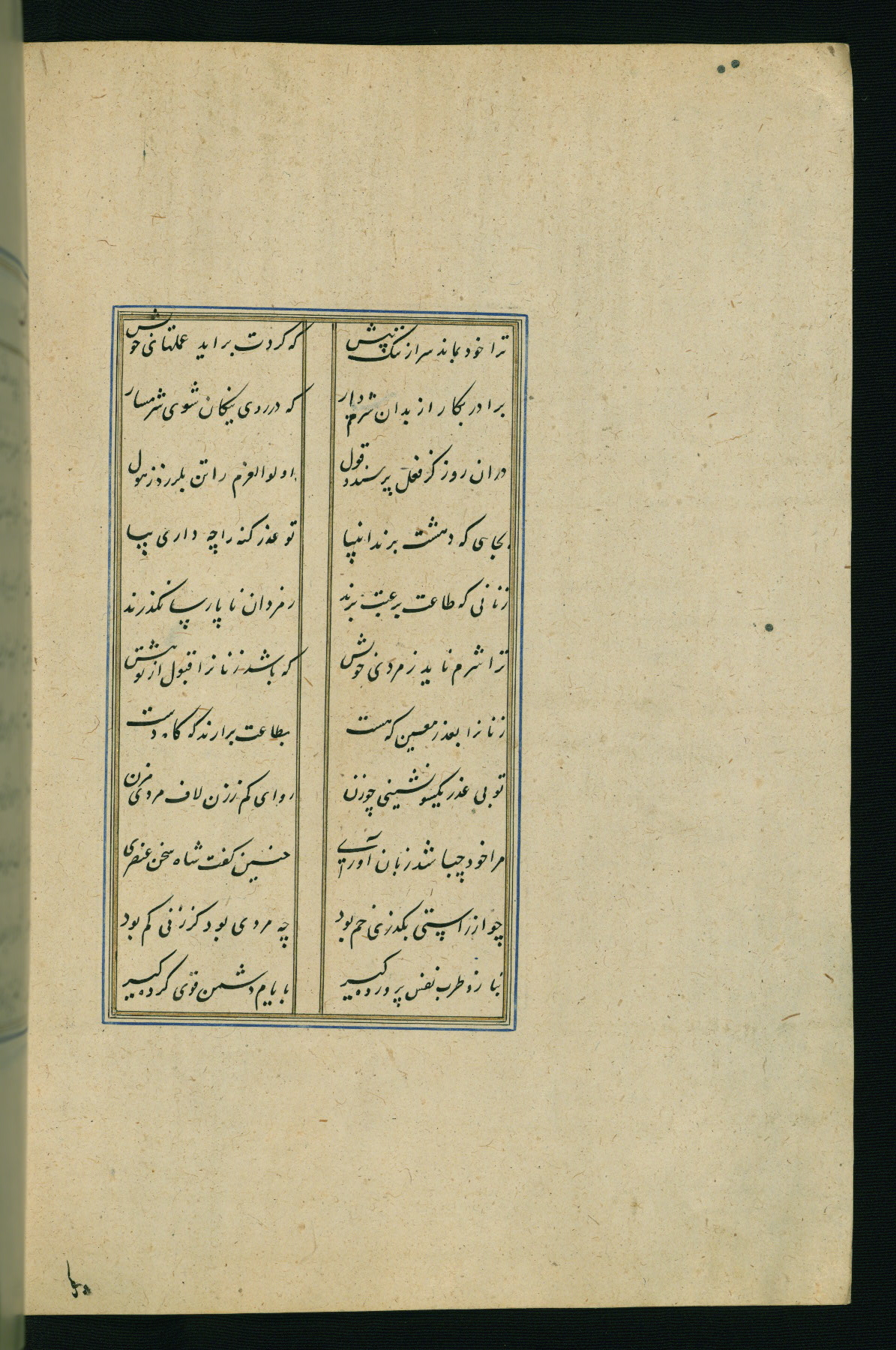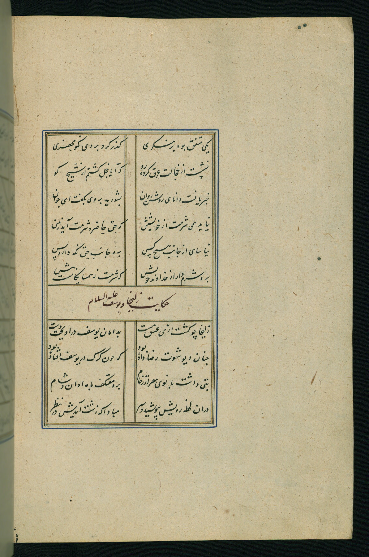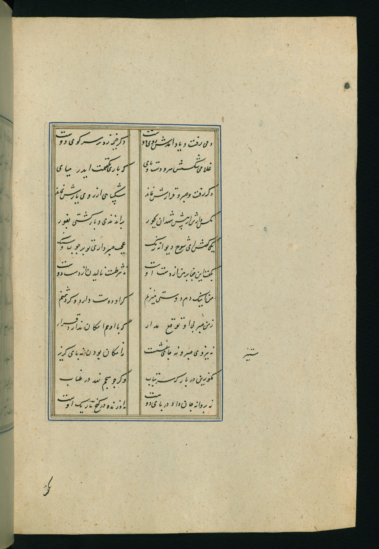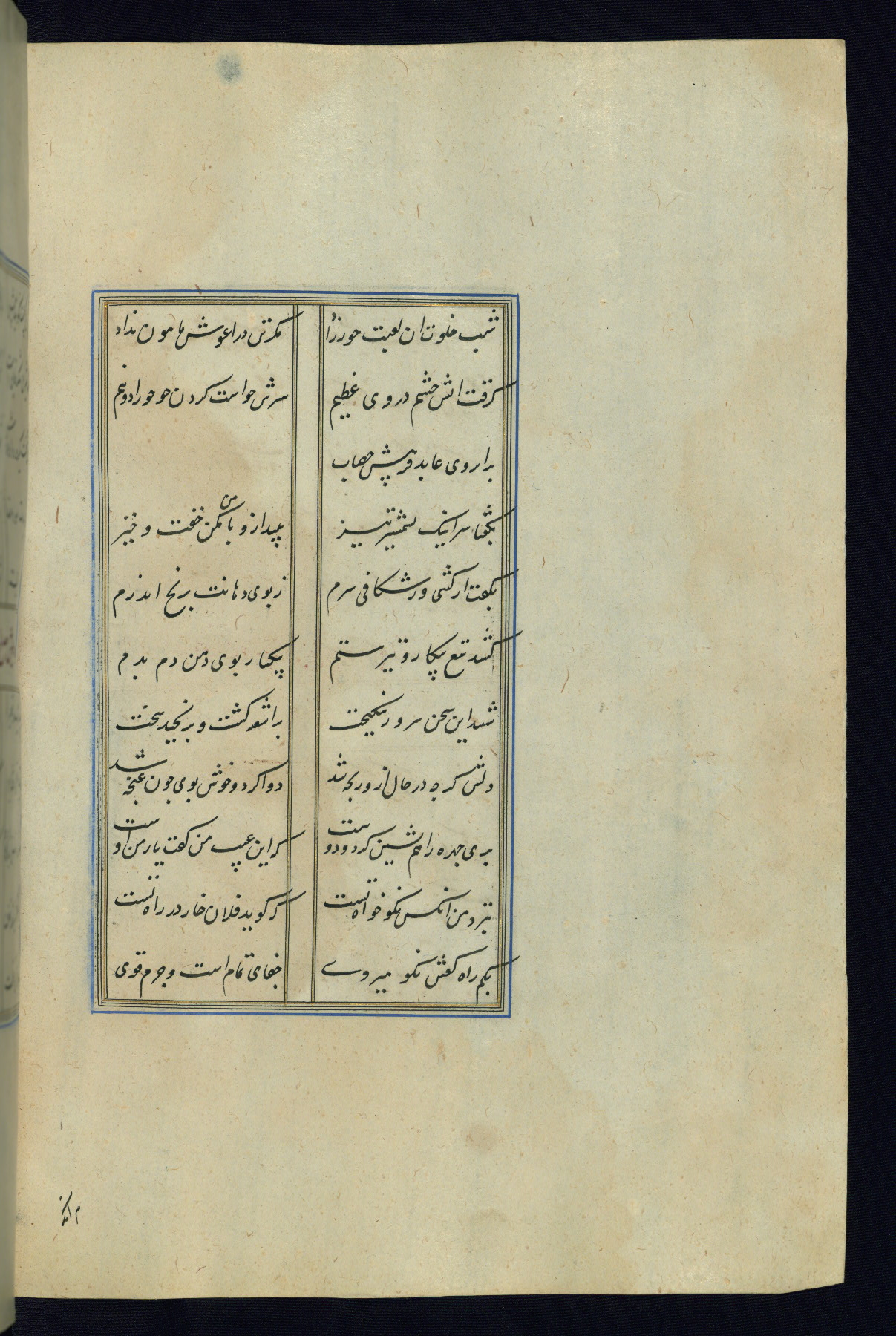 This is an illuminated and illustrated Safavid copy of the Būstān (The garden or The orchard), composed by Sa’dī (d. 691 AH / 1292 CE). It was written in black nasta’līq script in the ninth century AH / sixteenth CE in Iran. The codex opens with a frontispiece with the title Kitāb-i būstān inscribed in an illuminated medallion (fol. 1a), followed by a double-page illustration of a banquet scene in a landscape (fols. 1b-2a). Additionally, there are five paintings illustrating the text (fols. 25a, 55b, 58a, 93b, and 119b). The brown leather, blind-stamped binding decorated with a central oval and pendants is not contemporary with the manuscript.