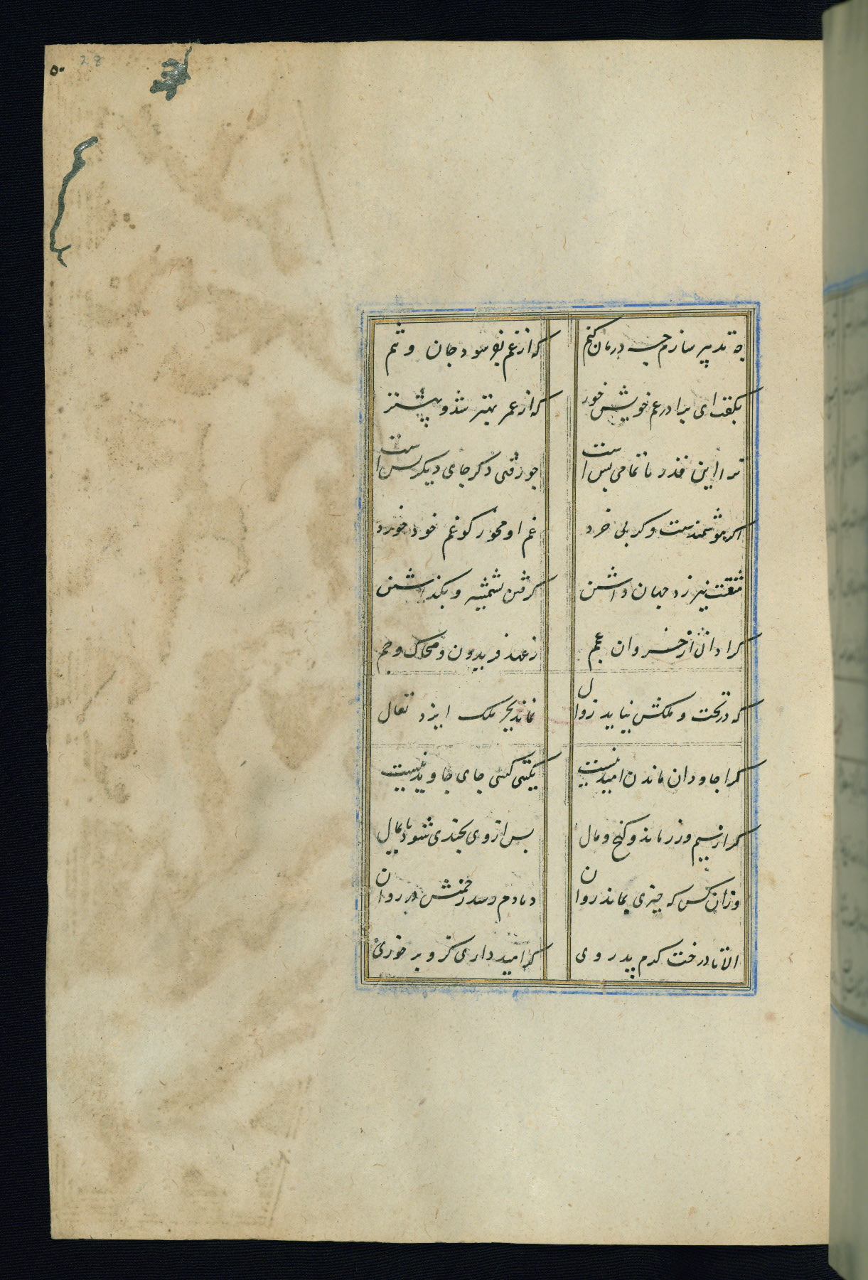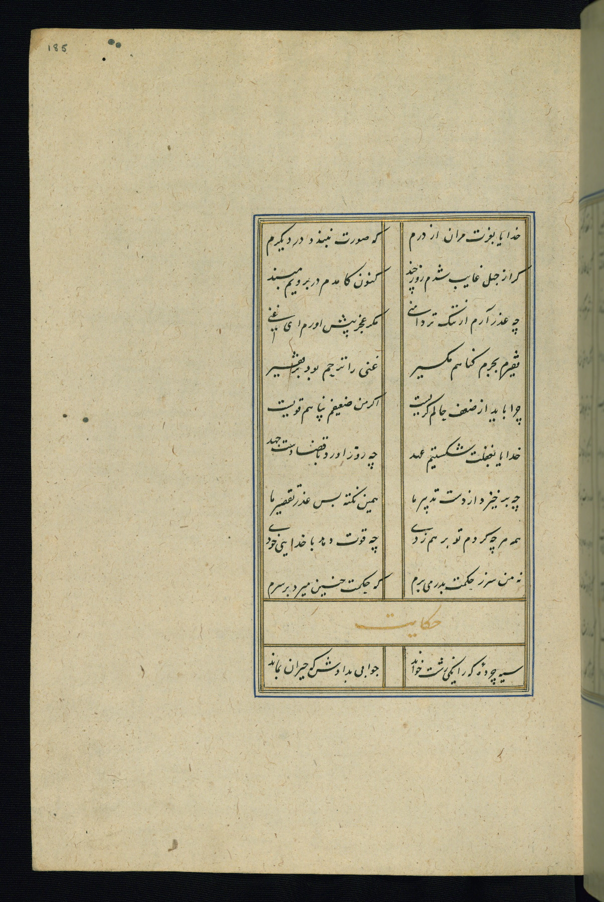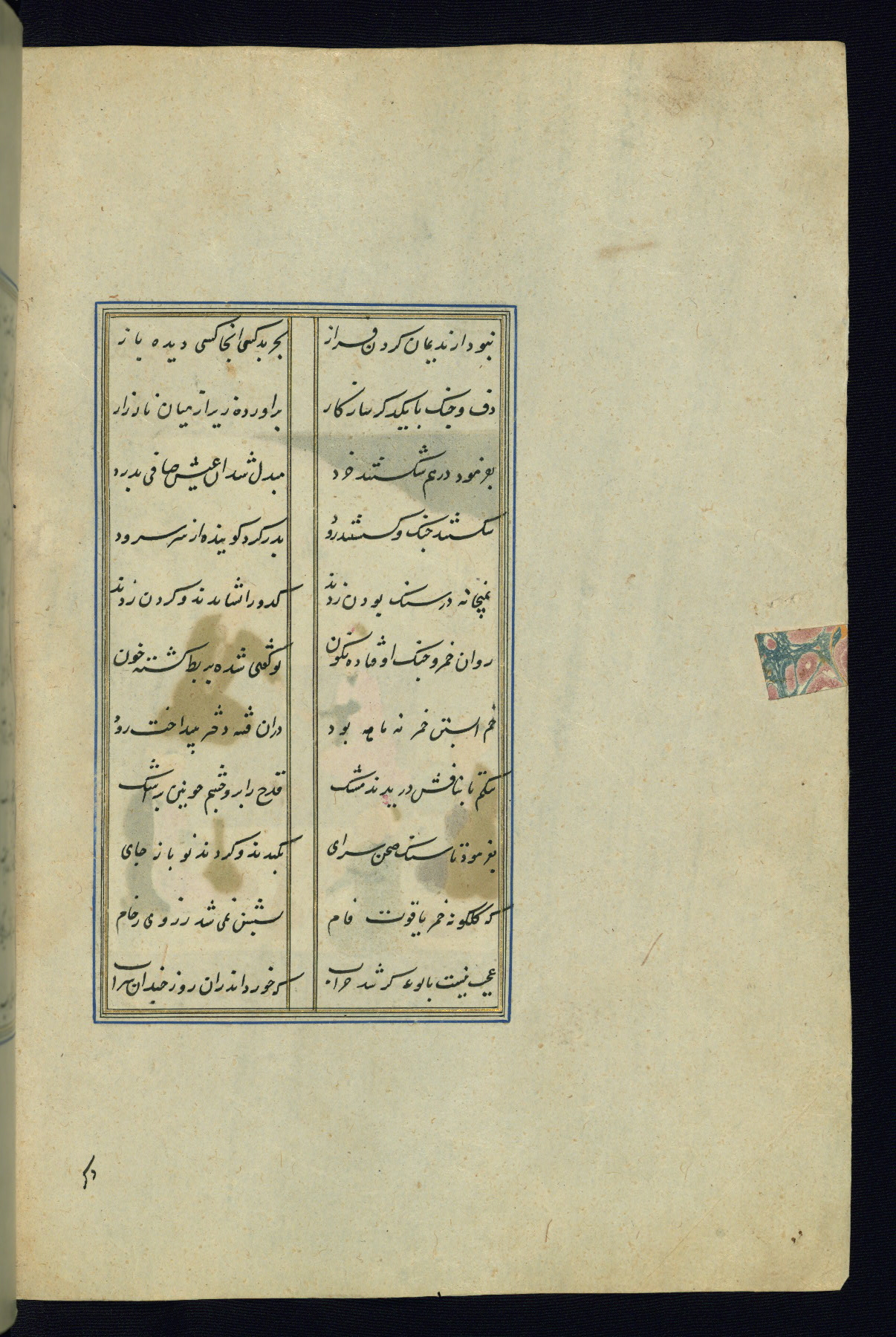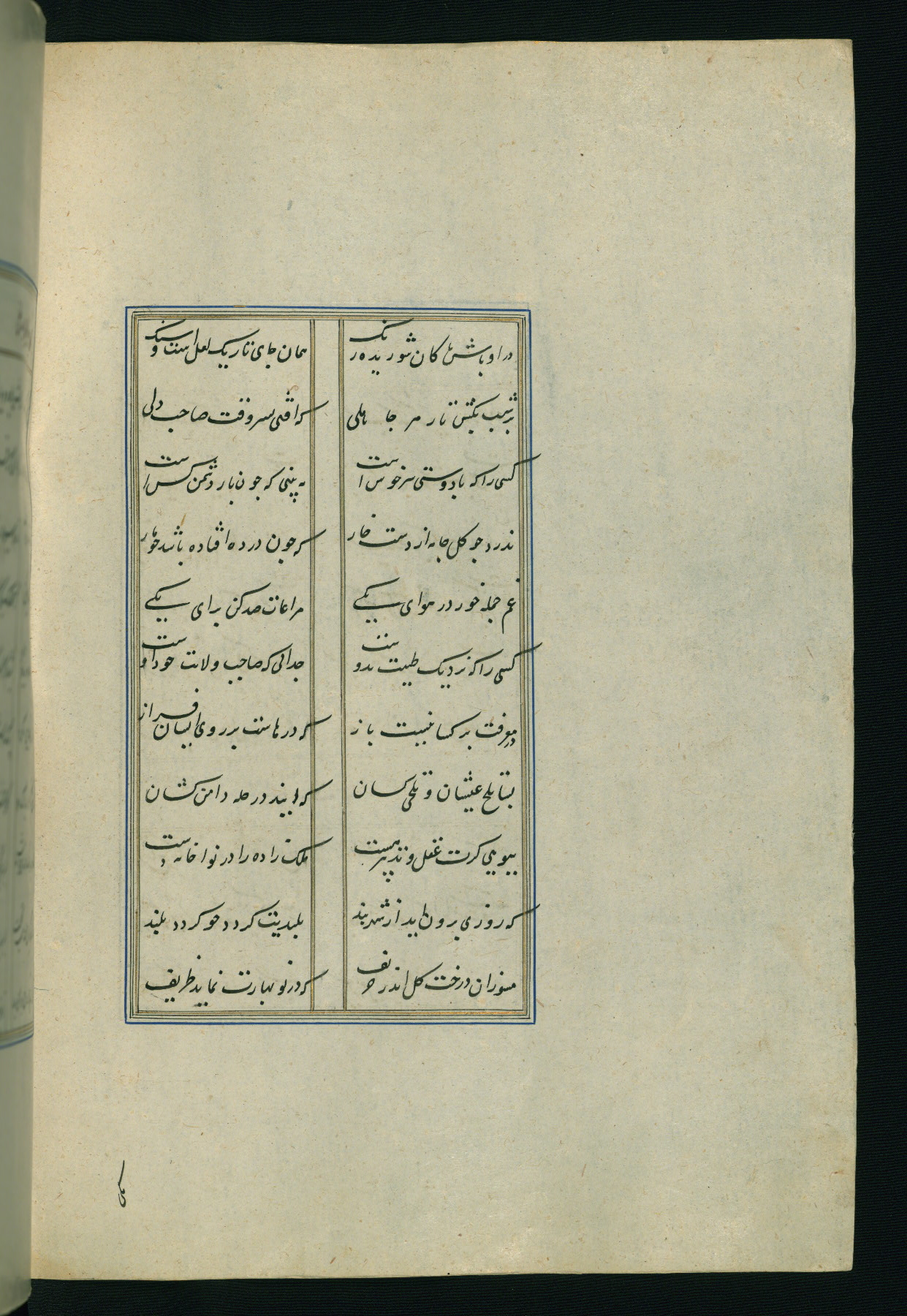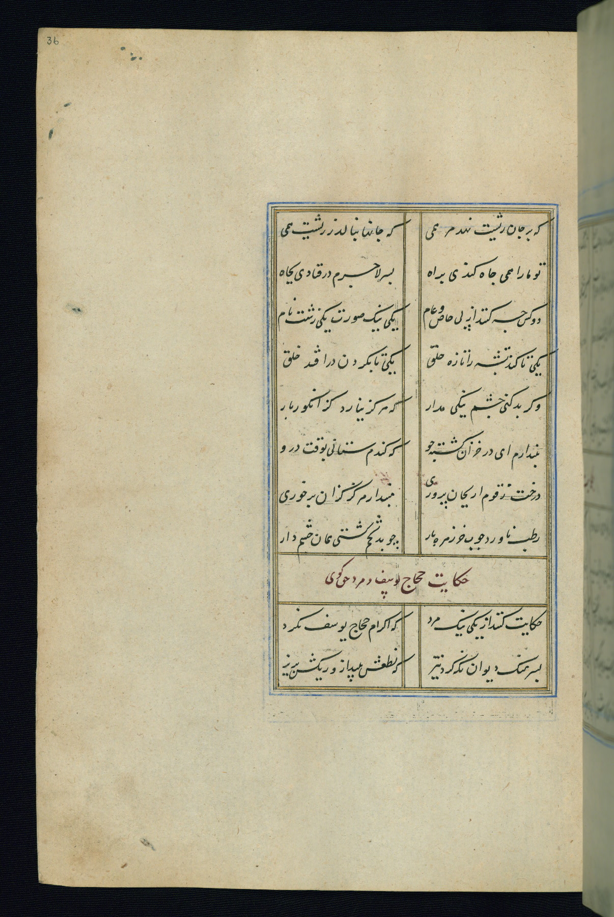 This is an illuminated and illustrated Safavid copy of the Būstān (The garden or The orchard), composed by Sa’dī (d. 691 AH / 1292 CE). It was written in black nasta’līq script in the ninth century AH / sixteenth CE in Iran. The codex opens with a frontispiece with the title Kitāb-i būstān inscribed in an illuminated medallion (fol. 1a), followed by a double-page illustration of a banquet scene in a landscape (fols. 1b-2a). Additionally, there are five paintings illustrating the text (fols. 25a, 55b, 58a, 93b, and 119b). The brown leather, blind-stamped binding decorated with a central oval and pendants is not contemporary with the manuscript.