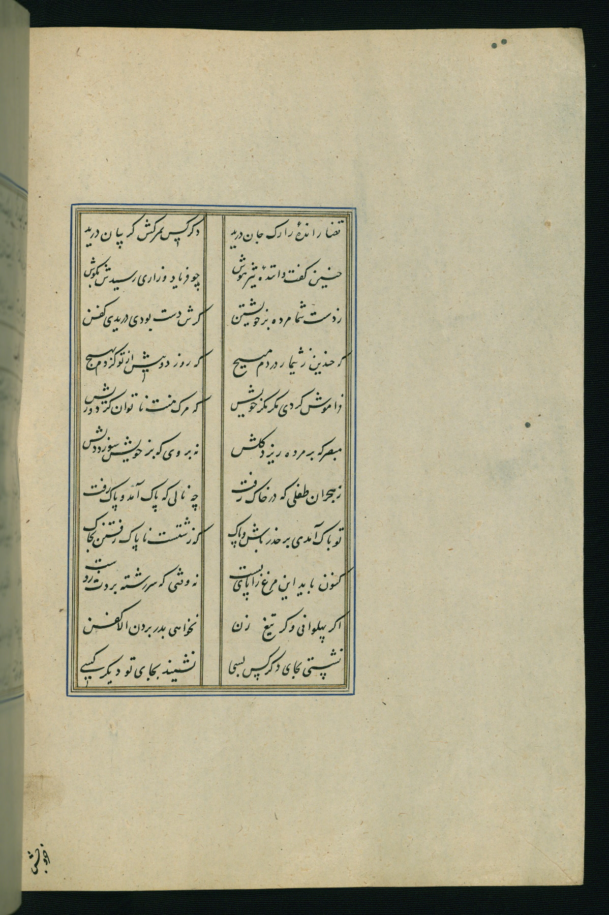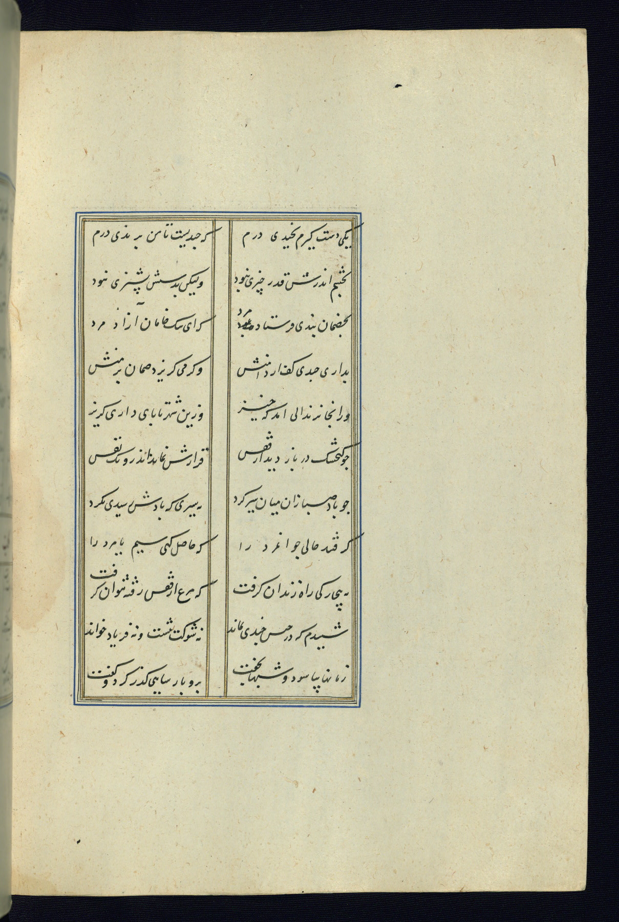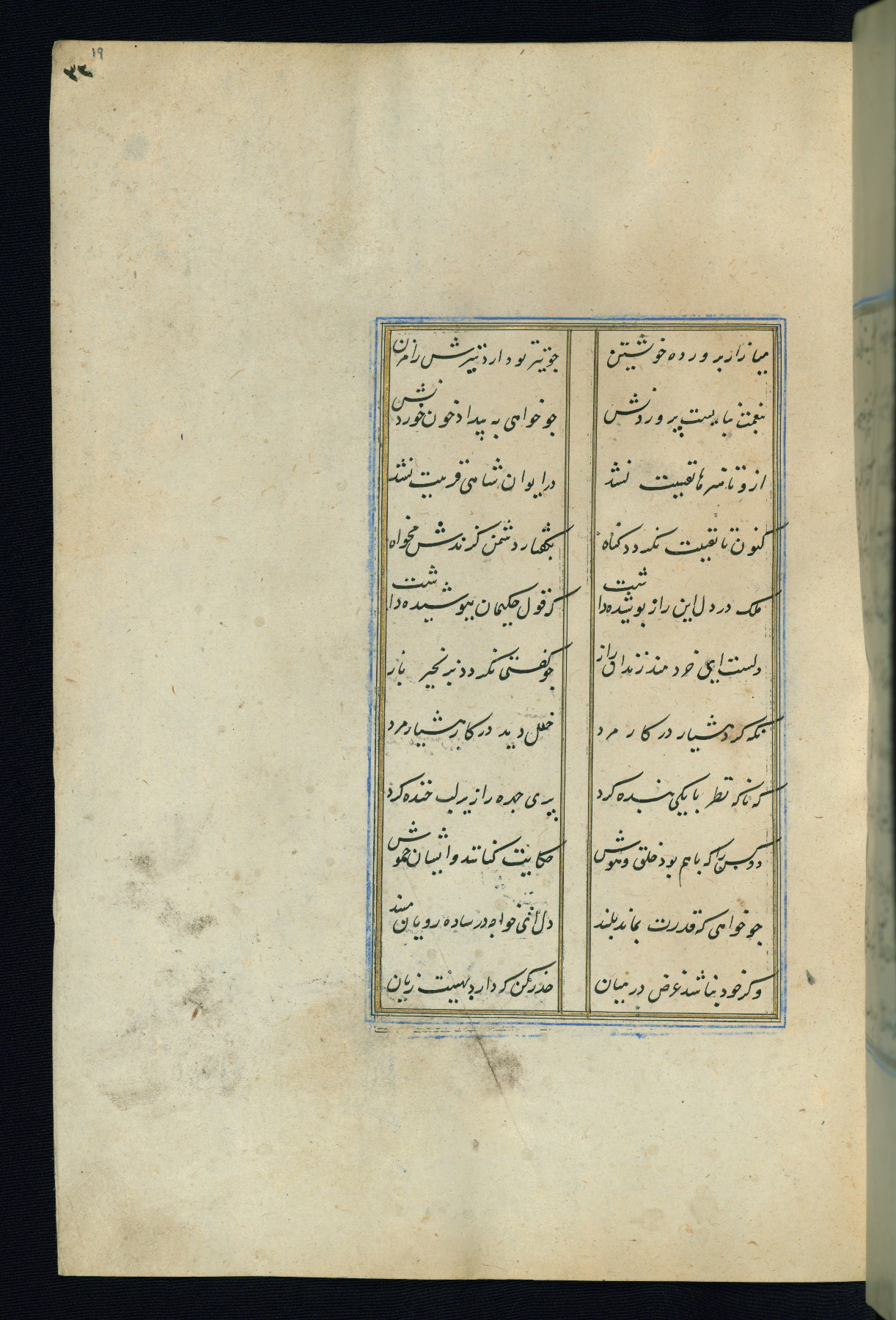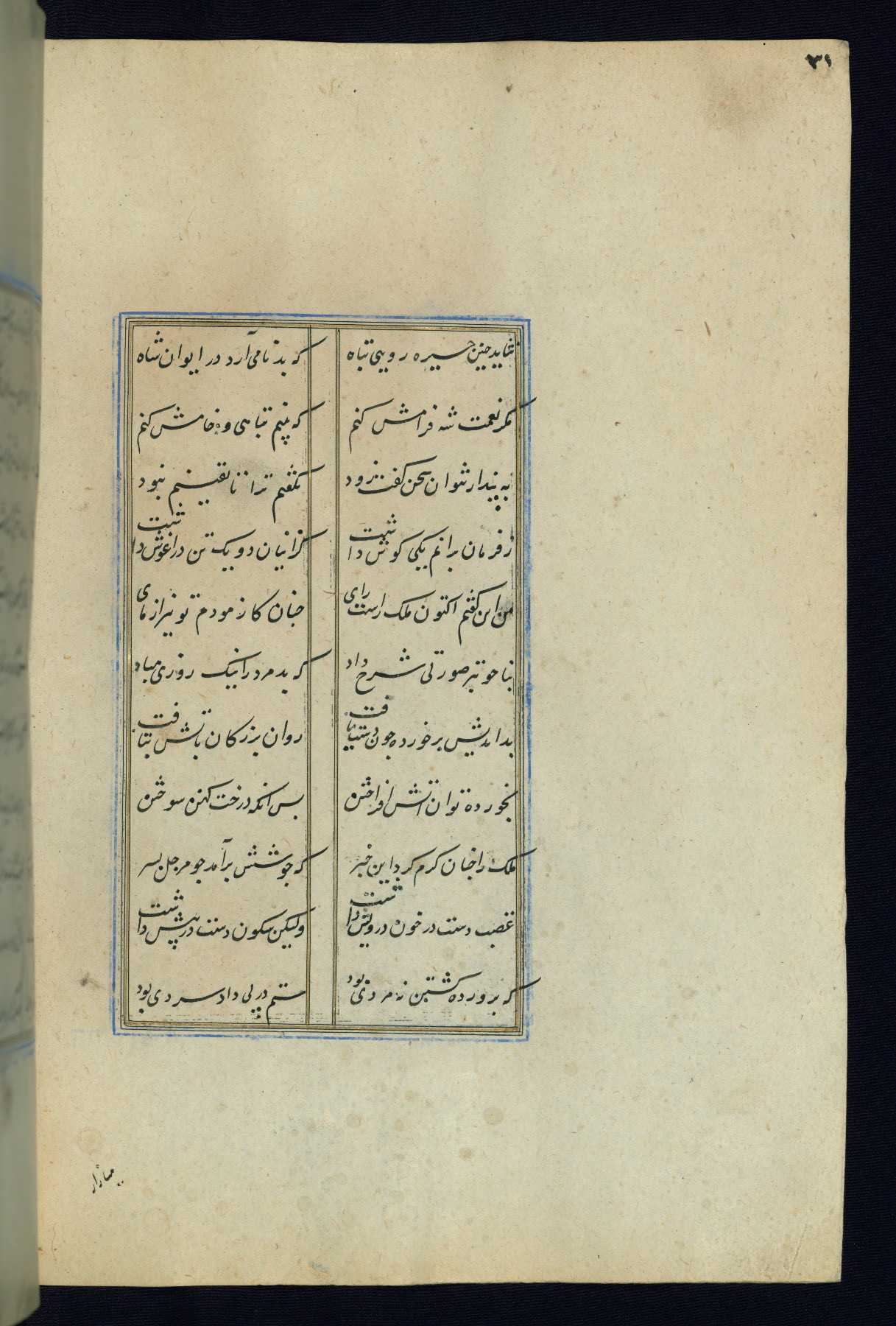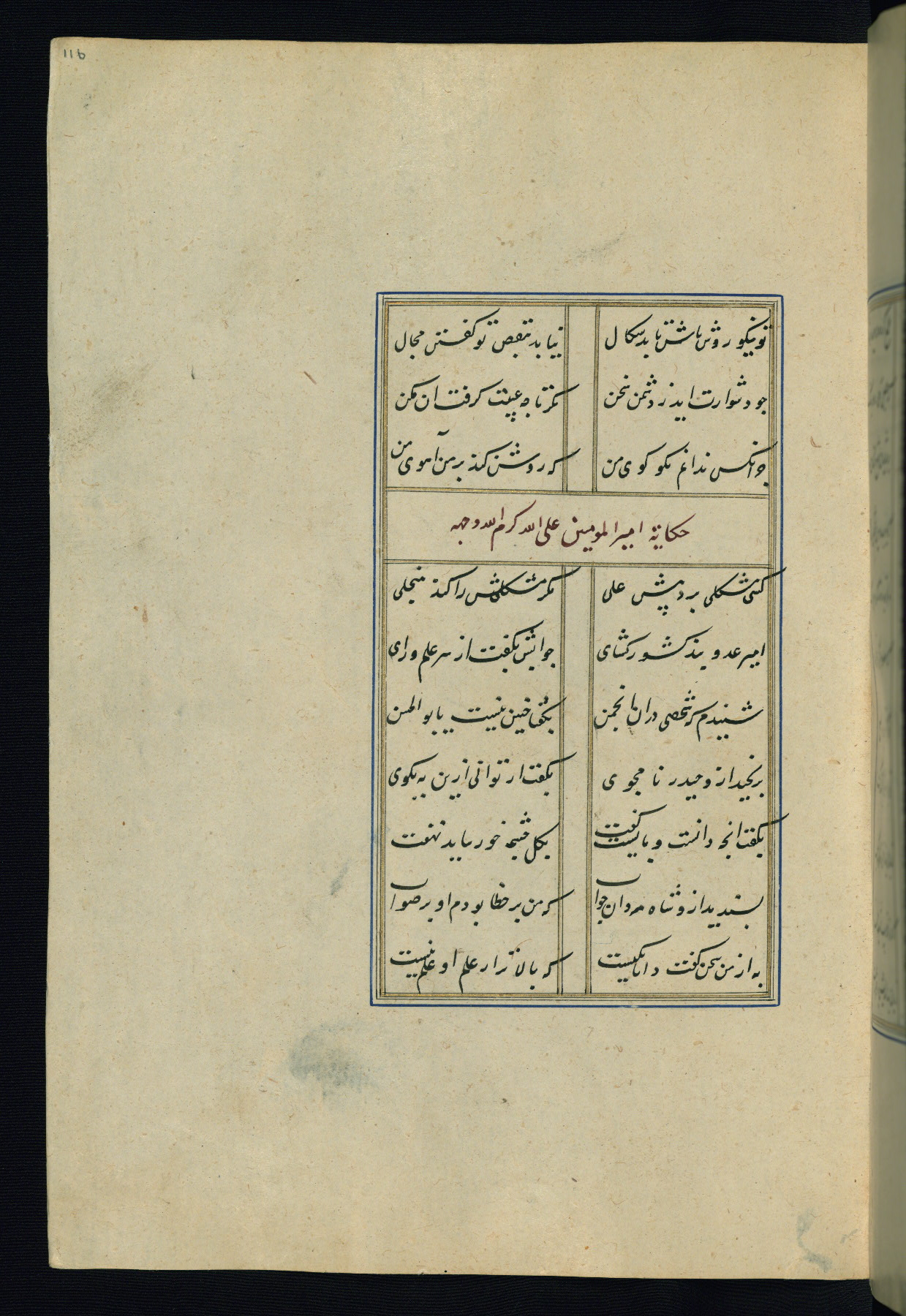 This is an illuminated and illustrated Safavid copy of the Būstān (The garden or The orchard), composed by Sa’dī (d. 691 AH / 1292 CE). It was written in black nasta’līq script in the ninth century AH / sixteenth CE in Iran. The codex opens with a frontispiece with the title Kitāb-i būstān inscribed in an illuminated medallion (fol. 1a), followed by a double-page illustration of a banquet scene in a landscape (fols. 1b-2a). Additionally, there are five paintings illustrating the text (fols. 25a, 55b, 58a, 93b, and 119b). The brown leather, blind-stamped binding decorated with a central oval and pendants is not contemporary with the manuscript.