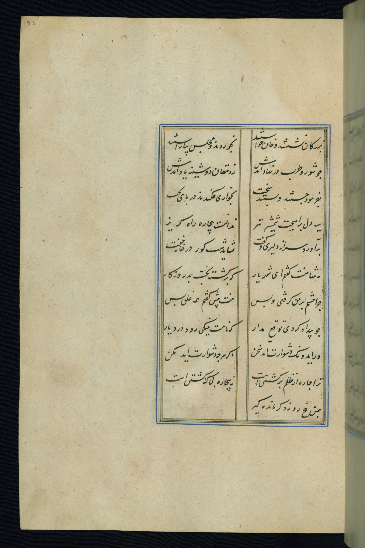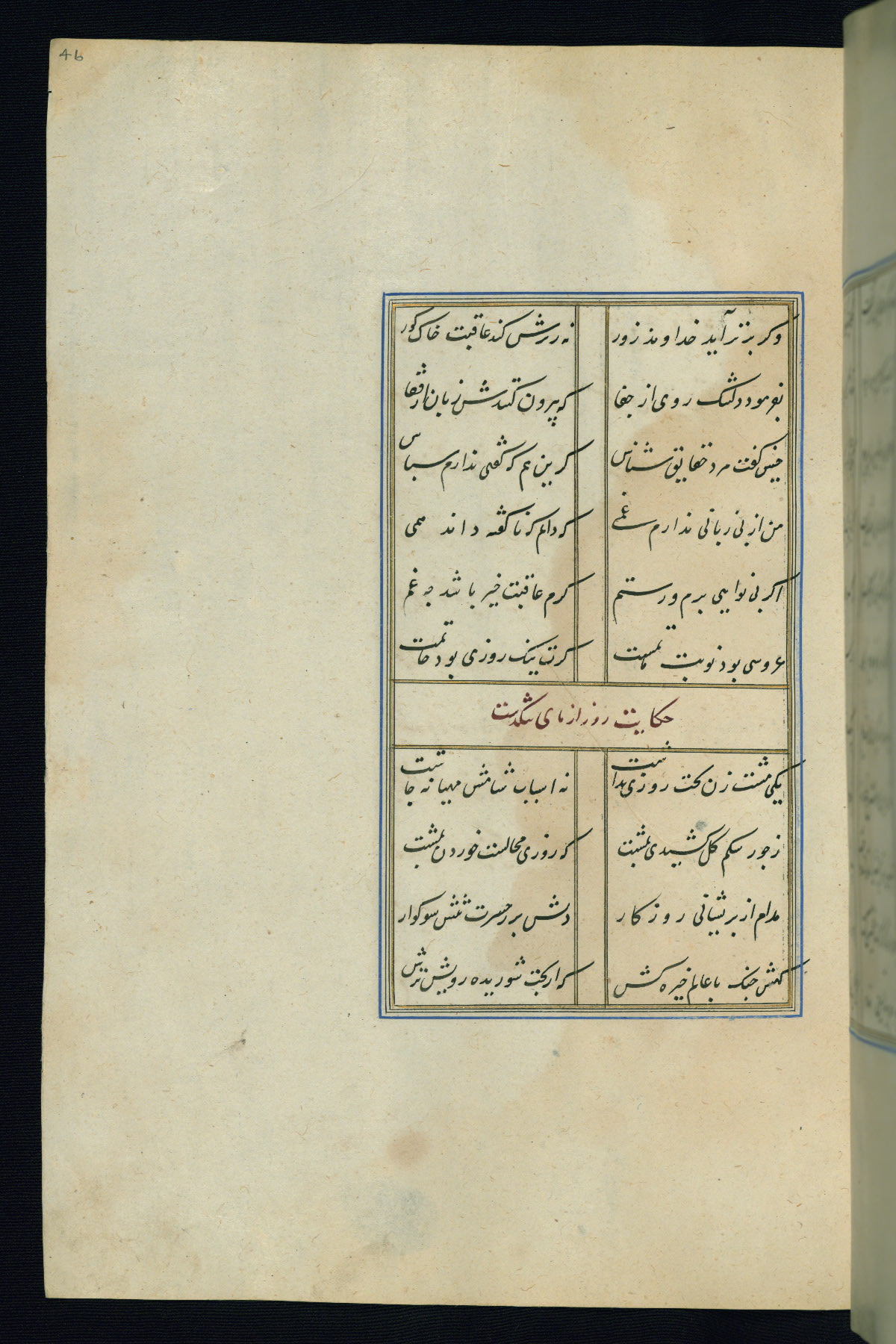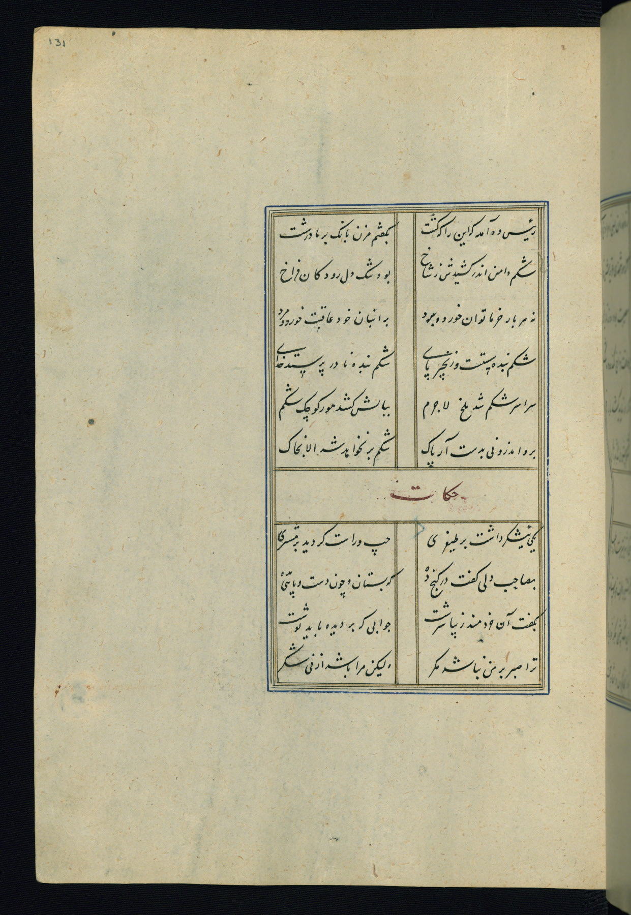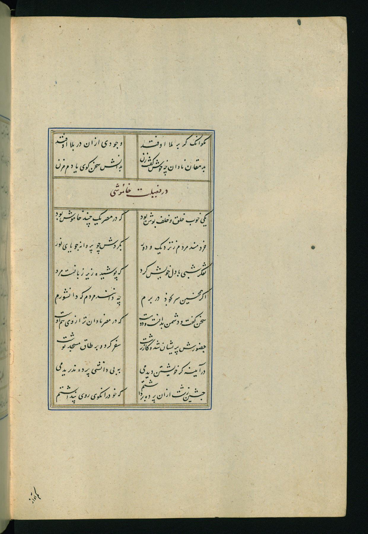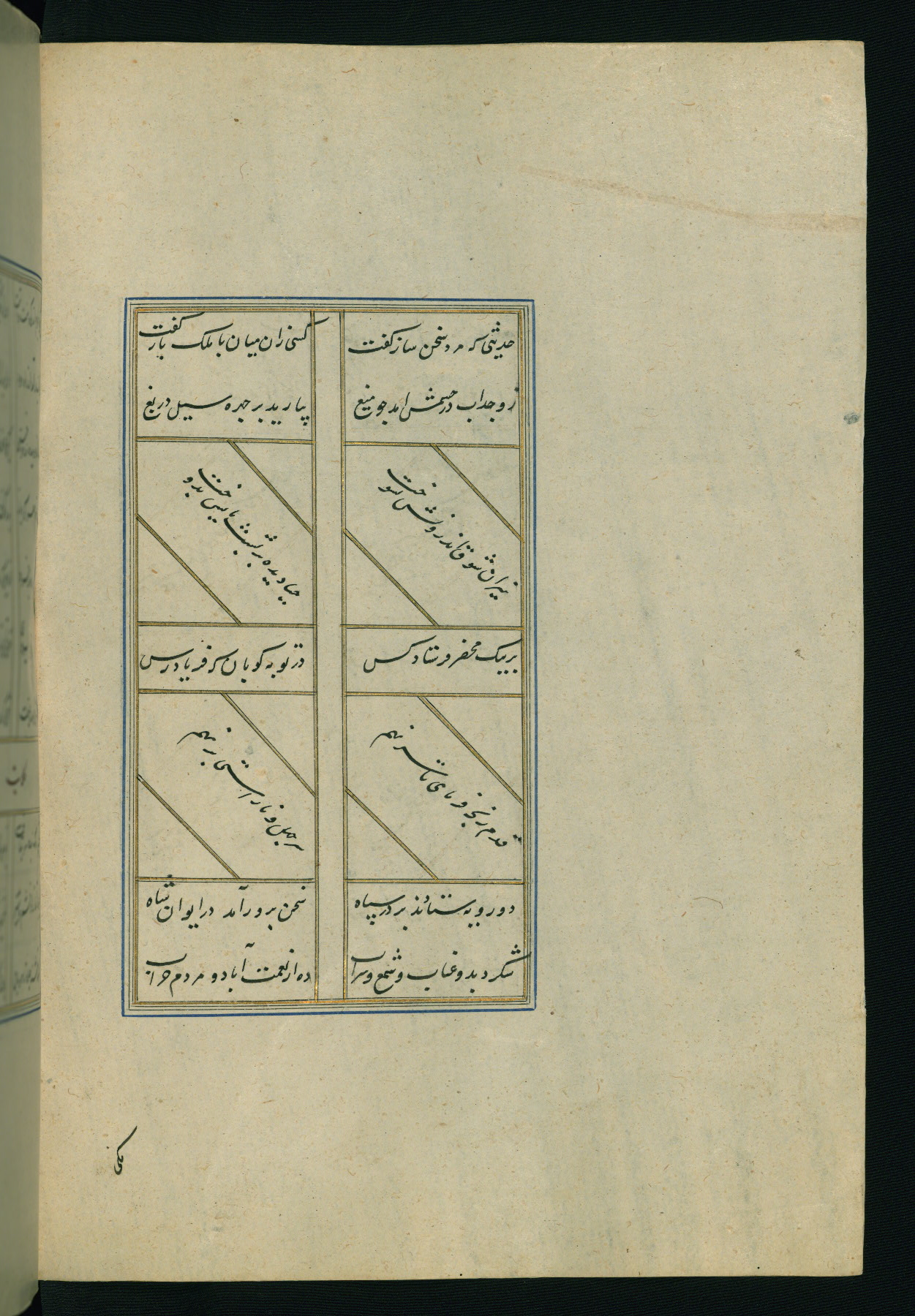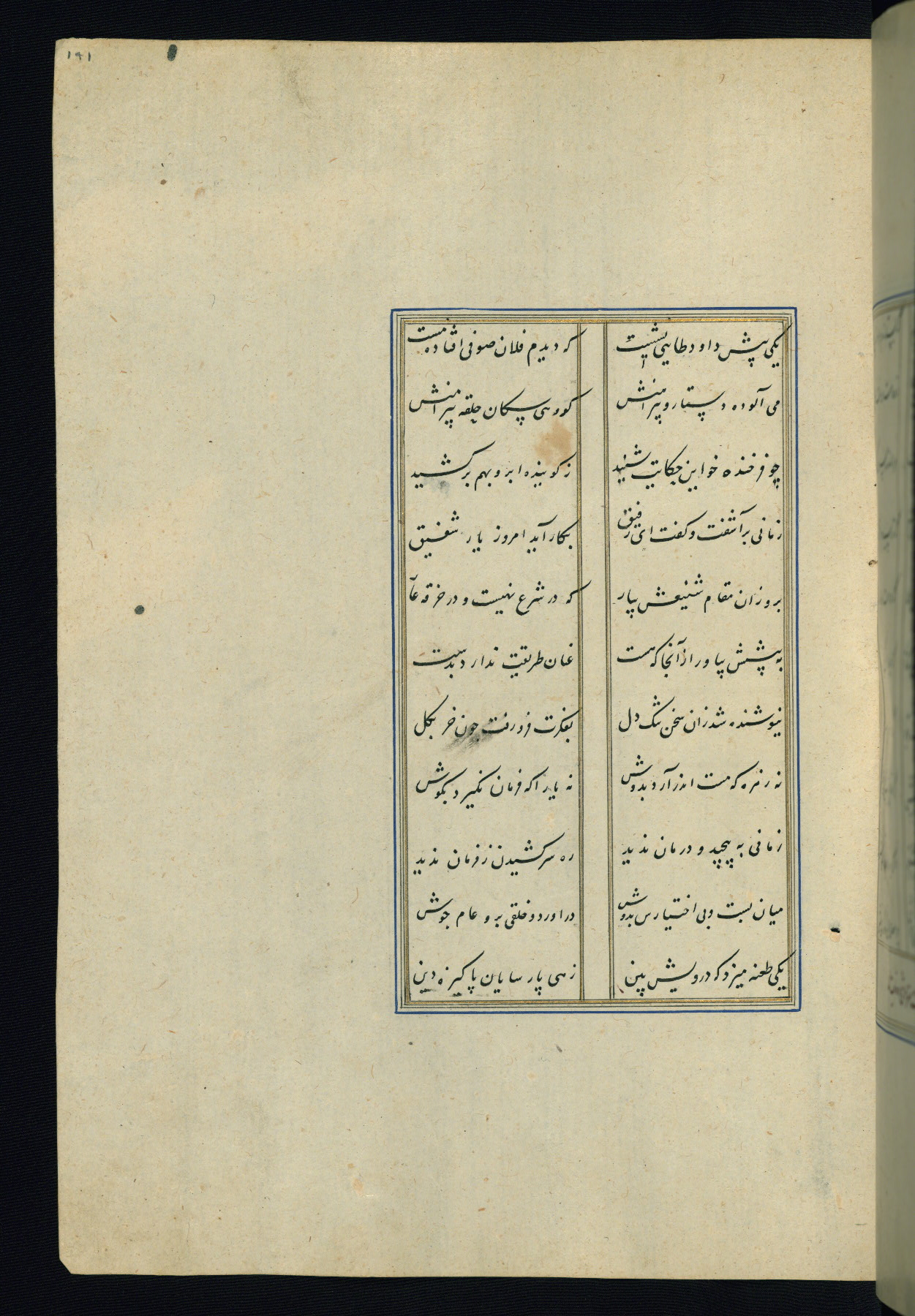 This is an illuminated and illustrated Safavid copy of the Būstān (The garden or The orchard), composed by Sa’dī (d. 691 AH / 1292 CE). It was written in black nasta’līq script in the ninth century AH / sixteenth CE in Iran. The codex opens with a frontispiece with the title Kitāb-i būstān inscribed in an illuminated medallion (fol. 1a), followed by a double-page illustration of a banquet scene in a landscape (fols. 1b-2a). Additionally, there are five paintings illustrating the text (fols. 25a, 55b, 58a, 93b, and 119b). The brown leather, blind-stamped binding decorated with a central oval and pendants is not contemporary with the manuscript.