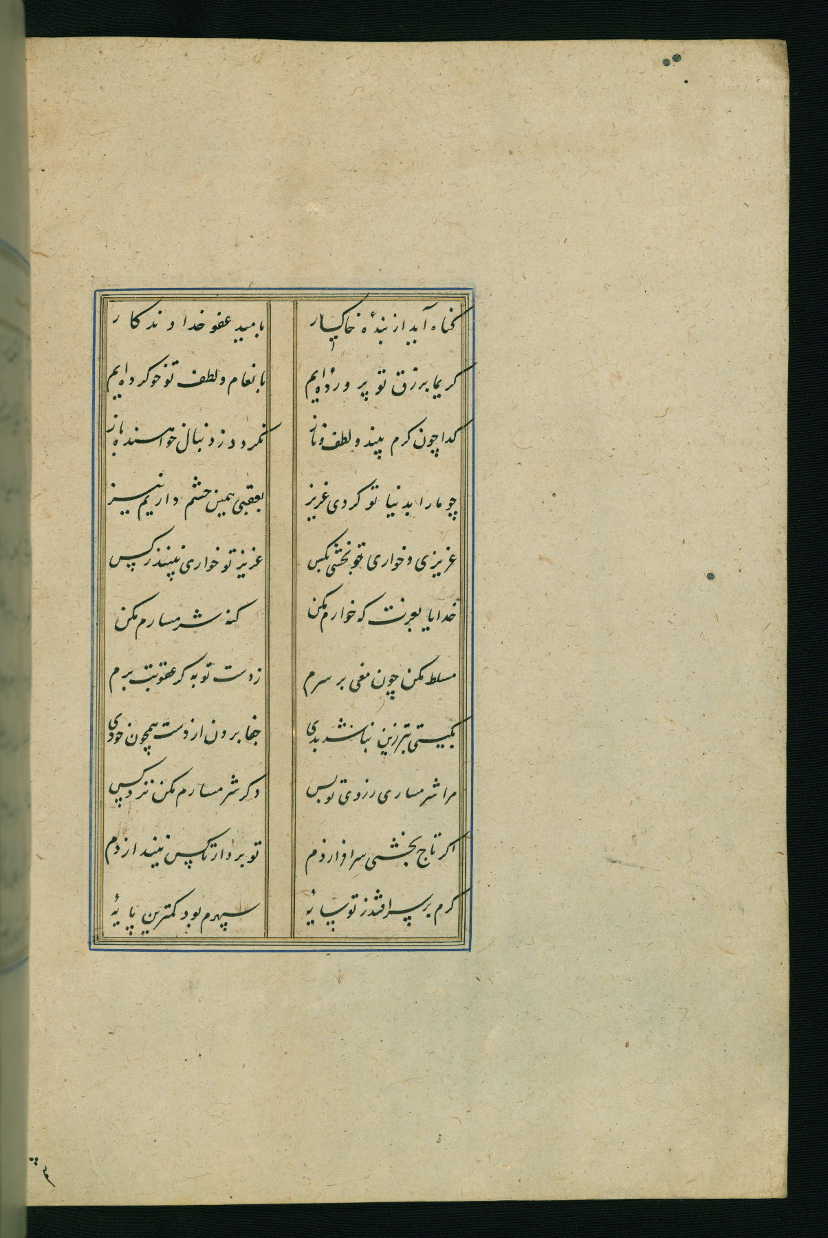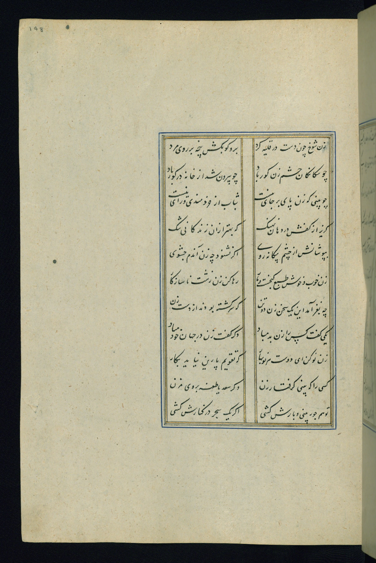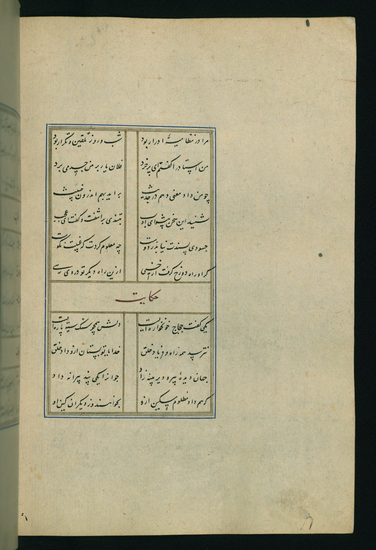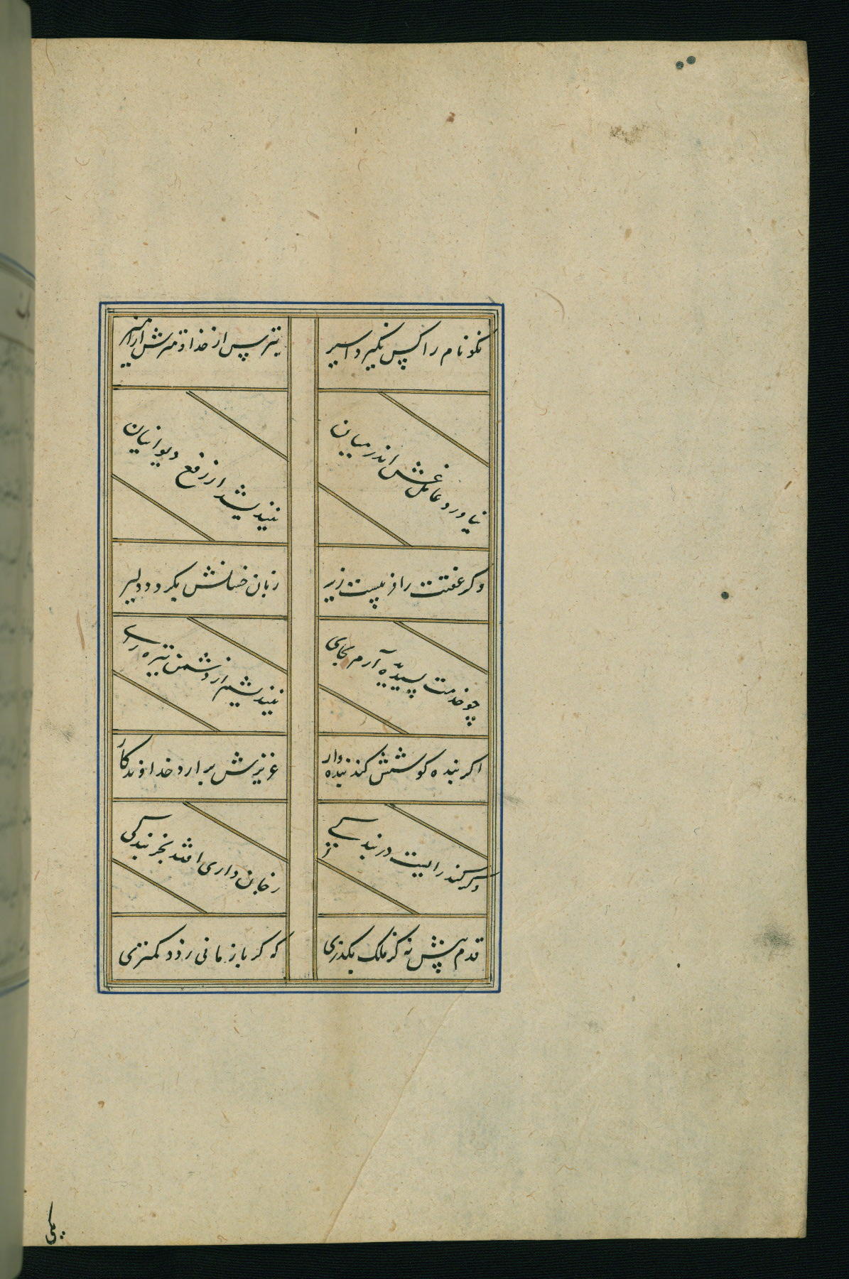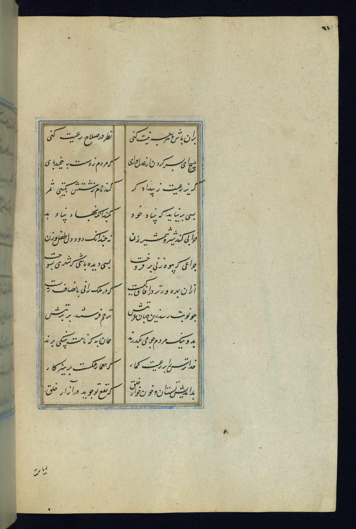This is an illuminated and illustrated Safavid copy of the Būstān (The garden or The orchard), composed by Sa’dī (d. 691 AH / 1292 CE). It was written in black nasta’līq script in the ninth century AH / sixteenth CE in Iran. The codex opens with a frontispiece with the title Kitāb-i būstān inscribed in an illuminated medallion (fol. 1a), followed by a double-page illustration of a banquet scene in a landscape (fols. 1b-2a). Additionally, there are five paintings illustrating the text (fols. 25a, 55b, 58a, 93b, and 119b). The brown leather, blind-stamped binding decorated with a central oval and pendants is not contemporary with the manuscript.