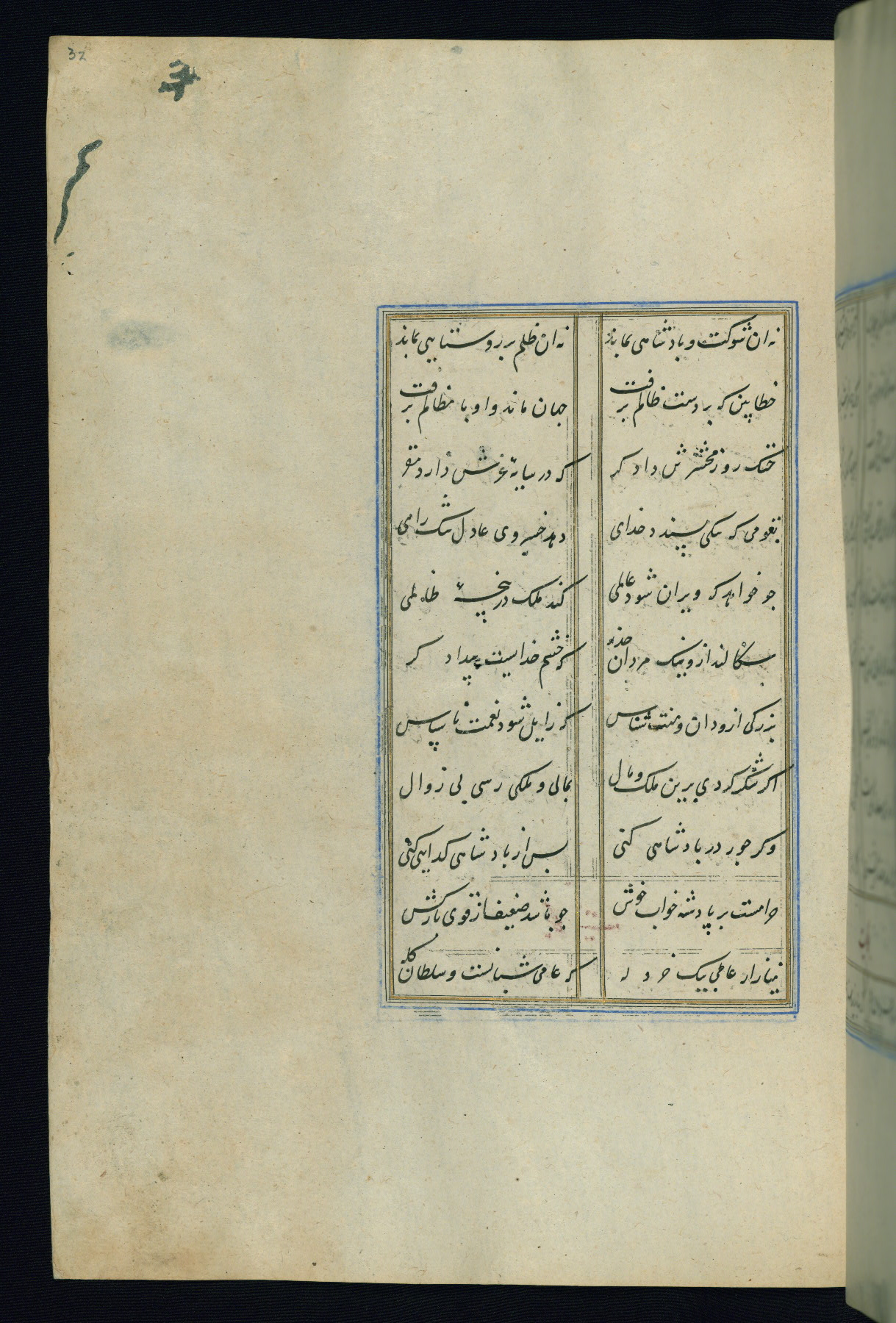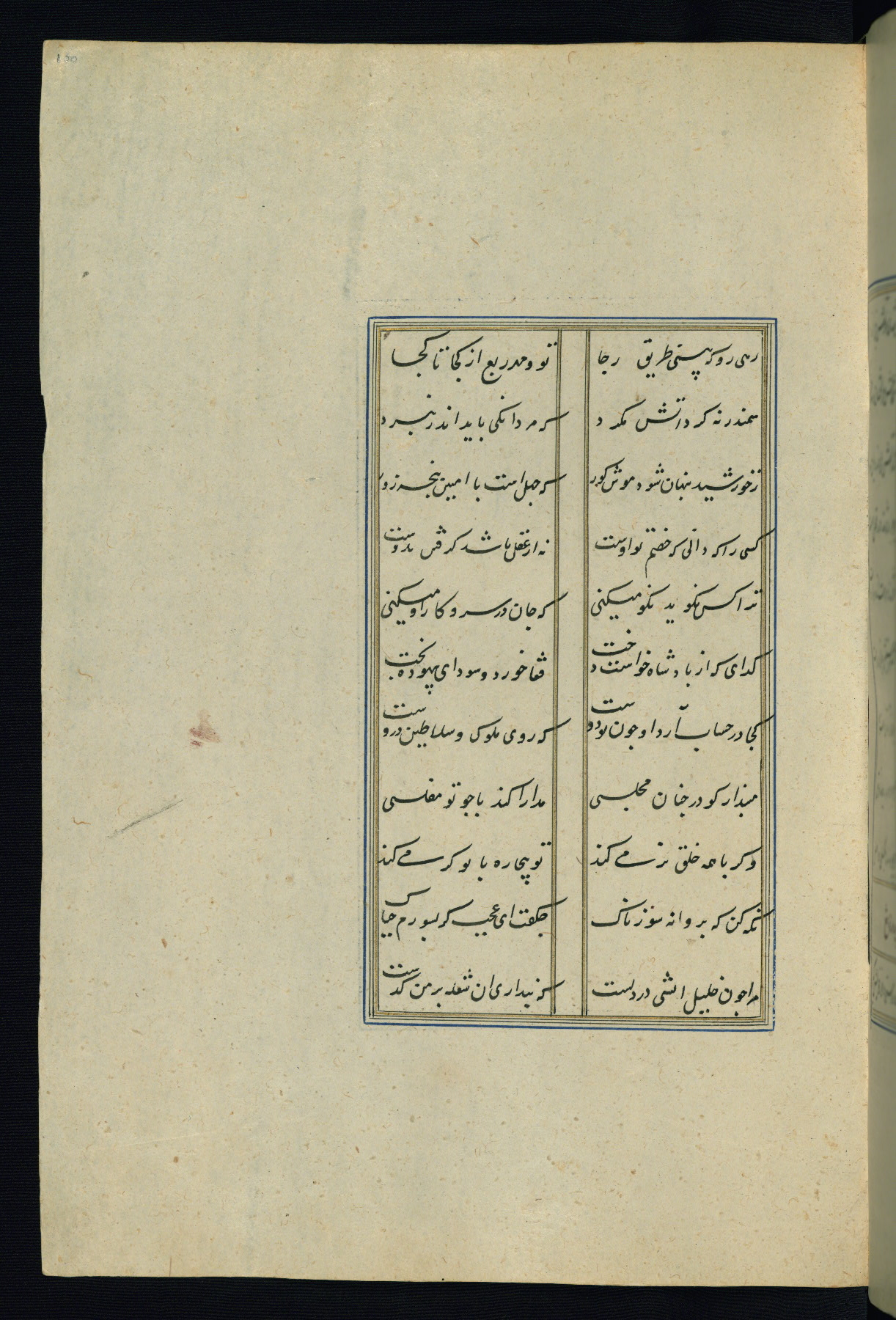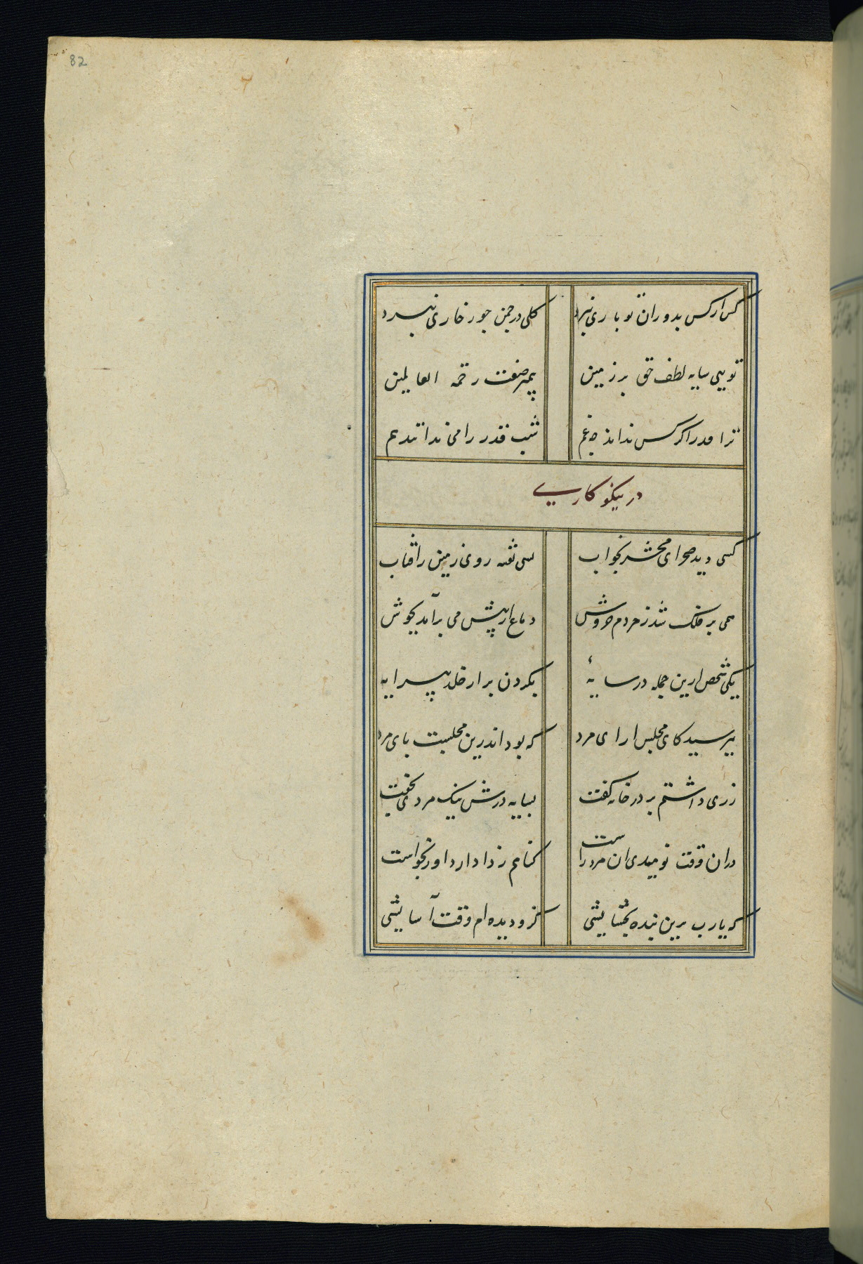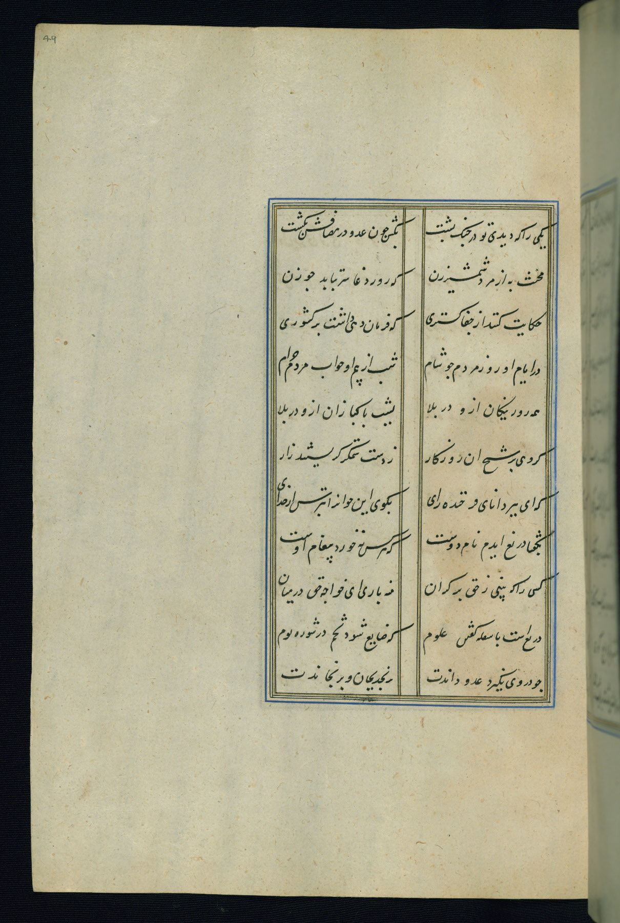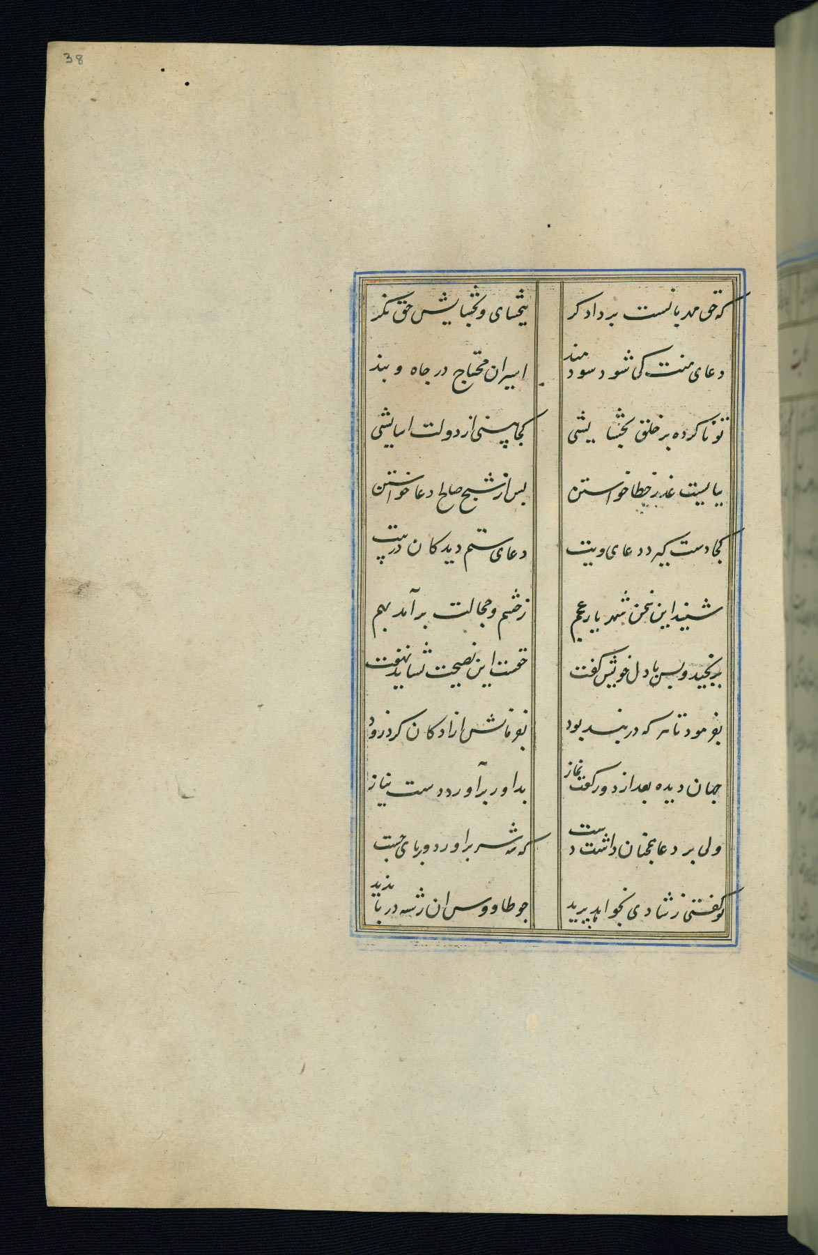 This is an illuminated and illustrated Safavid copy of the Būstān (The garden or The orchard), composed by Sa’dī (d. 691 AH / 1292 CE). It was written in black nasta’līq script in the ninth century AH / sixteenth CE in Iran. The codex opens with a frontispiece with the title Kitāb-i būstān inscribed in an illuminated medallion (fol. 1a), followed by a double-page illustration of a banquet scene in a landscape (fols. 1b-2a). Additionally, there are five paintings illustrating the text (fols. 25a, 55b, 58a, 93b, and 119b). The brown leather, blind-stamped binding decorated with a central oval and pendants is not contemporary with the manuscript.