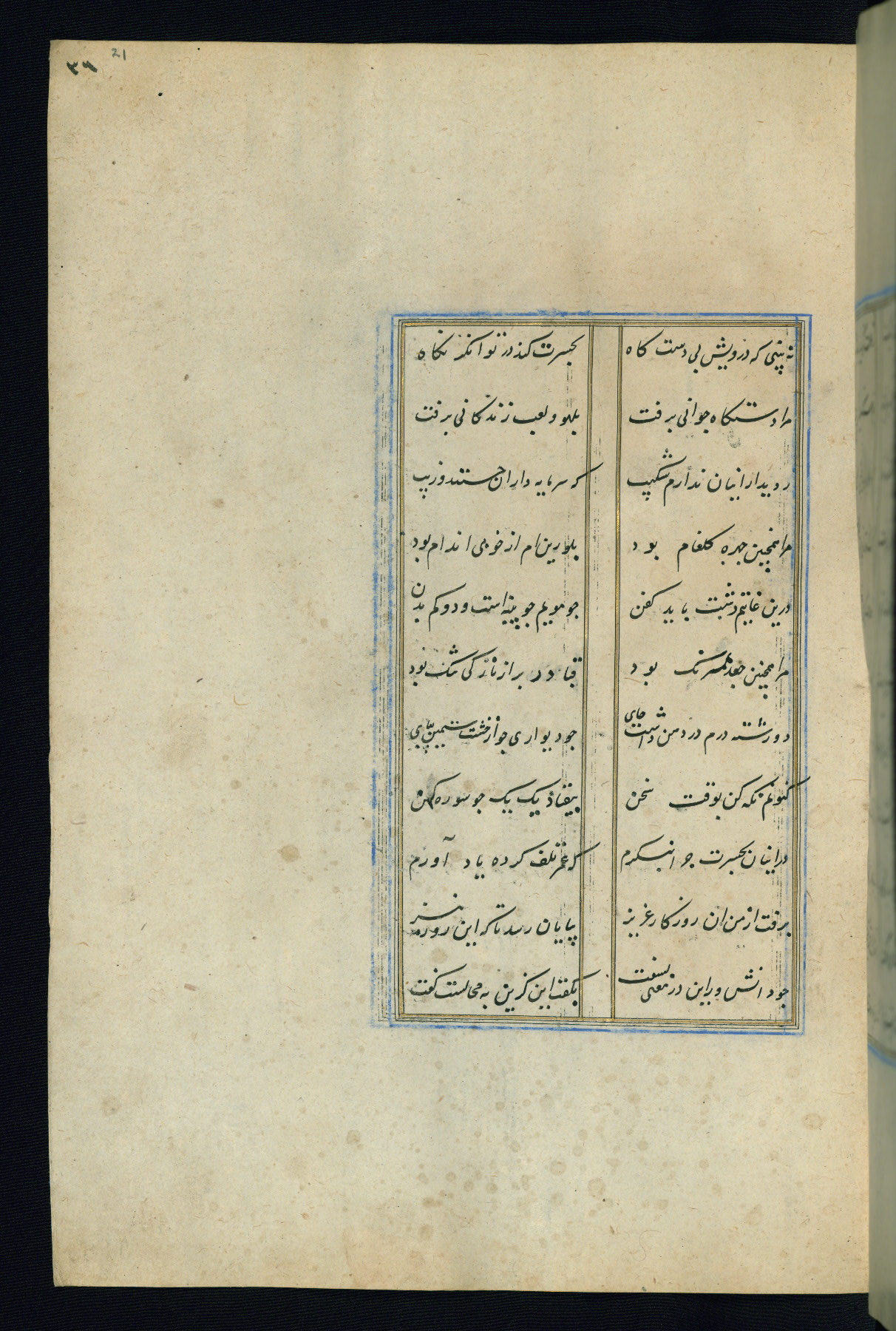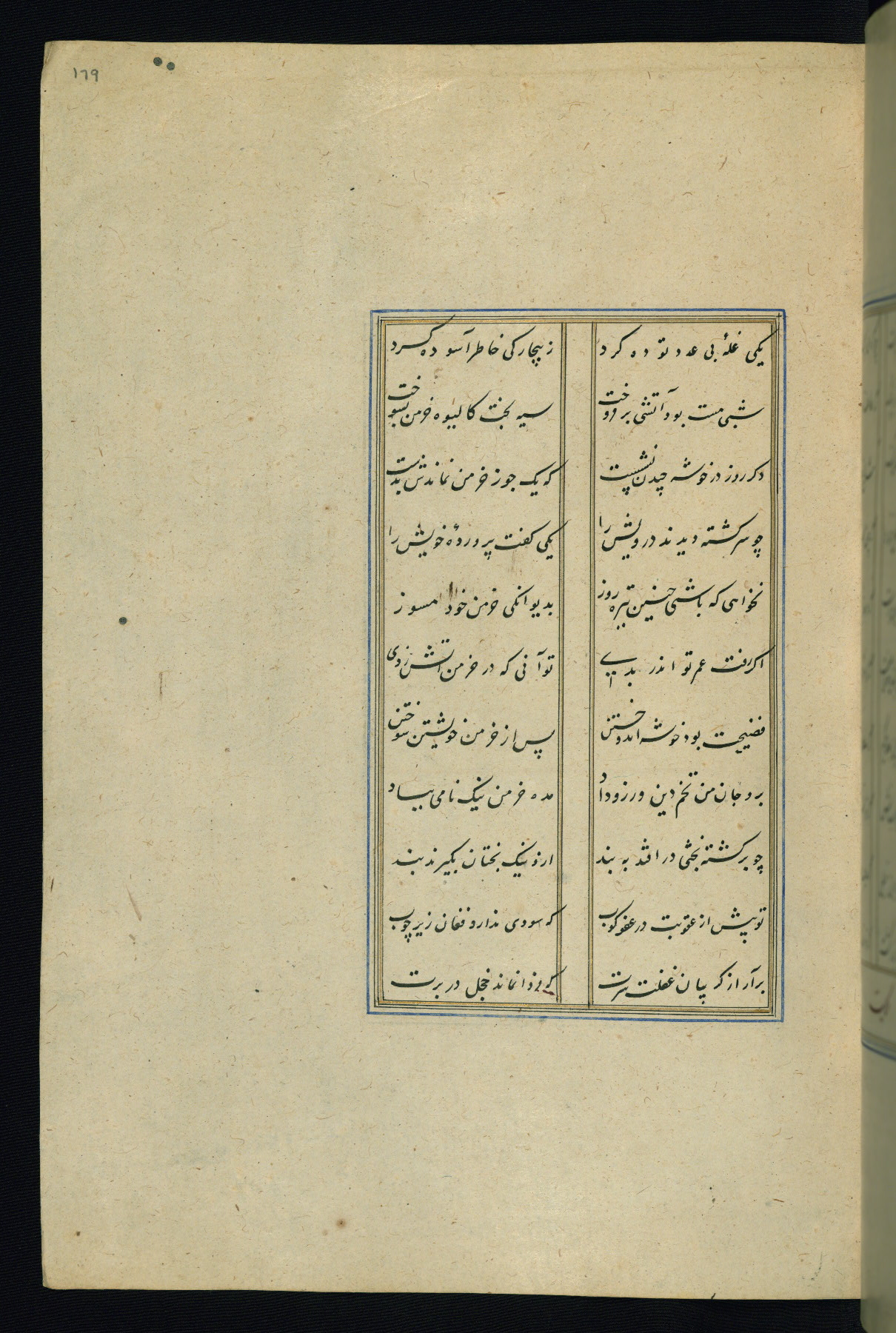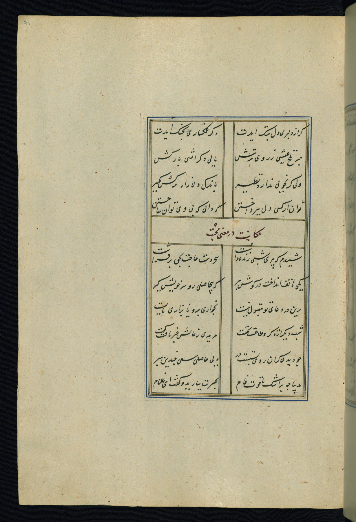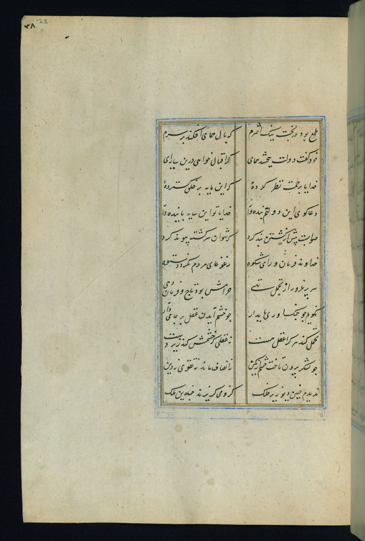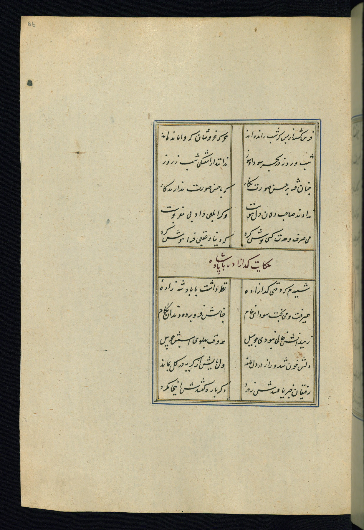 This is an illuminated and illustrated Safavid copy of the Būstān (The garden or The orchard), composed by Sa’dī (d. 691 AH / 1292 CE). It was written in black nasta’līq script in the ninth century AH / sixteenth CE in Iran. The codex opens with a frontispiece with the title Kitāb-i būstān inscribed in an illuminated medallion (fol. 1a), followed by a double-page illustration of a banquet scene in a landscape (fols. 1b-2a). Additionally, there are five paintings illustrating the text (fols. 25a, 55b, 58a, 93b, and 119b). The brown leather, blind-stamped binding decorated with a central oval and pendants is not contemporary with the manuscript.