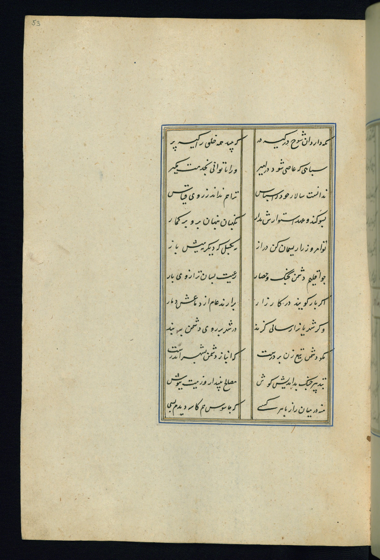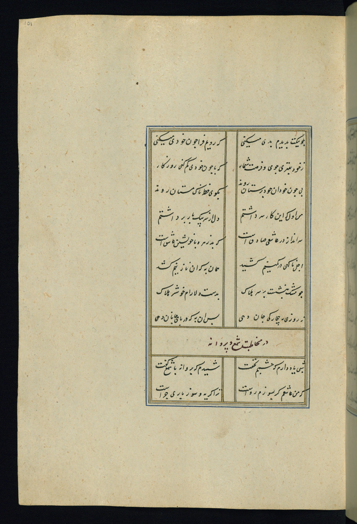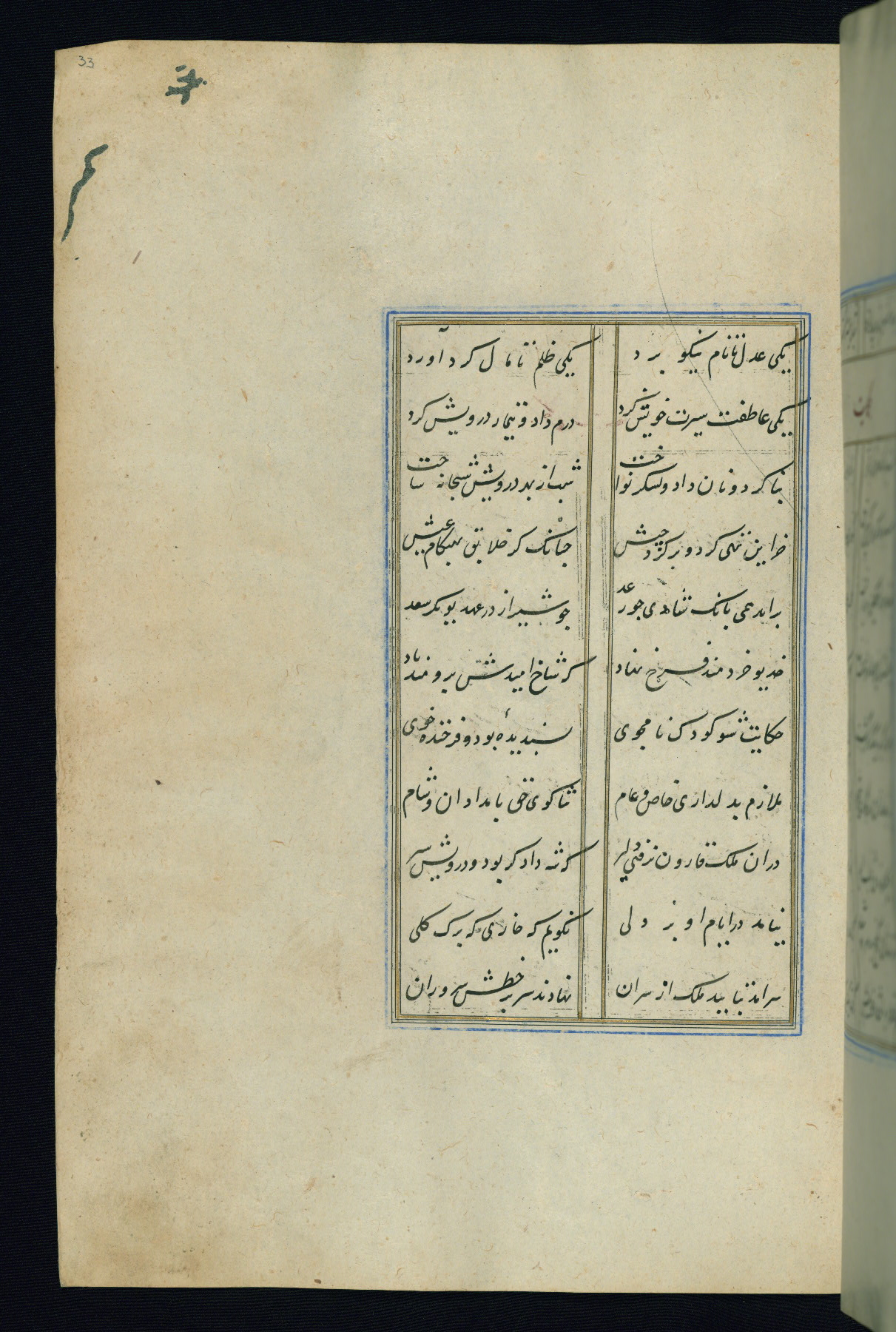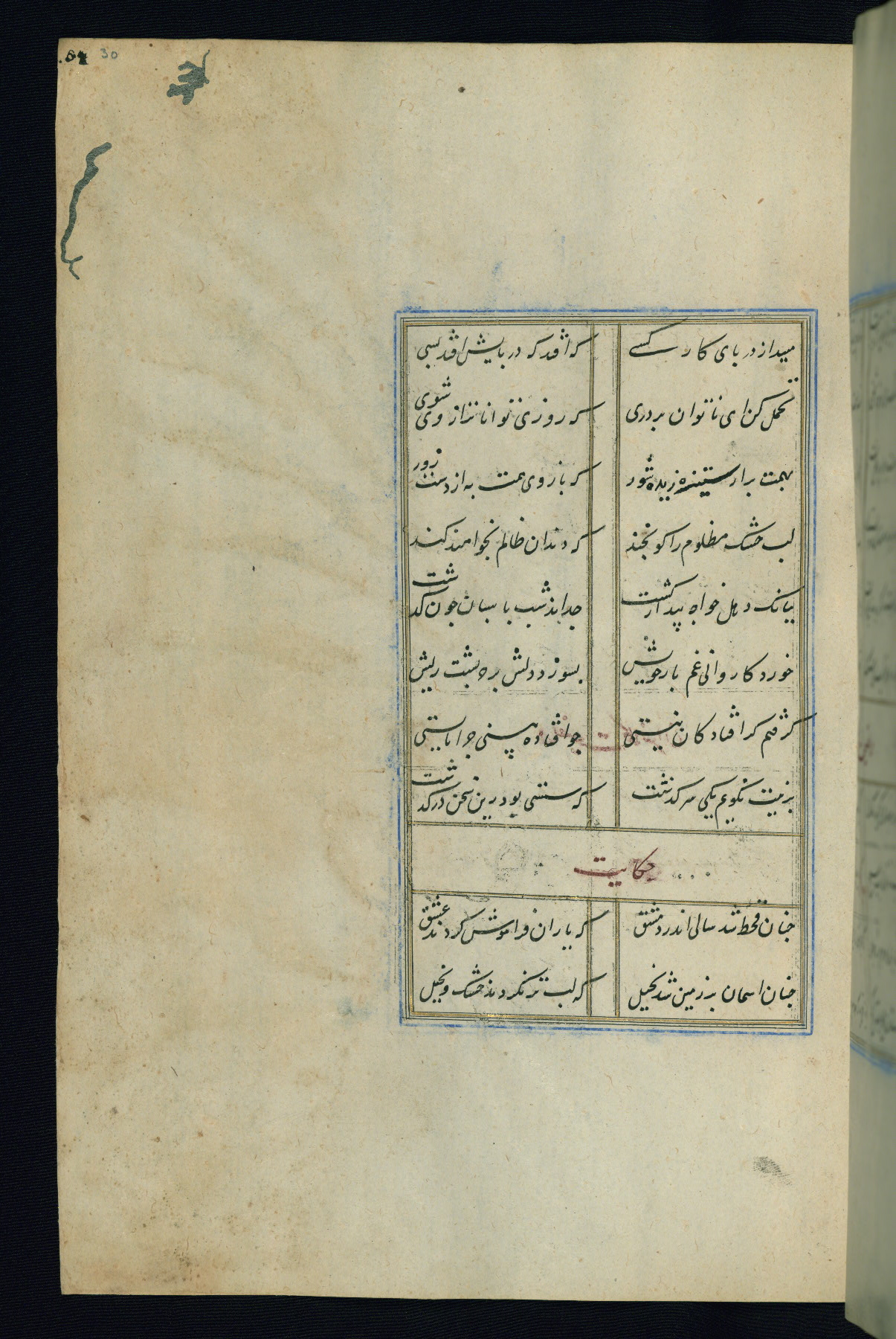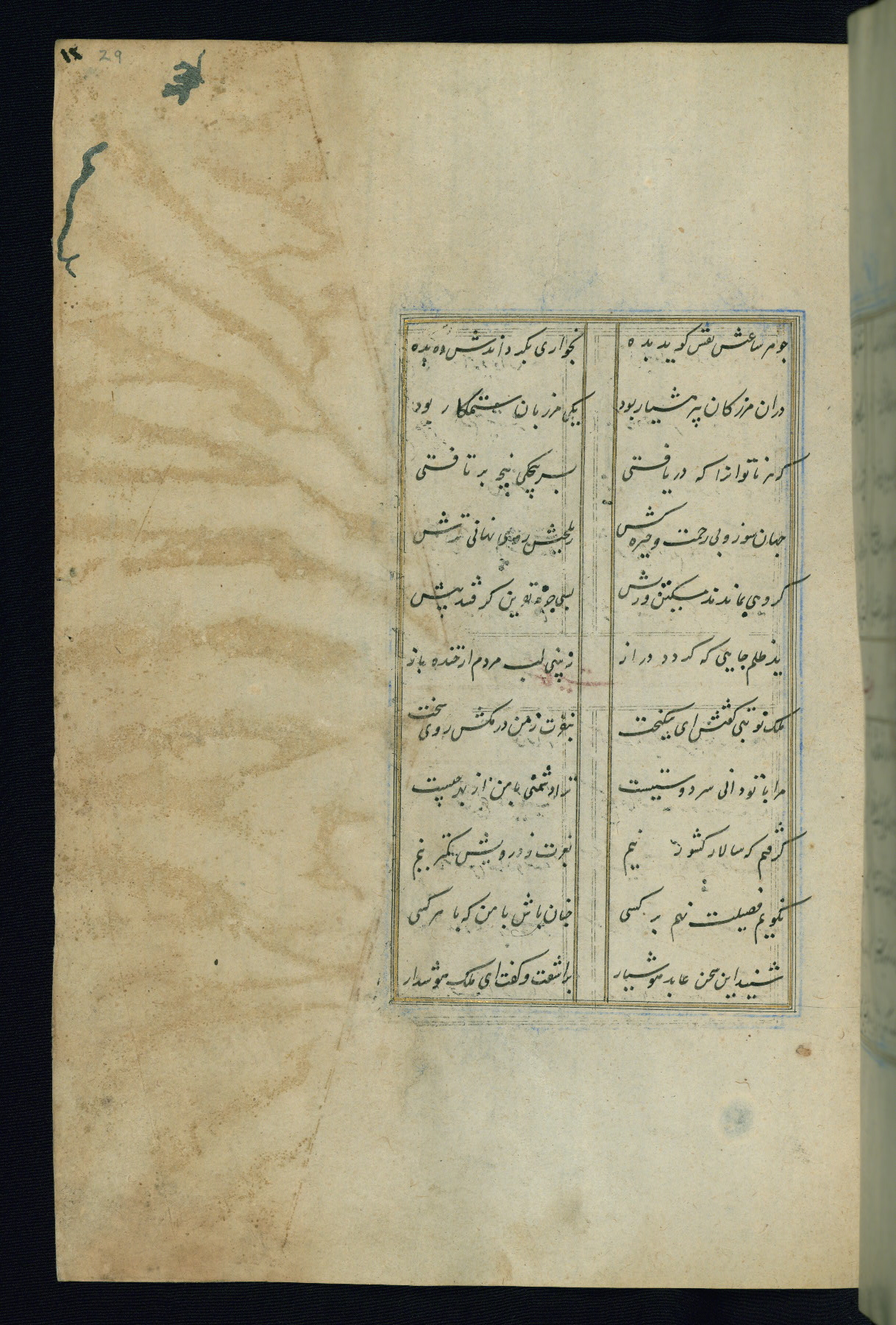This is an illuminated and illustrated Safavid copy of the Būstān (The garden or The orchard), composed by Sa’dī (d. 691 AH / 1292 CE). It was written in black nasta’līq script in the ninth century AH / sixteenth CE in Iran. The codex opens with a frontispiece with the title Kitāb-i būstān inscribed in an illuminated medallion (fol. 1a), followed by a double-page illustration of a banquet scene in a landscape (fols. 1b-2a). Additionally, there are five paintings illustrating the text (fols. 25a, 55b, 58a, 93b, and 119b). The brown leather, blind-stamped binding decorated with a central oval and pendants is not contemporary with the manuscript.
