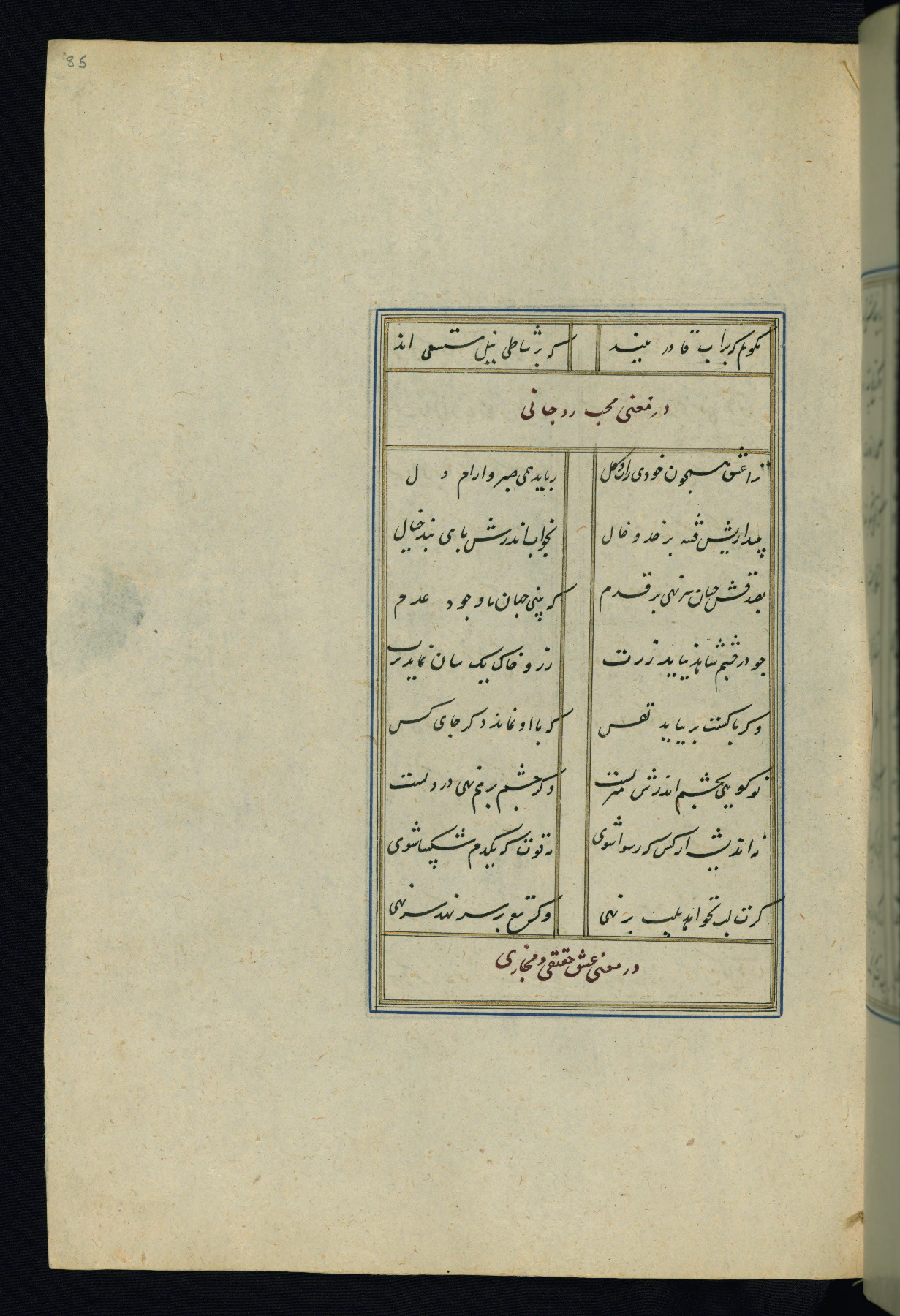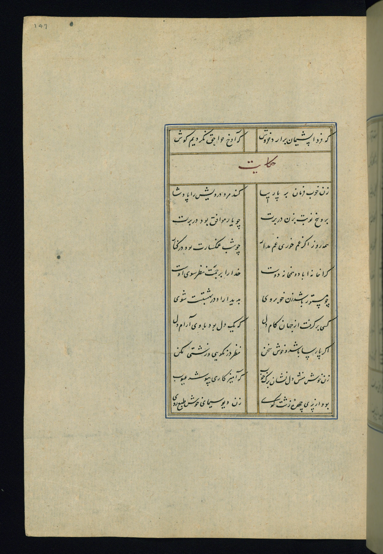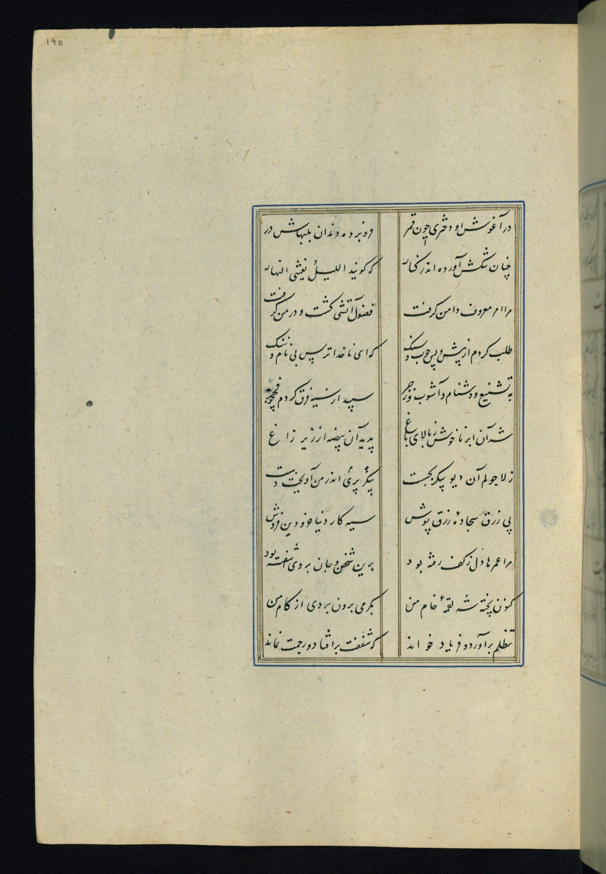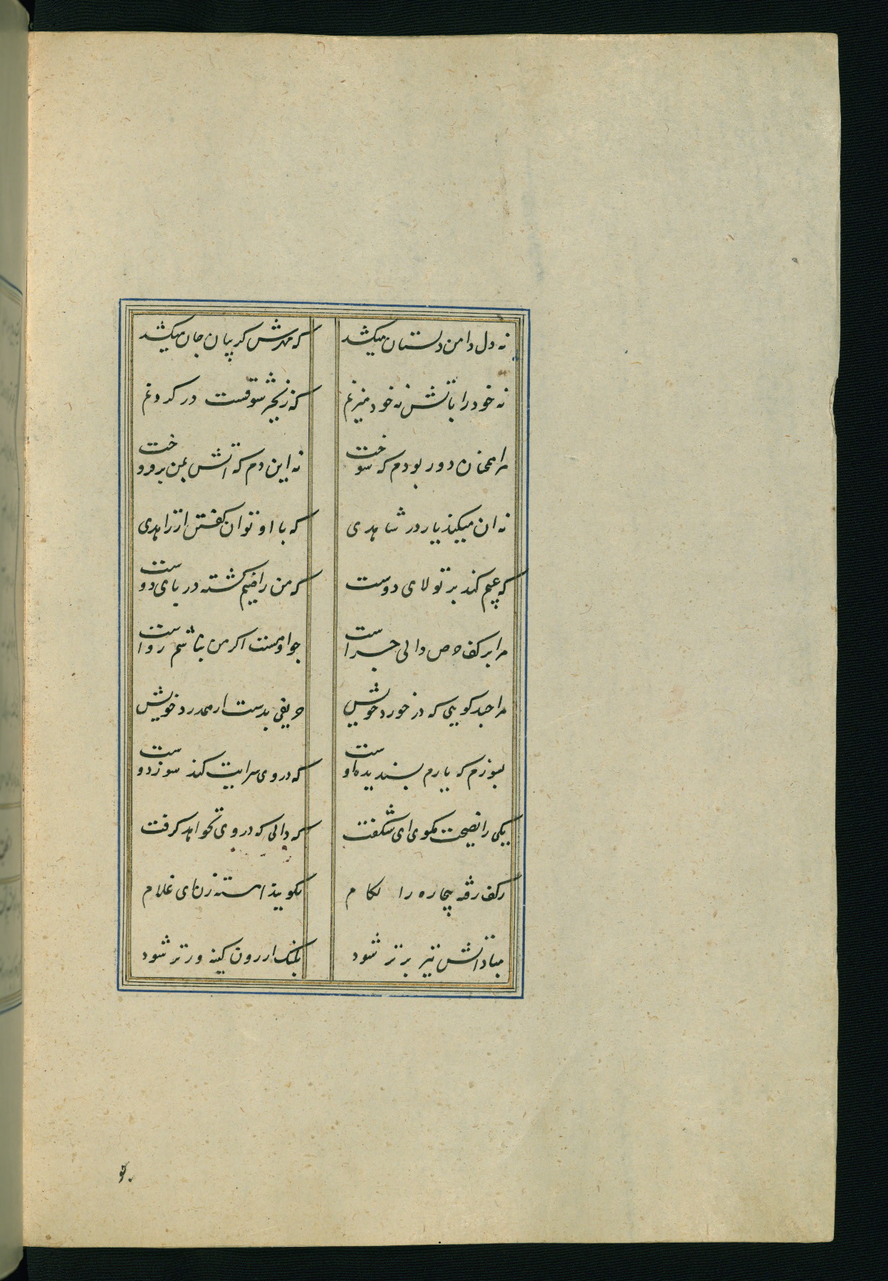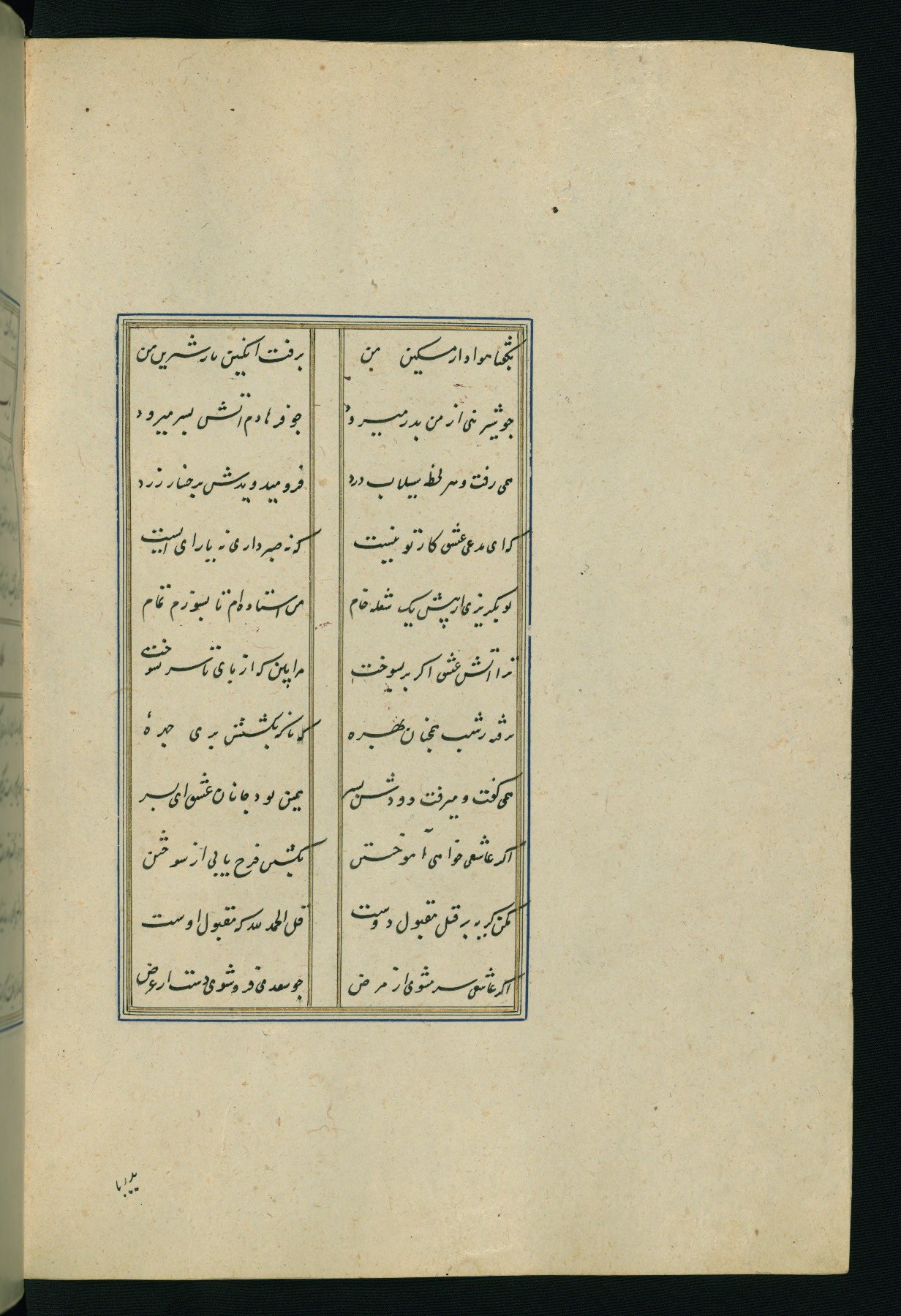 This is an illuminated and illustrated Safavid copy of the Būstān (The garden or The orchard), composed by Sa’dī (d. 691 AH / 1292 CE). It was written in black nasta’līq script in the ninth century AH / sixteenth CE in Iran. The codex opens with a frontispiece with the title Kitāb-i būstān inscribed in an illuminated medallion (fol. 1a), followed by a double-page illustration of a banquet scene in a landscape (fols. 1b-2a). Additionally, there are five paintings illustrating the text (fols. 25a, 55b, 58a, 93b, and 119b). The brown leather, blind-stamped binding decorated with a central oval and pendants is not contemporary with the manuscript.