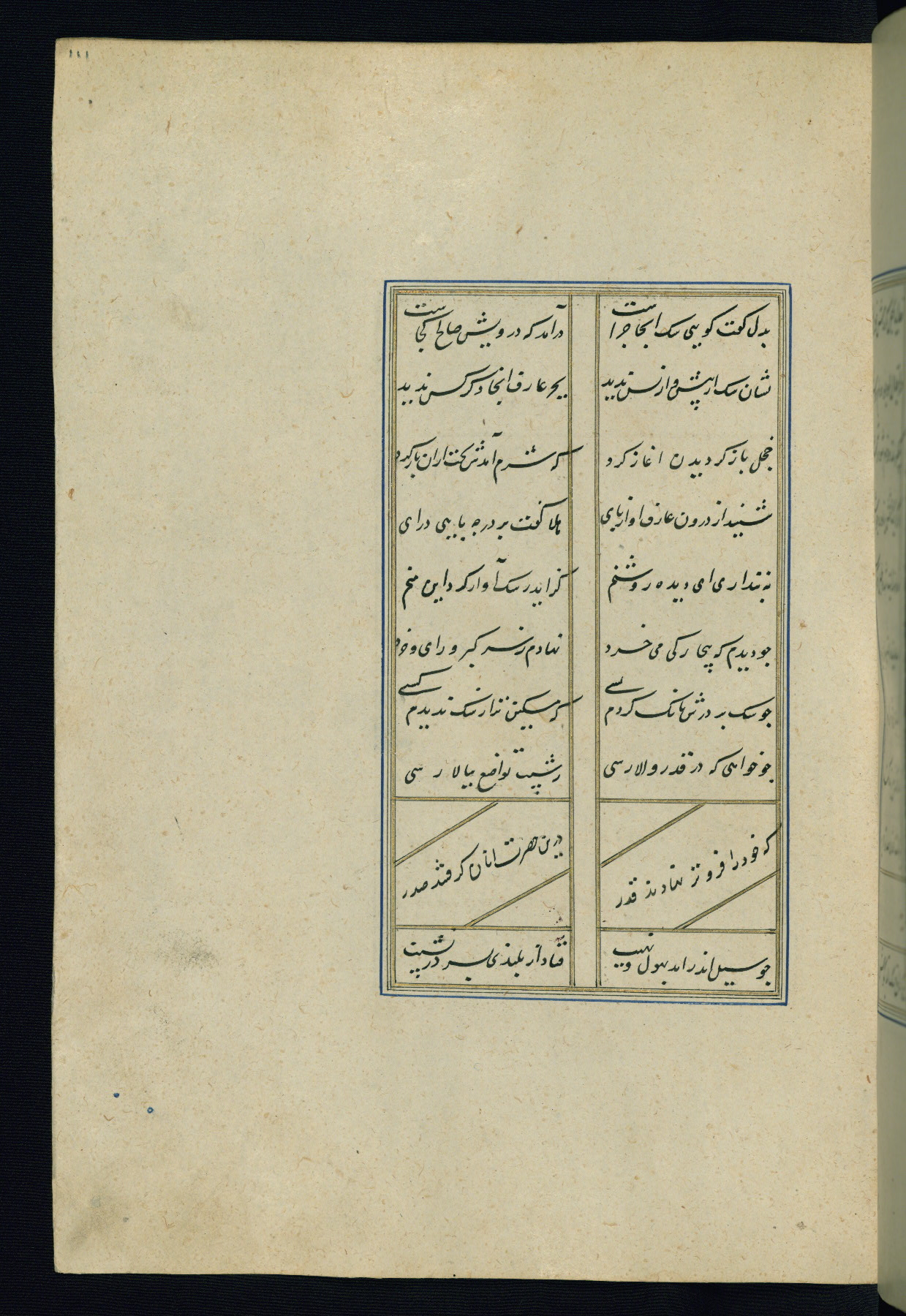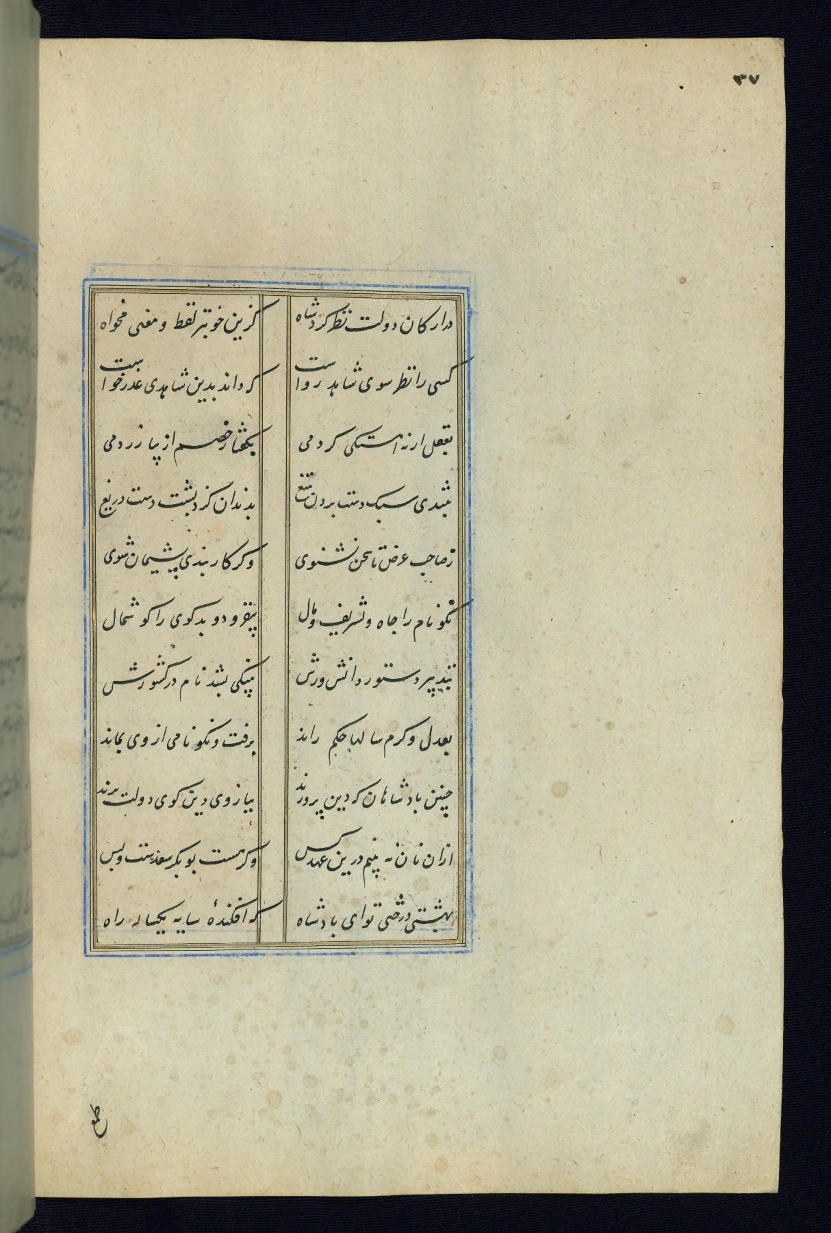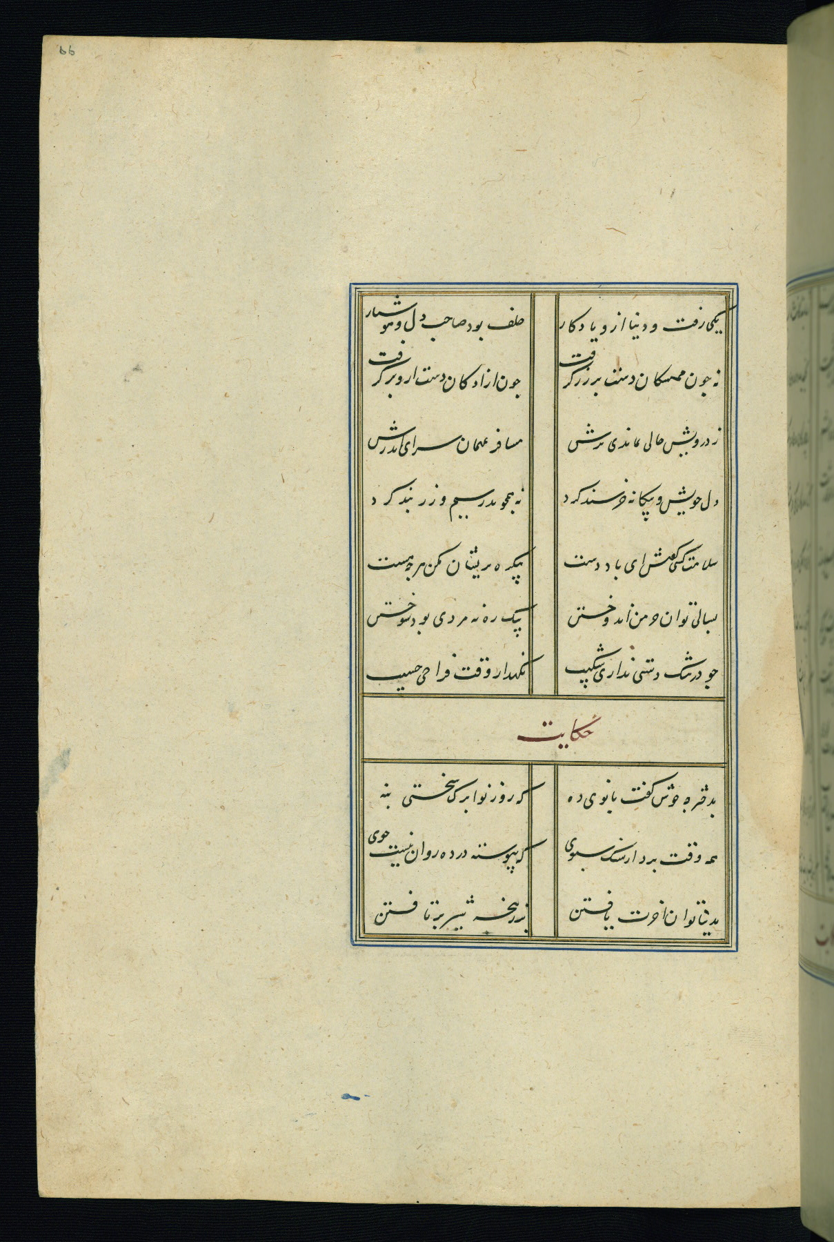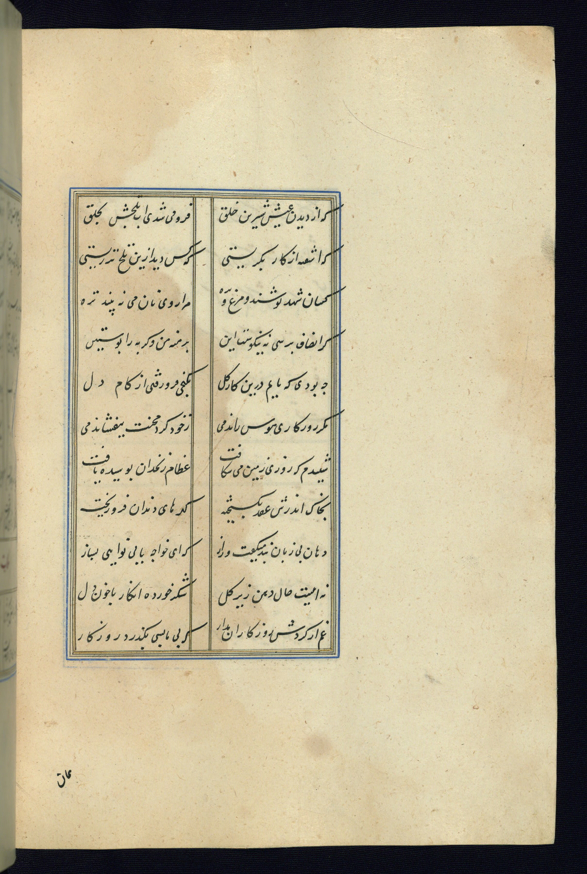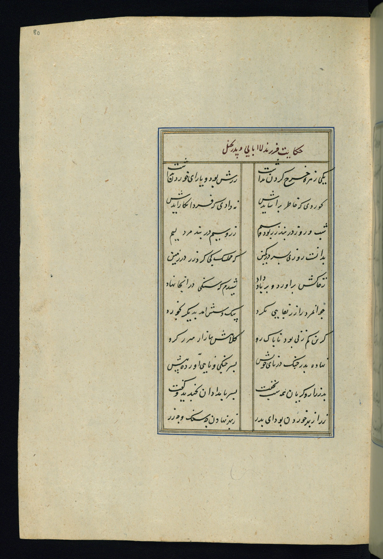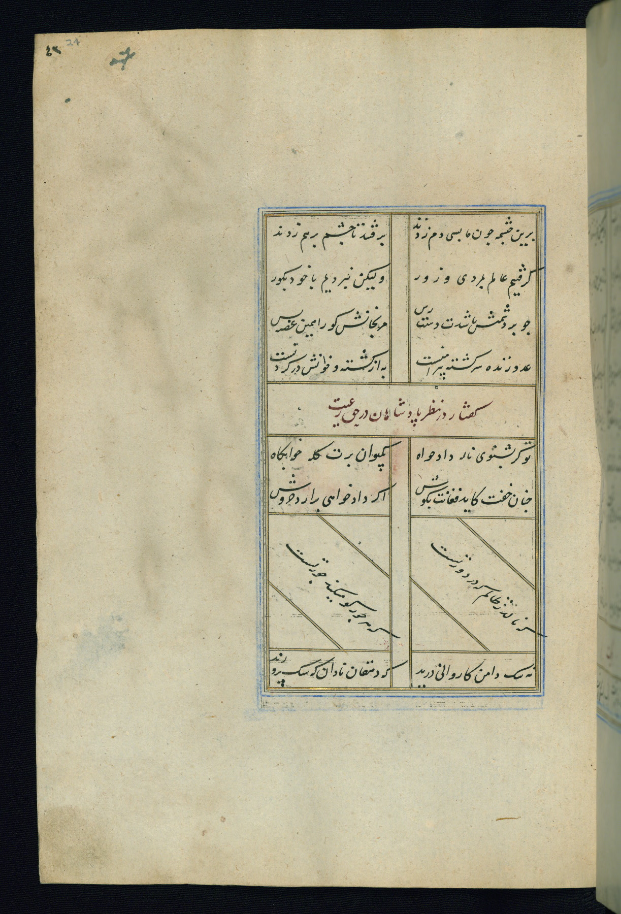 This is an illuminated and illustrated Safavid copy of the Būstān (The garden or The orchard), composed by Sa’dī (d. 691 AH / 1292 CE). It was written in black nasta’līq script in the ninth century AH / sixteenth CE in Iran. The codex opens with a frontispiece with the title Kitāb-i būstān inscribed in an illuminated medallion (fol. 1a), followed by a double-page illustration of a banquet scene in a landscape (fols. 1b-2a). Additionally, there are five paintings illustrating the text (fols. 25a, 55b, 58a, 93b, and 119b). The brown leather, blind-stamped binding decorated with a central oval and pendants is not contemporary with the manuscript.