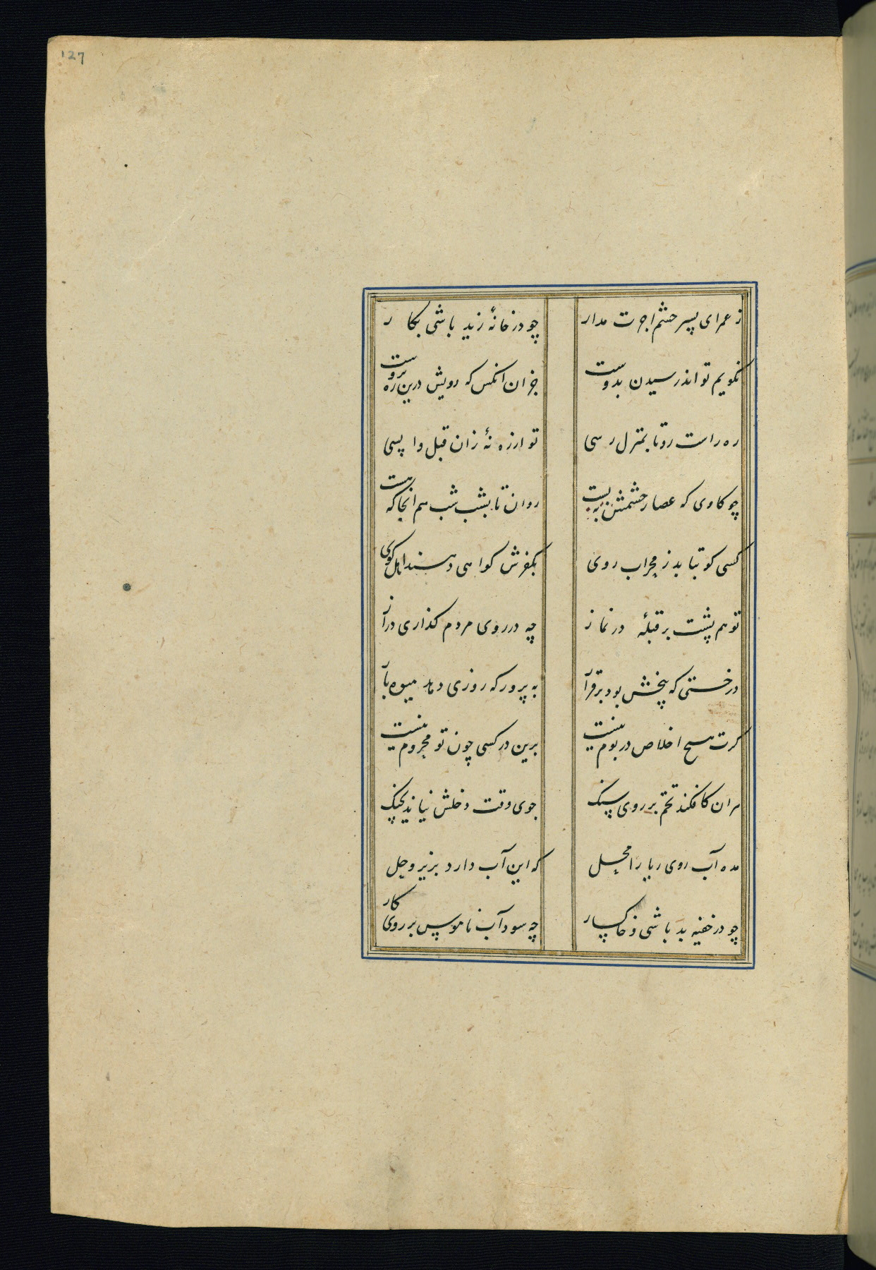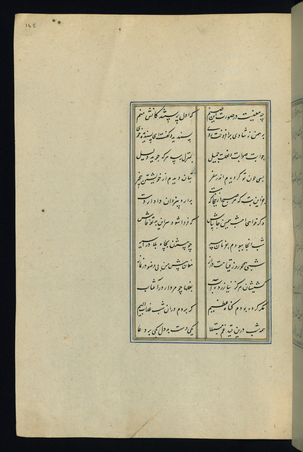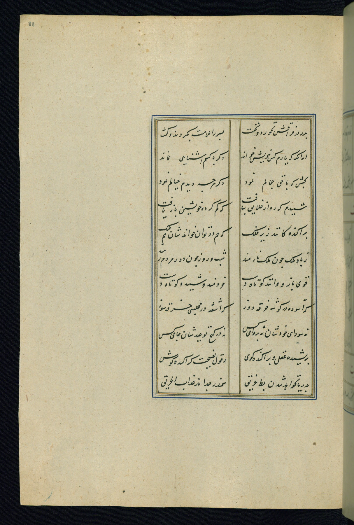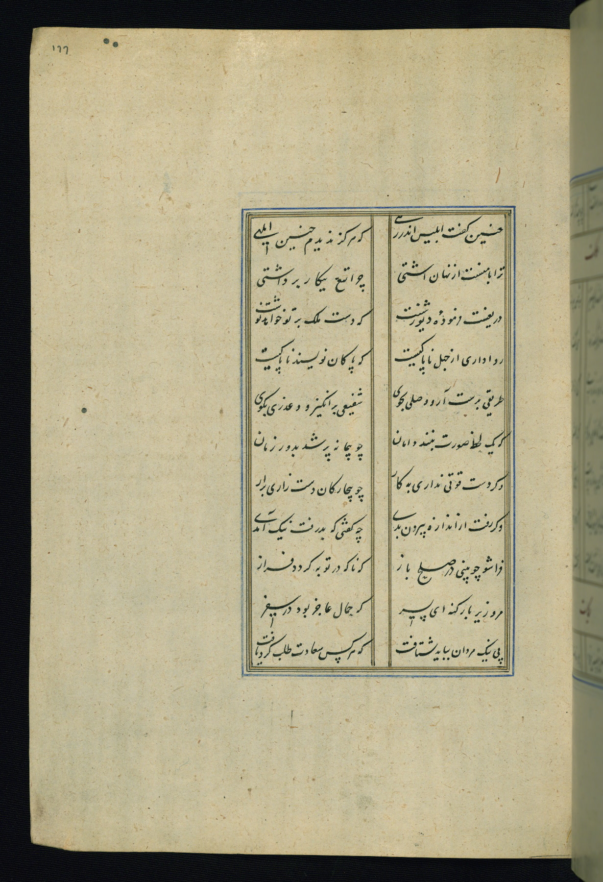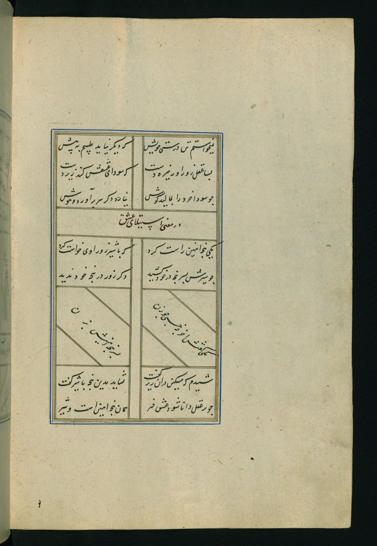 This is an illuminated and illustrated Safavid copy of the Būstān (The garden or The orchard), composed by Sa’dī (d. 691 AH / 1292 CE). It was written in black nasta’līq script in the ninth century AH / sixteenth CE in Iran. The codex opens with a frontispiece with the title Kitāb-i būstān inscribed in an illuminated medallion (fol. 1a), followed by a double-page illustration of a banquet scene in a landscape (fols. 1b-2a). Additionally, there are five paintings illustrating the text (fols. 25a, 55b, 58a, 93b, and 119b). The brown leather, blind-stamped binding decorated with a central oval and pendants is not contemporary with the manuscript.