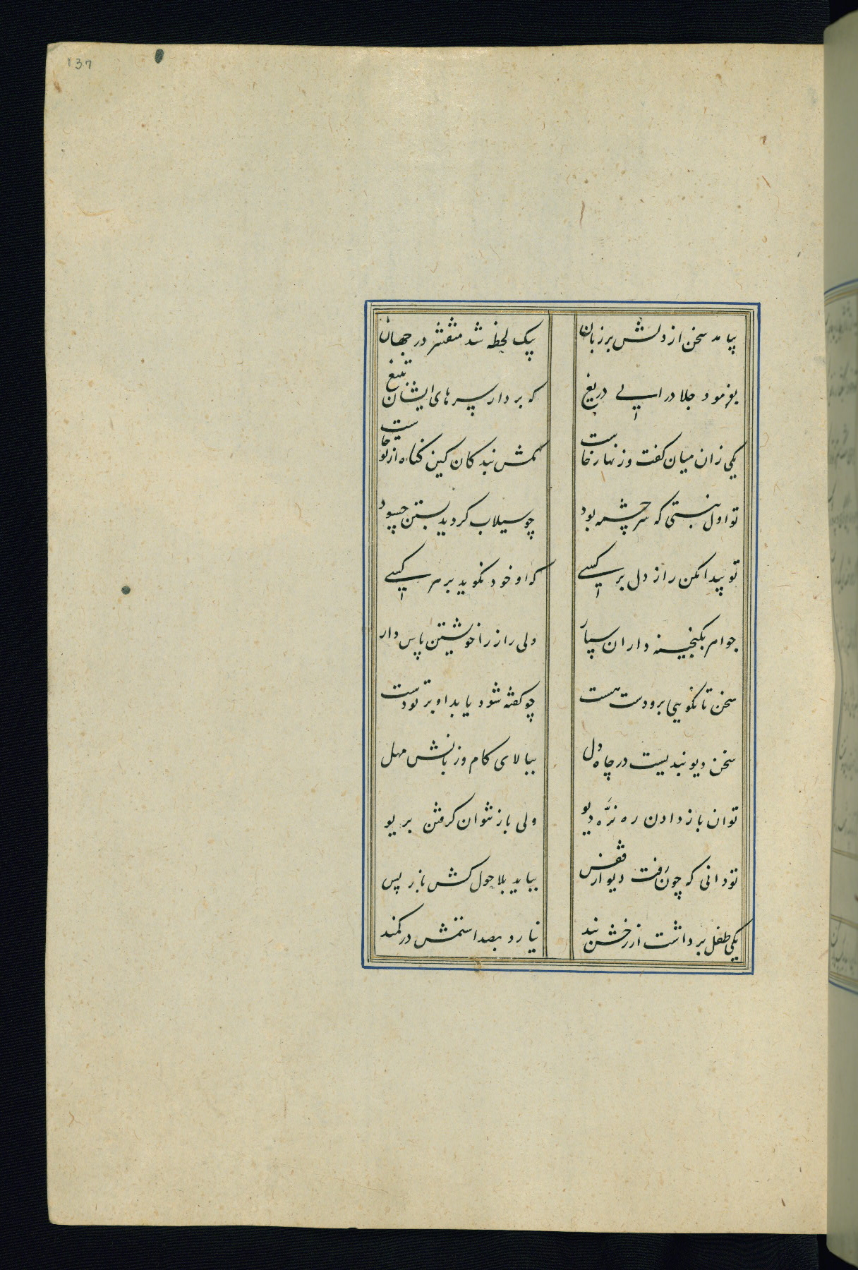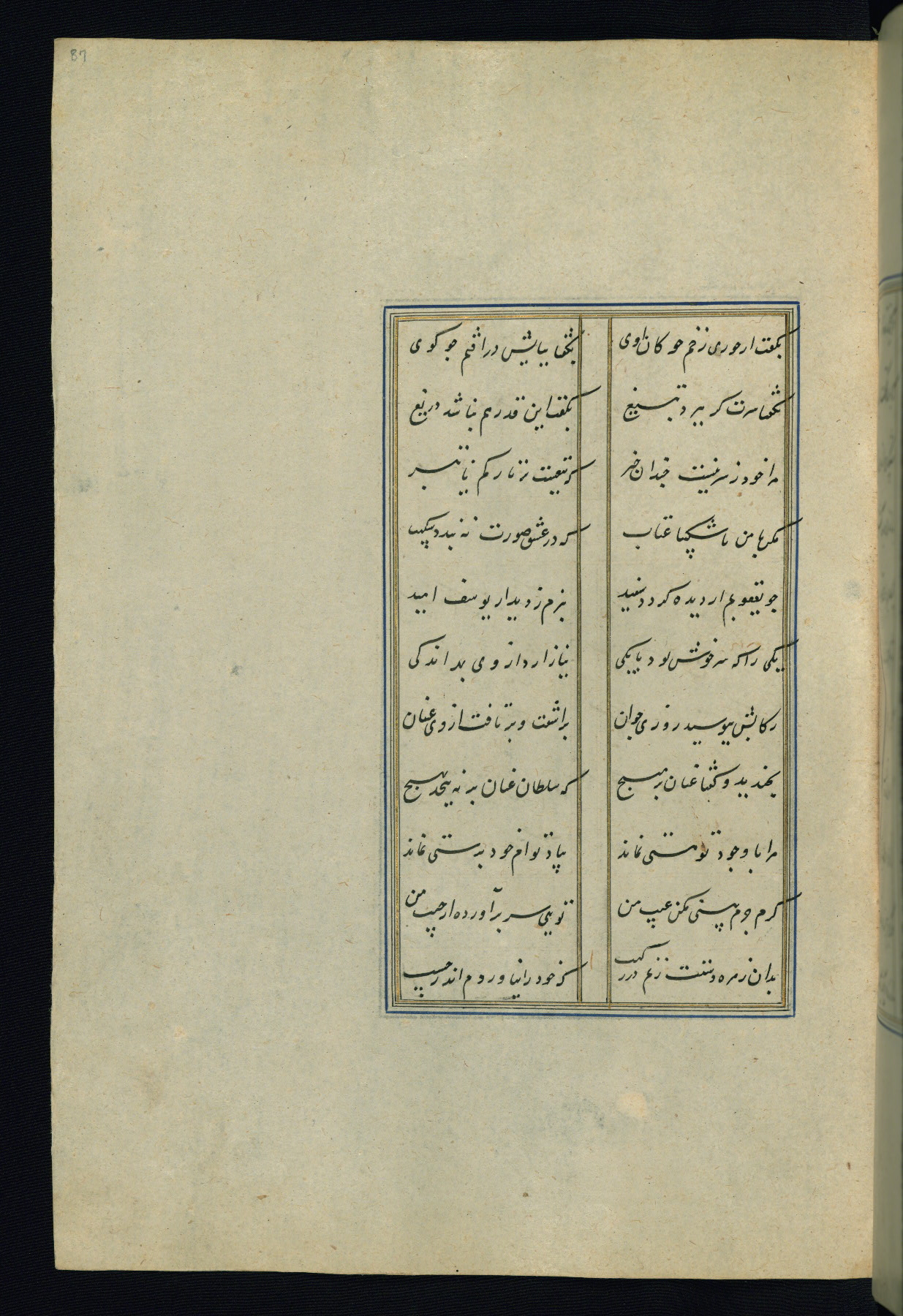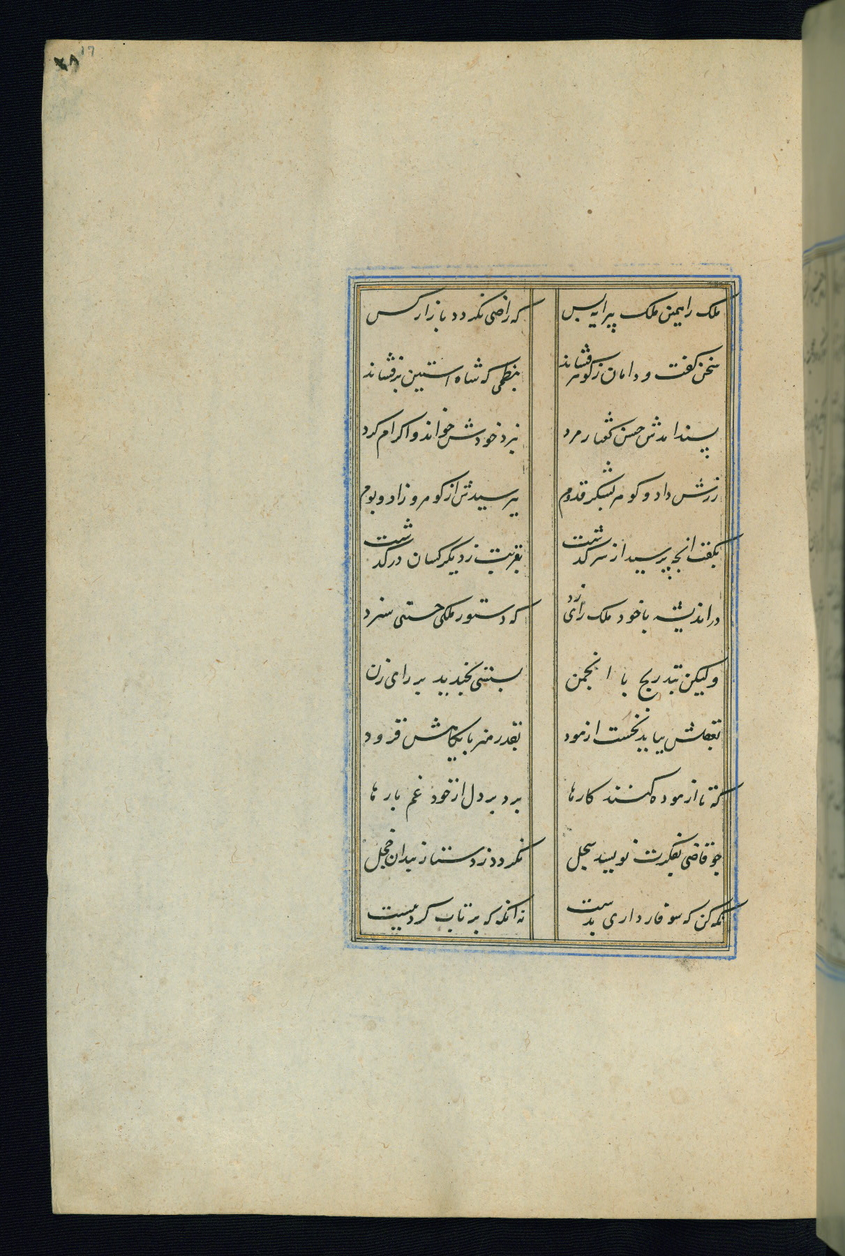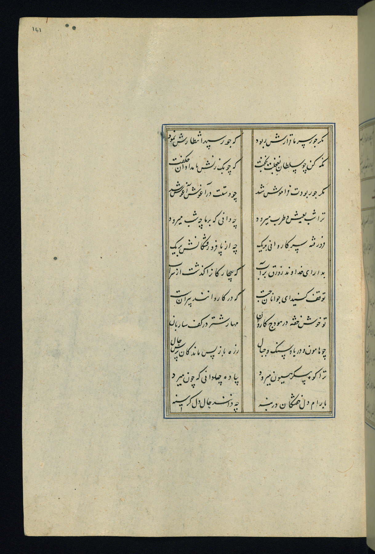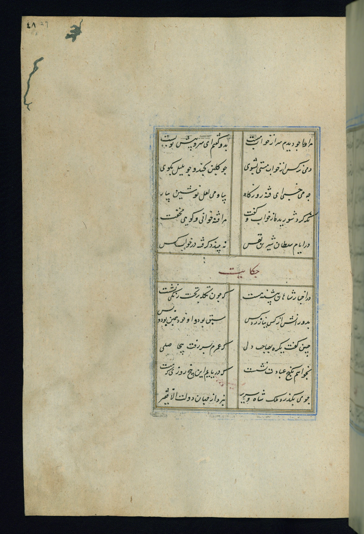 This is an illuminated and illustrated Safavid copy of the Būstān (The garden or The orchard), composed by Sa’dī (d. 691 AH / 1292 CE). It was written in black nasta’līq script in the ninth century AH / sixteenth CE in Iran. The codex opens with a frontispiece with the title Kitāb-i būstān inscribed in an illuminated medallion (fol. 1a), followed by a double-page illustration of a banquet scene in a landscape (fols. 1b-2a). Additionally, there are five paintings illustrating the text (fols. 25a, 55b, 58a, 93b, and 119b). The brown leather, blind-stamped binding decorated with a central oval and pendants is not contemporary with the manuscript.