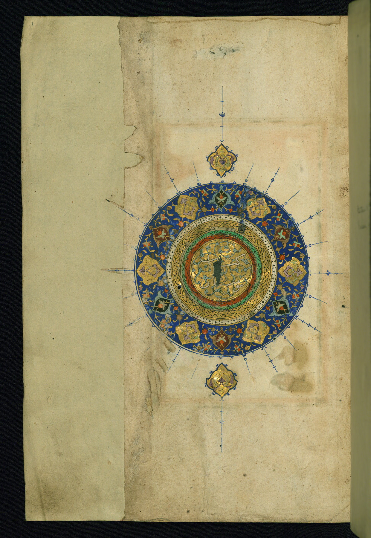 - Label: This illuminated frontispiece is inscribed with the title Kitāb-i būstān in the polychrome and gold medallion (shamsah).