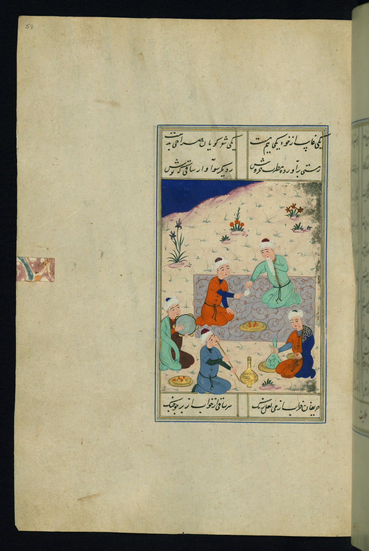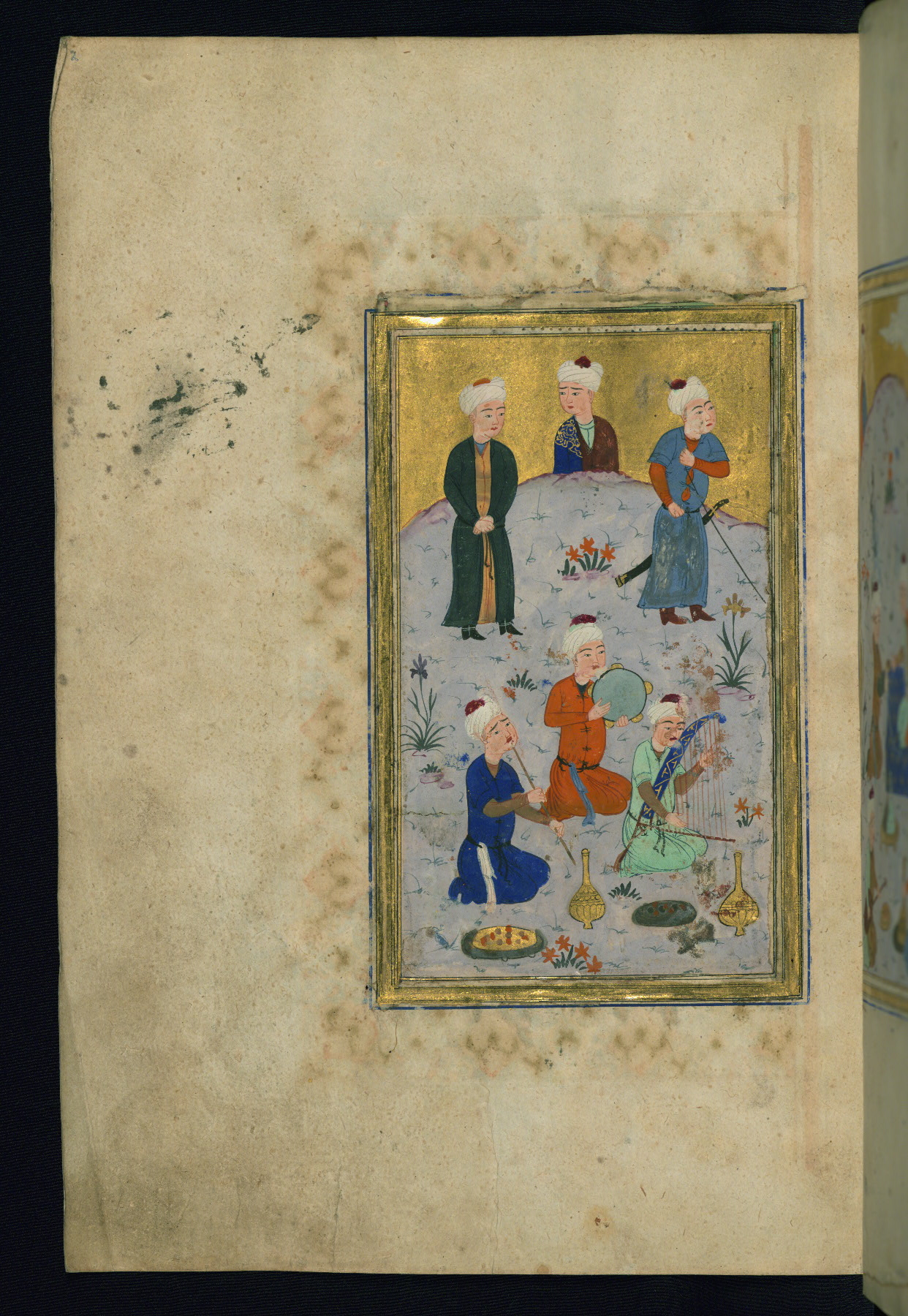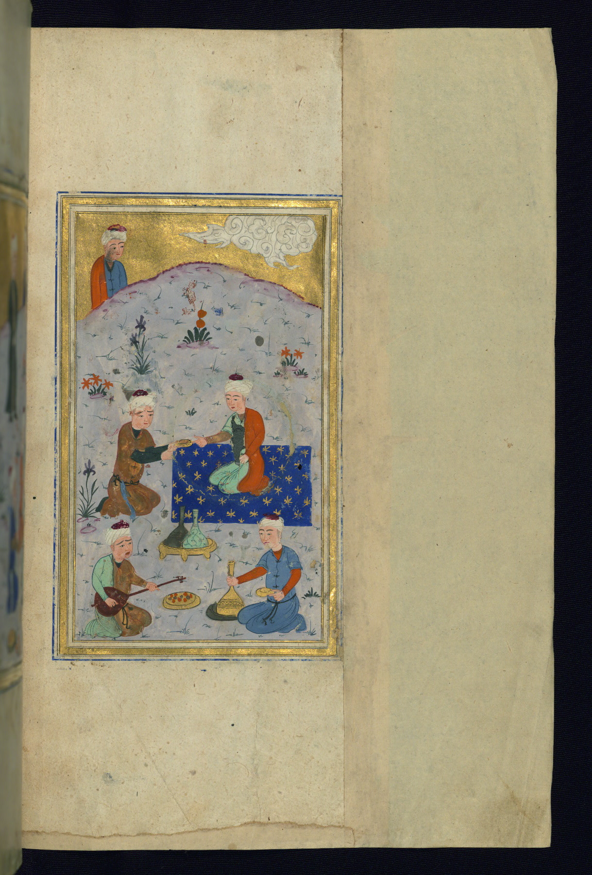 This is an illuminated and illustrated Safavid copy of the Būstān (The garden or The orchard), composed by Sa’dī (d. 691 AH / 1292 CE). It was written in black nasta’līq script in the ninth century AH / sixteenth CE in Iran. The codex opens with a frontispiece with the title Kitāb-i būstān inscribed in an illuminated medallion (fol. 1a), followed by a double-page illustration of a banquet scene in a landscape (fols. 1b-2a). Additionally, there are five paintings illustrating the text (fols. 25a, 55b, 58a, 93b, and 119b). The brown leather, blind-stamped binding decorated with a central oval and pendants is not contemporary with the manuscript.