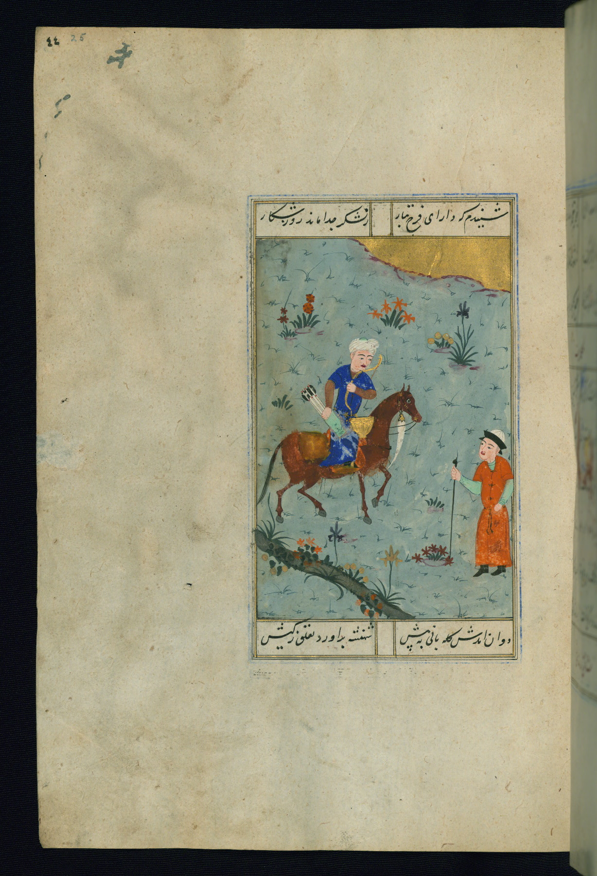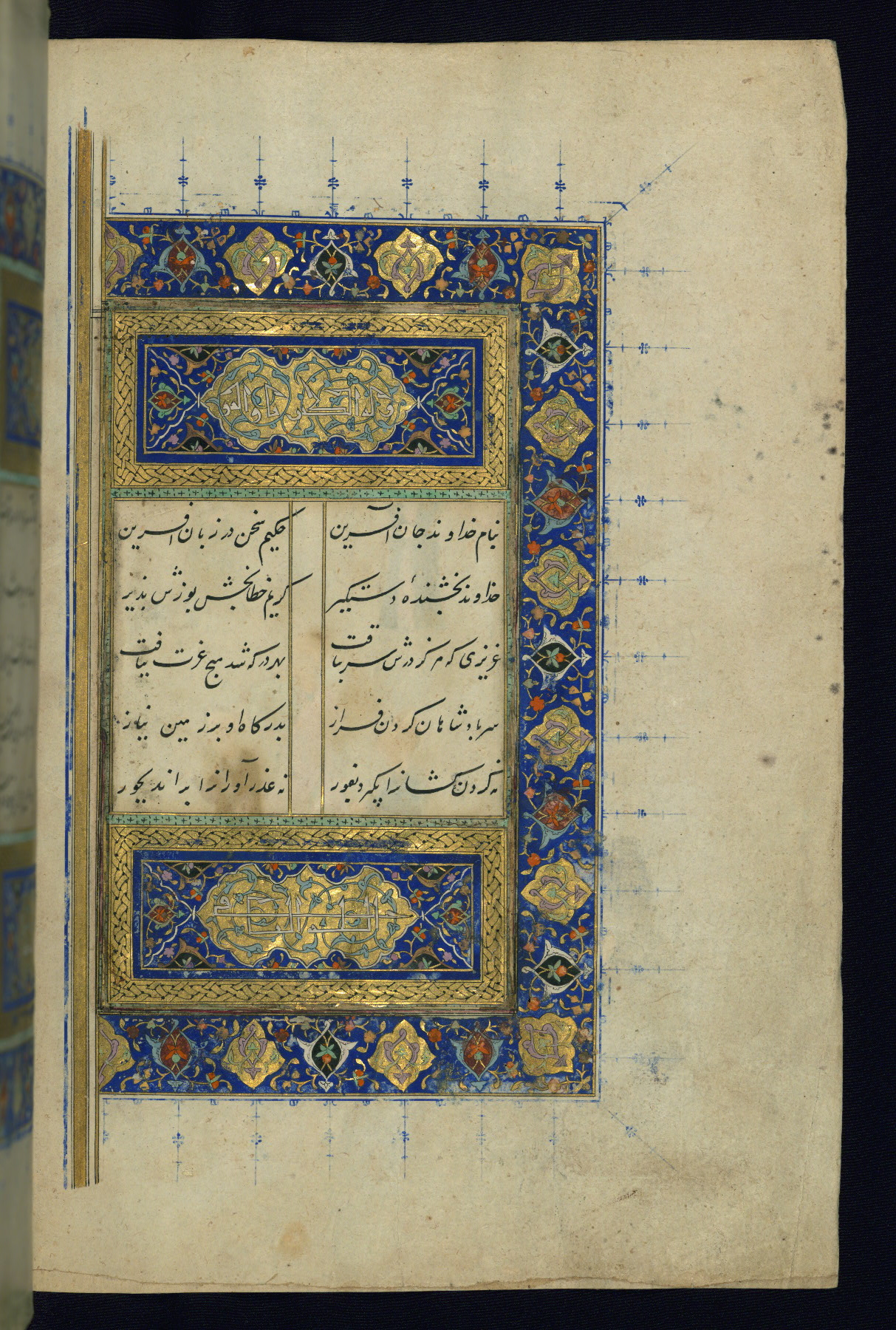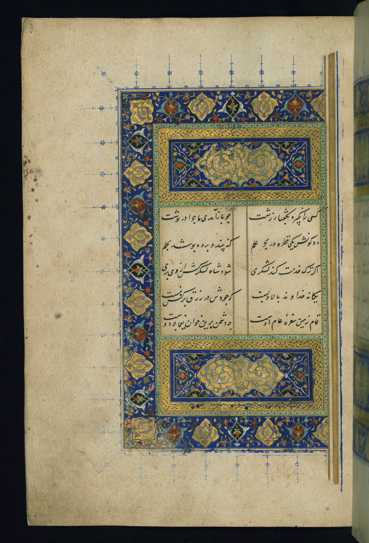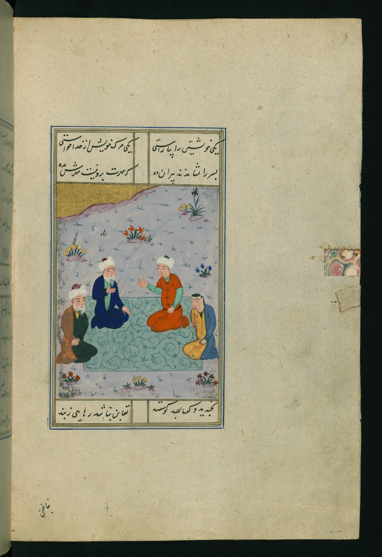 - Decoration note: Five illustrations (fols. 25a, 55b, 58a, 93b, and 119b); illuminated frontispiece with the title Kitāb-i būstān inscribed in the medallion (fol. 1a); double-page illustrated frontispiece (fols. 1b-2a); double-page illuminated incipit (fols. 2b-3a); framing lines in blue, black, and gold