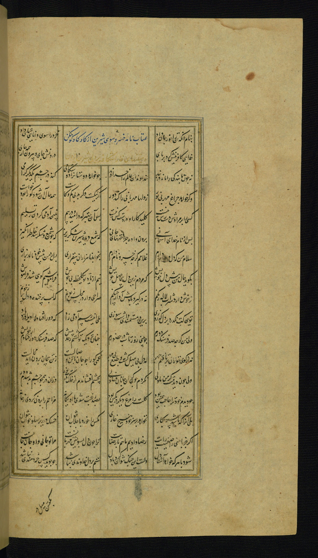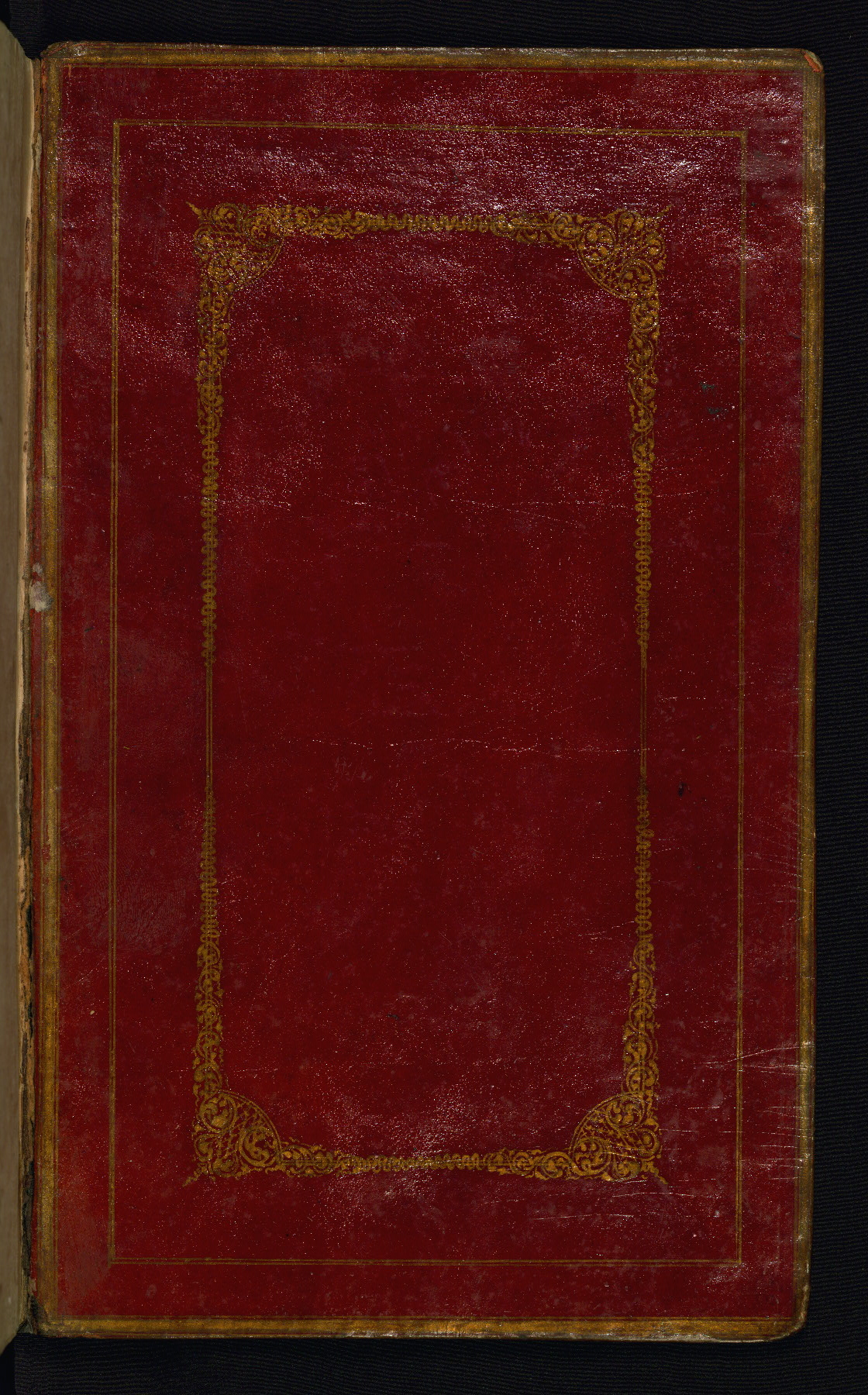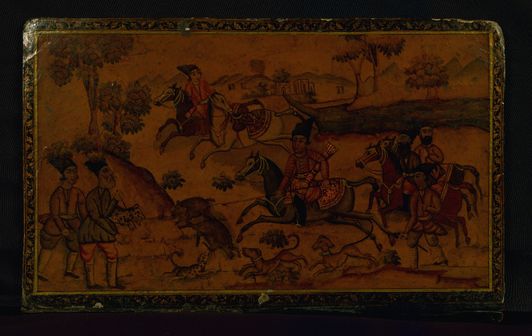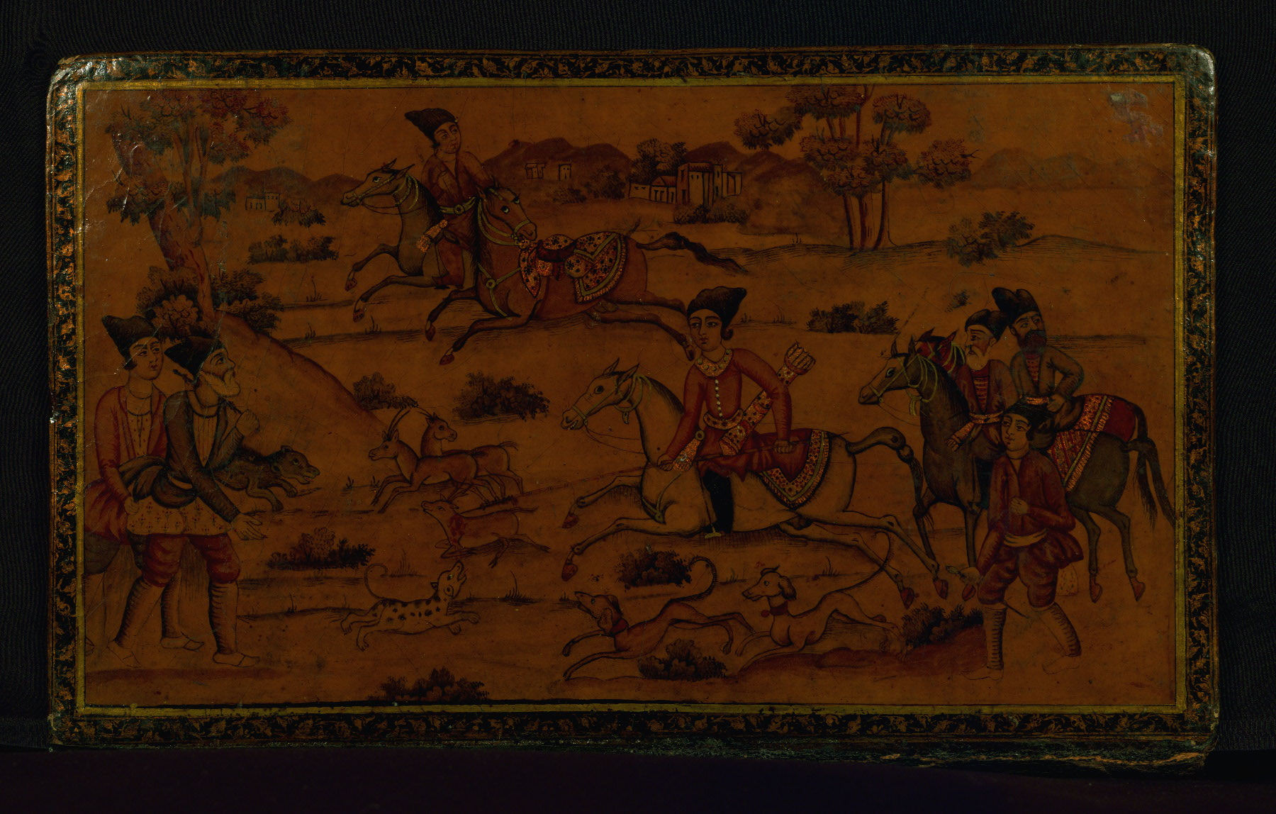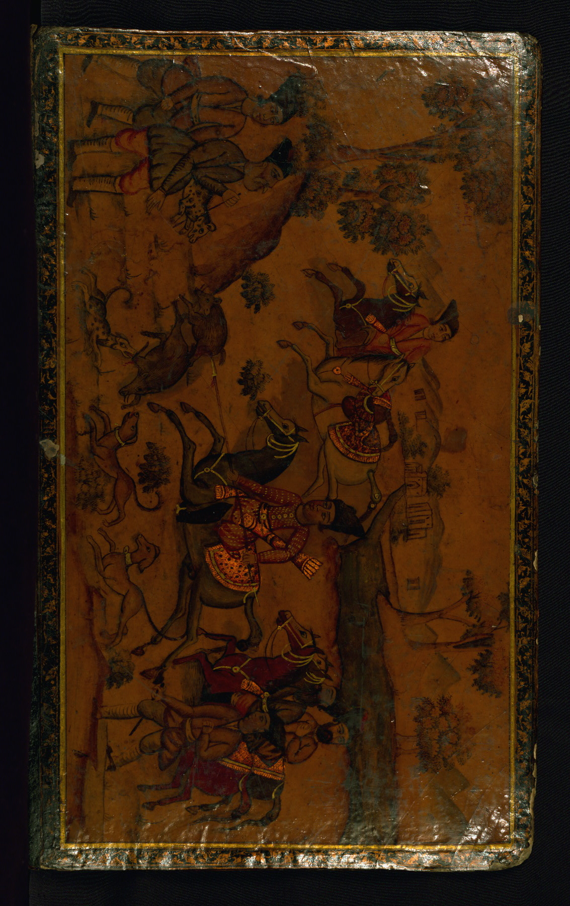 This is an illustrated and illuminated Safavid copy of the Khamsah (quintet) of Amīr Khusraw Dihlavī (d. 725 AH / 1325 CE), written by Pīr Ḥusayn al-Kātib al-Shīrāzī in 935 AH / 1529 CE. The codex opens with a double-page illuminated frontispiece with verses in honor of the poet Mir (Amir) Khusraw (fols. 1b-2a). There are four illuminated incipit pages introducing the individual poems, and thirteen paintings illustrate the text. The lacquer binding, which is not original to the manuscript, has a hunting scene on the upper and lower boards. The lower board is inscribed yā Shāh Najaf (oh, King of Najaf, i.e. ʿAlī) and is dated 1271 AH / 1854 CE.