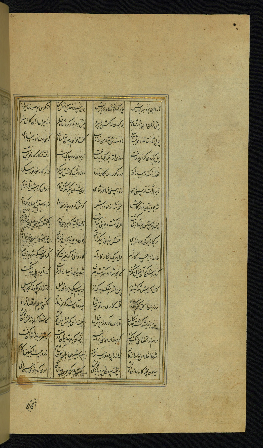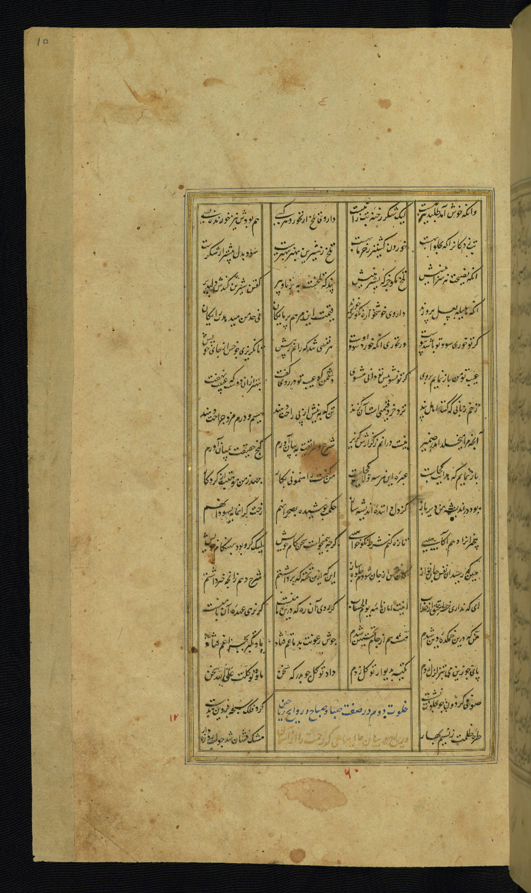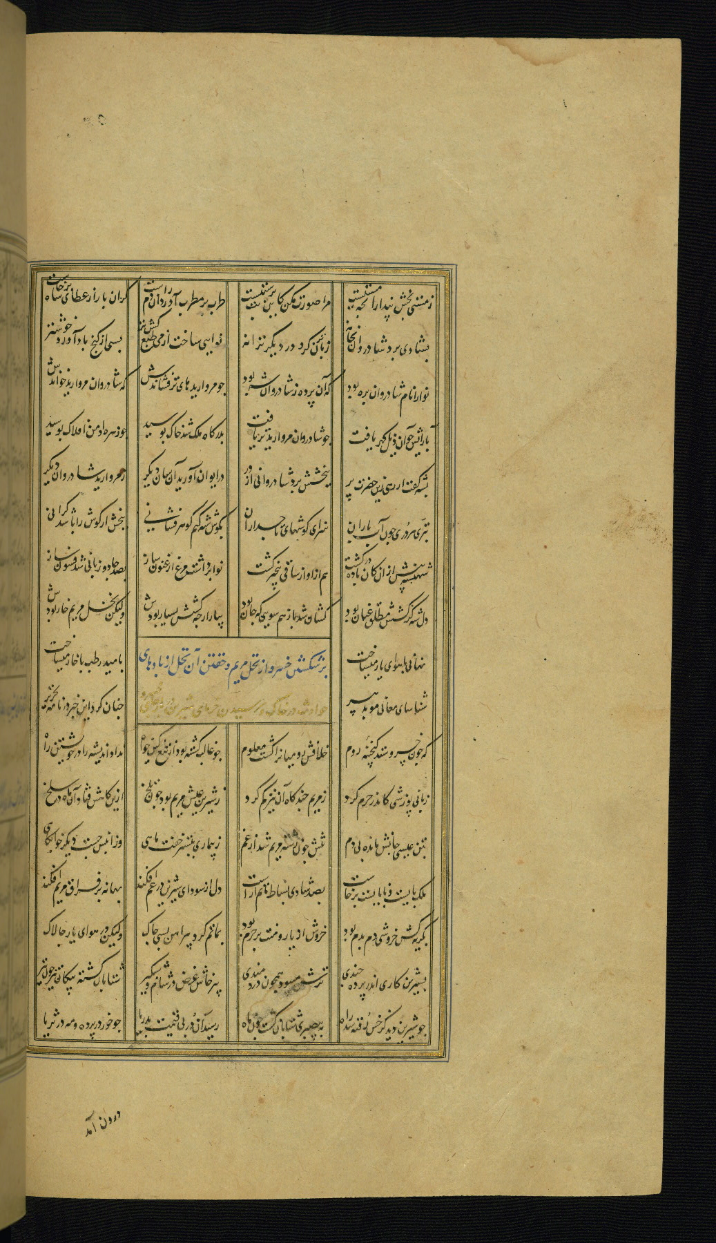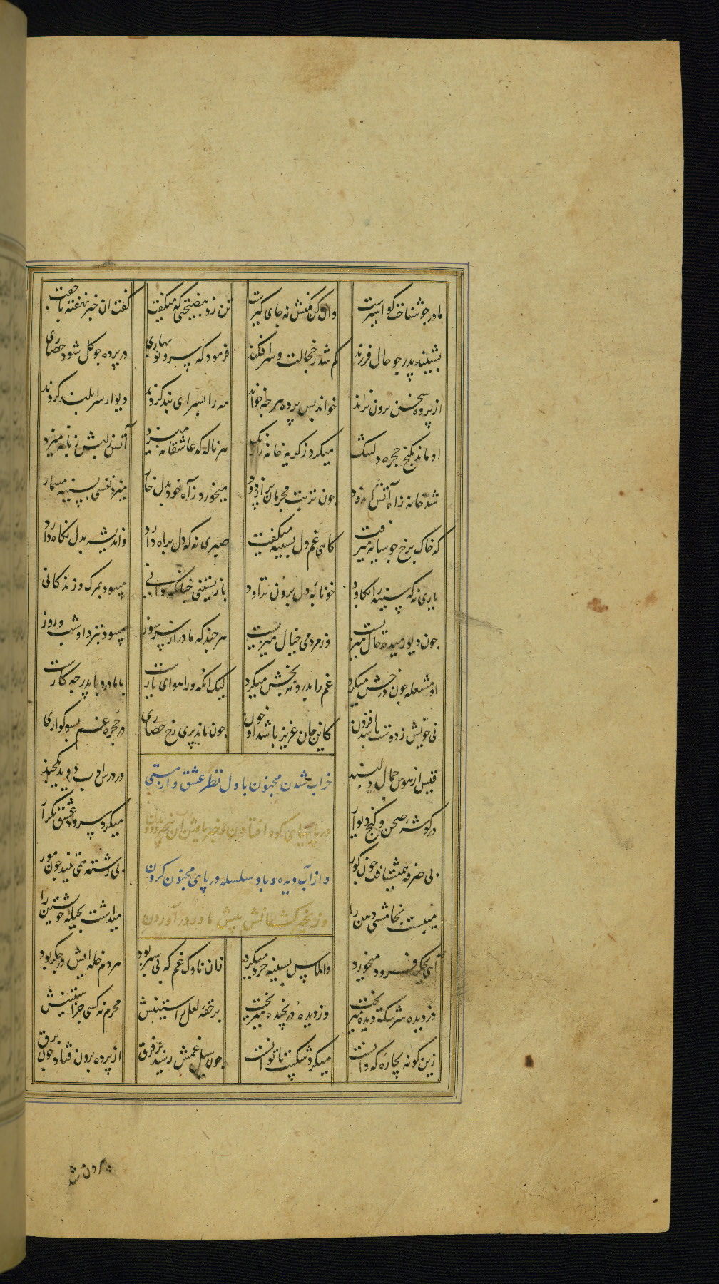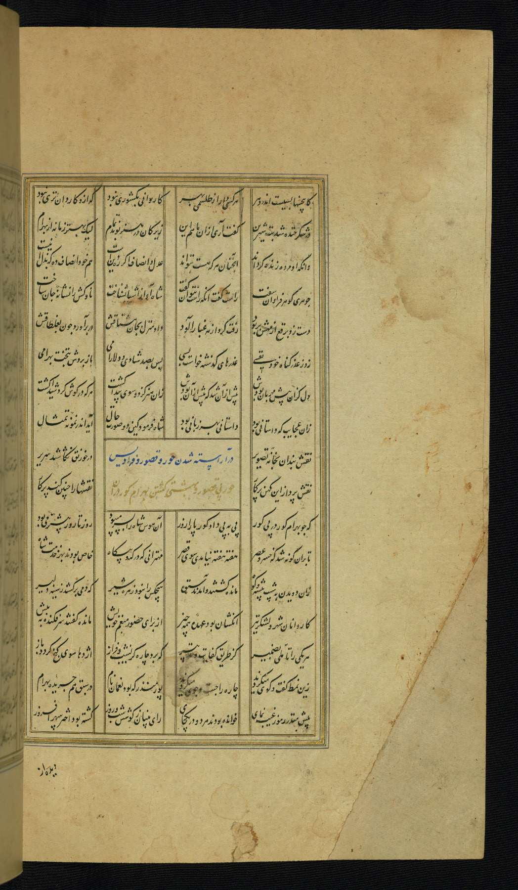 This is an illustrated and illuminated Safavid copy of the Khamsah (quintet) of Amīr Khusraw Dihlavī (d. 725 AH / 1325 CE), written by Pīr Ḥusayn al-Kātib al-Shīrāzī in 935 AH / 1529 CE. The codex opens with a double-page illuminated frontispiece with verses in honor of the poet Mir (Amir) Khusraw (fols. 1b-2a). There are four illuminated incipit pages introducing the individual poems, and thirteen paintings illustrate the text. The lacquer binding, which is not original to the manuscript, has a hunting scene on the upper and lower boards. The lower board is inscribed yā Shāh Najaf (oh, King of Najaf, i.e. ʿAlī) and is dated 1271 AH / 1854 CE.