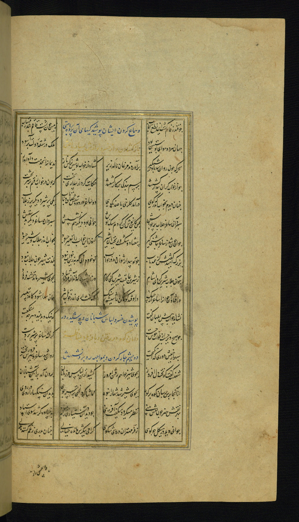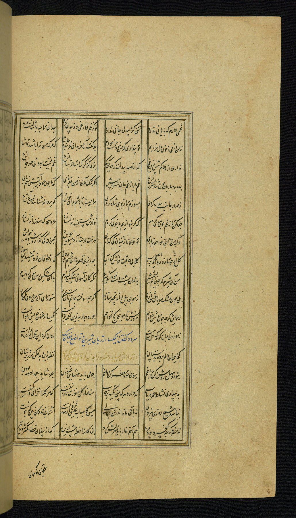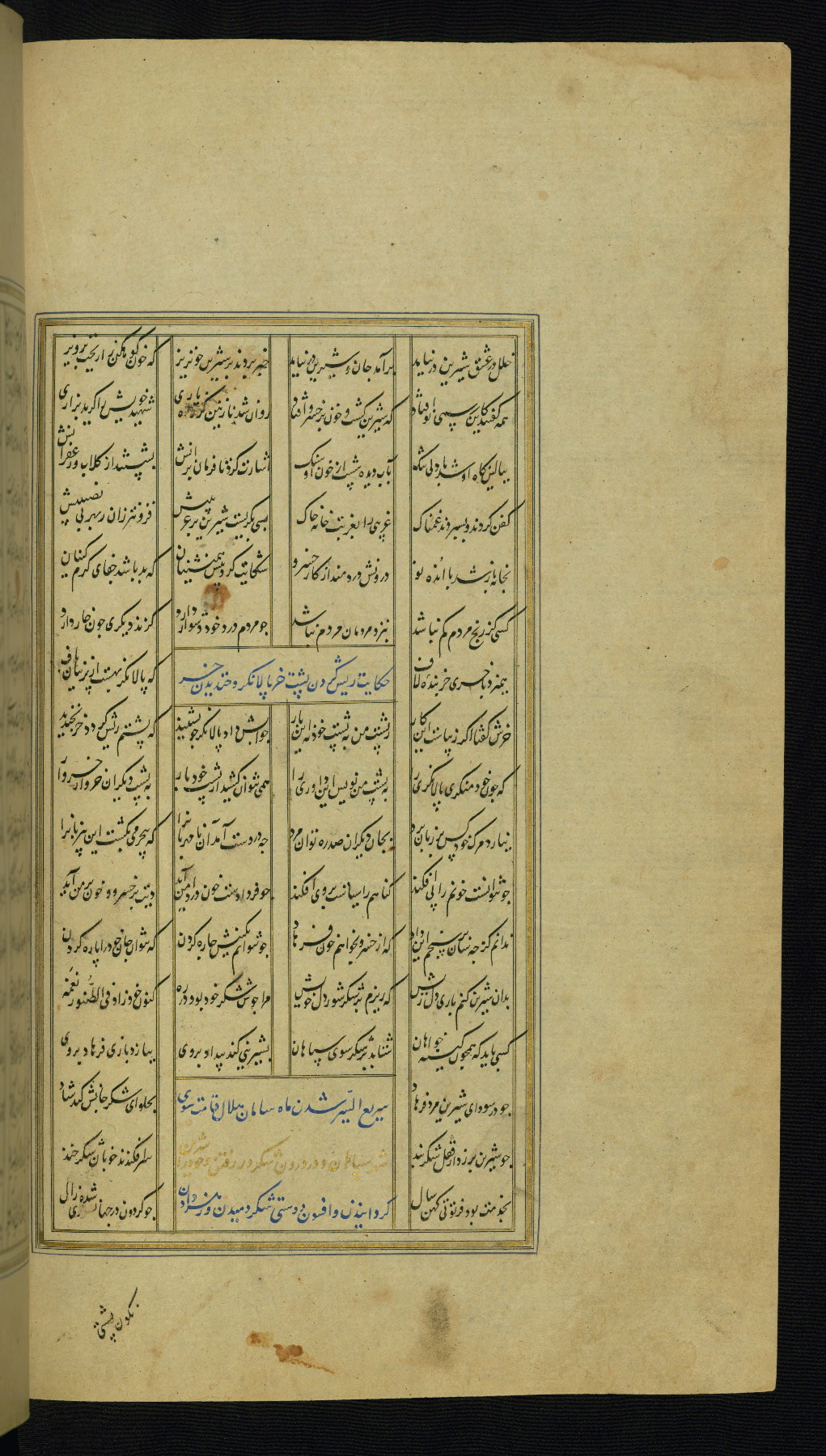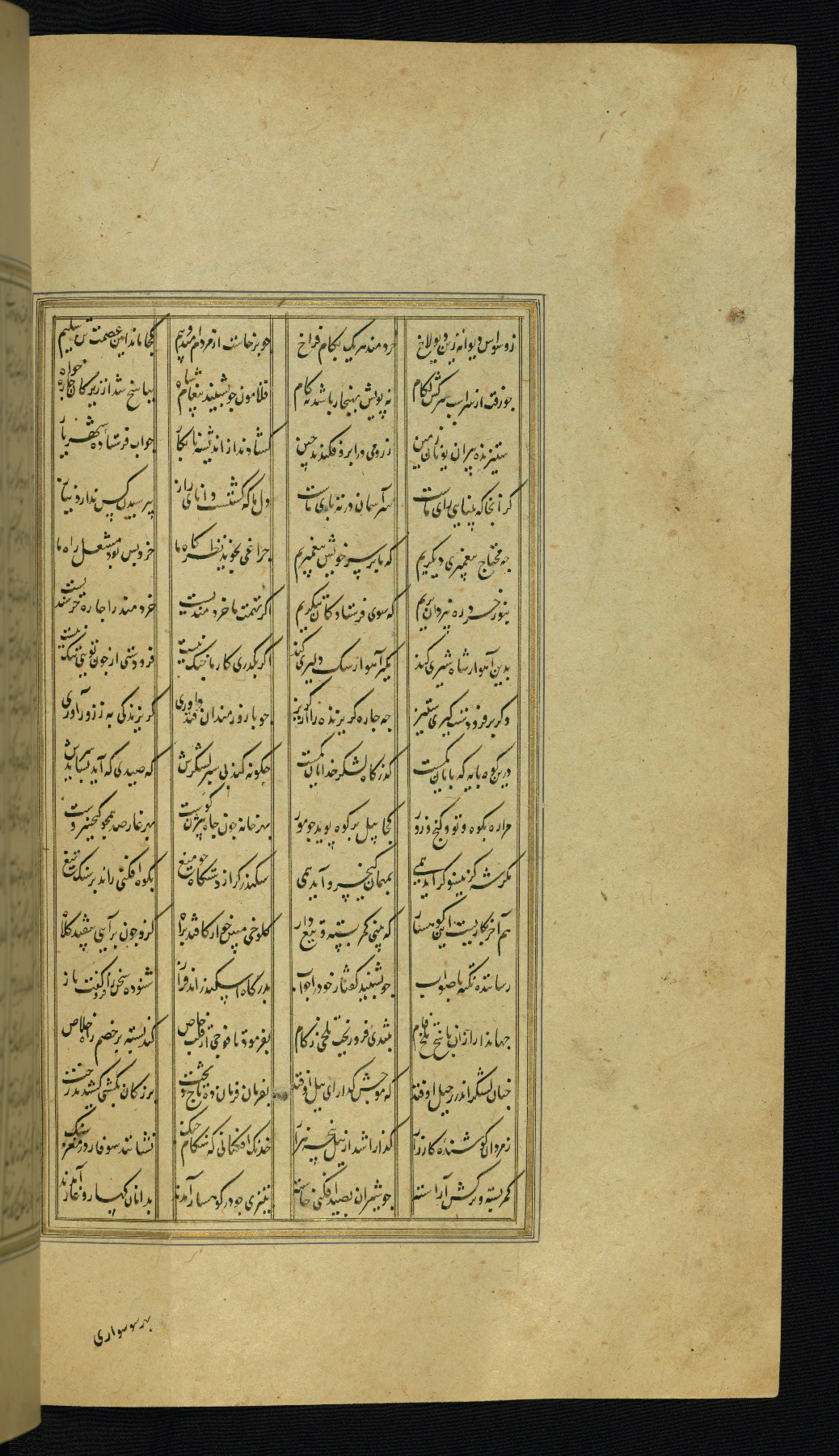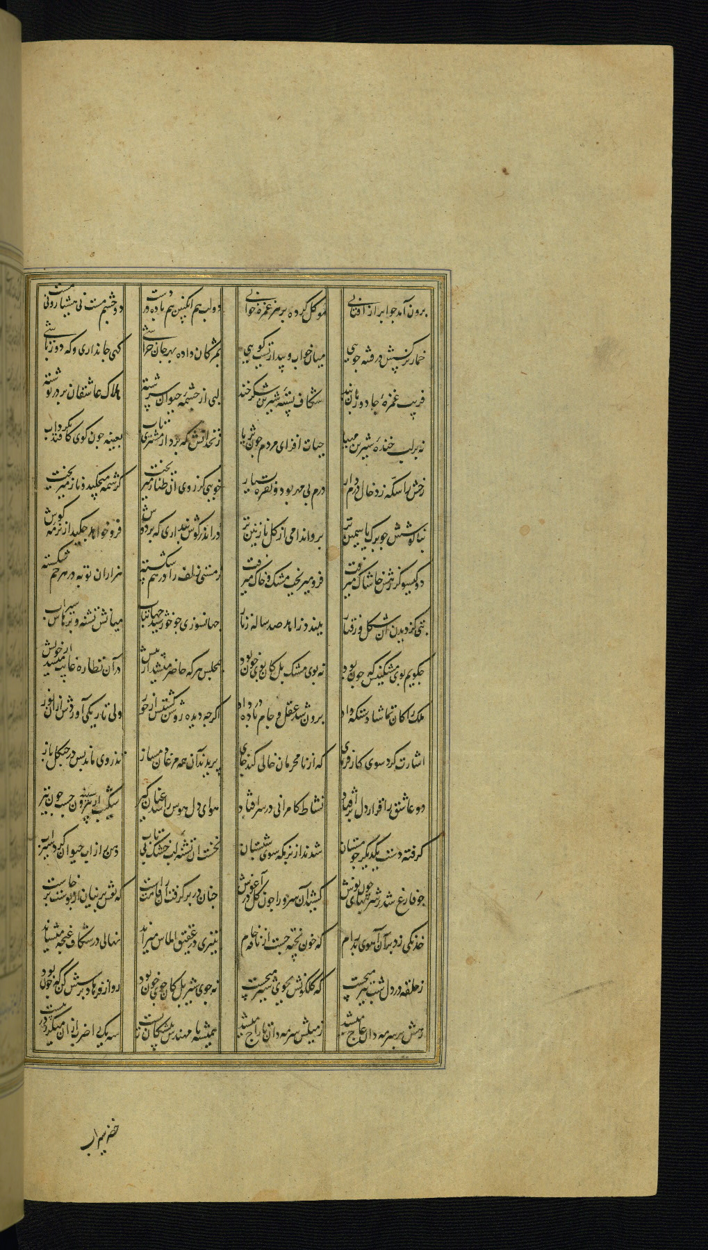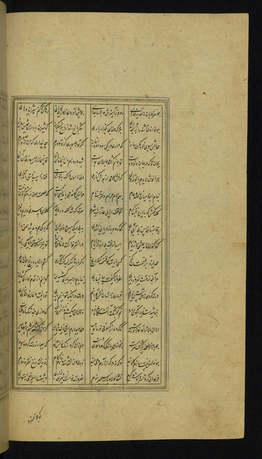This is an illustrated and illuminated Safavid copy of the Khamsah (quintet) of Amīr Khusraw Dihlavī (d. 725 AH / 1325 CE), written by Pīr Ḥusayn al-Kātib al-Shīrāzī in 935 AH / 1529 CE. The codex opens with a double-page illuminated frontispiece with verses in honor of the poet Mir (Amir) Khusraw (fols. 1b-2a). There are four illuminated incipit pages introducing the individual poems, and thirteen paintings illustrate the text. The lacquer binding, which is not original to the manuscript, has a hunting scene on the upper and lower boards. The lower board is inscribed yā Shāh Najaf (oh, King of Najaf, i.e. ʿAlī) and is dated 1271 AH / 1854 CE.