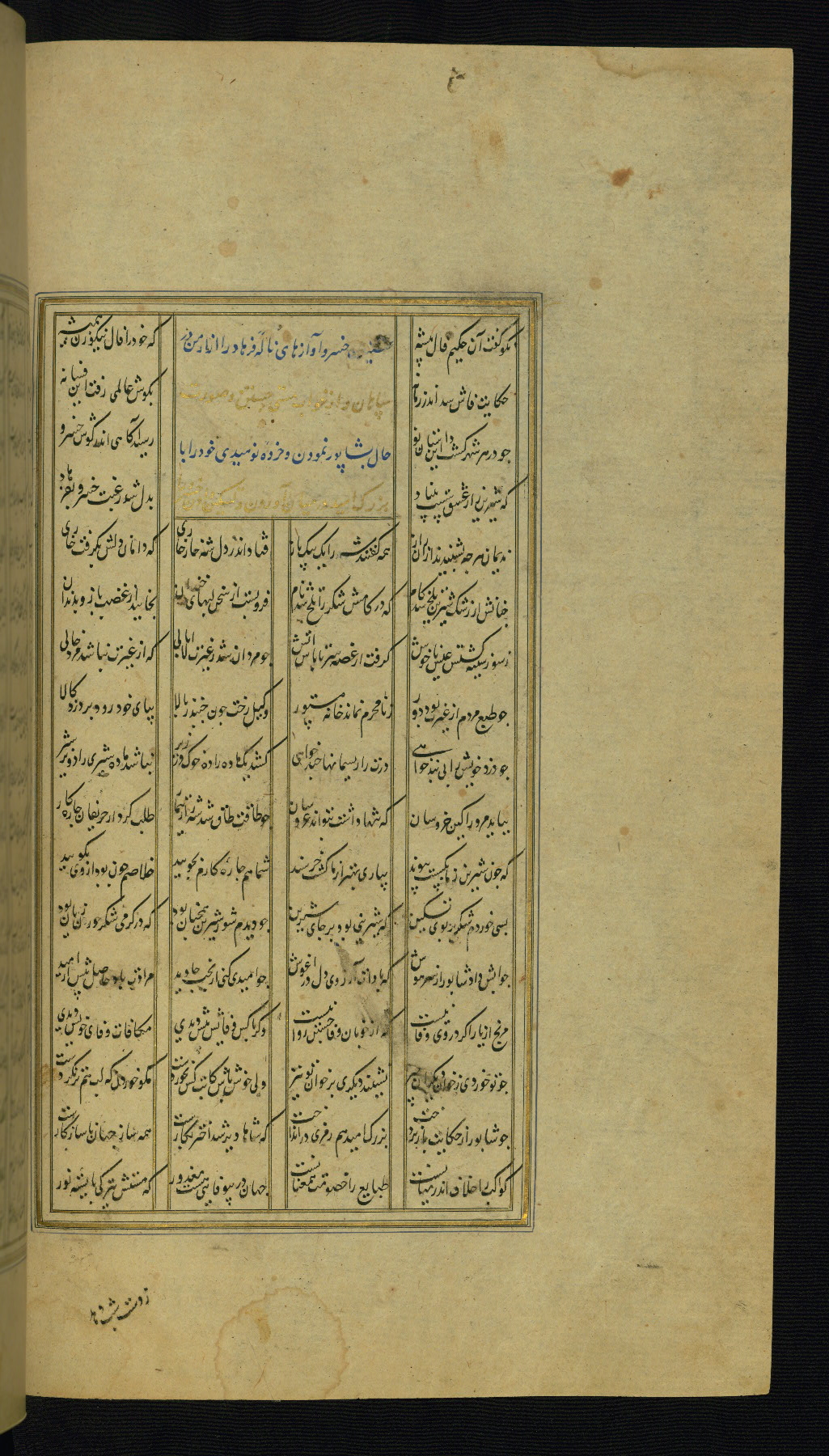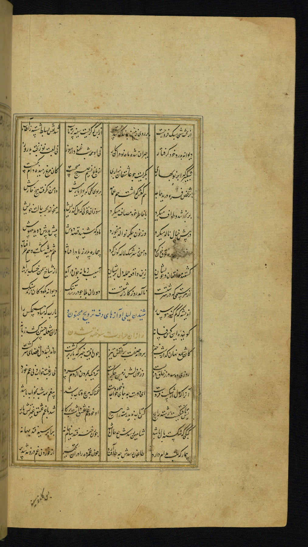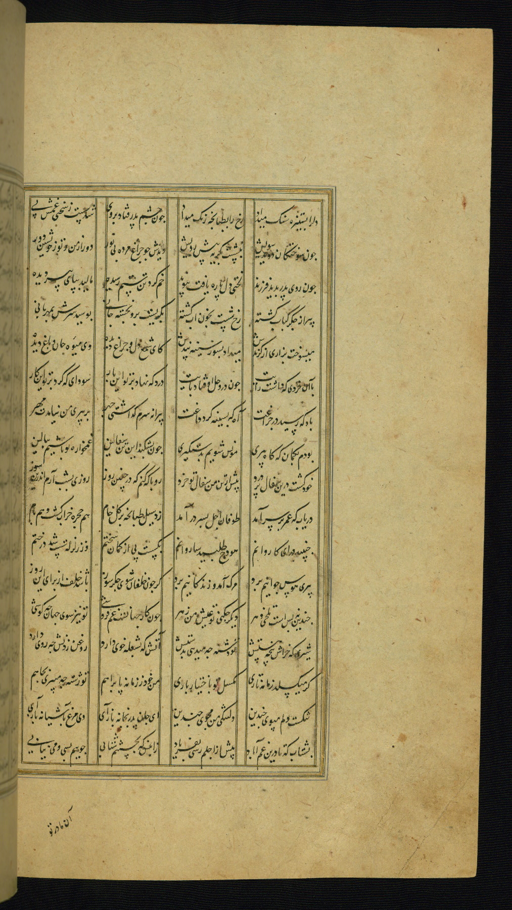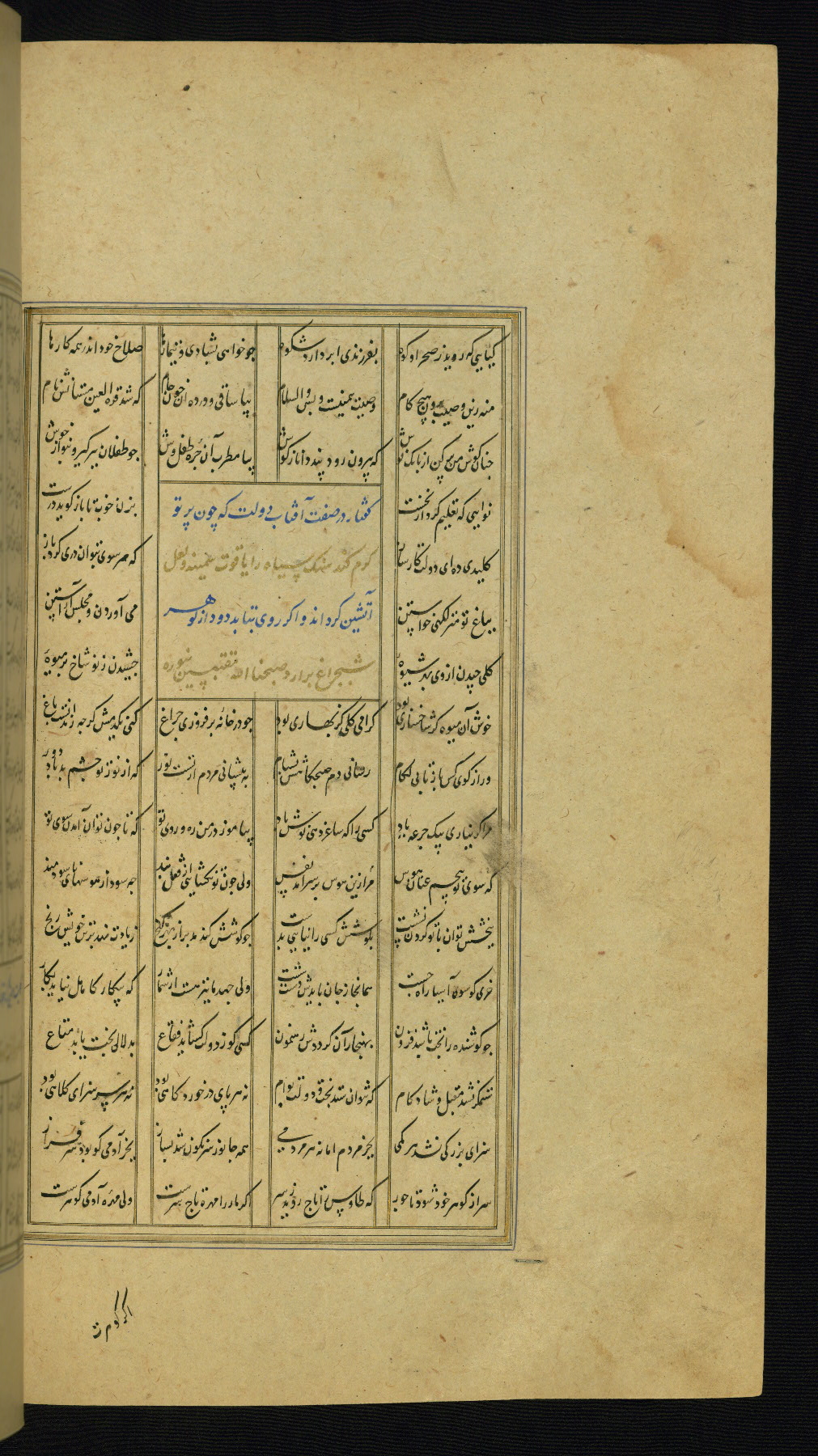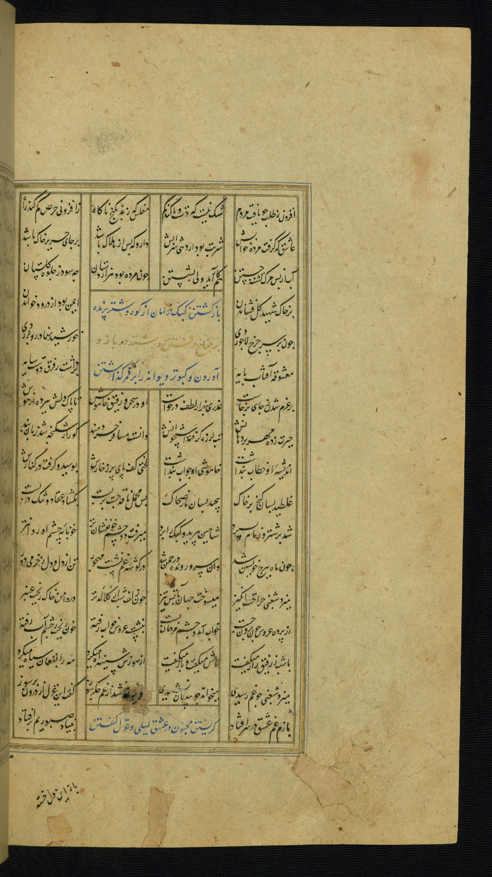 This is an illustrated and illuminated Safavid copy of the Khamsah (quintet) of Amīr Khusraw Dihlavī (d. 725 AH / 1325 CE), written by Pīr Ḥusayn al-Kātib al-Shīrāzī in 935 AH / 1529 CE. The codex opens with a double-page illuminated frontispiece with verses in honor of the poet Mir (Amir) Khusraw (fols. 1b-2a). There are four illuminated incipit pages introducing the individual poems, and thirteen paintings illustrate the text. The lacquer binding, which is not original to the manuscript, has a hunting scene on the upper and lower boards. The lower board is inscribed yā Shāh Najaf (oh, King of Najaf, i.e. ʿAlī) and is dated 1271 AH / 1854 CE.