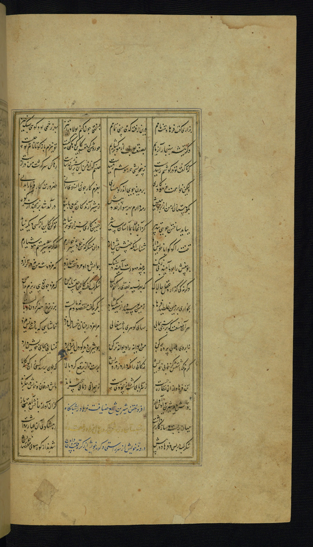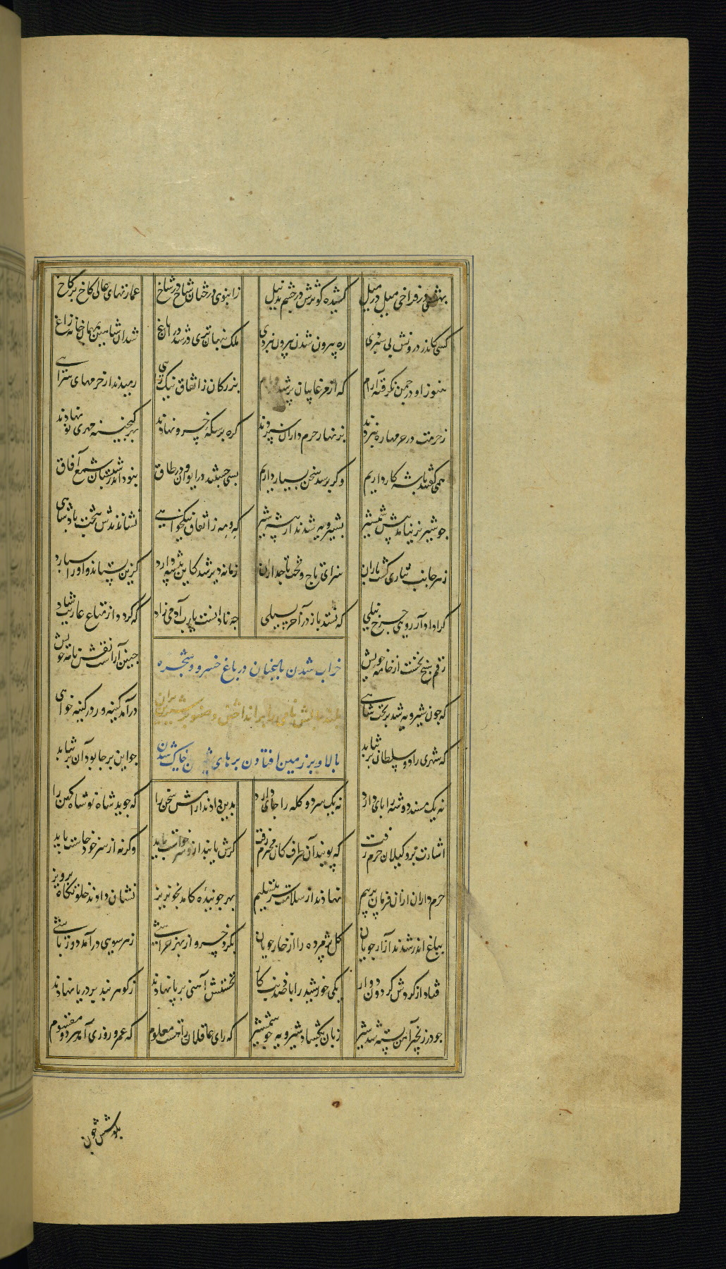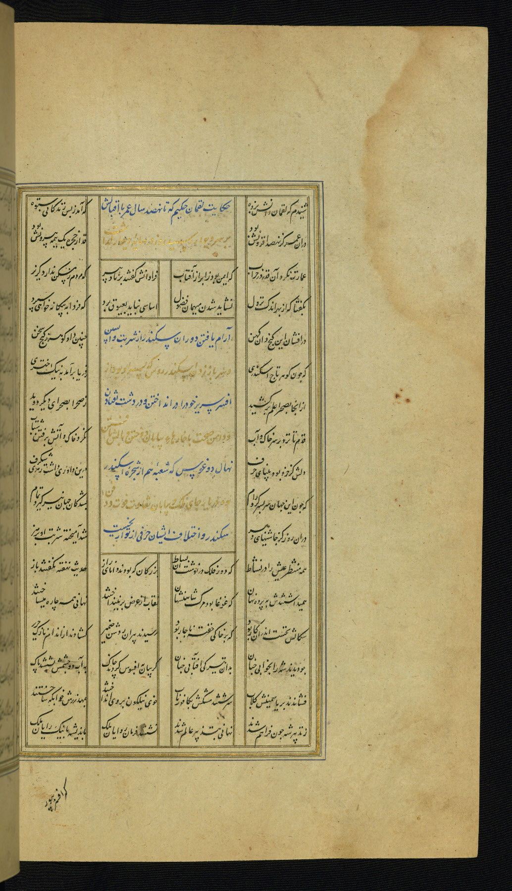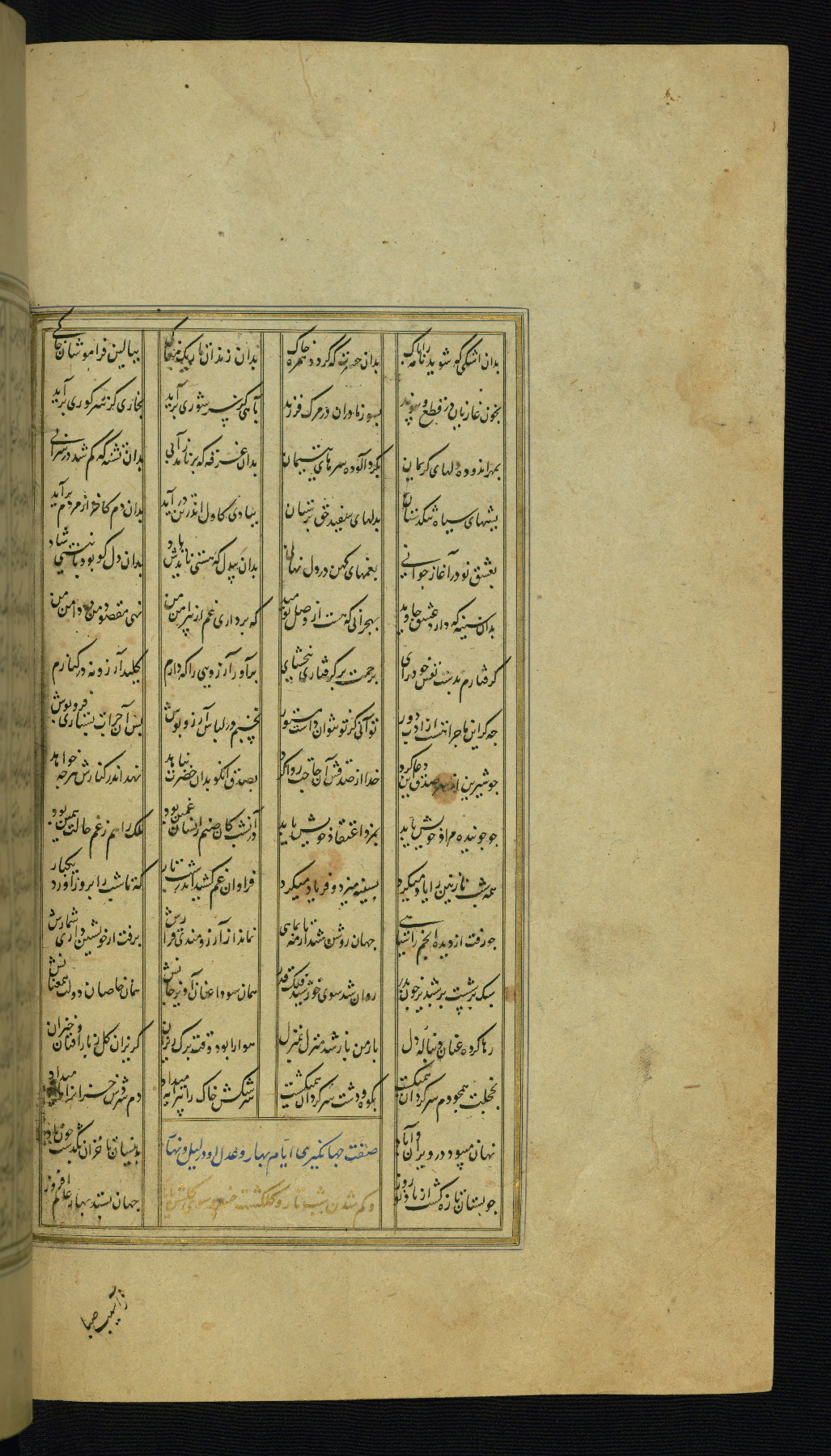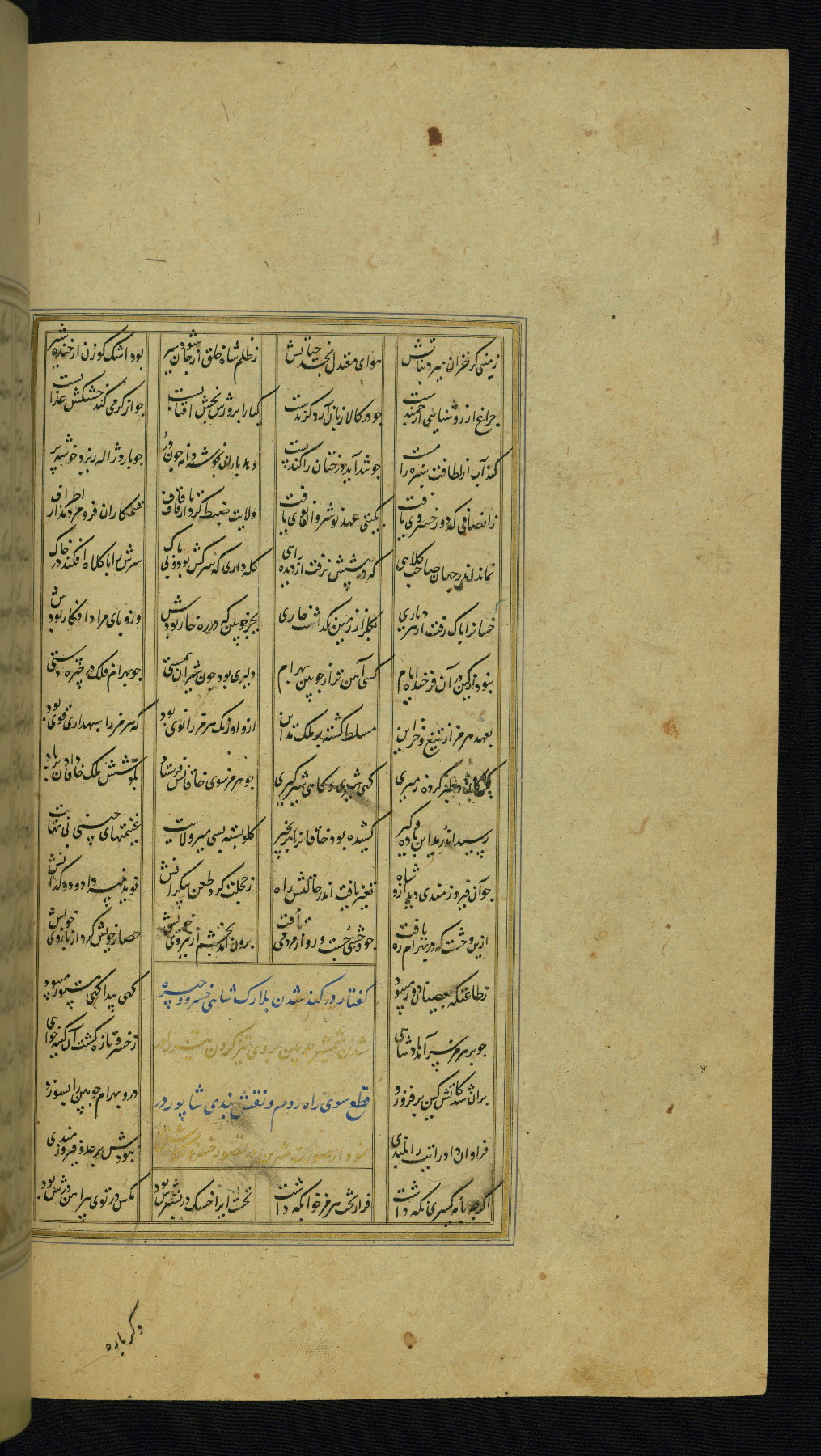 This is an illustrated and illuminated Safavid copy of the Khamsah (quintet) of Amīr Khusraw Dihlavī (d. 725 AH / 1325 CE), written by Pīr Ḥusayn al-Kātib al-Shīrāzī in 935 AH / 1529 CE. The codex opens with a double-page illuminated frontispiece with verses in honor of the poet Mir (Amir) Khusraw (fols. 1b-2a). There are four illuminated incipit pages introducing the individual poems, and thirteen paintings illustrate the text. The lacquer binding, which is not original to the manuscript, has a hunting scene on the upper and lower boards. The lower board is inscribed yā Shāh Najaf (oh, King of Najaf, i.e. ʿAlī) and is dated 1271 AH / 1854 CE.