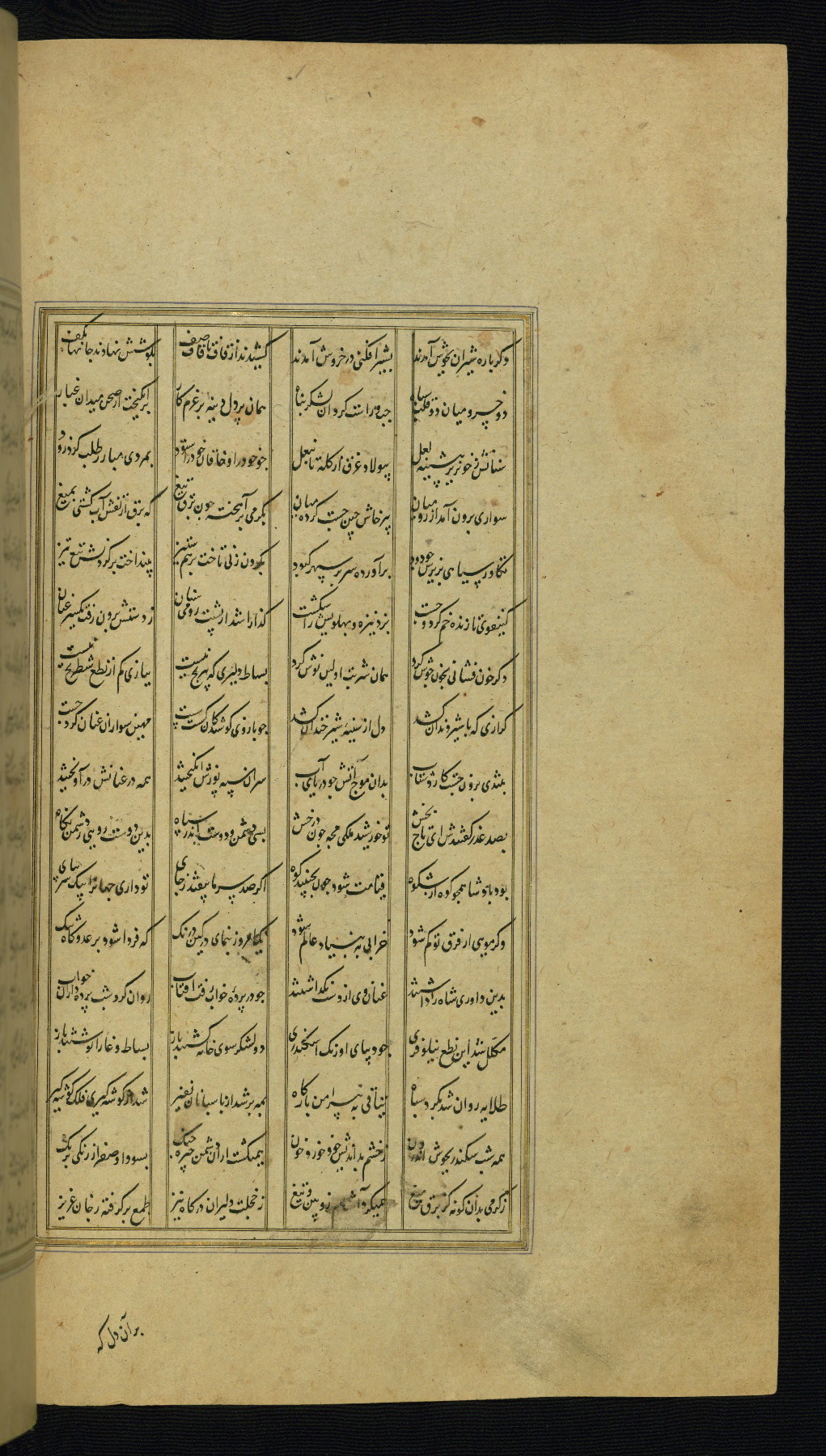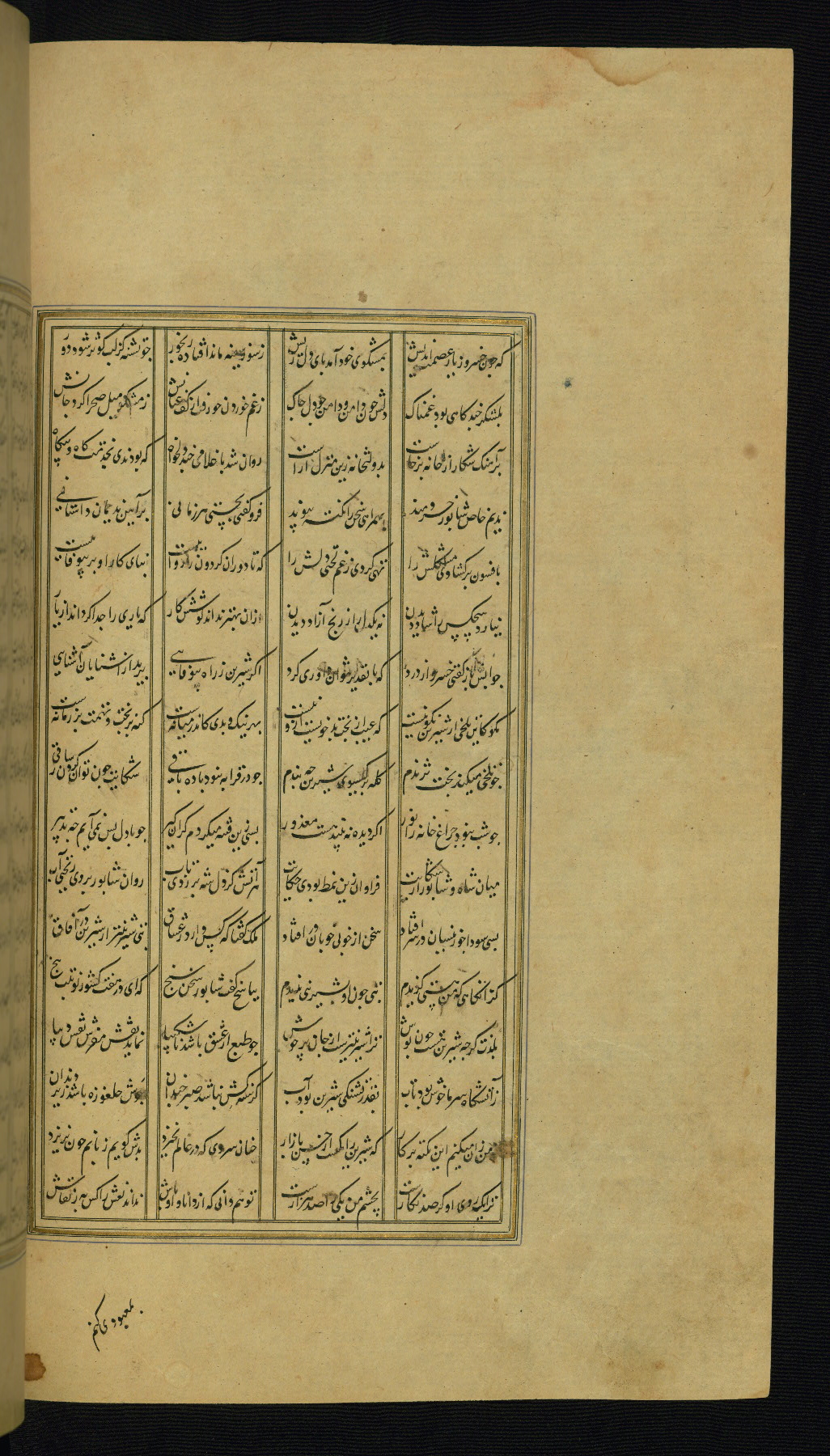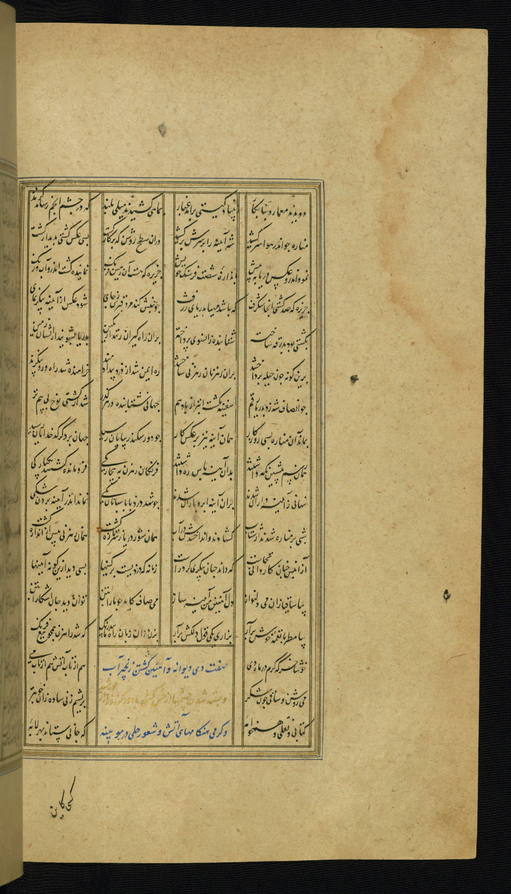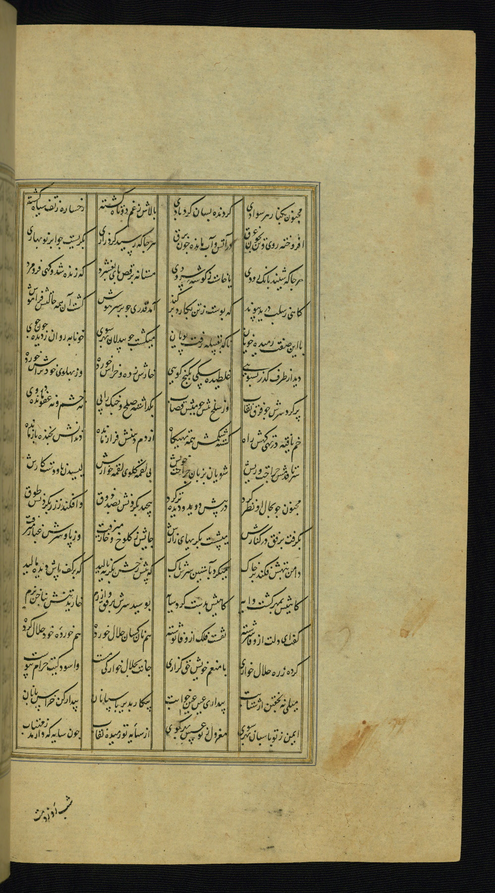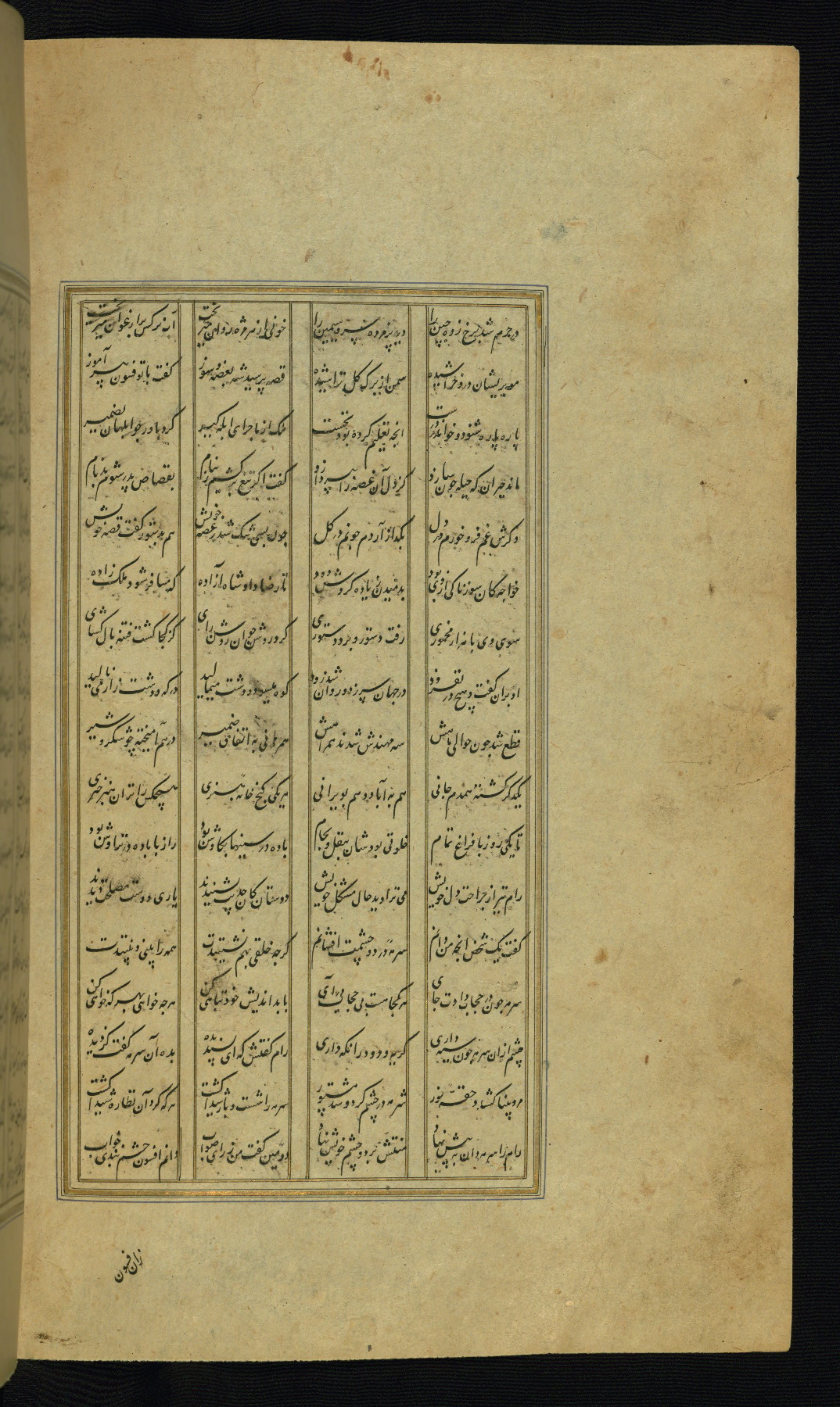 This is an illustrated and illuminated Safavid copy of the Khamsah (quintet) of Amīr Khusraw Dihlavī (d. 725 AH / 1325 CE), written by Pīr Ḥusayn al-Kātib al-Shīrāzī in 935 AH / 1529 CE. The codex opens with a double-page illuminated frontispiece with verses in honor of the poet Mir (Amir) Khusraw (fols. 1b-2a). There are four illuminated incipit pages introducing the individual poems, and thirteen paintings illustrate the text. The lacquer binding, which is not original to the manuscript, has a hunting scene on the upper and lower boards. The lower board is inscribed yā Shāh Najaf (oh, King of Najaf, i.e. ʿAlī) and is dated 1271 AH / 1854 CE.