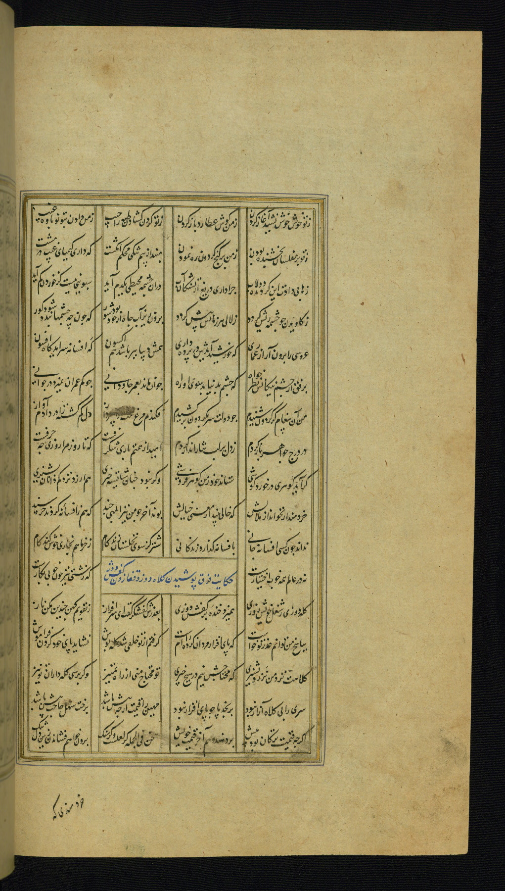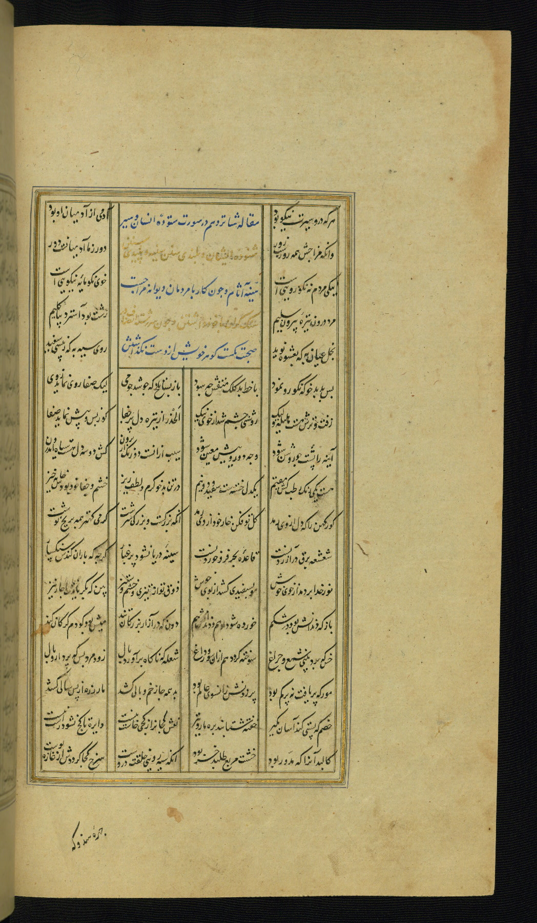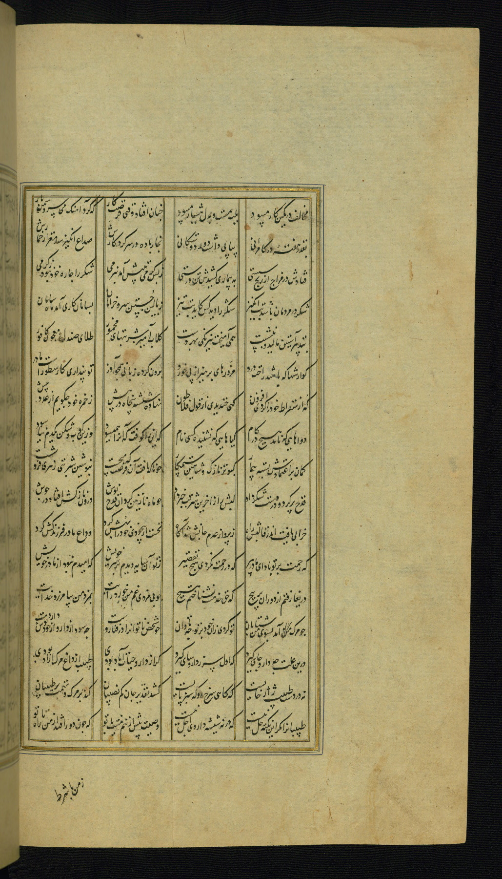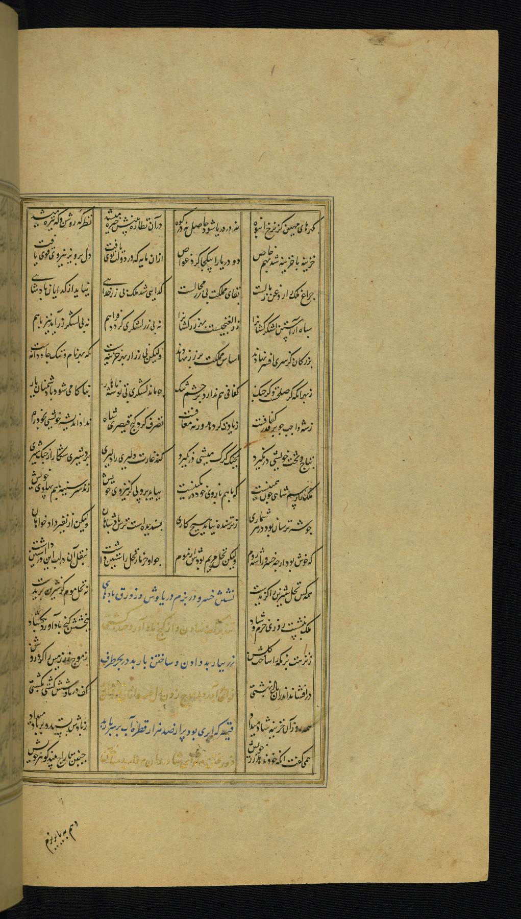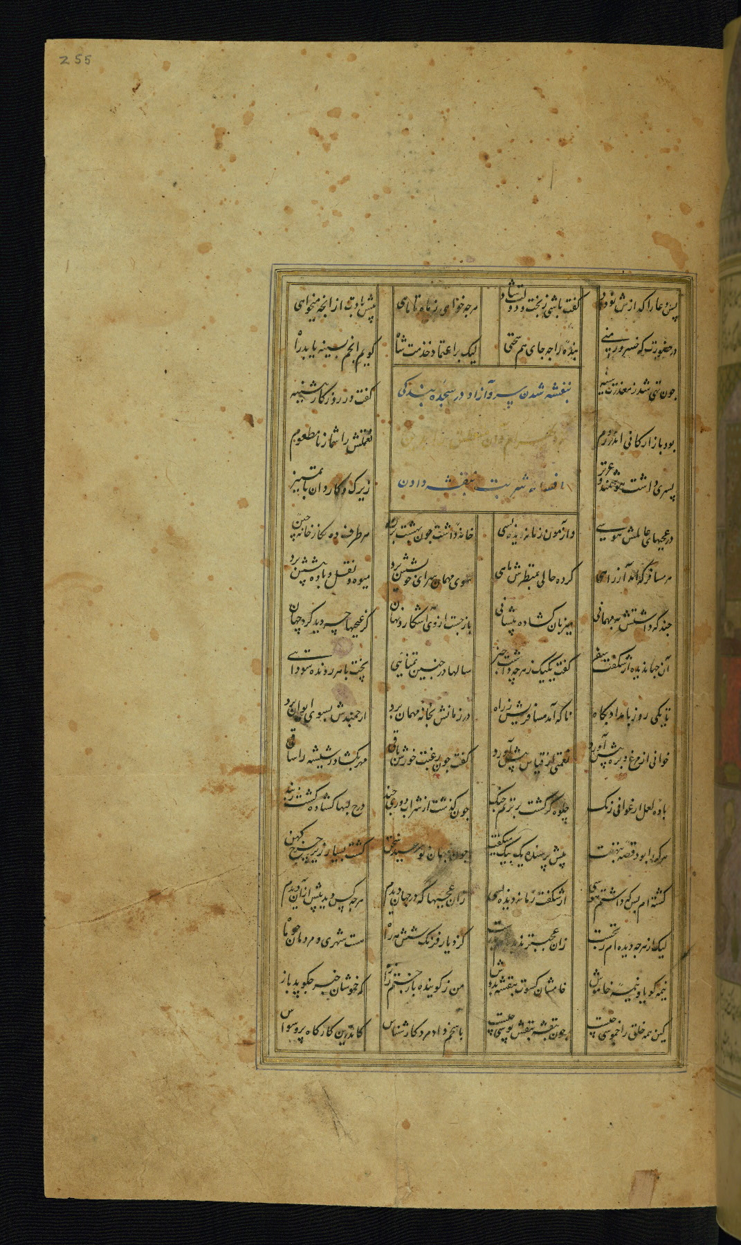 This is an illustrated and illuminated Safavid copy of the Khamsah (quintet) of Amīr Khusraw Dihlavī (d. 725 AH / 1325 CE), written by Pīr Ḥusayn al-Kātib al-Shīrāzī in 935 AH / 1529 CE. The codex opens with a double-page illuminated frontispiece with verses in honor of the poet Mir (Amir) Khusraw (fols. 1b-2a). There are four illuminated incipit pages introducing the individual poems, and thirteen paintings illustrate the text. The lacquer binding, which is not original to the manuscript, has a hunting scene on the upper and lower boards. The lower board is inscribed yā Shāh Najaf (oh, King of Najaf, i.e. ʿAlī) and is dated 1271 AH / 1854 CE.