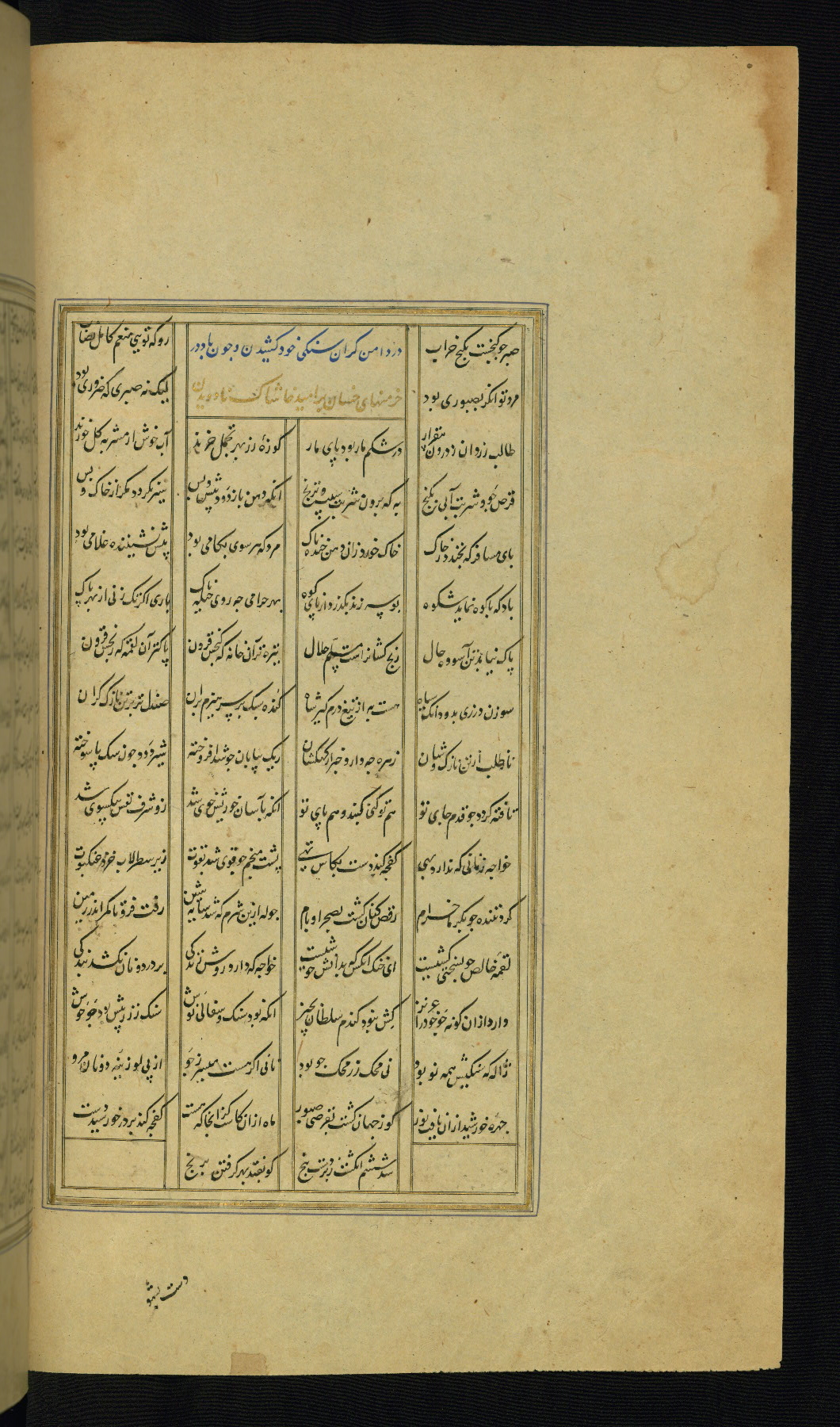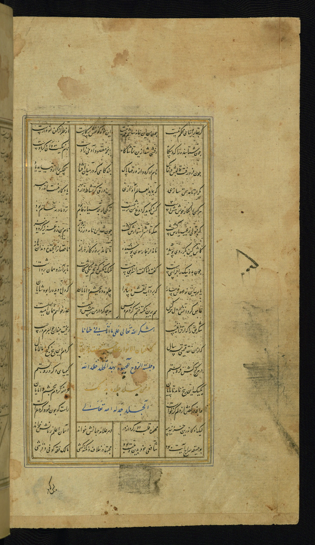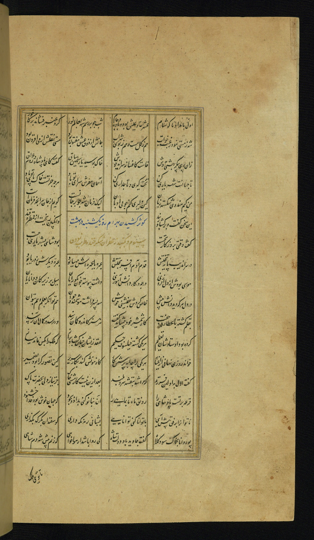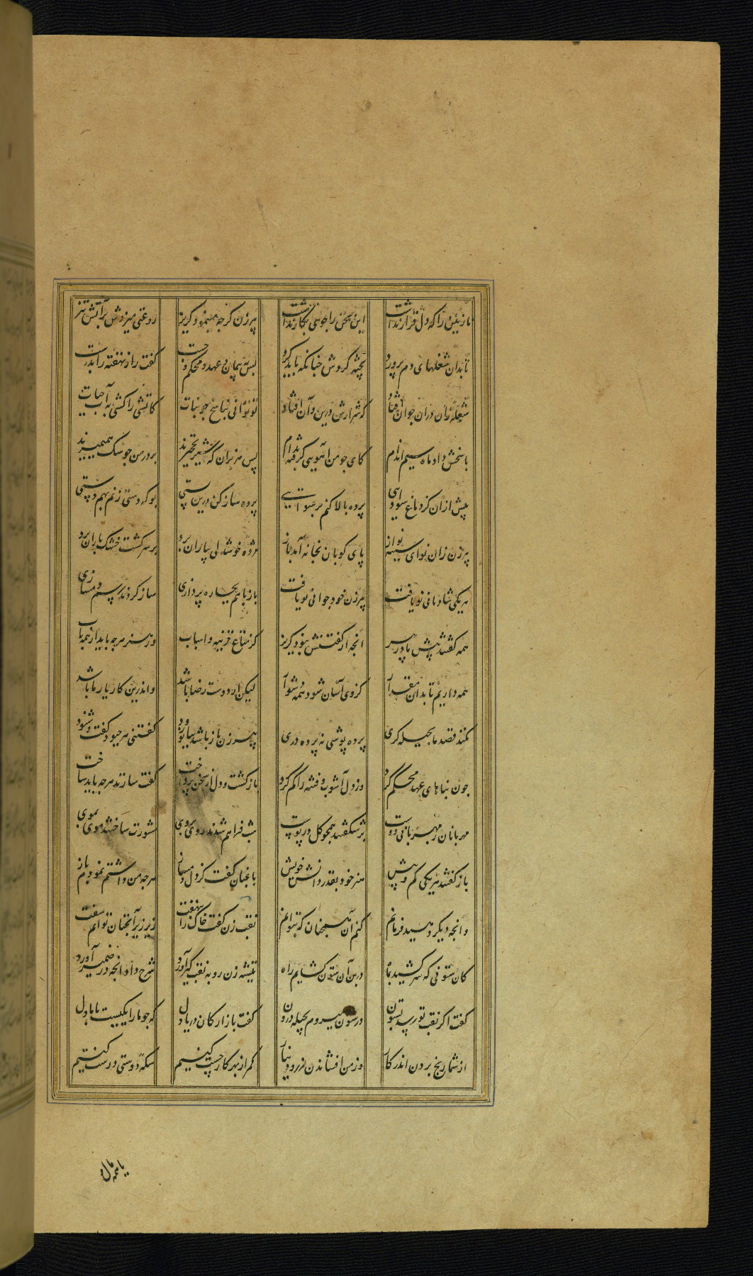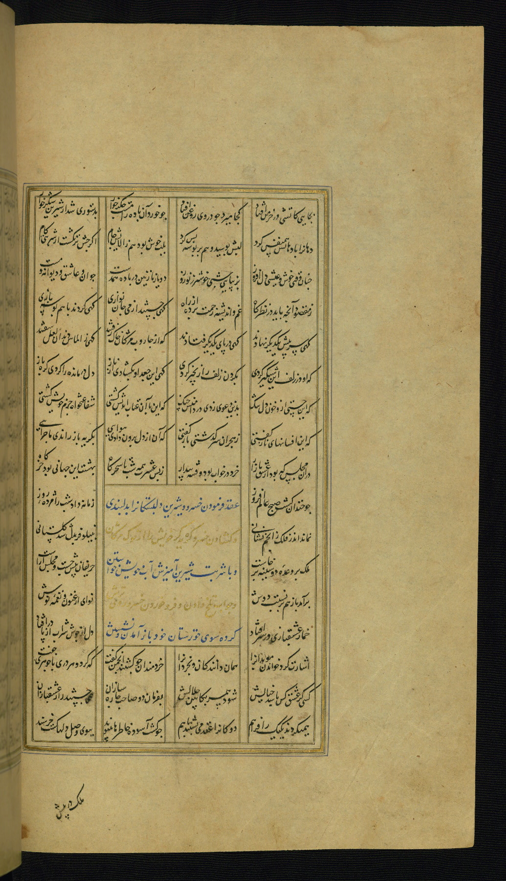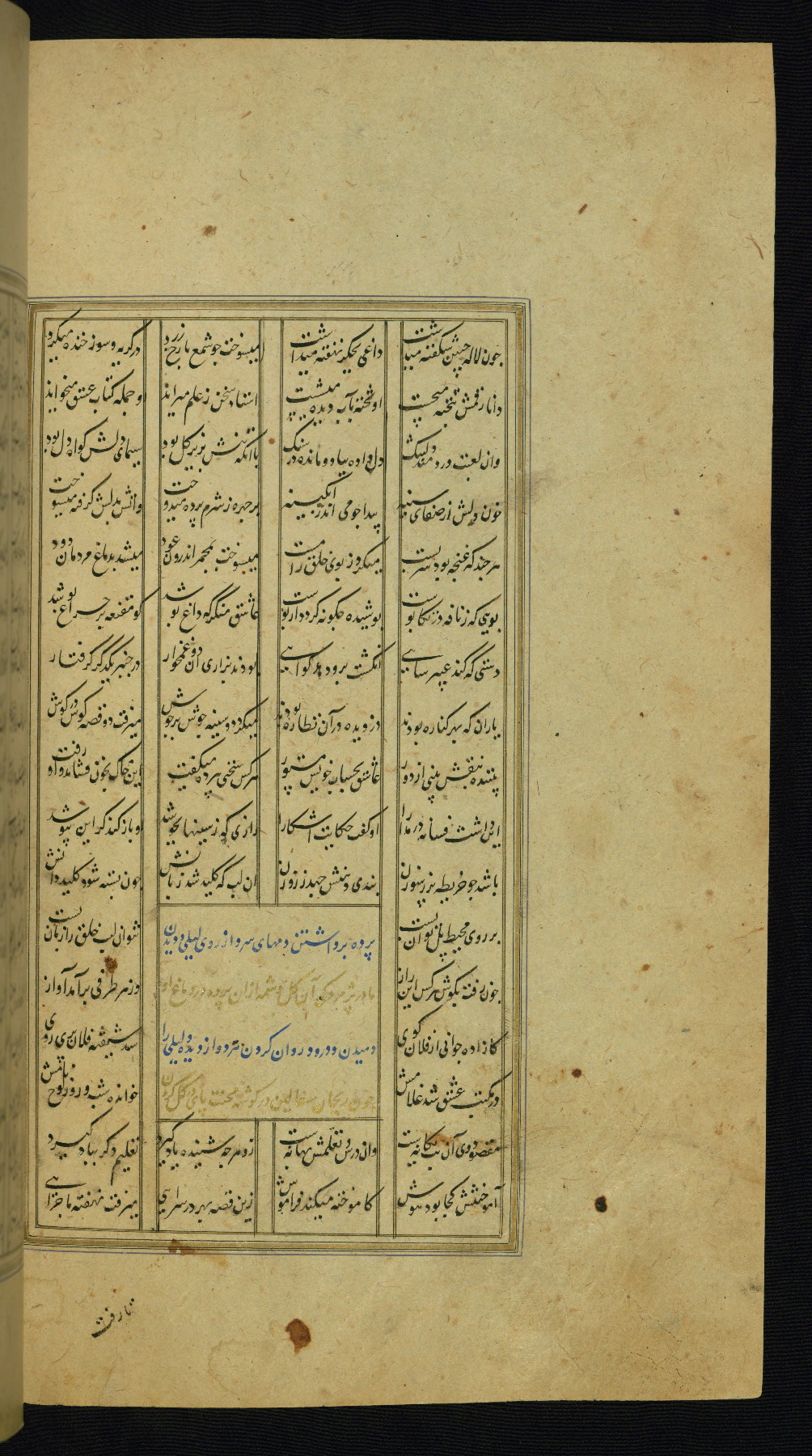 This is an illustrated and illuminated Safavid copy of the Khamsah (quintet) of Amīr Khusraw Dihlavī (d. 725 AH / 1325 CE), written by Pīr Ḥusayn al-Kātib al-Shīrāzī in 935 AH / 1529 CE. The codex opens with a double-page illuminated frontispiece with verses in honor of the poet Mir (Amir) Khusraw (fols. 1b-2a). There are four illuminated incipit pages introducing the individual poems, and thirteen paintings illustrate the text. The lacquer binding, which is not original to the manuscript, has a hunting scene on the upper and lower boards. The lower board is inscribed yā Shāh Najaf (oh, King of Najaf, i.e. ʿAlī) and is dated 1271 AH / 1854 CE.
