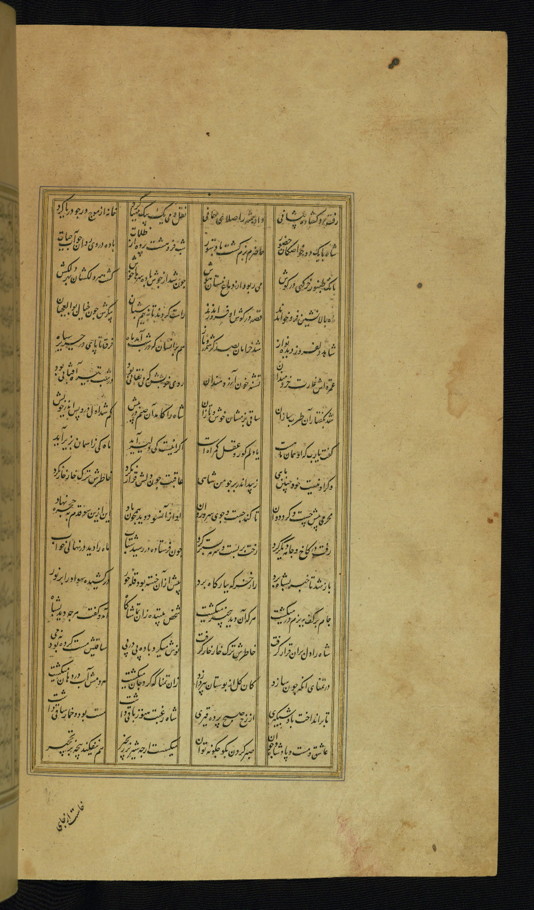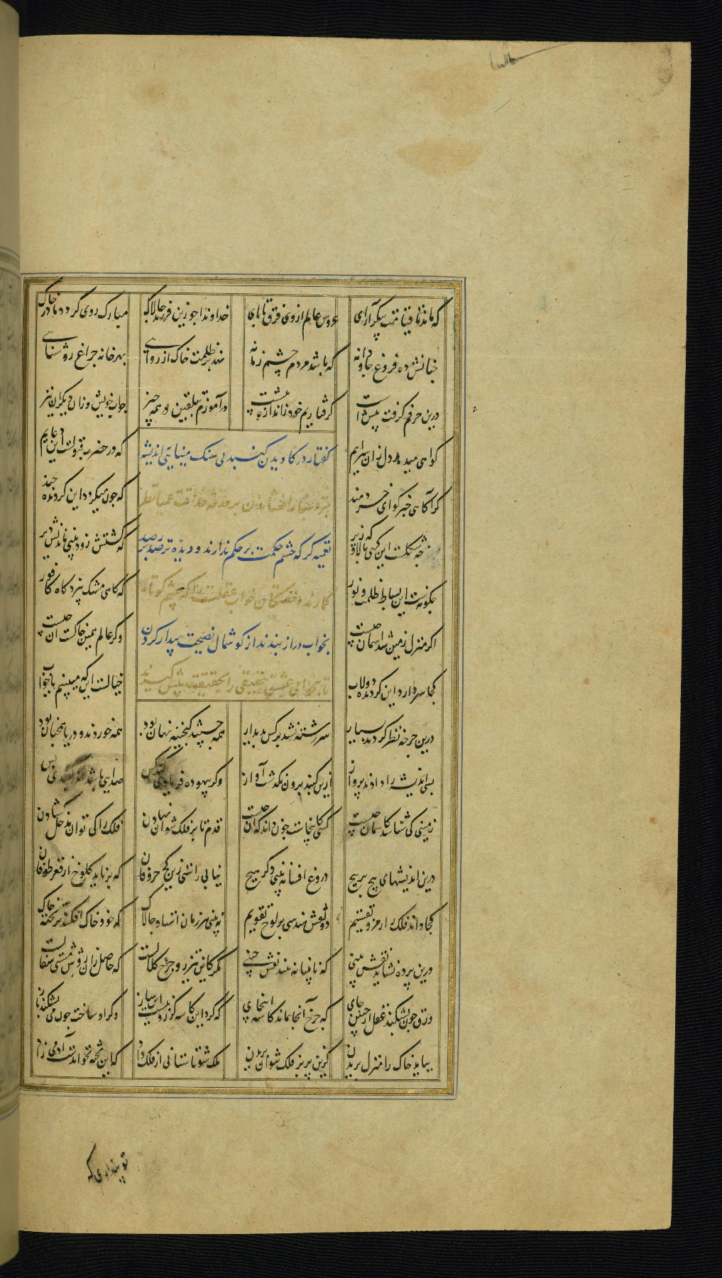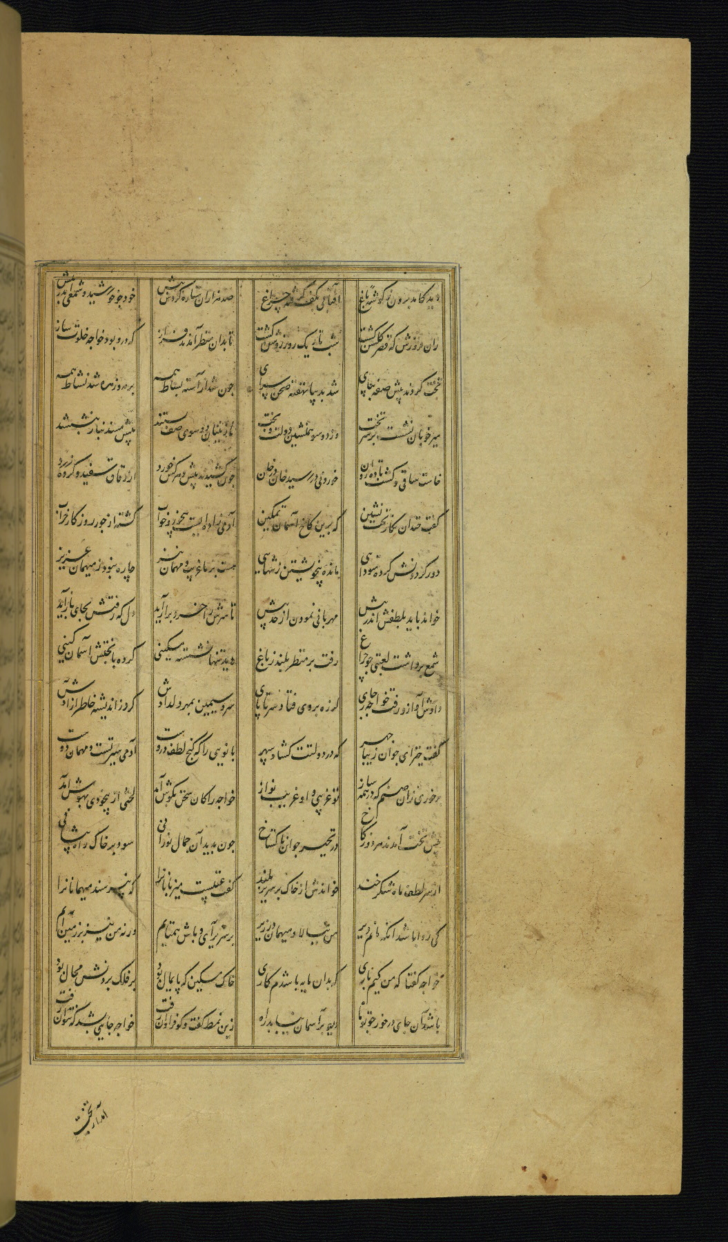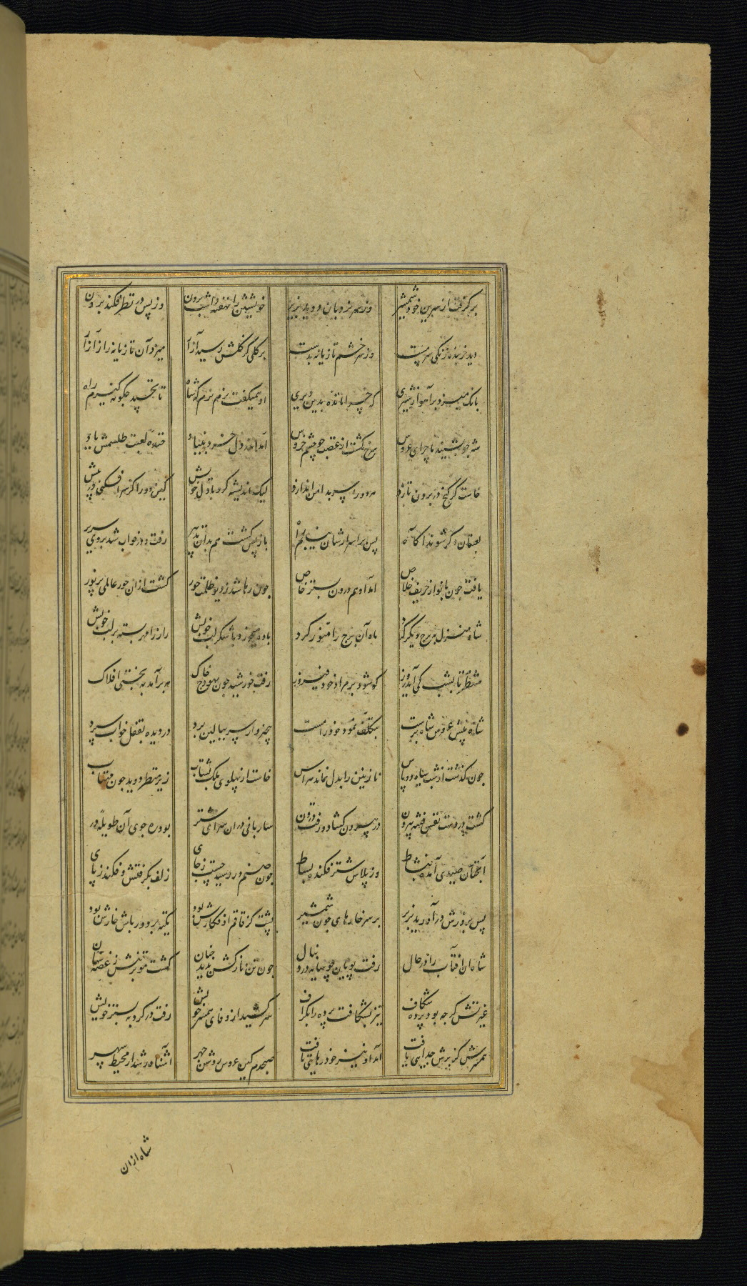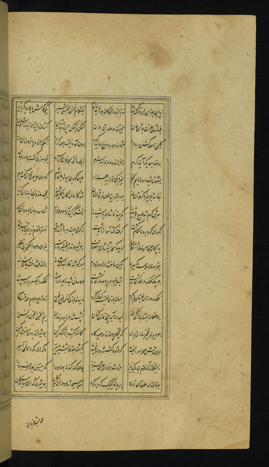This is an illustrated and illuminated Safavid copy of the Khamsah (quintet) of Amīr Khusraw Dihlavī (d. 725 AH / 1325 CE), written by Pīr Ḥusayn al-Kātib al-Shīrāzī in 935 AH / 1529 CE. The codex opens with a double-page illuminated frontispiece with verses in honor of the poet Mir (Amir) Khusraw (fols. 1b-2a). There are four illuminated incipit pages introducing the individual poems, and thirteen paintings illustrate the text. The lacquer binding, which is not original to the manuscript, has a hunting scene on the upper and lower boards. The lower board is inscribed yā Shāh Najaf (oh, King of Najaf, i.e. ʿAlī) and is dated 1271 AH / 1854 CE.