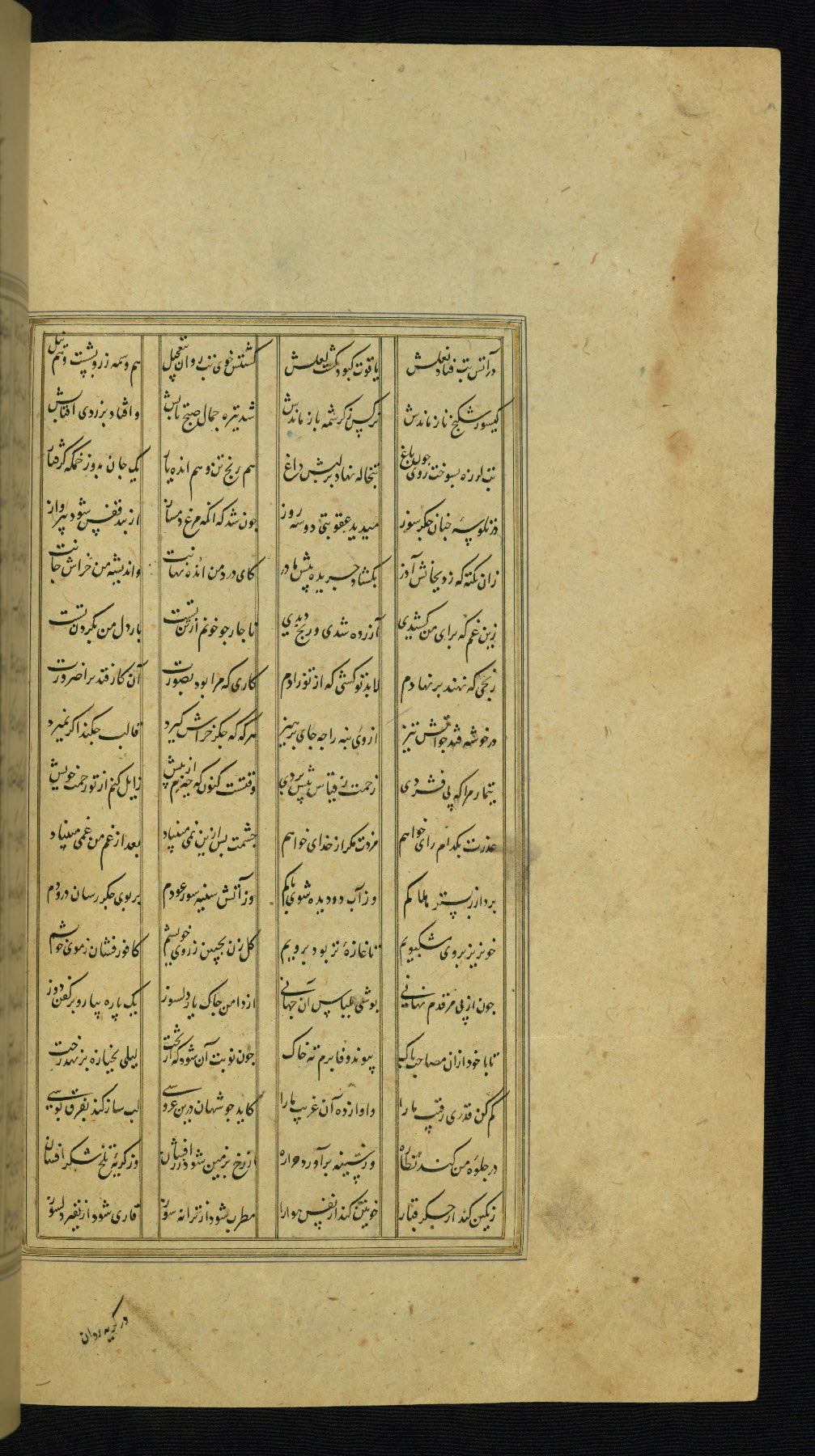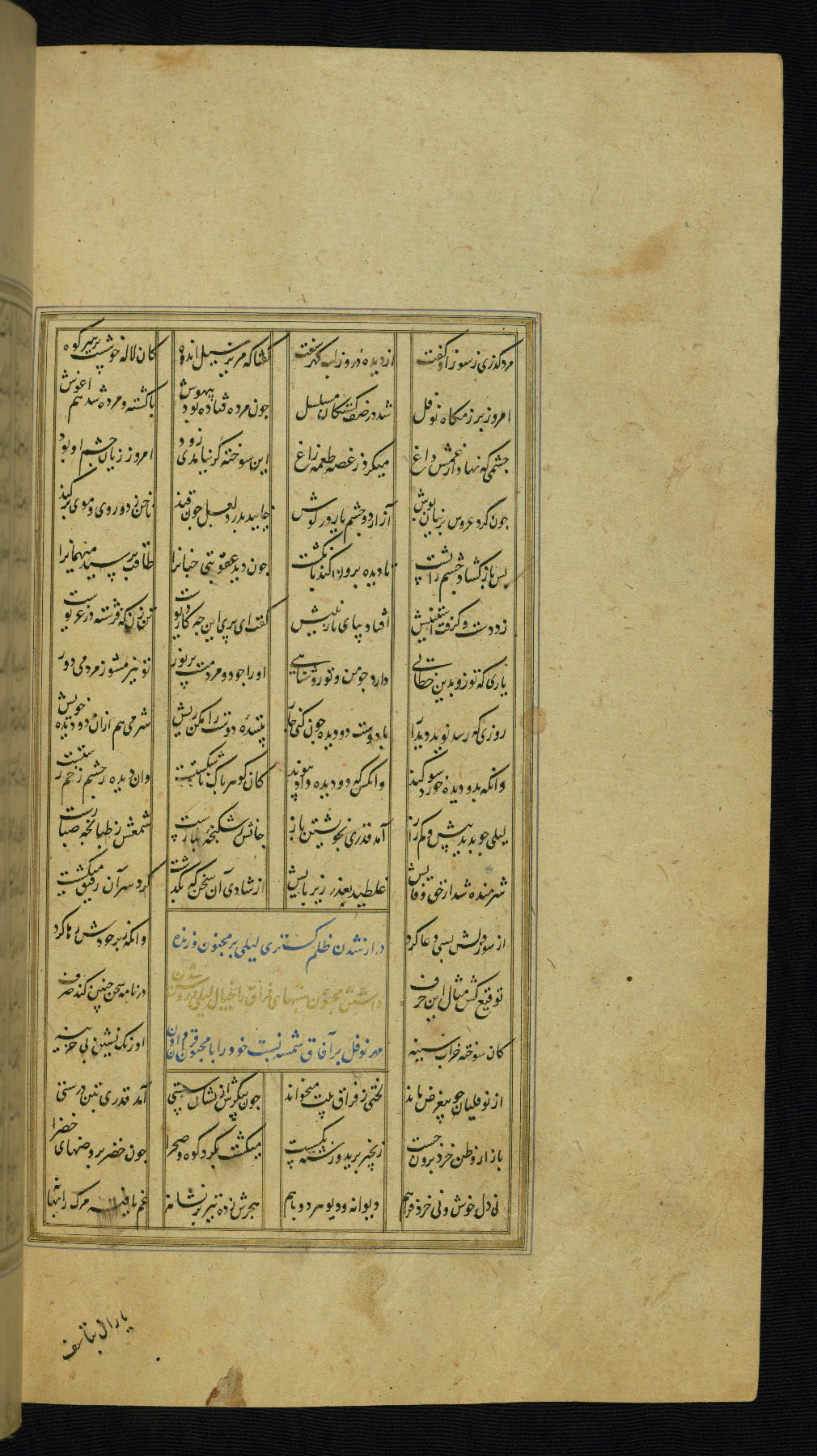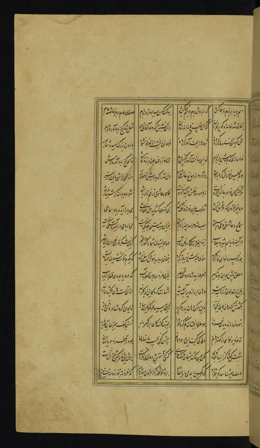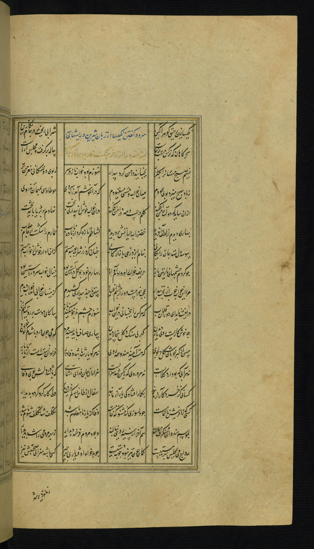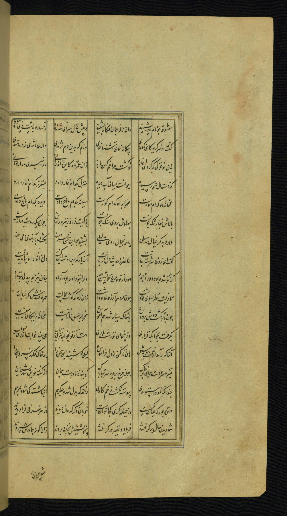 This is an illustrated and illuminated Safavid copy of the Khamsah (quintet) of Amīr Khusraw Dihlavī (d. 725 AH / 1325 CE), written by Pīr Ḥusayn al-Kātib al-Shīrāzī in 935 AH / 1529 CE. The codex opens with a double-page illuminated frontispiece with verses in honor of the poet Mir (Amir) Khusraw (fols. 1b-2a). There are four illuminated incipit pages introducing the individual poems, and thirteen paintings illustrate the text. The lacquer binding, which is not original to the manuscript, has a hunting scene on the upper and lower boards. The lower board is inscribed yā Shāh Najaf (oh, King of Najaf, i.e. ʿAlī) and is dated 1271 AH / 1854 CE.