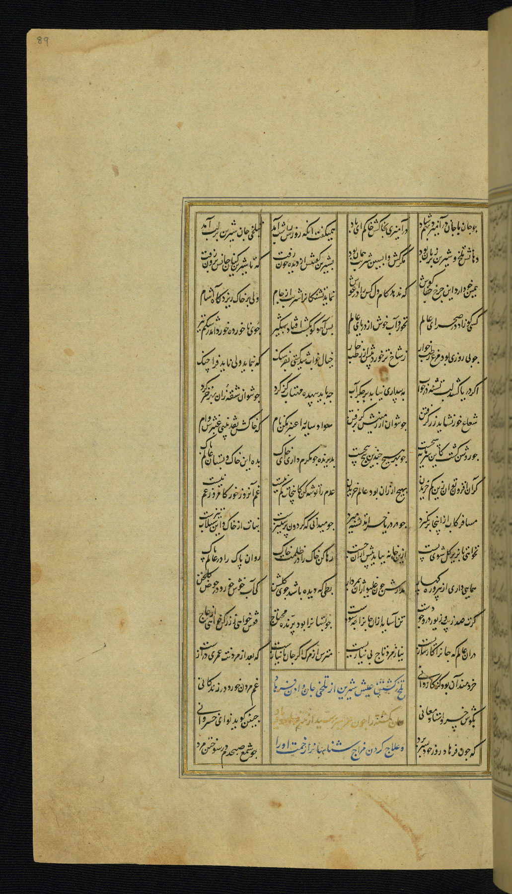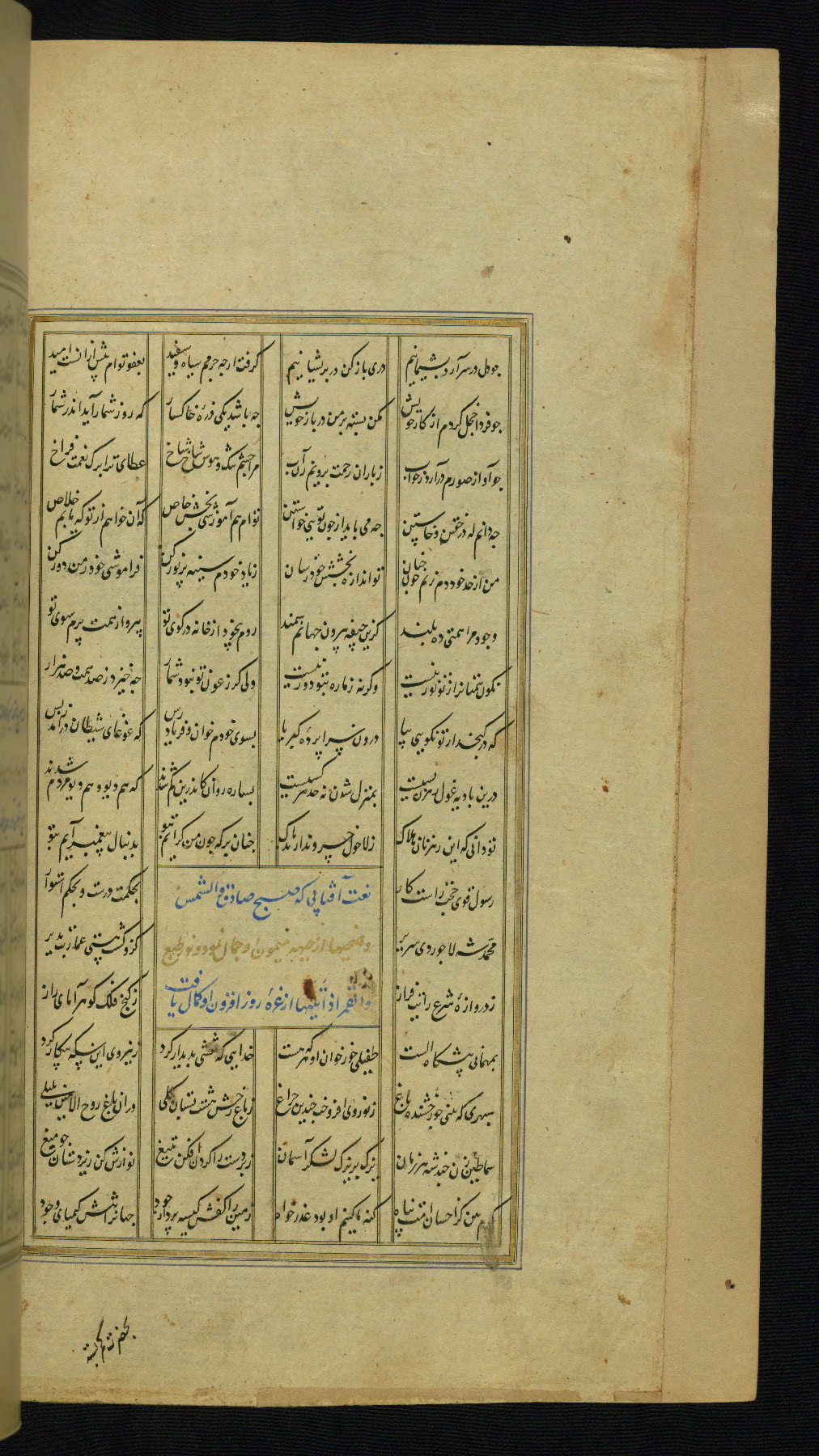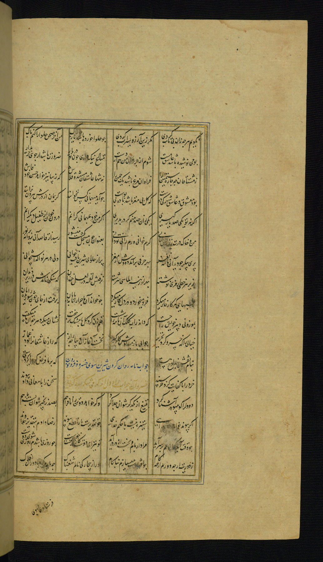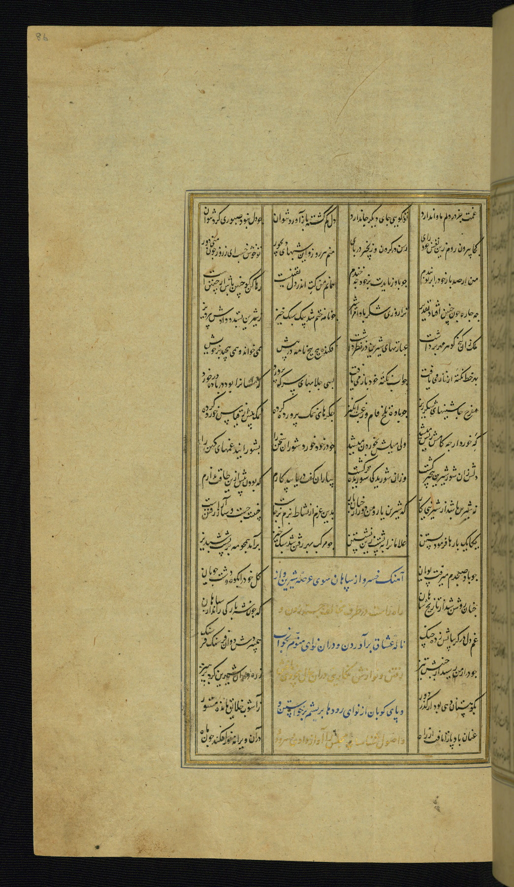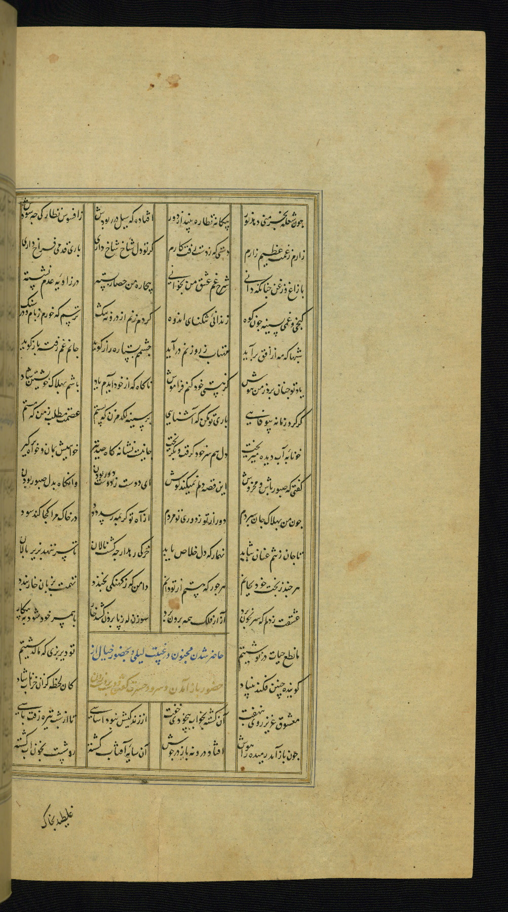 This is an illustrated and illuminated Safavid copy of the Khamsah (quintet) of Amīr Khusraw Dihlavī (d. 725 AH / 1325 CE), written by Pīr Ḥusayn al-Kātib al-Shīrāzī in 935 AH / 1529 CE. The codex opens with a double-page illuminated frontispiece with verses in honor of the poet Mir (Amir) Khusraw (fols. 1b-2a). There are four illuminated incipit pages introducing the individual poems, and thirteen paintings illustrate the text. The lacquer binding, which is not original to the manuscript, has a hunting scene on the upper and lower boards. The lower board is inscribed yā Shāh Najaf (oh, King of Najaf, i.e. ʿAlī) and is dated 1271 AH / 1854 CE.