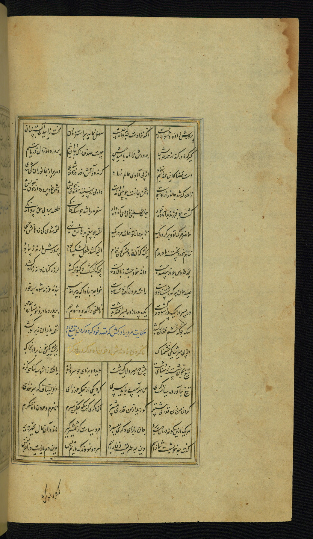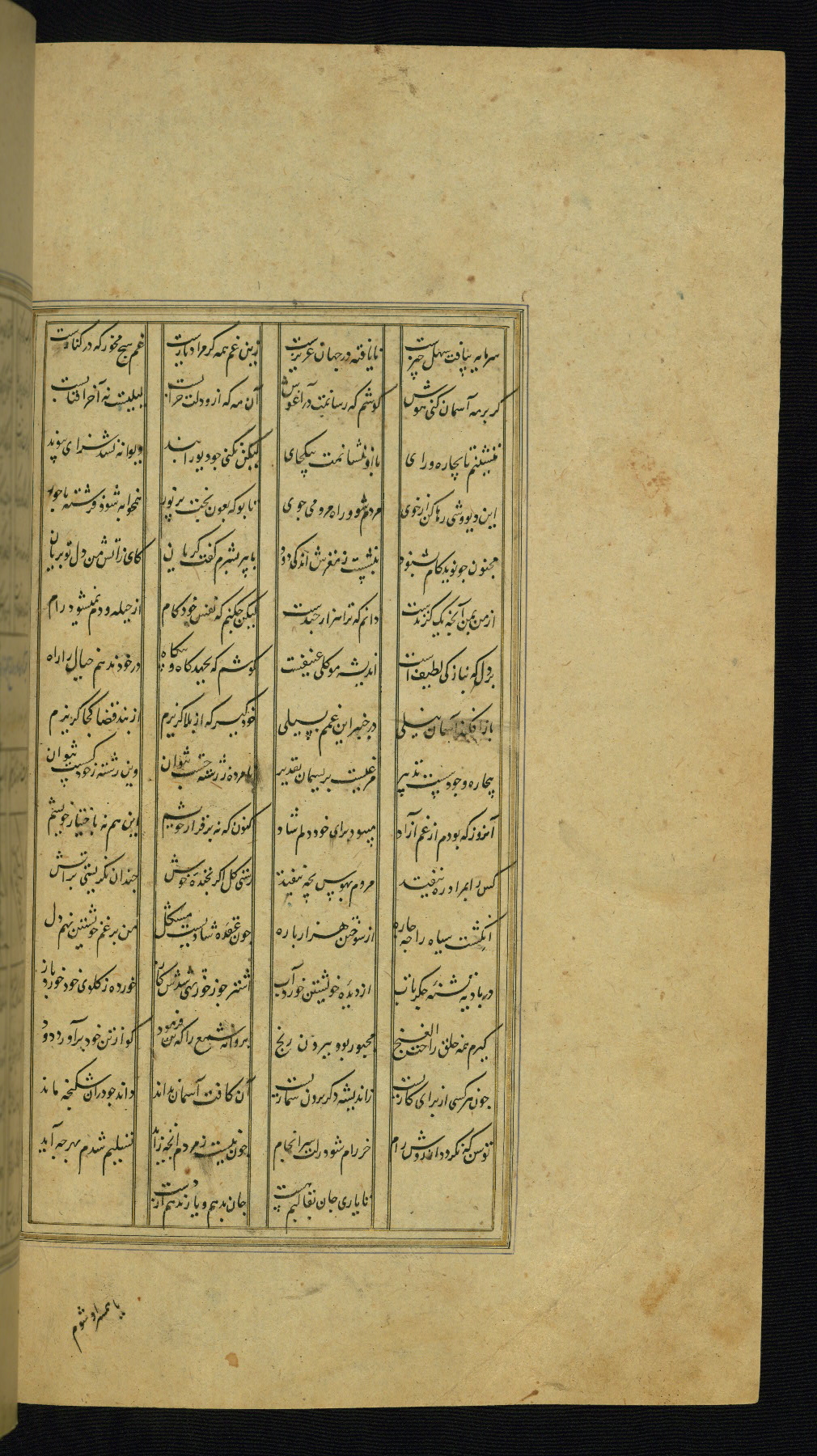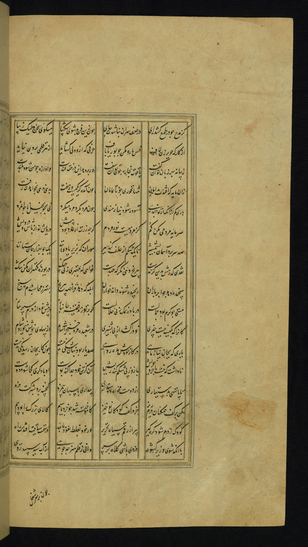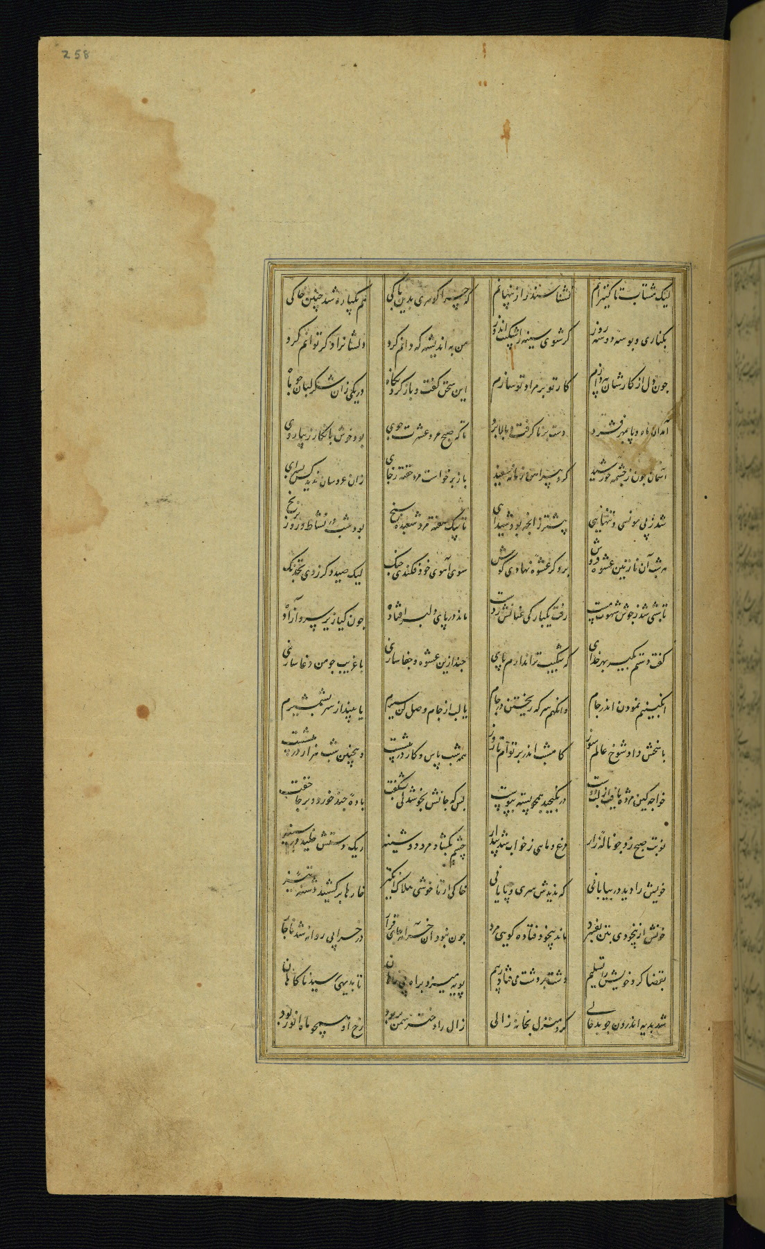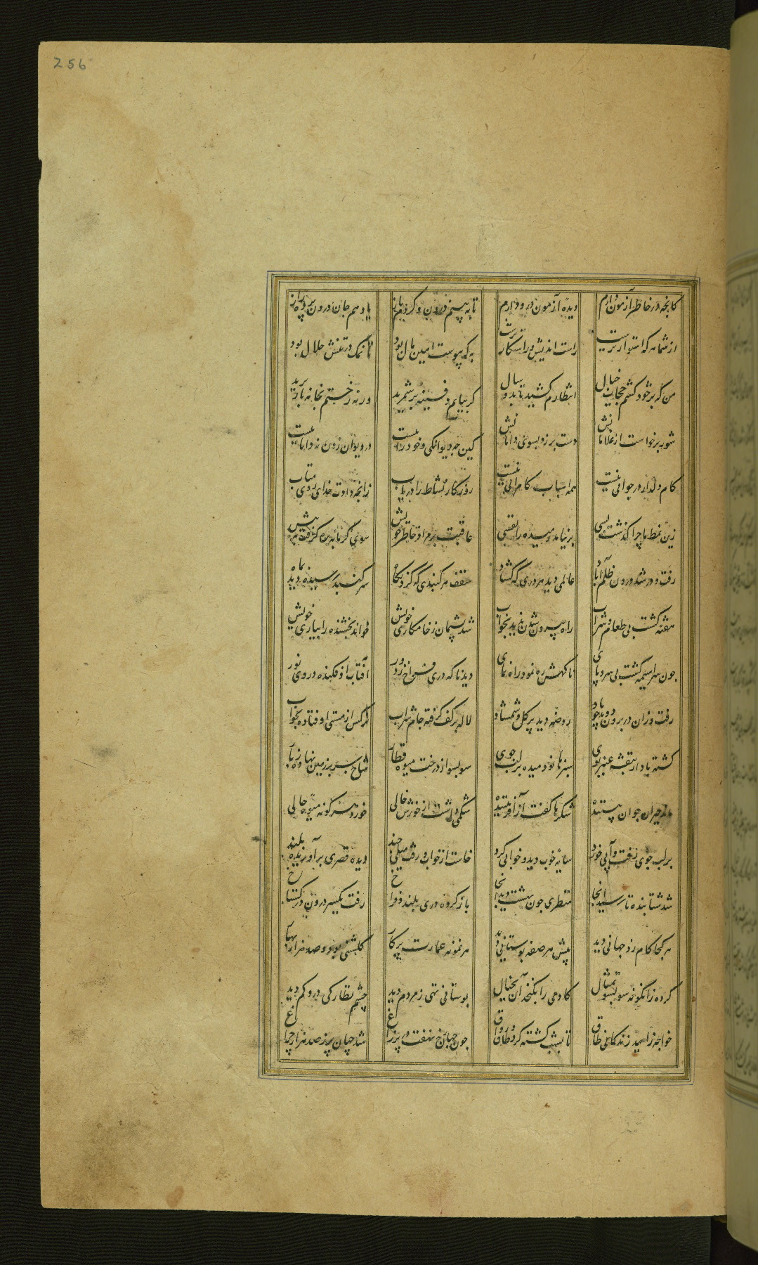 This is an illustrated and illuminated Safavid copy of the Khamsah (quintet) of Amīr Khusraw Dihlavī (d. 725 AH / 1325 CE), written by Pīr Ḥusayn al-Kātib al-Shīrāzī in 935 AH / 1529 CE. The codex opens with a double-page illuminated frontispiece with verses in honor of the poet Mir (Amir) Khusraw (fols. 1b-2a). There are four illuminated incipit pages introducing the individual poems, and thirteen paintings illustrate the text. The lacquer binding, which is not original to the manuscript, has a hunting scene on the upper and lower boards. The lower board is inscribed yā Shāh Najaf (oh, King of Najaf, i.e. ʿAlī) and is dated 1271 AH / 1854 CE.