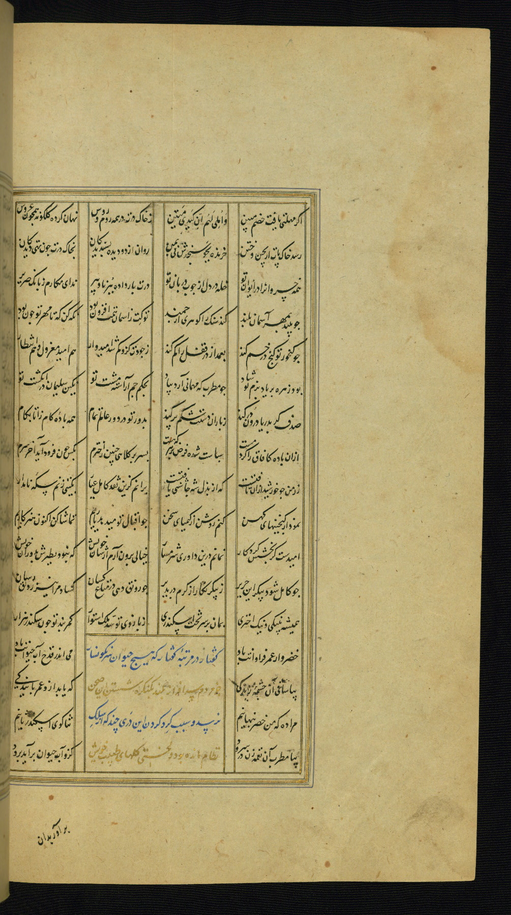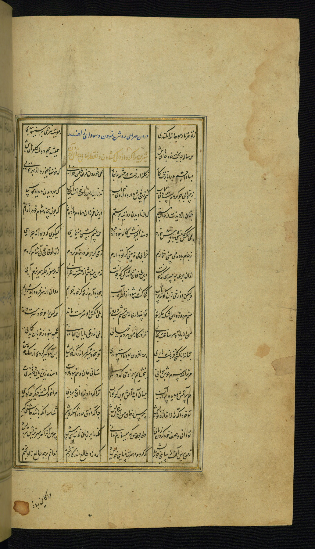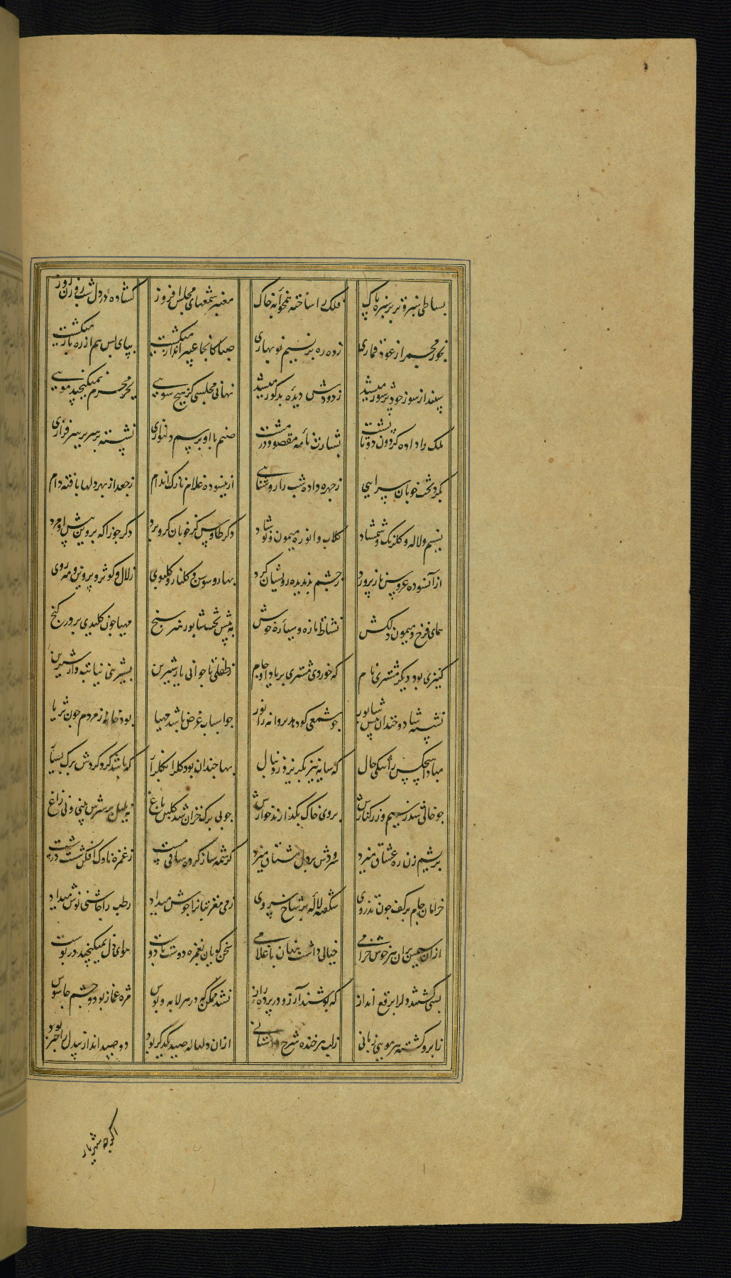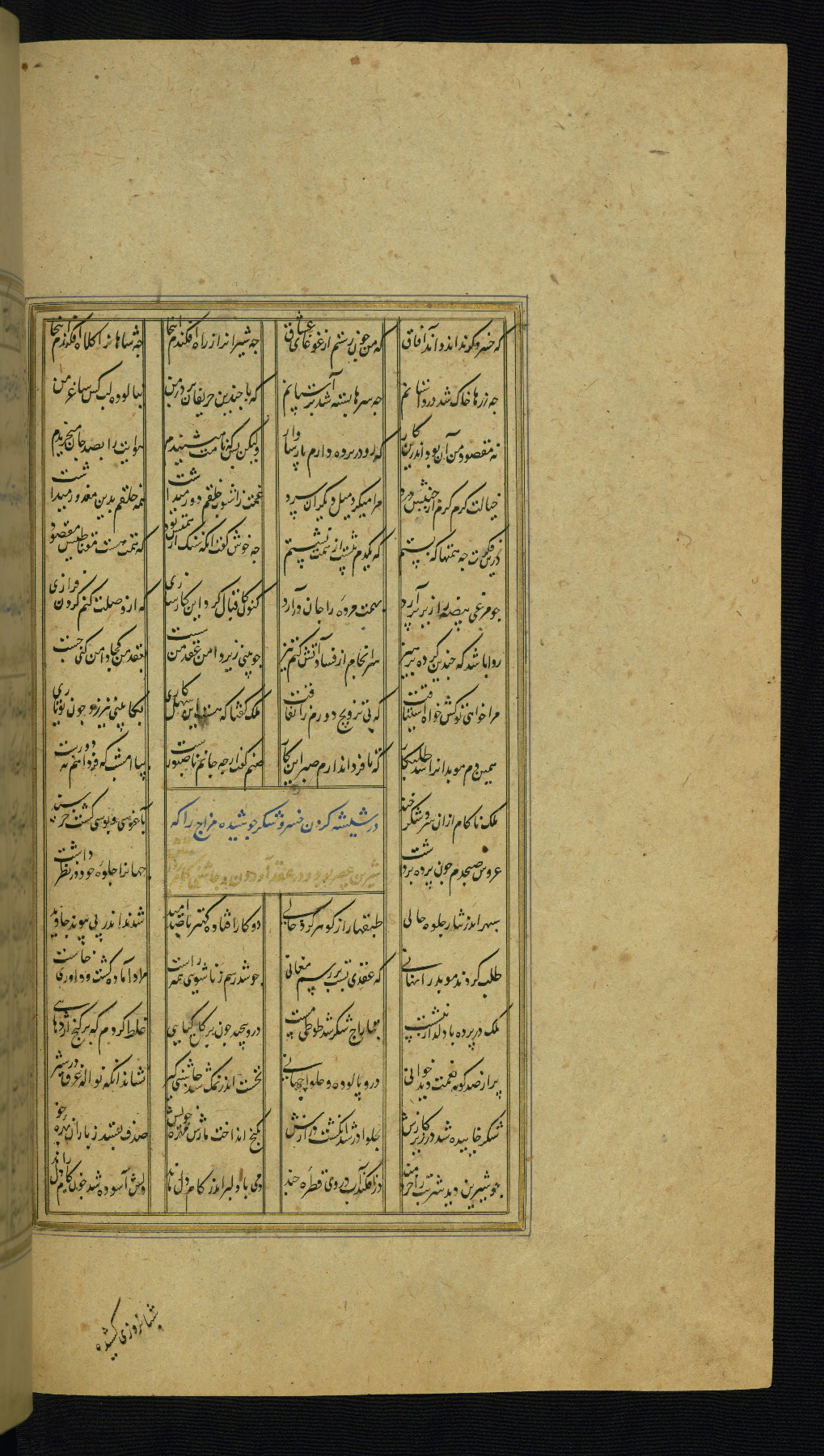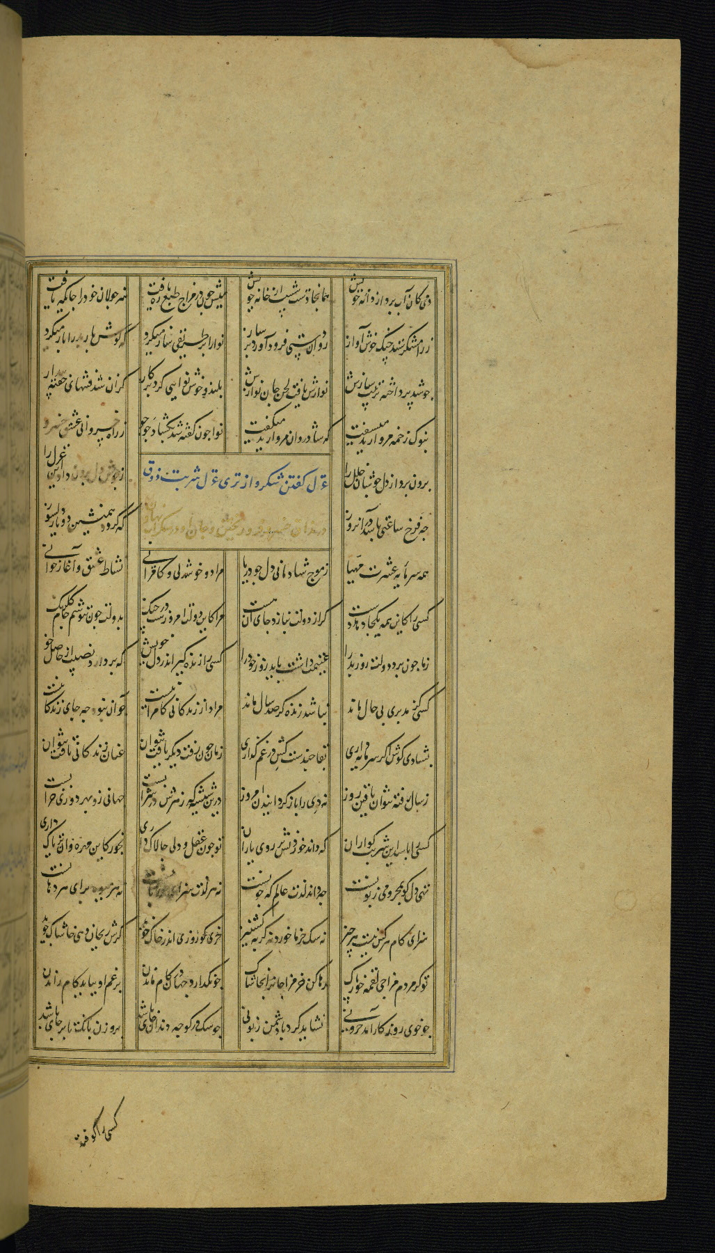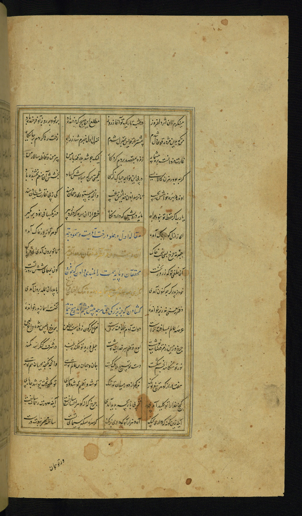 This is an illustrated and illuminated Safavid copy of the Khamsah (quintet) of Amīr Khusraw Dihlavī (d. 725 AH / 1325 CE), written by Pīr Ḥusayn al-Kātib al-Shīrāzī in 935 AH / 1529 CE. The codex opens with a double-page illuminated frontispiece with verses in honor of the poet Mir (Amir) Khusraw (fols. 1b-2a). There are four illuminated incipit pages introducing the individual poems, and thirteen paintings illustrate the text. The lacquer binding, which is not original to the manuscript, has a hunting scene on the upper and lower boards. The lower board is inscribed yā Shāh Najaf (oh, King of Najaf, i.e. ʿAlī) and is dated 1271 AH / 1854 CE.