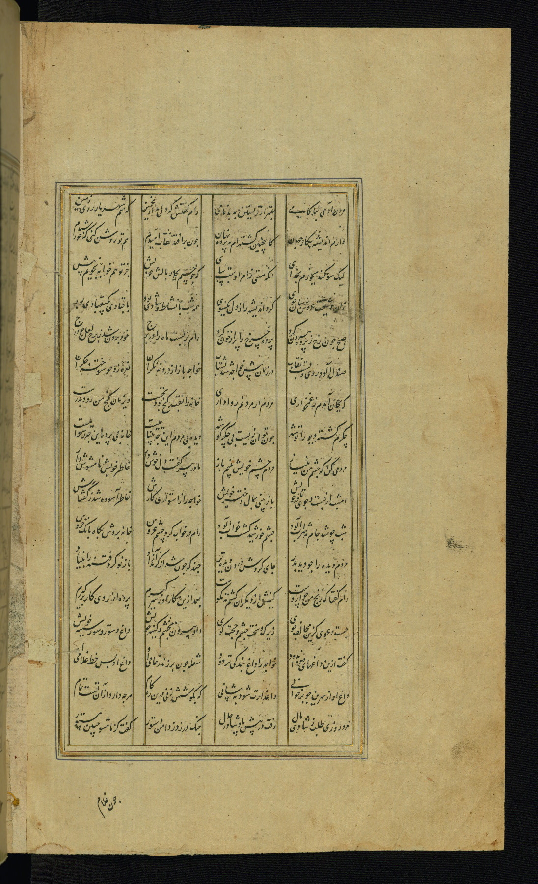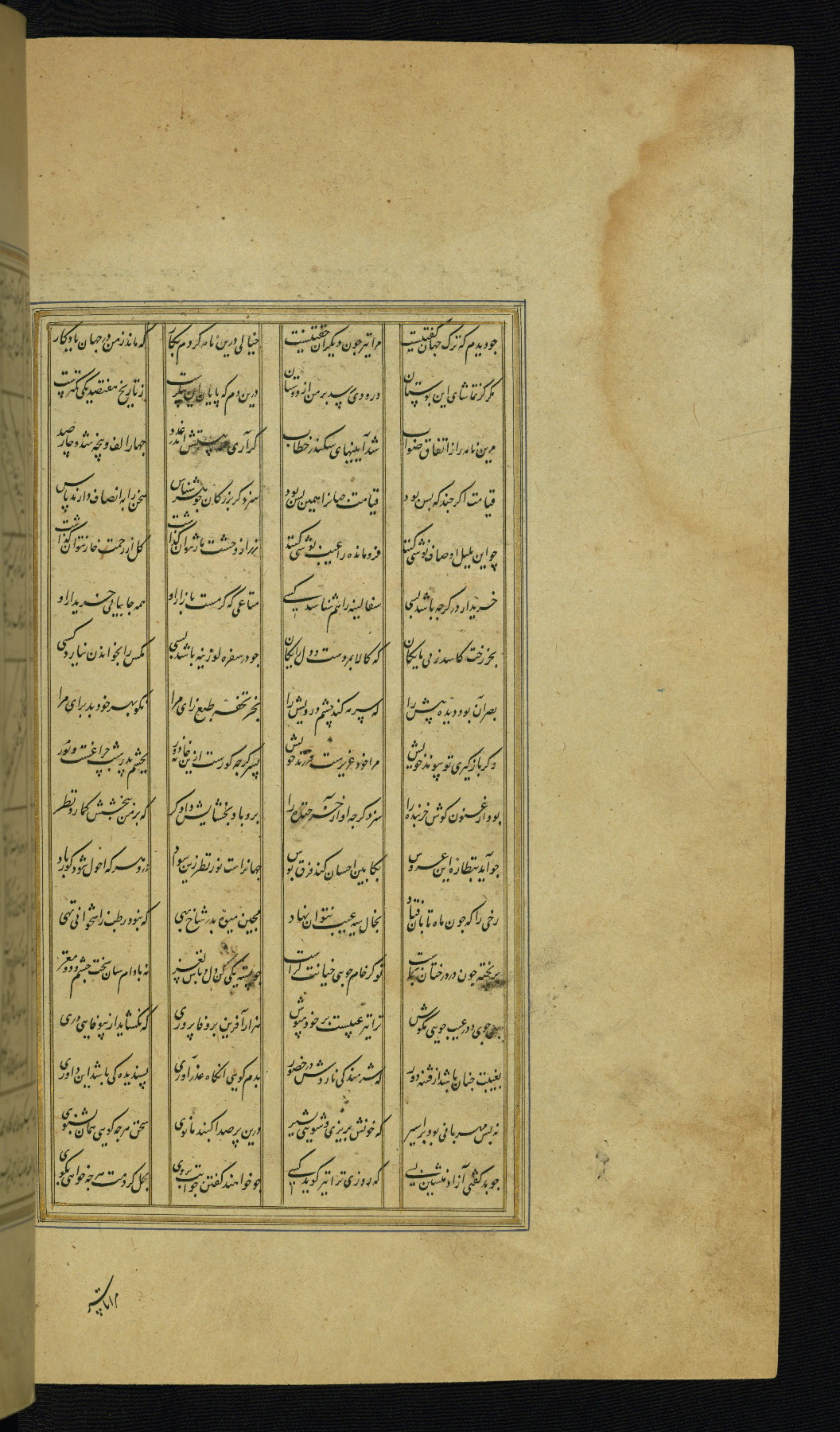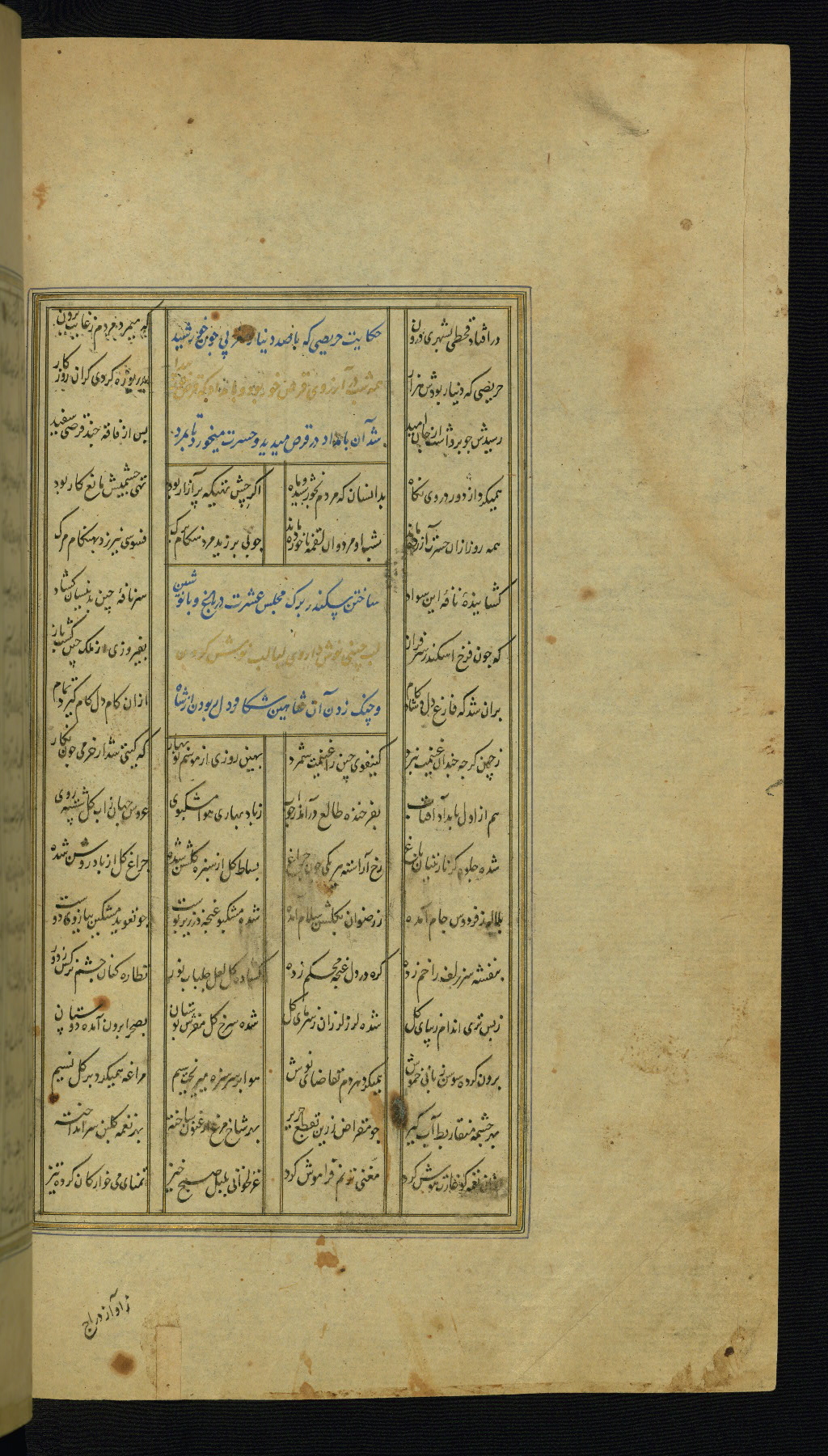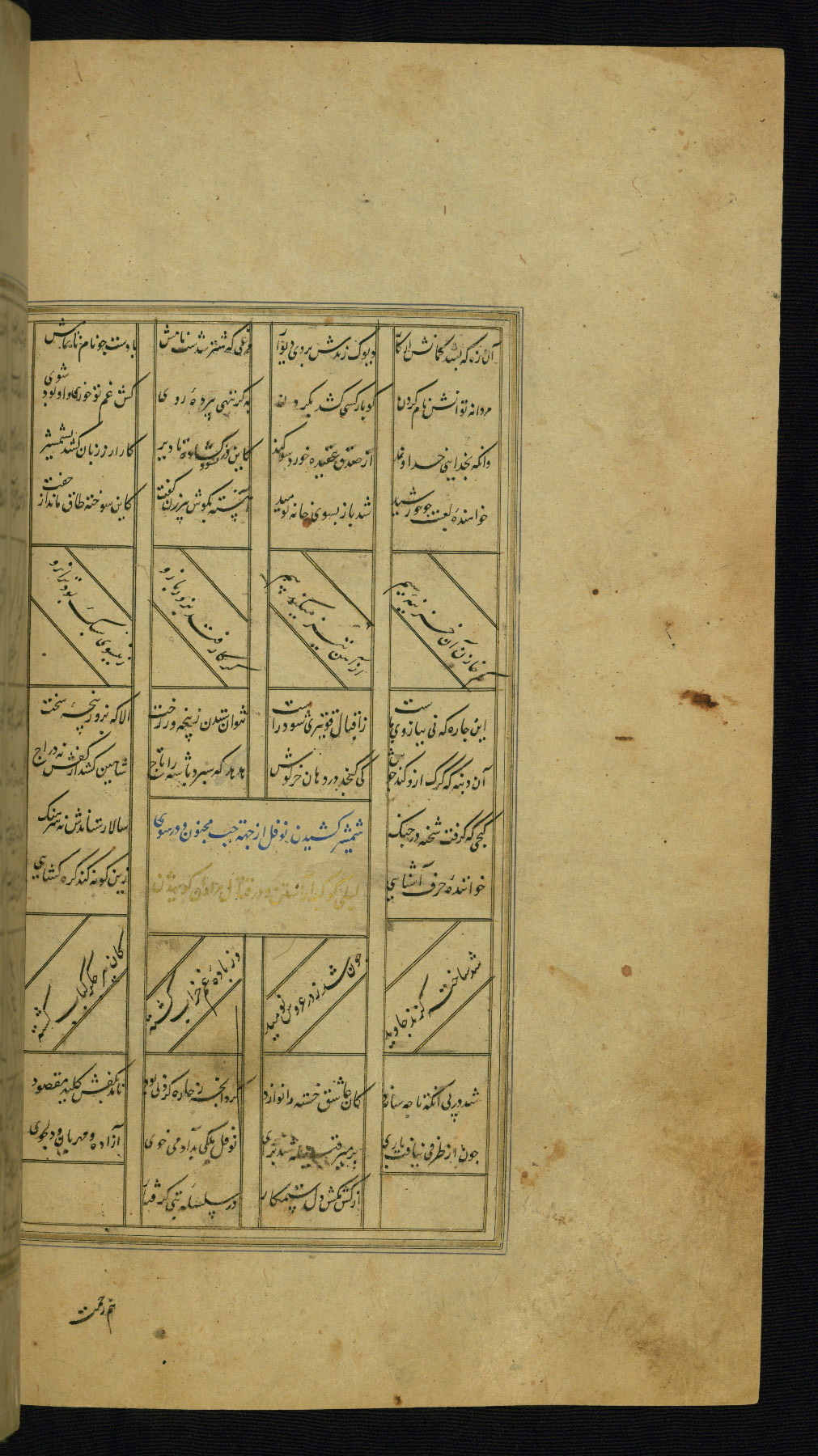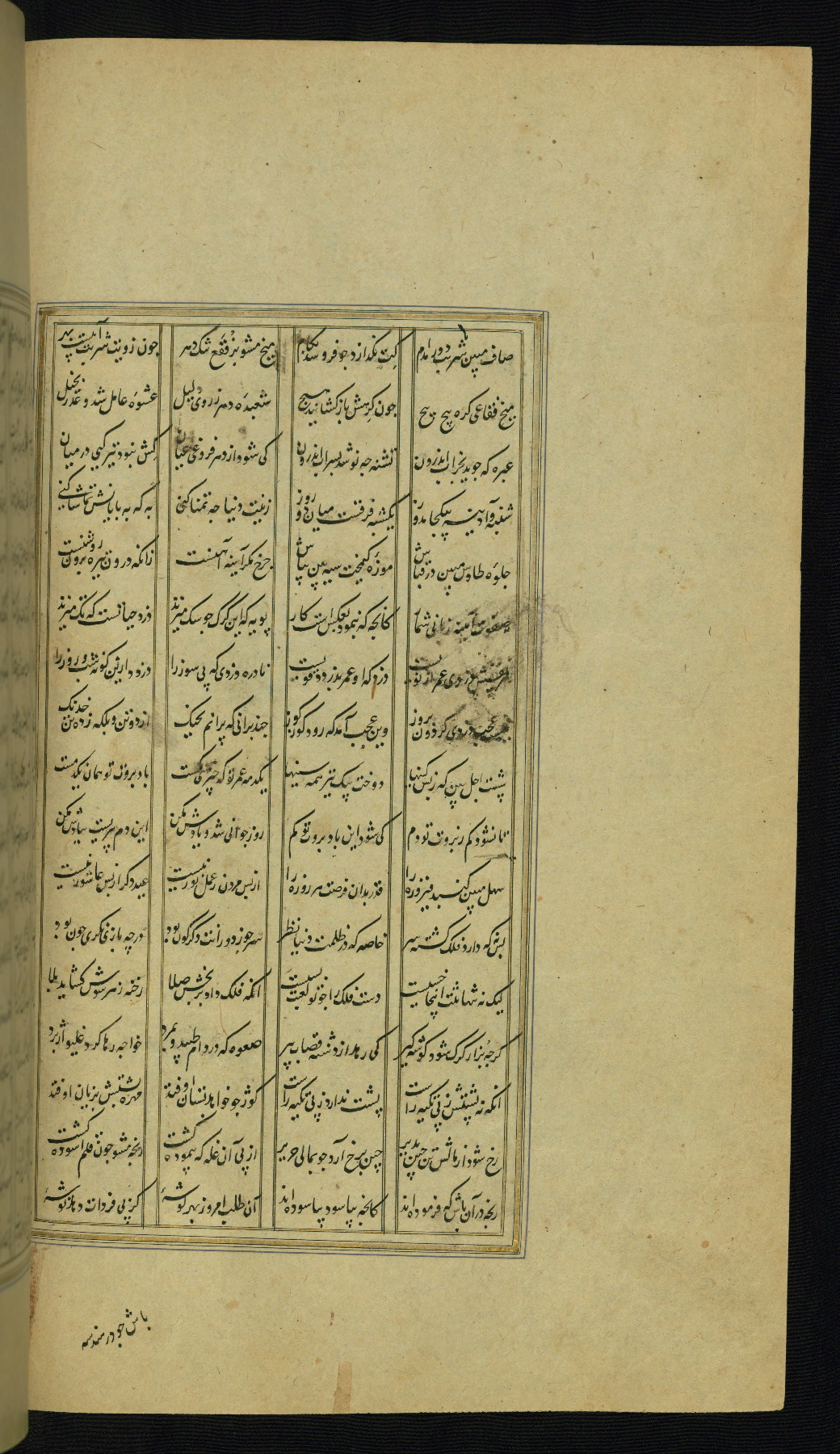 This is an illustrated and illuminated Safavid copy of the Khamsah (quintet) of Amīr Khusraw Dihlavī (d. 725 AH / 1325 CE), written by Pīr Ḥusayn al-Kātib al-Shīrāzī in 935 AH / 1529 CE. The codex opens with a double-page illuminated frontispiece with verses in honor of the poet Mir (Amir) Khusraw (fols. 1b-2a). There are four illuminated incipit pages introducing the individual poems, and thirteen paintings illustrate the text. The lacquer binding, which is not original to the manuscript, has a hunting scene on the upper and lower boards. The lower board is inscribed yā Shāh Najaf (oh, King of Najaf, i.e. ʿAlī) and is dated 1271 AH / 1854 CE.
