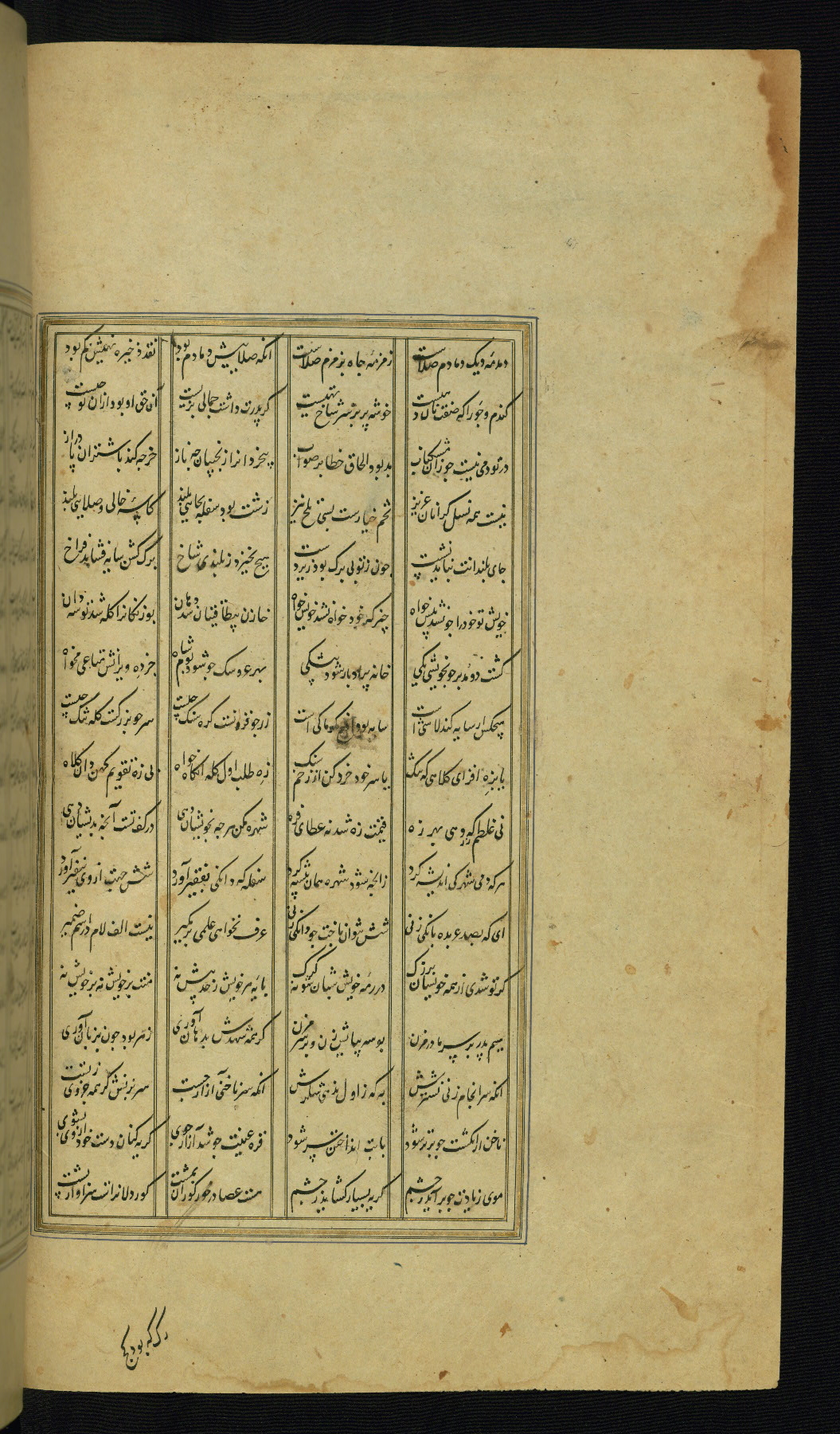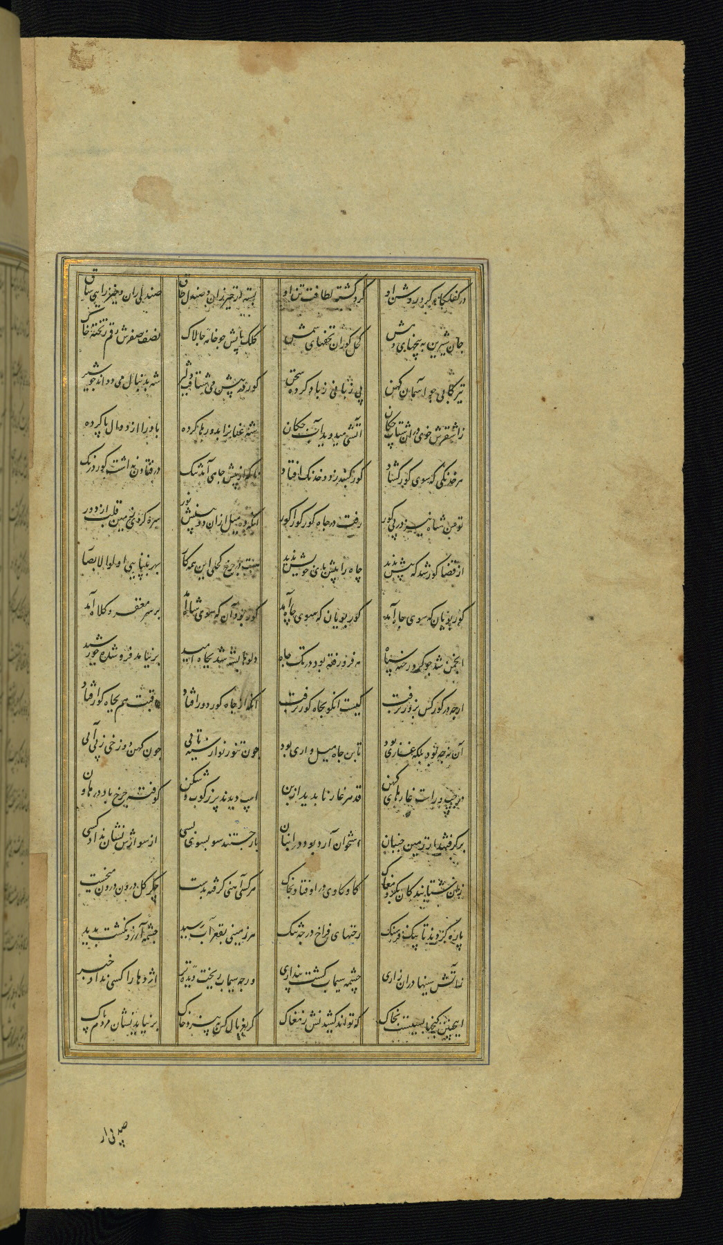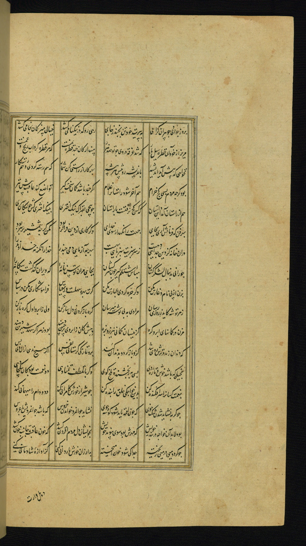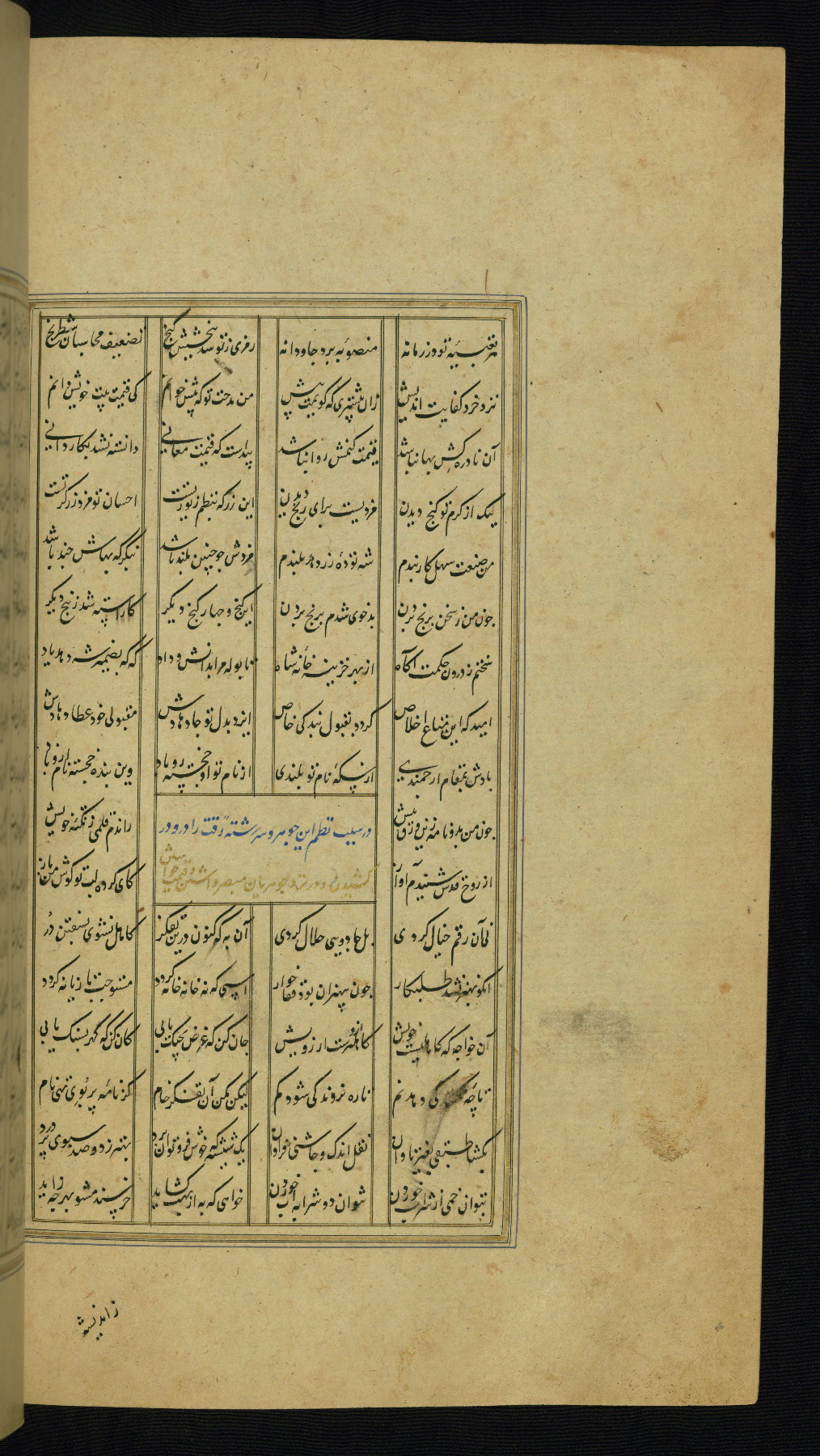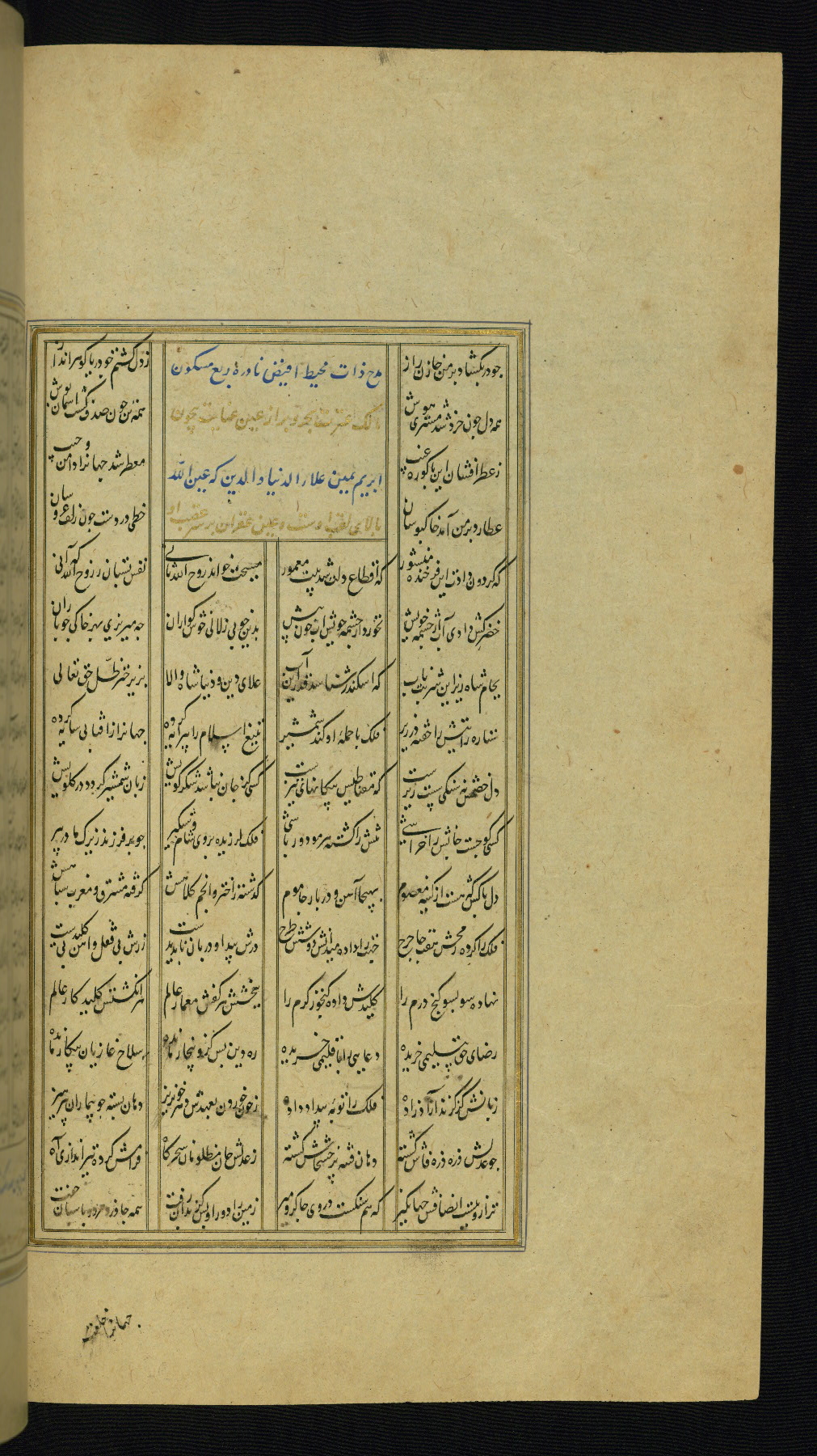 This is an illustrated and illuminated Safavid copy of the Khamsah (quintet) of Amīr Khusraw Dihlavī (d. 725 AH / 1325 CE), written by Pīr Ḥusayn al-Kātib al-Shīrāzī in 935 AH / 1529 CE. The codex opens with a double-page illuminated frontispiece with verses in honor of the poet Mir (Amir) Khusraw (fols. 1b-2a). There are four illuminated incipit pages introducing the individual poems, and thirteen paintings illustrate the text. The lacquer binding, which is not original to the manuscript, has a hunting scene on the upper and lower boards. The lower board is inscribed yā Shāh Najaf (oh, King of Najaf, i.e. ʿAlī) and is dated 1271 AH / 1854 CE.