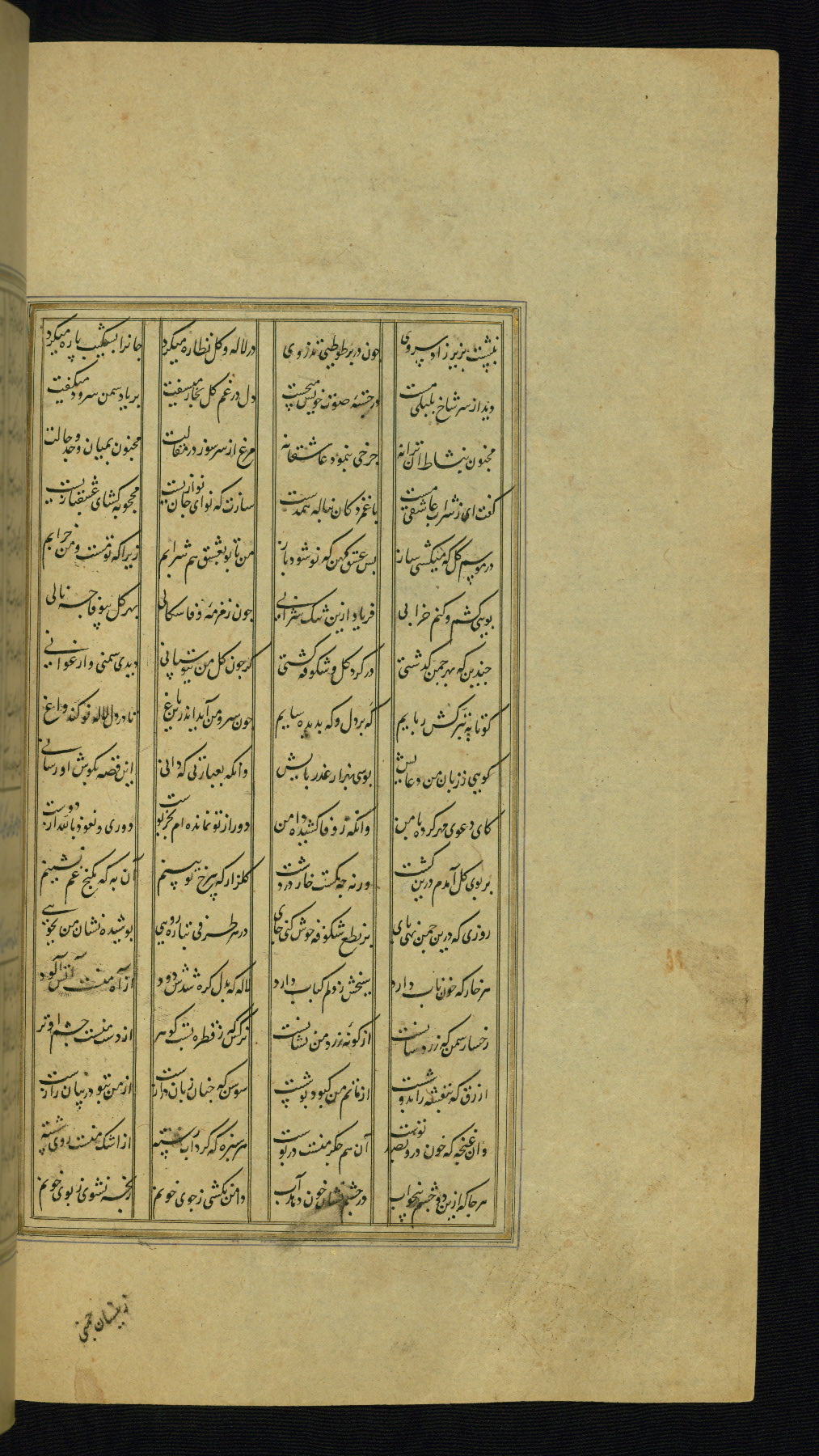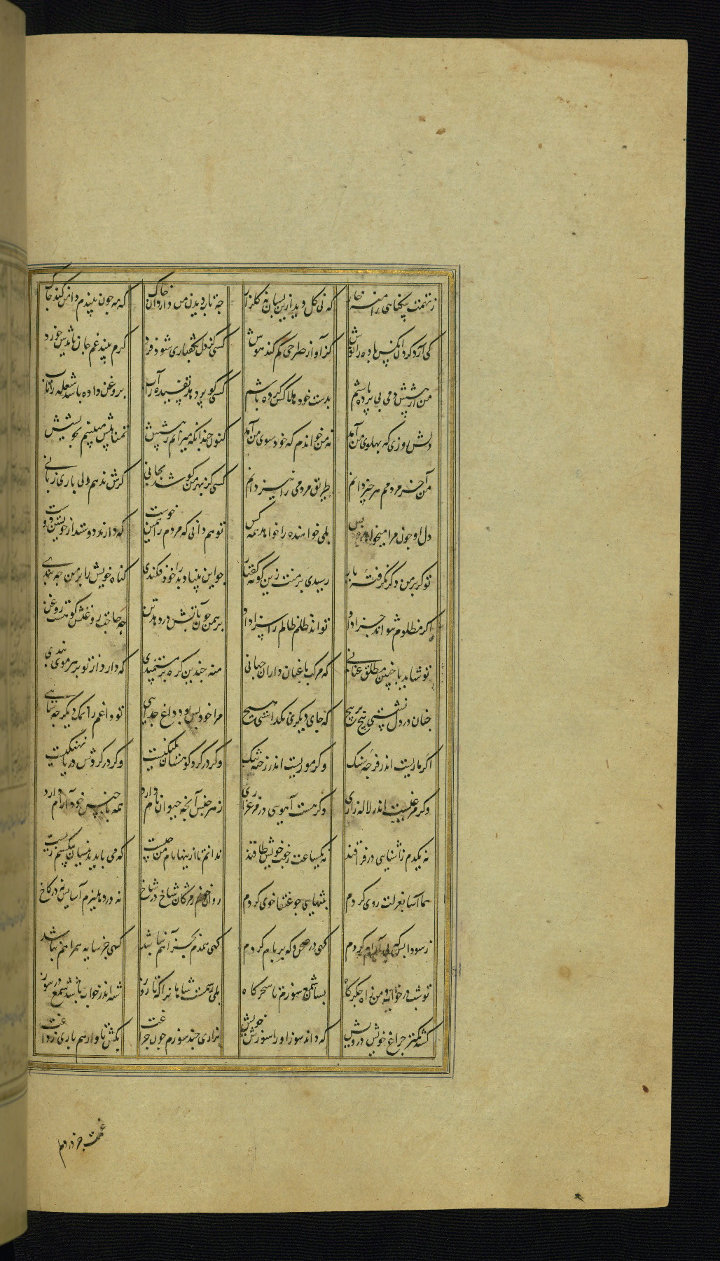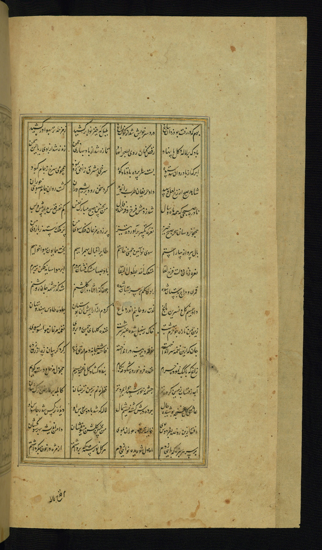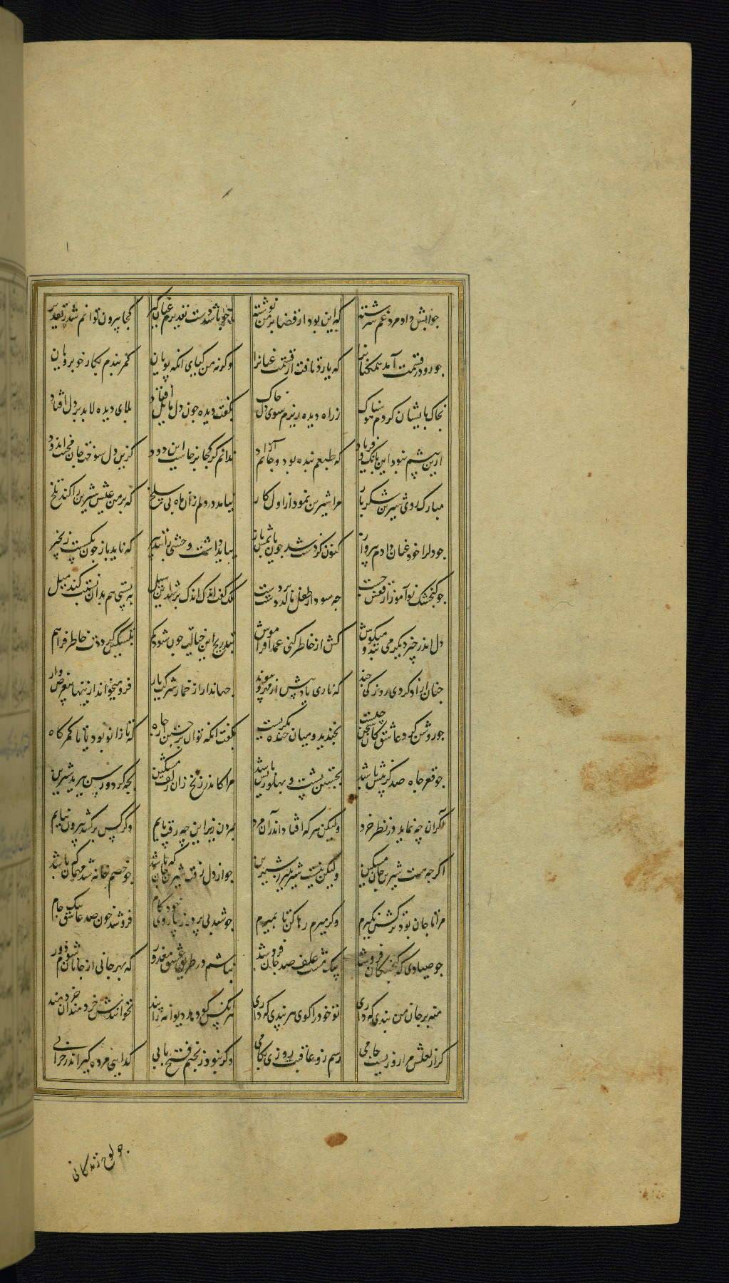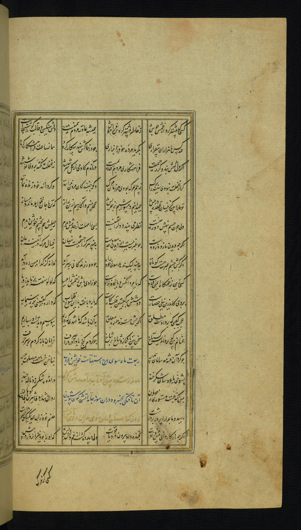 This is an illustrated and illuminated Safavid copy of the Khamsah (quintet) of Amīr Khusraw Dihlavī (d. 725 AH / 1325 CE), written by Pīr Ḥusayn al-Kātib al-Shīrāzī in 935 AH / 1529 CE. The codex opens with a double-page illuminated frontispiece with verses in honor of the poet Mir (Amir) Khusraw (fols. 1b-2a). There are four illuminated incipit pages introducing the individual poems, and thirteen paintings illustrate the text. The lacquer binding, which is not original to the manuscript, has a hunting scene on the upper and lower boards. The lower board is inscribed yā Shāh Najaf (oh, King of Najaf, i.e. ʿAlī) and is dated 1271 AH / 1854 CE.
