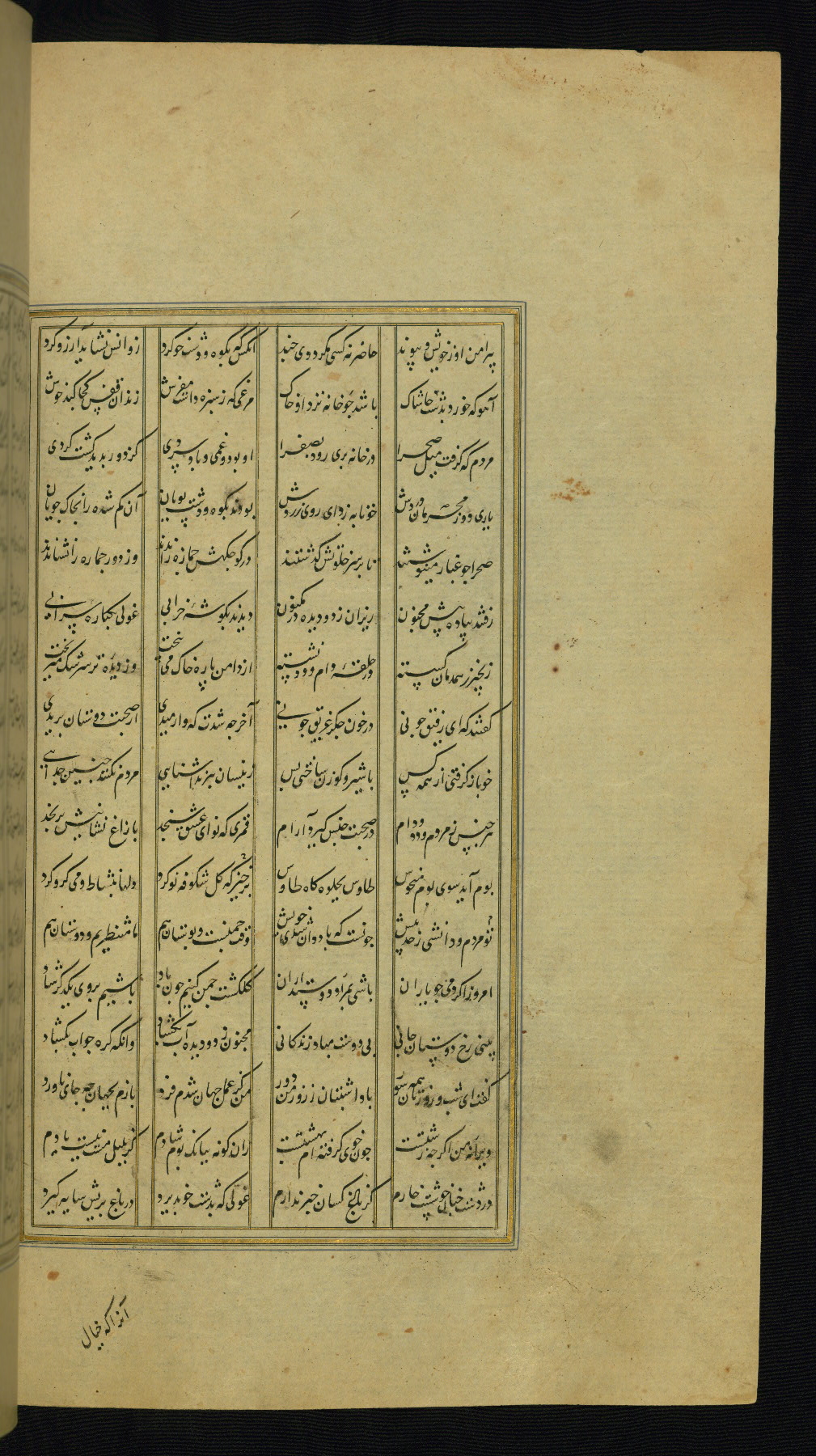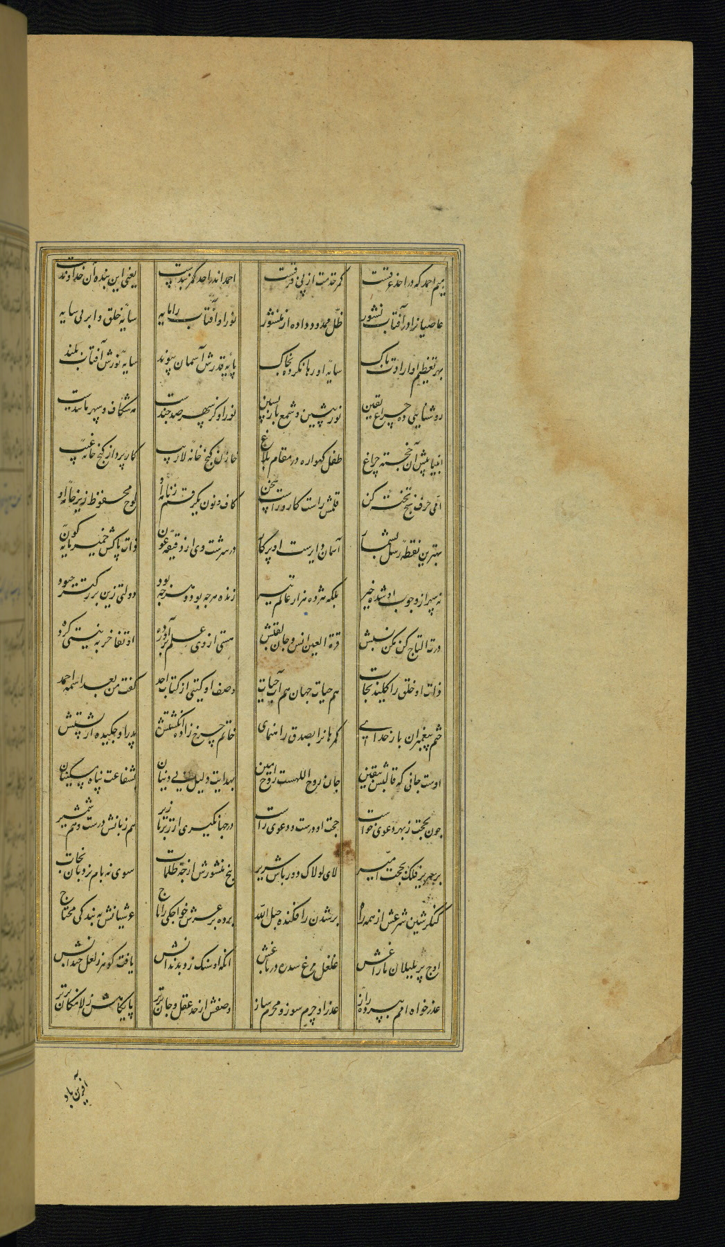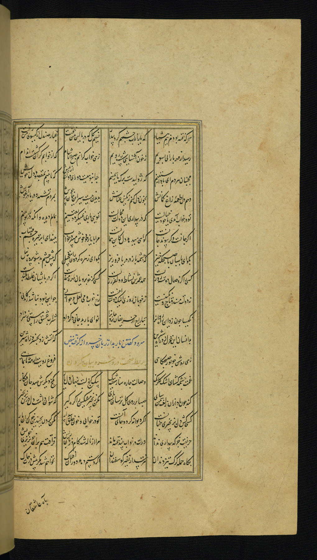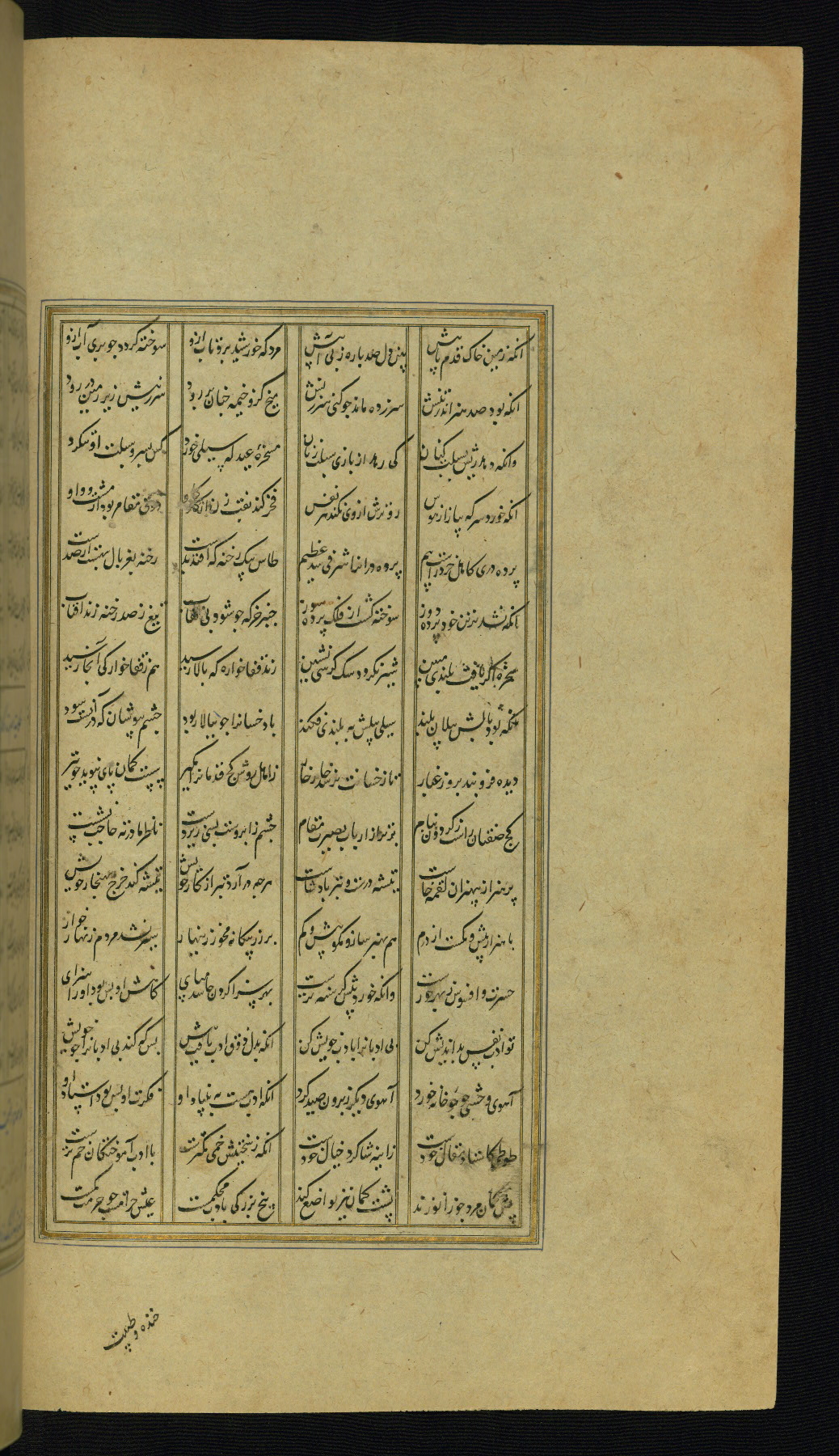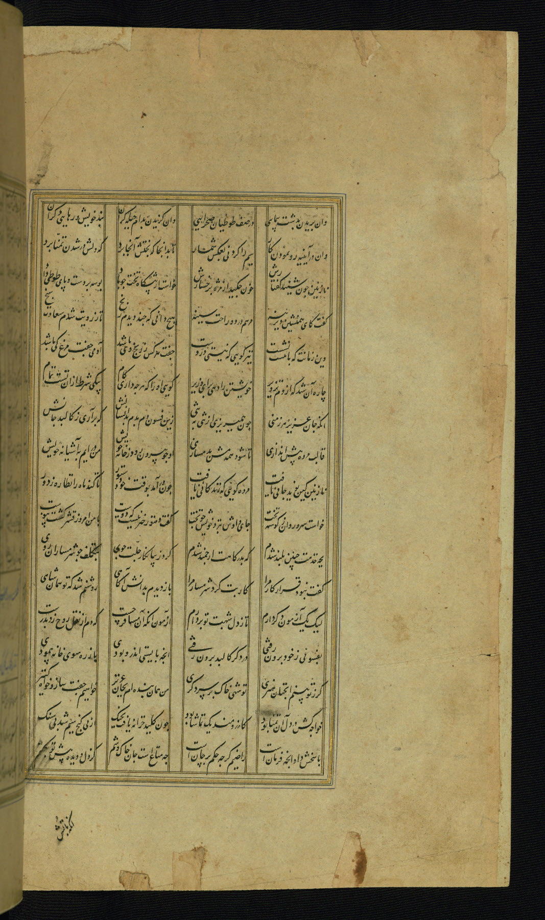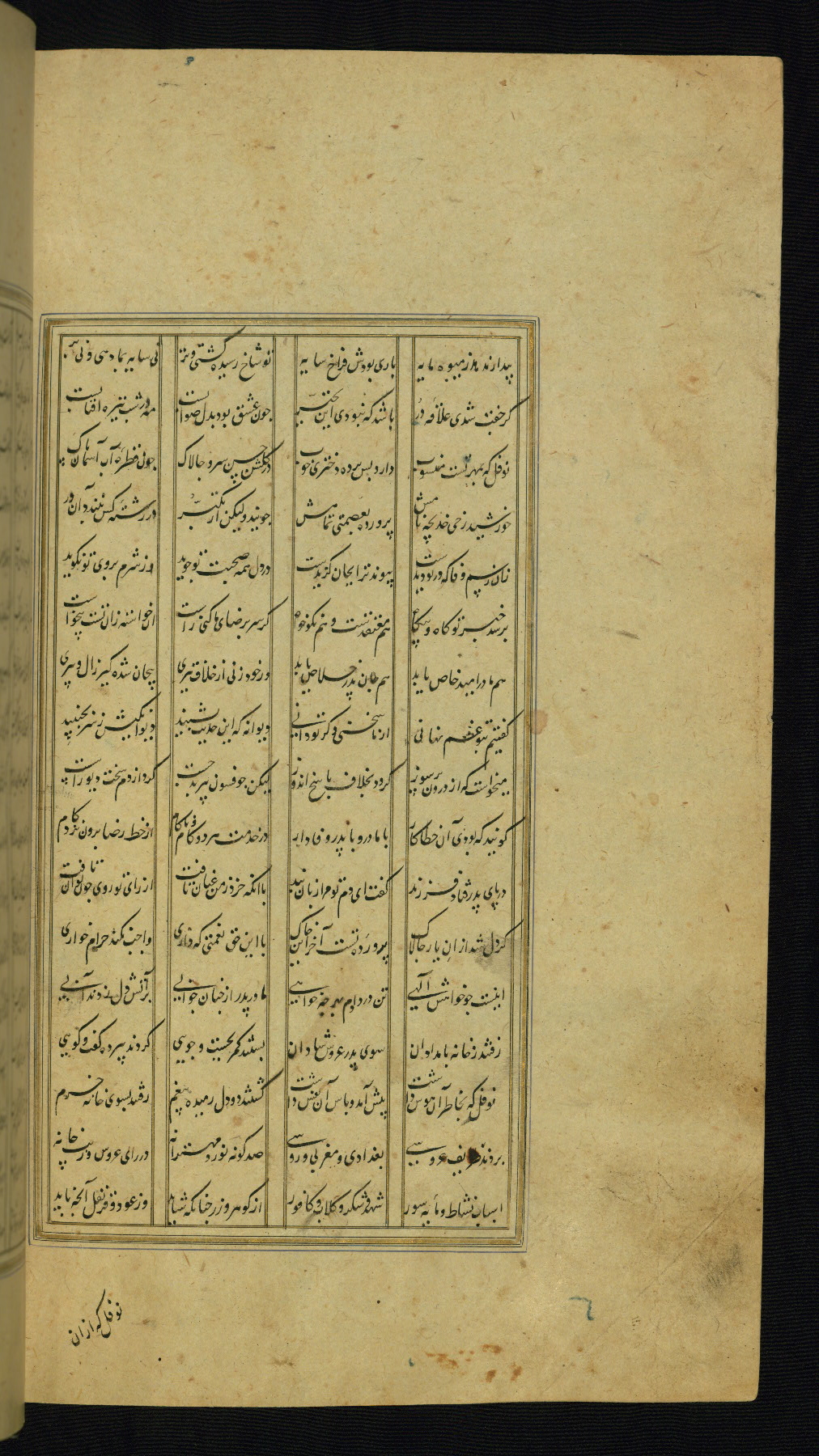 This is an illustrated and illuminated Safavid copy of the Khamsah (quintet) of Amīr Khusraw Dihlavī (d. 725 AH / 1325 CE), written by Pīr Ḥusayn al-Kātib al-Shīrāzī in 935 AH / 1529 CE. The codex opens with a double-page illuminated frontispiece with verses in honor of the poet Mir (Amir) Khusraw (fols. 1b-2a). There are four illuminated incipit pages introducing the individual poems, and thirteen paintings illustrate the text. The lacquer binding, which is not original to the manuscript, has a hunting scene on the upper and lower boards. The lower board is inscribed yā Shāh Najaf (oh, King of Najaf, i.e. ʿAlī) and is dated 1271 AH / 1854 CE.