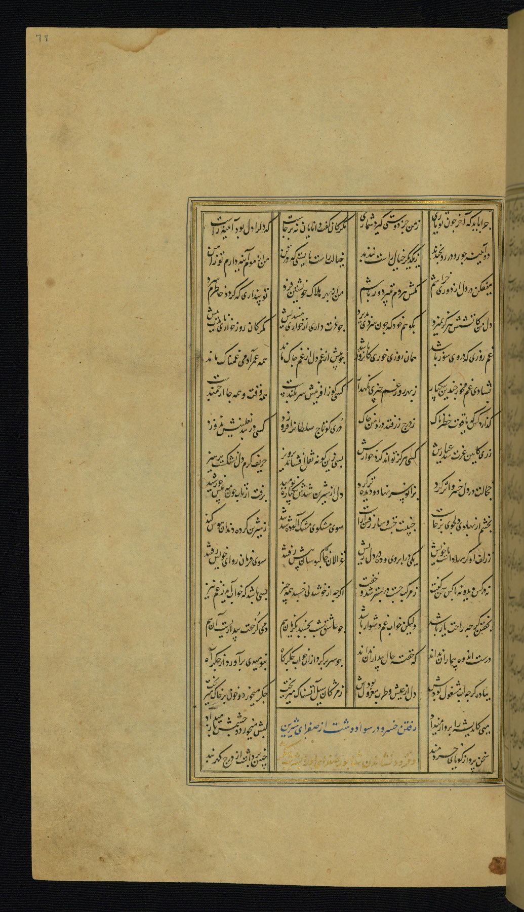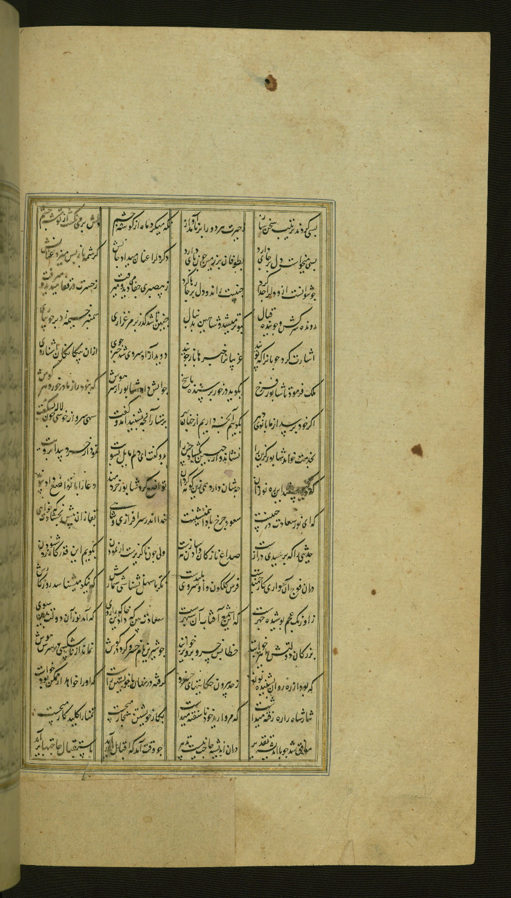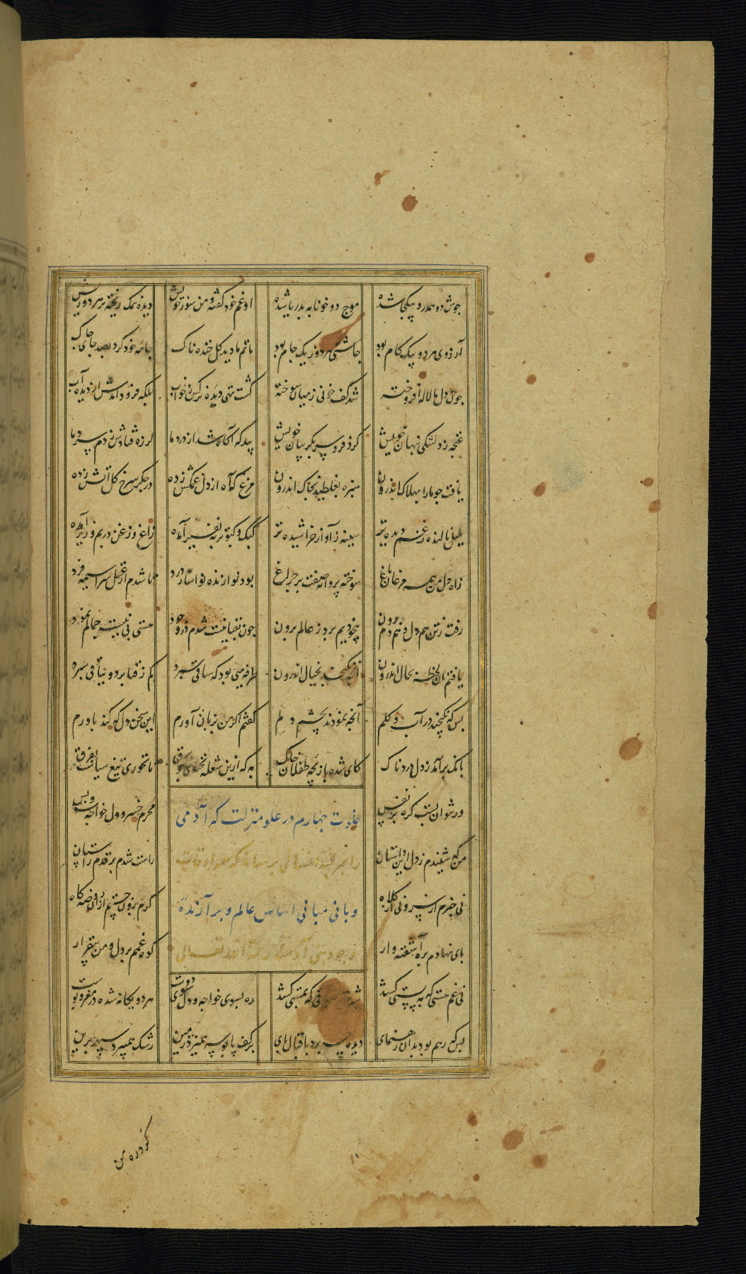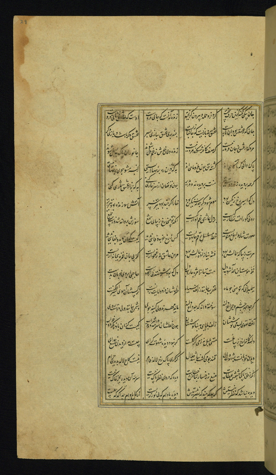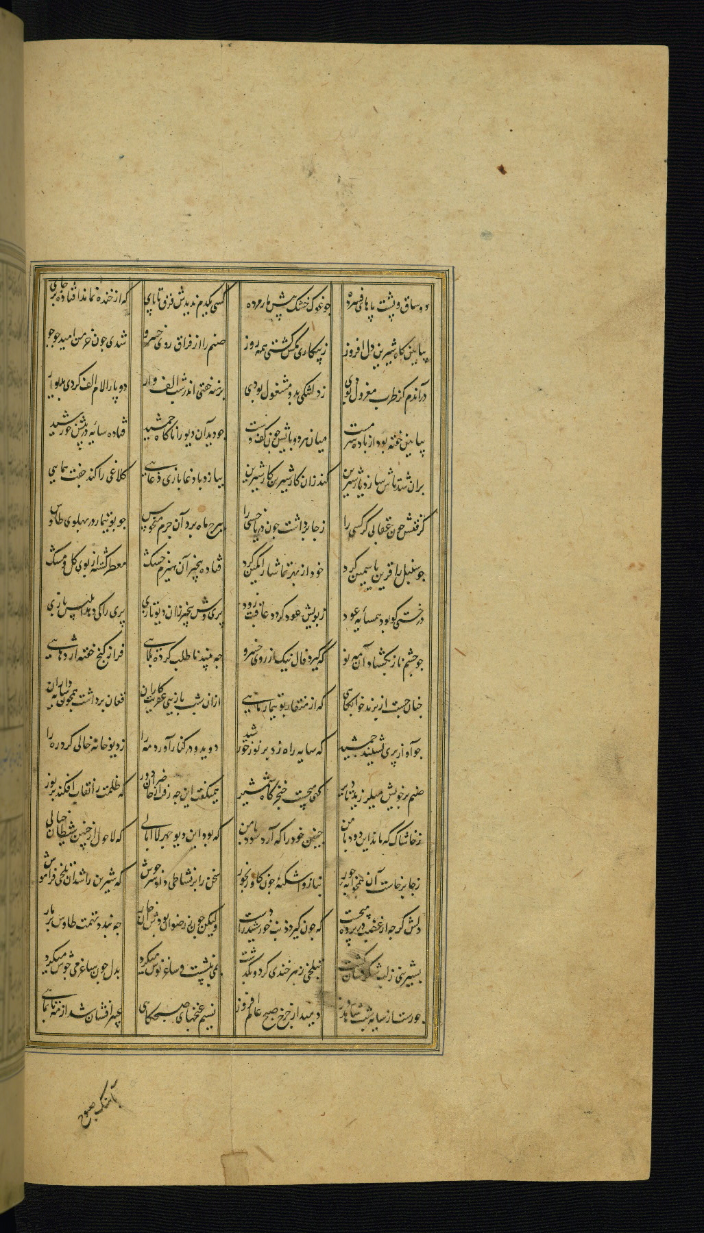 This is an illustrated and illuminated Safavid copy of the Khamsah (quintet) of Amīr Khusraw Dihlavī (d. 725 AH / 1325 CE), written by Pīr Ḥusayn al-Kātib al-Shīrāzī in 935 AH / 1529 CE. The codex opens with a double-page illuminated frontispiece with verses in honor of the poet Mir (Amir) Khusraw (fols. 1b-2a). There are four illuminated incipit pages introducing the individual poems, and thirteen paintings illustrate the text. The lacquer binding, which is not original to the manuscript, has a hunting scene on the upper and lower boards. The lower board is inscribed yā Shāh Najaf (oh, King of Najaf, i.e. ʿAlī) and is dated 1271 AH / 1854 CE.