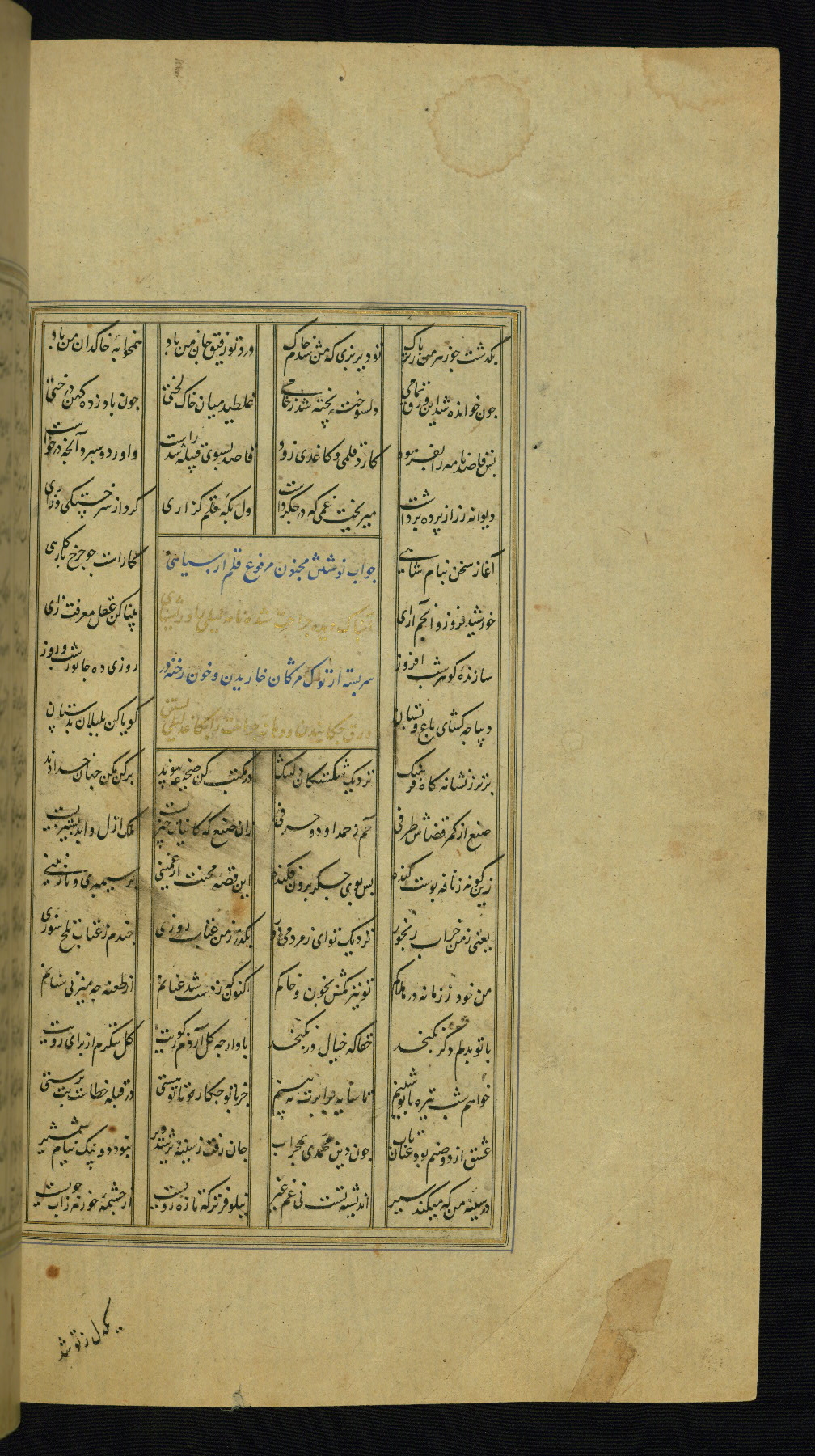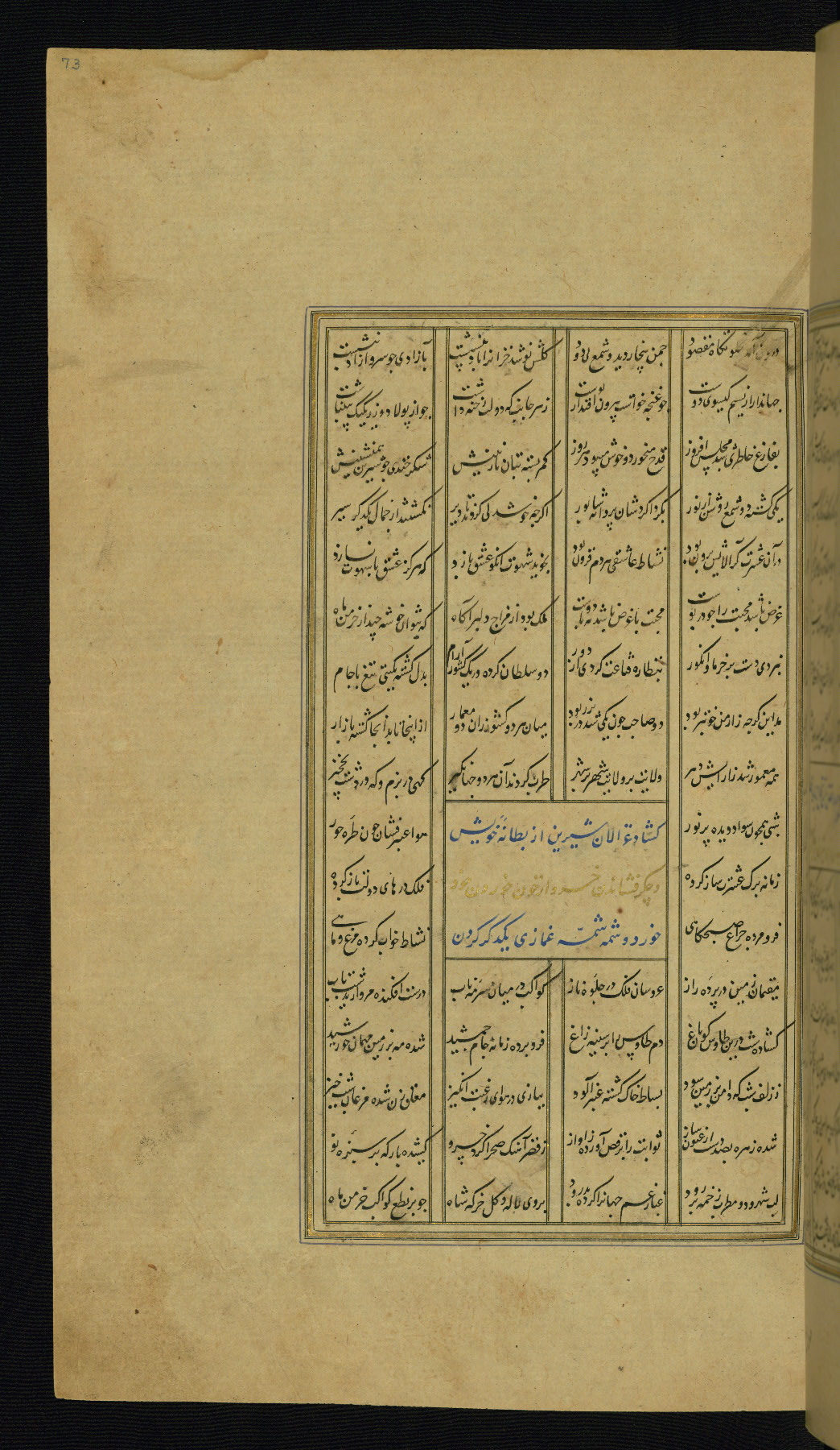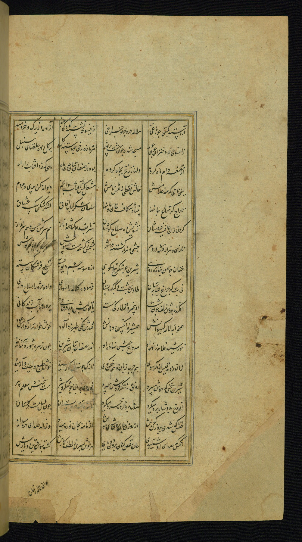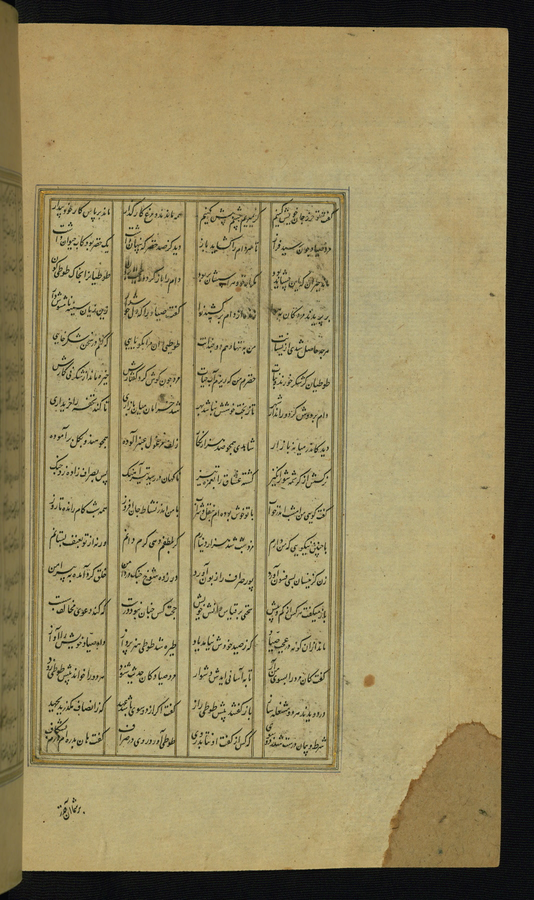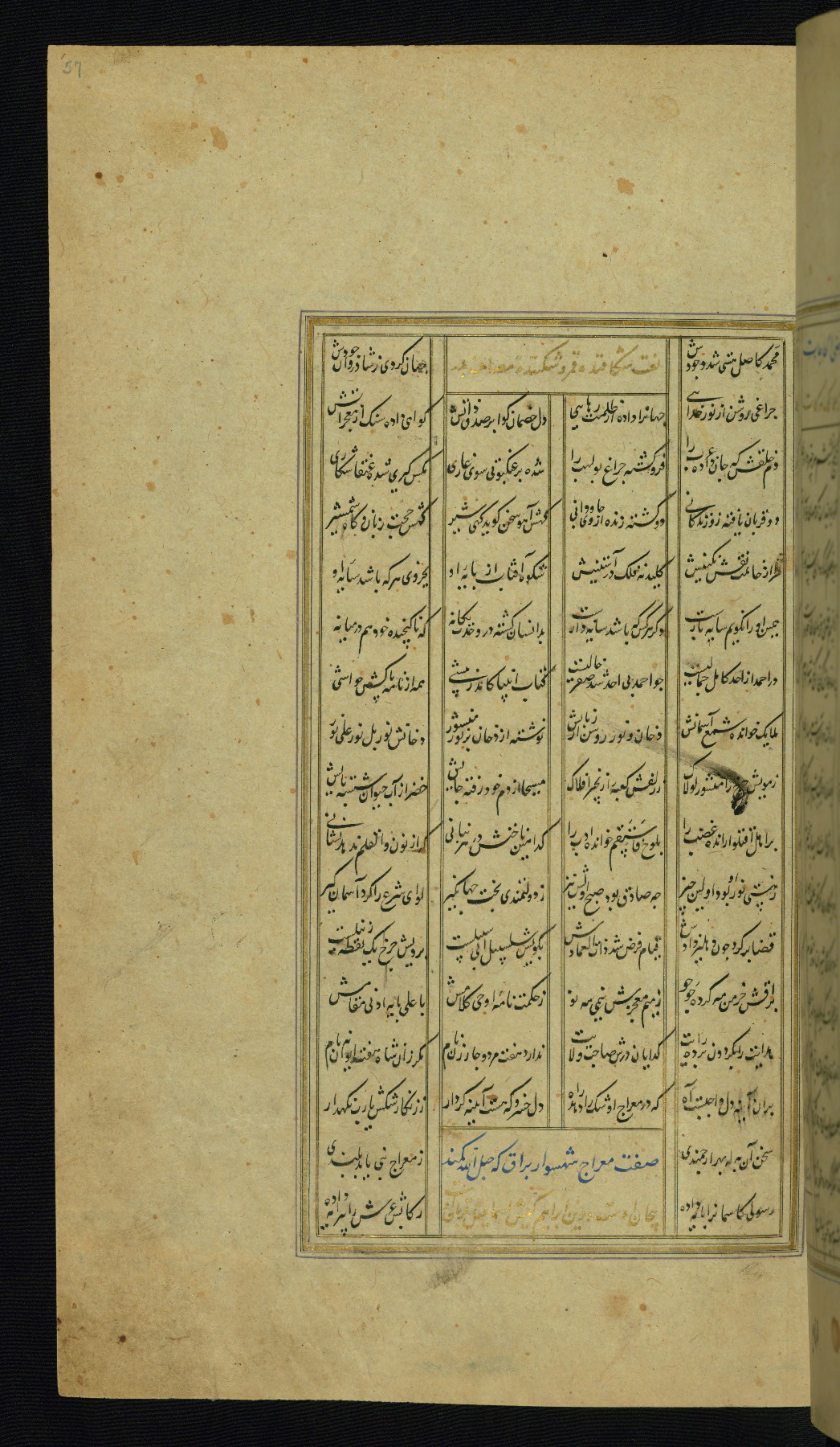 This is an illustrated and illuminated Safavid copy of the Khamsah (quintet) of Amīr Khusraw Dihlavī (d. 725 AH / 1325 CE), written by Pīr Ḥusayn al-Kātib al-Shīrāzī in 935 AH / 1529 CE. The codex opens with a double-page illuminated frontispiece with verses in honor of the poet Mir (Amir) Khusraw (fols. 1b-2a). There are four illuminated incipit pages introducing the individual poems, and thirteen paintings illustrate the text. The lacquer binding, which is not original to the manuscript, has a hunting scene on the upper and lower boards. The lower board is inscribed yā Shāh Najaf (oh, King of Najaf, i.e. ʿAlī) and is dated 1271 AH / 1854 CE.