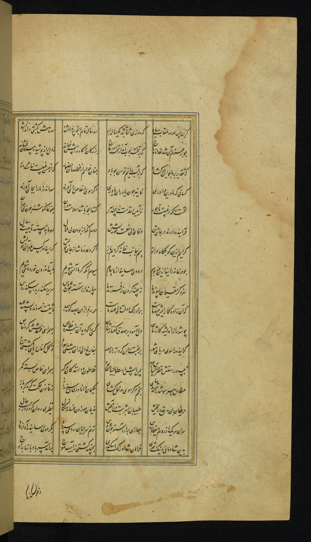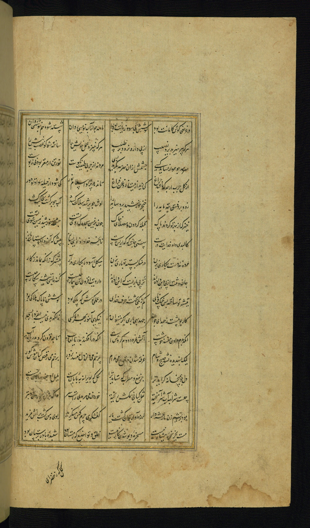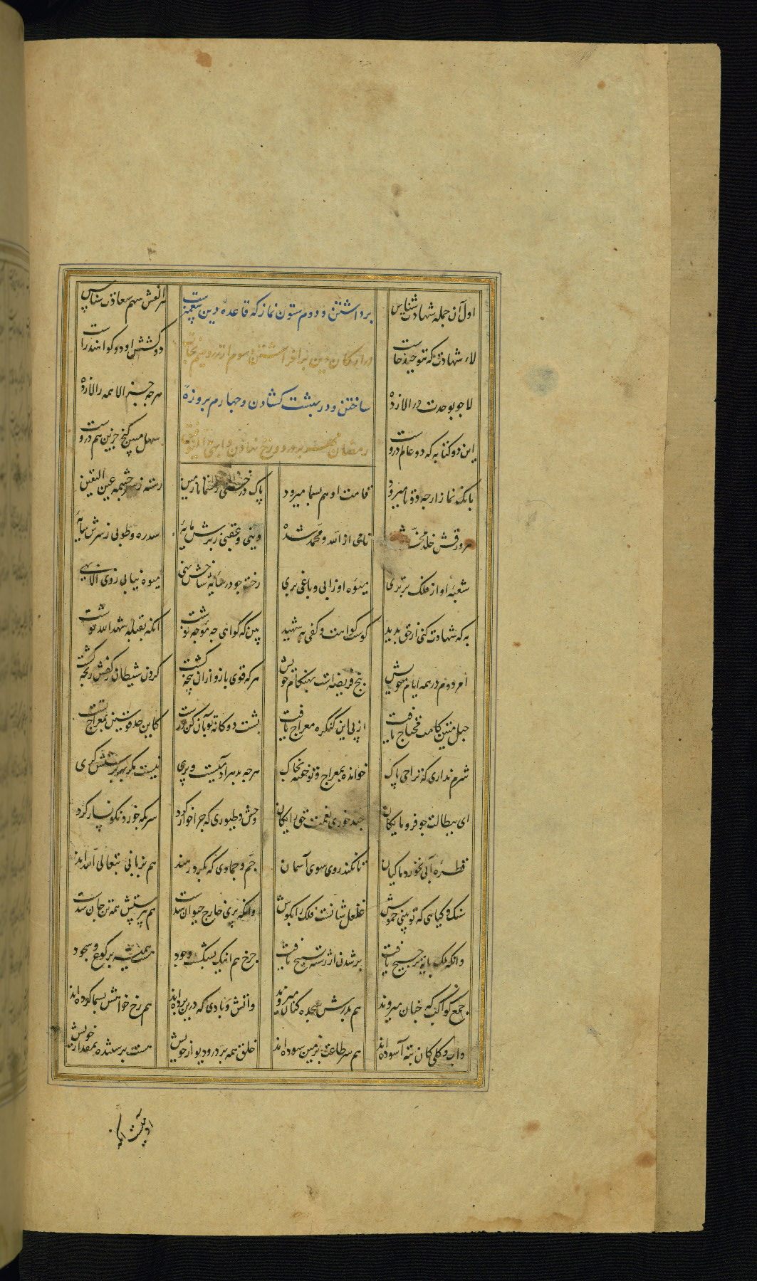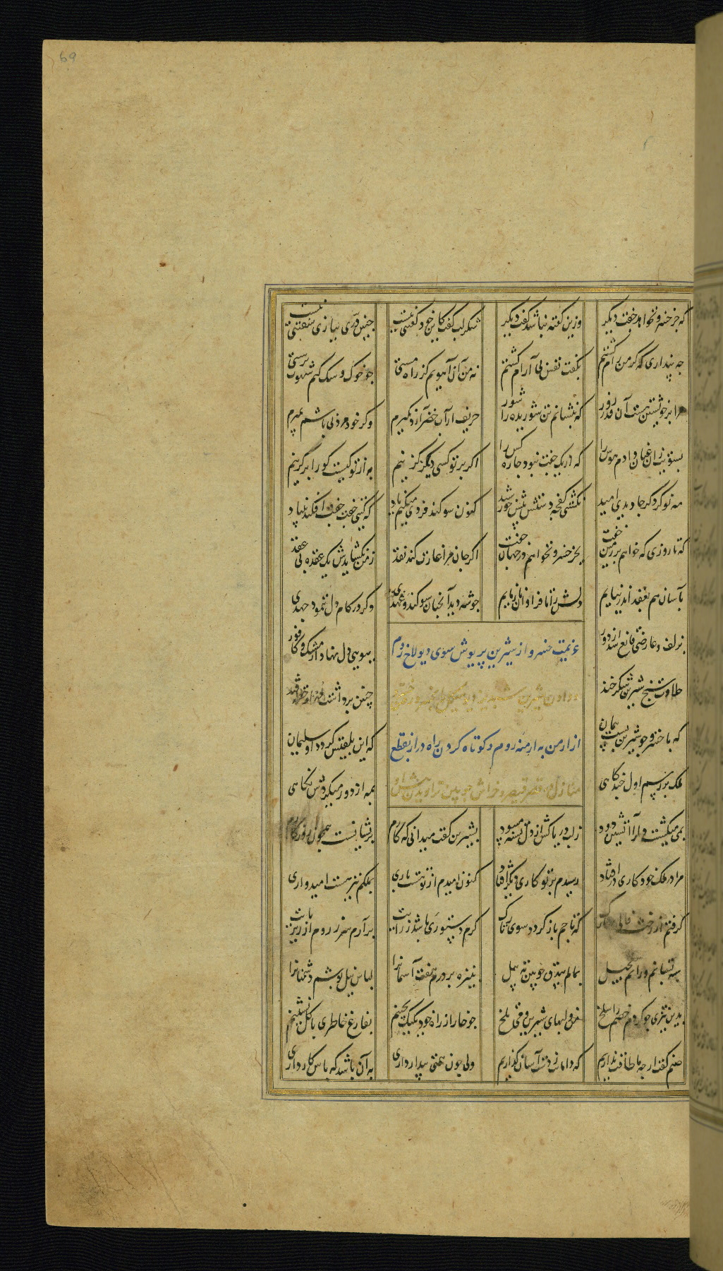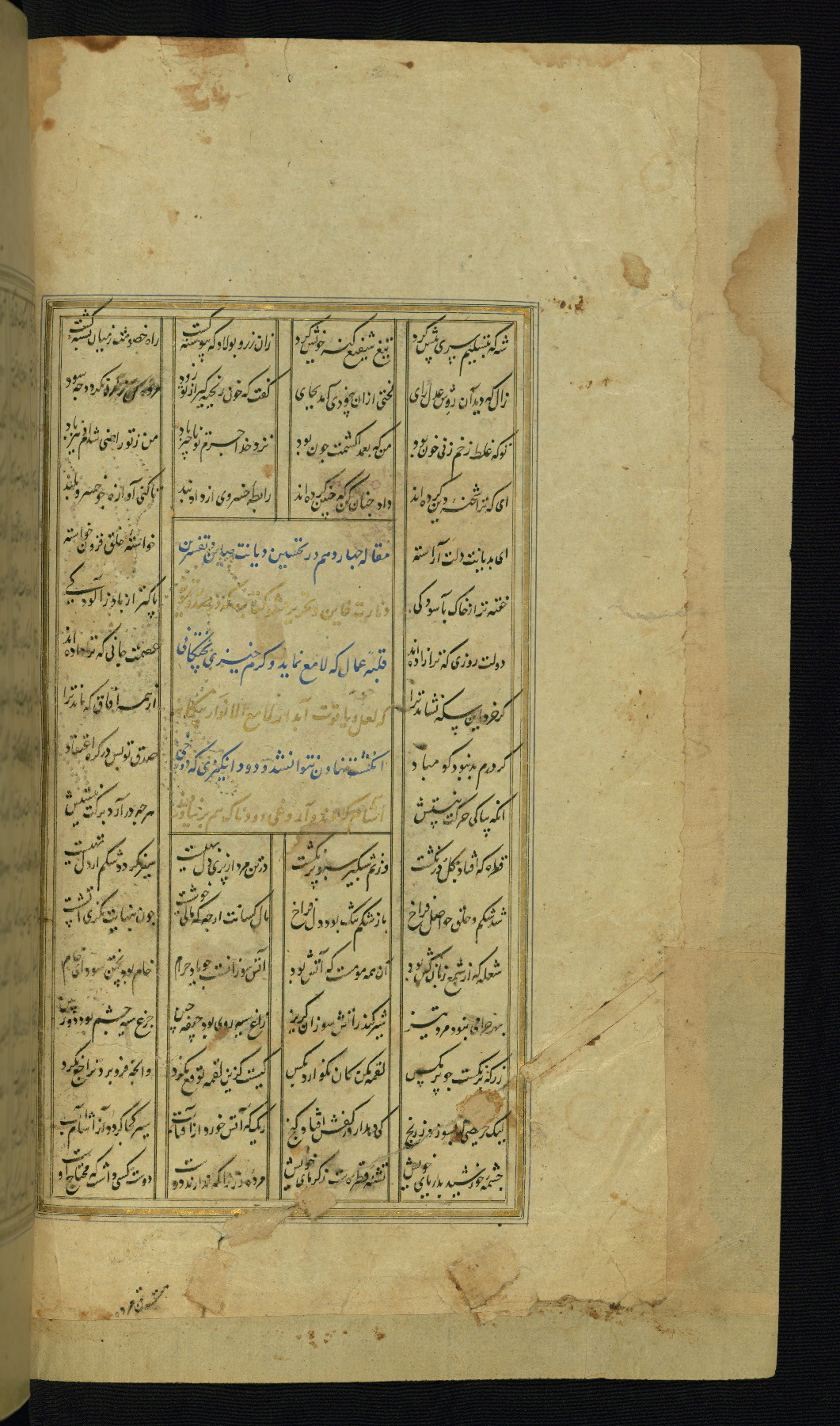 This is an illustrated and illuminated Safavid copy of the Khamsah (quintet) of Amīr Khusraw Dihlavī (d. 725 AH / 1325 CE), written by Pīr Ḥusayn al-Kātib al-Shīrāzī in 935 AH / 1529 CE. The codex opens with a double-page illuminated frontispiece with verses in honor of the poet Mir (Amir) Khusraw (fols. 1b-2a). There are four illuminated incipit pages introducing the individual poems, and thirteen paintings illustrate the text. The lacquer binding, which is not original to the manuscript, has a hunting scene on the upper and lower boards. The lower board is inscribed yā Shāh Najaf (oh, King of Najaf, i.e. ʿAlī) and is dated 1271 AH / 1854 CE.