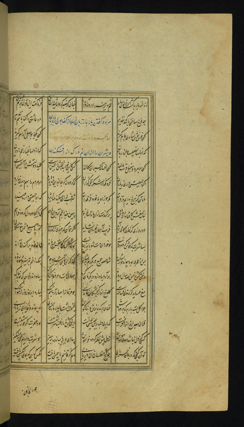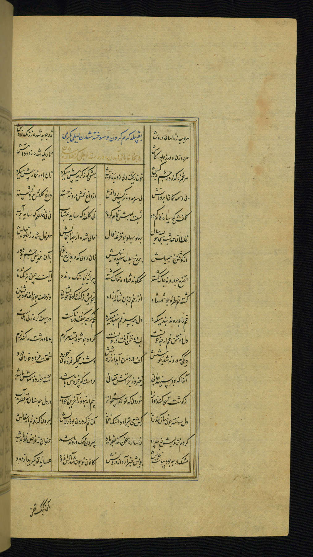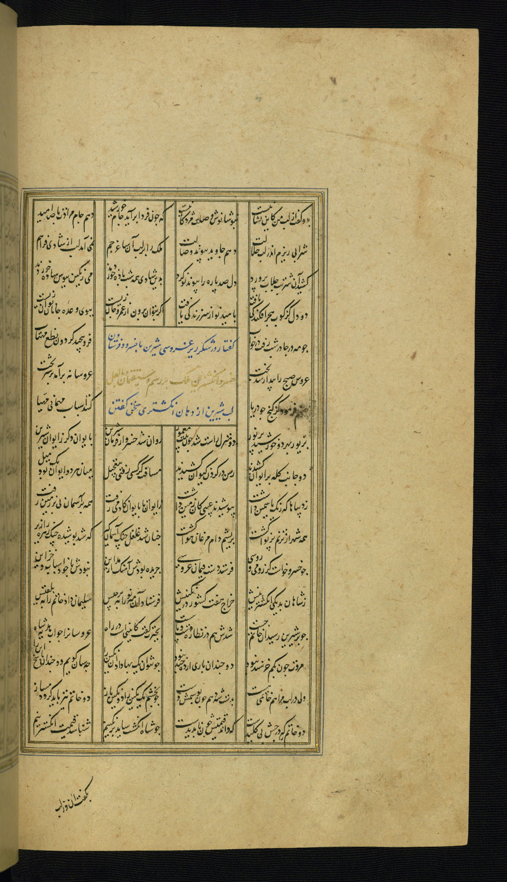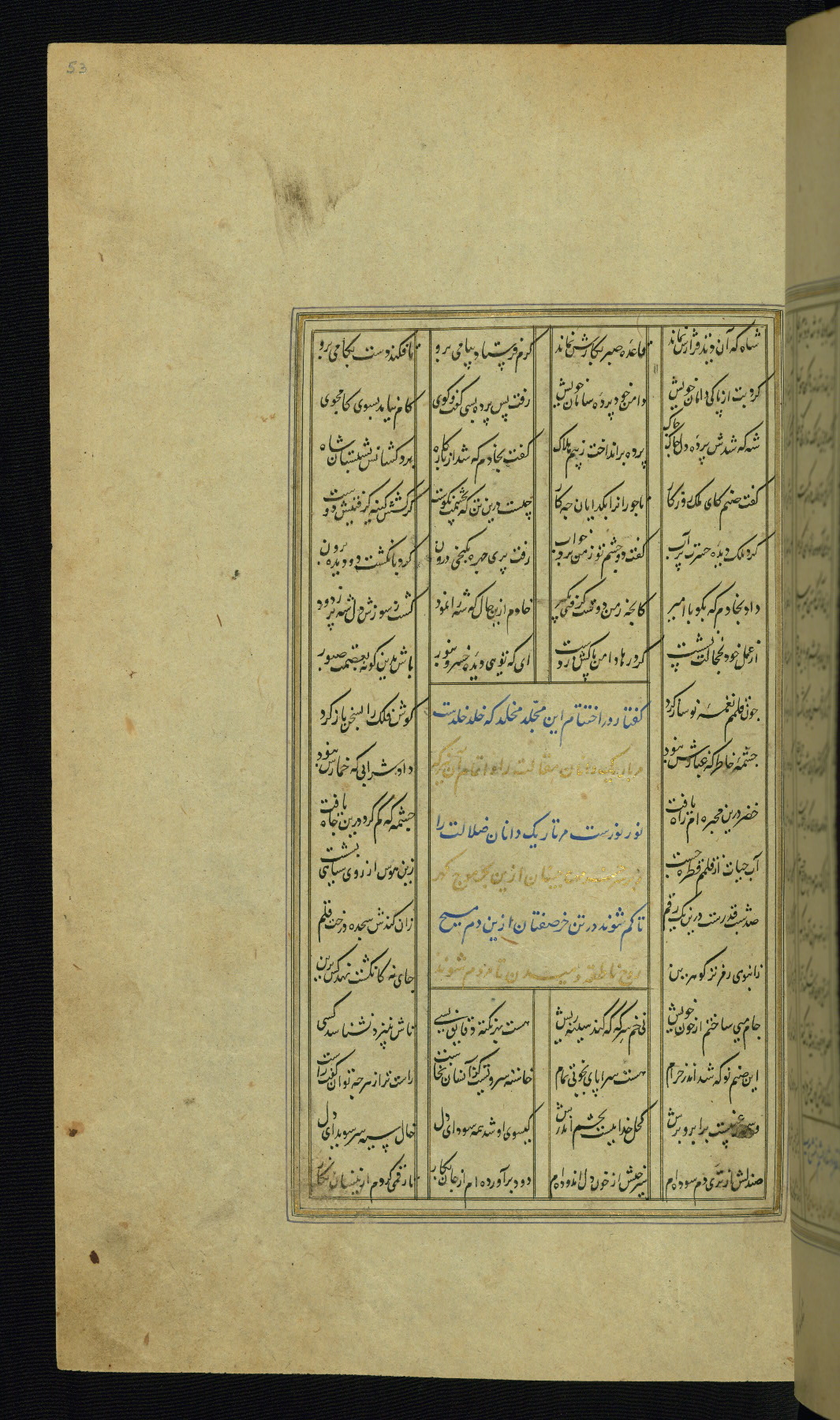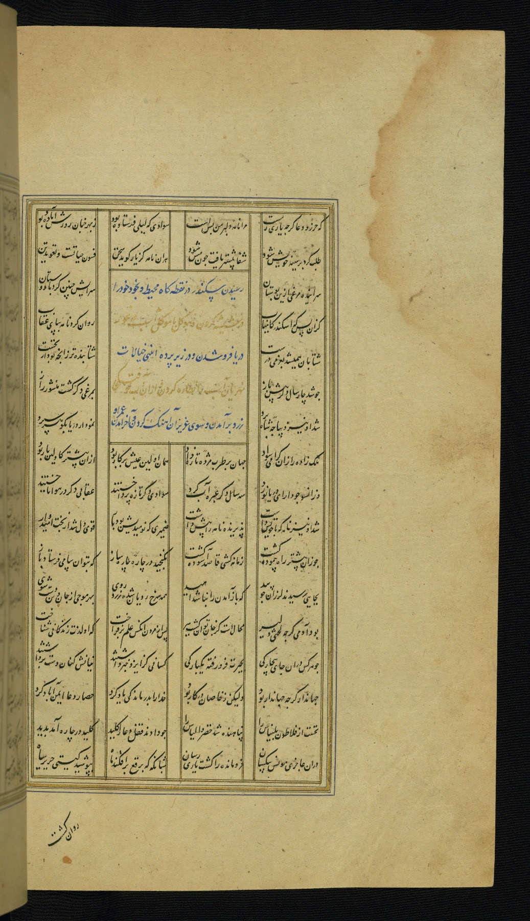 This is an illustrated and illuminated Safavid copy of the Khamsah (quintet) of Amīr Khusraw Dihlavī (d. 725 AH / 1325 CE), written by Pīr Ḥusayn al-Kātib al-Shīrāzī in 935 AH / 1529 CE. The codex opens with a double-page illuminated frontispiece with verses in honor of the poet Mir (Amir) Khusraw (fols. 1b-2a). There are four illuminated incipit pages introducing the individual poems, and thirteen paintings illustrate the text. The lacquer binding, which is not original to the manuscript, has a hunting scene on the upper and lower boards. The lower board is inscribed yā Shāh Najaf (oh, King of Najaf, i.e. ʿAlī) and is dated 1271 AH / 1854 CE.