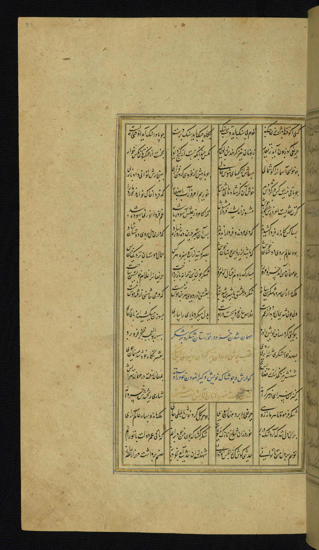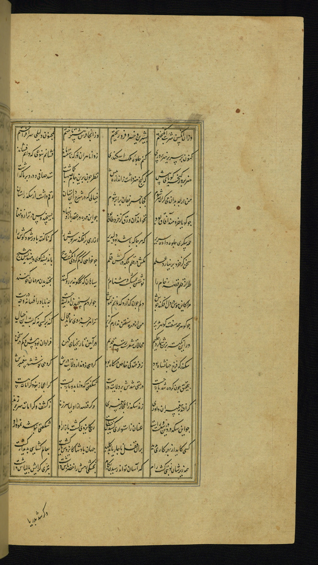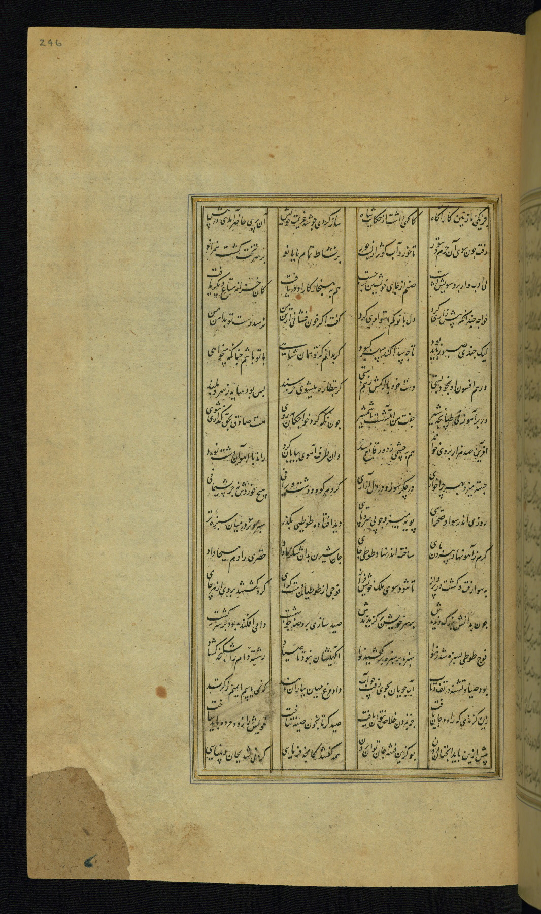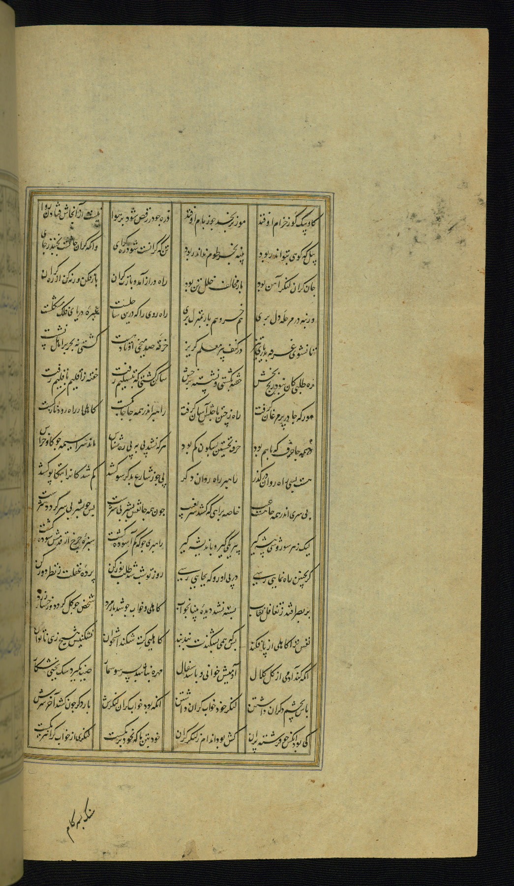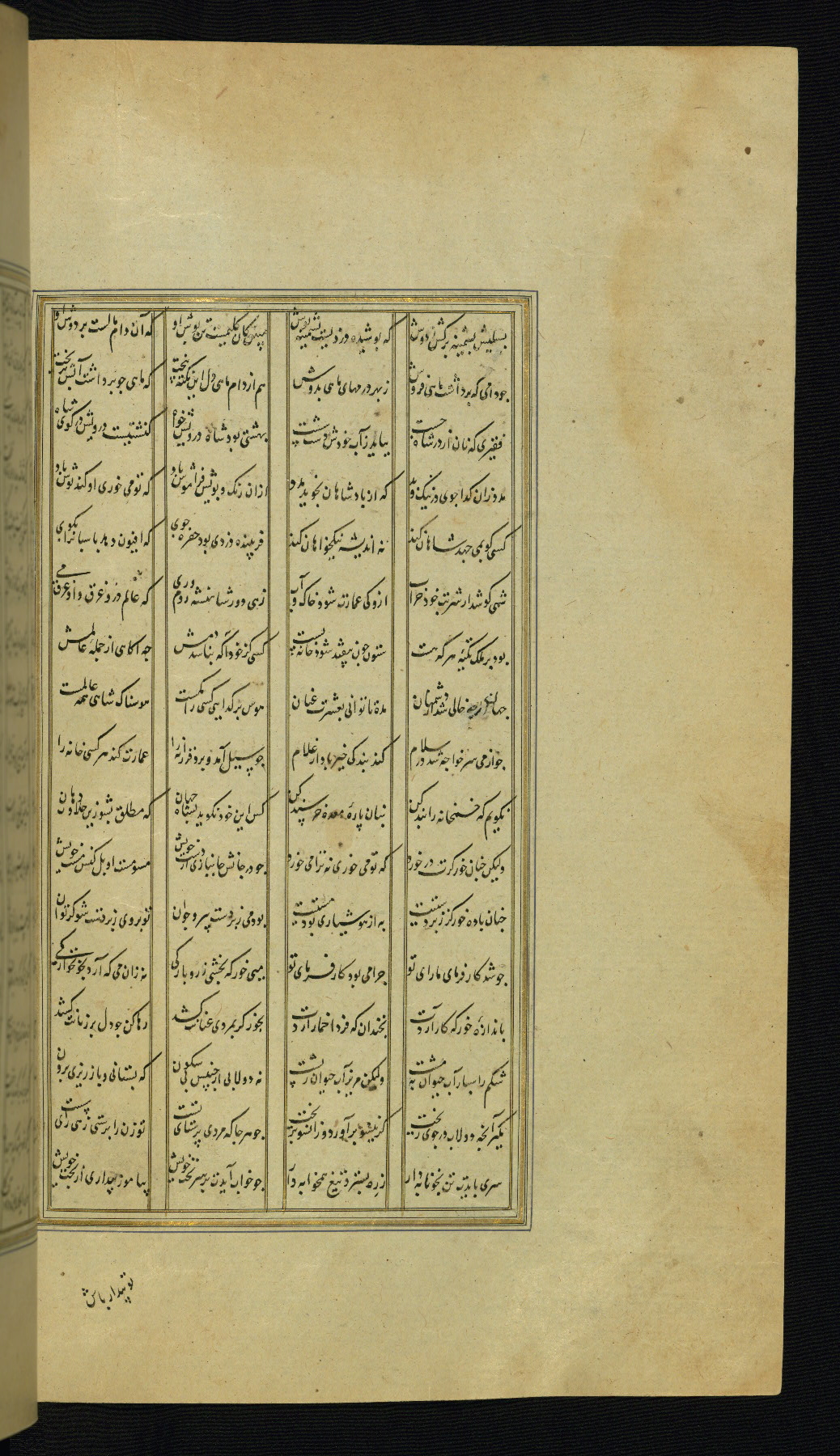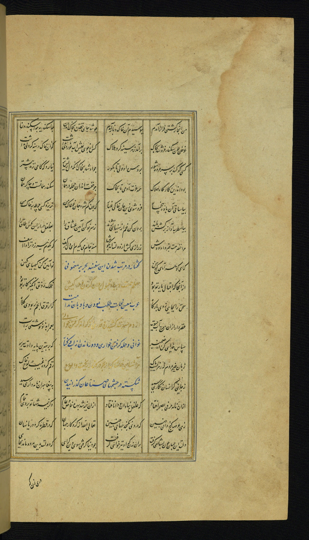 This is an illustrated and illuminated Safavid copy of the Khamsah (quintet) of Amīr Khusraw Dihlavī (d. 725 AH / 1325 CE), written by Pīr Ḥusayn al-Kātib al-Shīrāzī in 935 AH / 1529 CE. The codex opens with a double-page illuminated frontispiece with verses in honor of the poet Mir (Amir) Khusraw (fols. 1b-2a). There are four illuminated incipit pages introducing the individual poems, and thirteen paintings illustrate the text. The lacquer binding, which is not original to the manuscript, has a hunting scene on the upper and lower boards. The lower board is inscribed yā Shāh Najaf (oh, King of Najaf, i.e. ʿAlī) and is dated 1271 AH / 1854 CE.