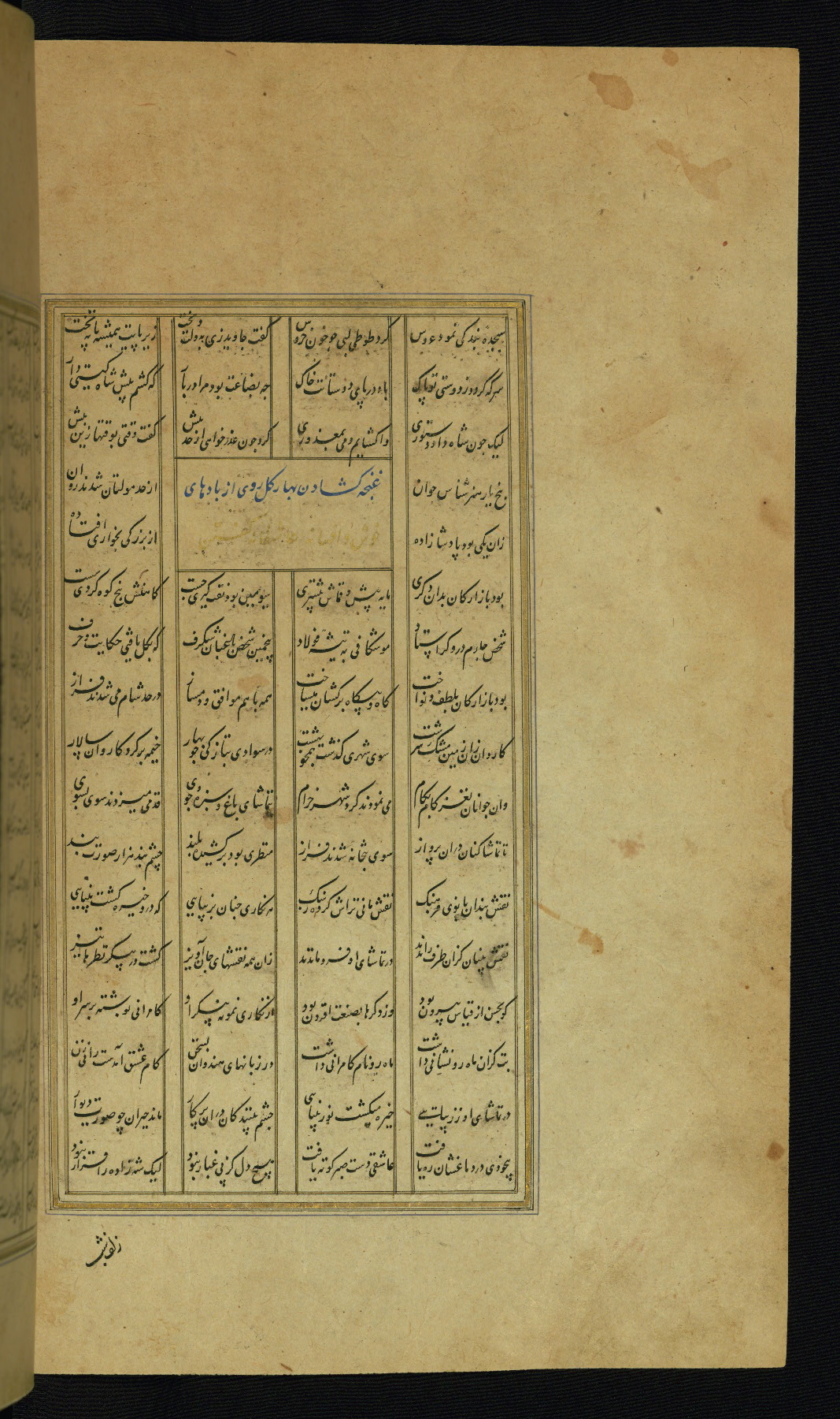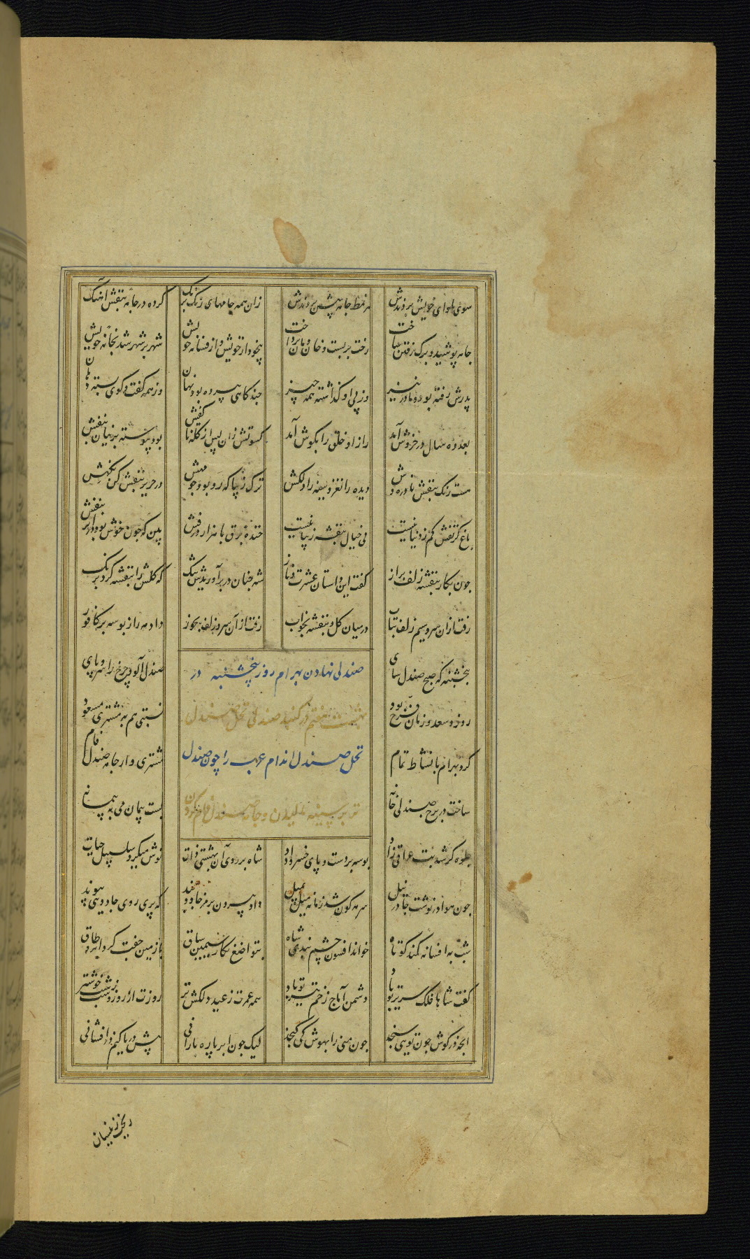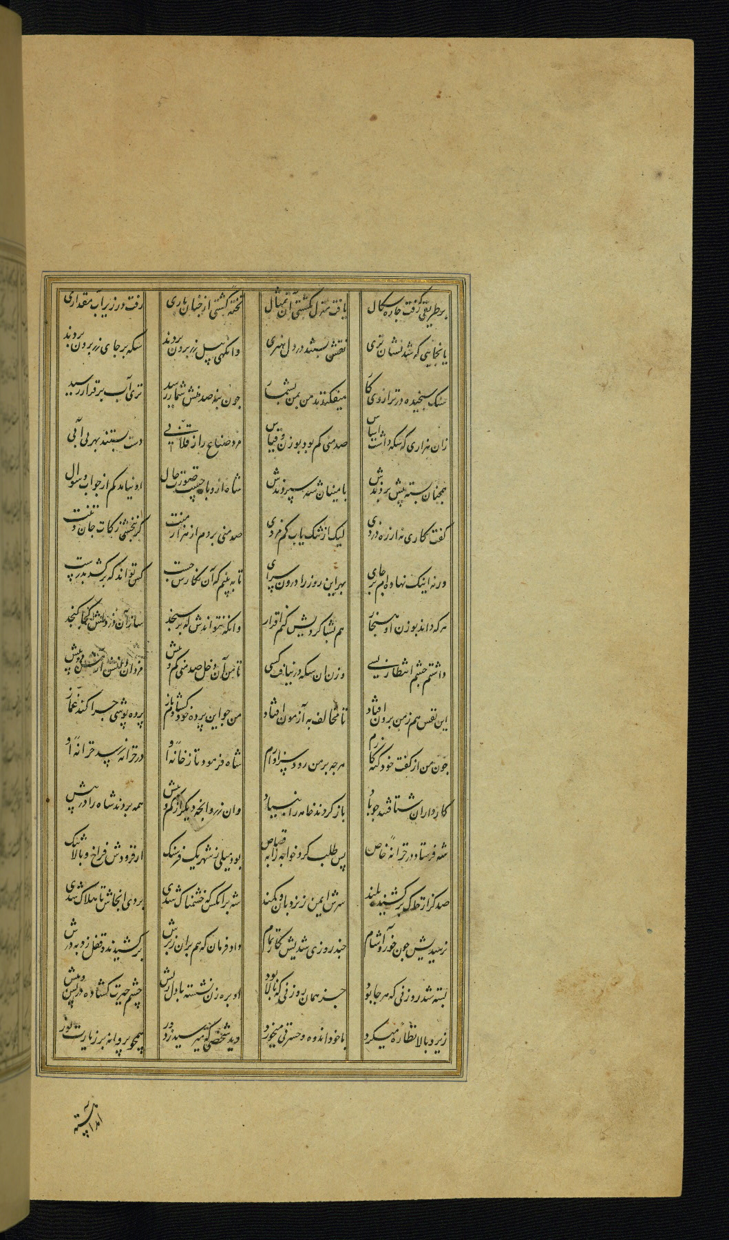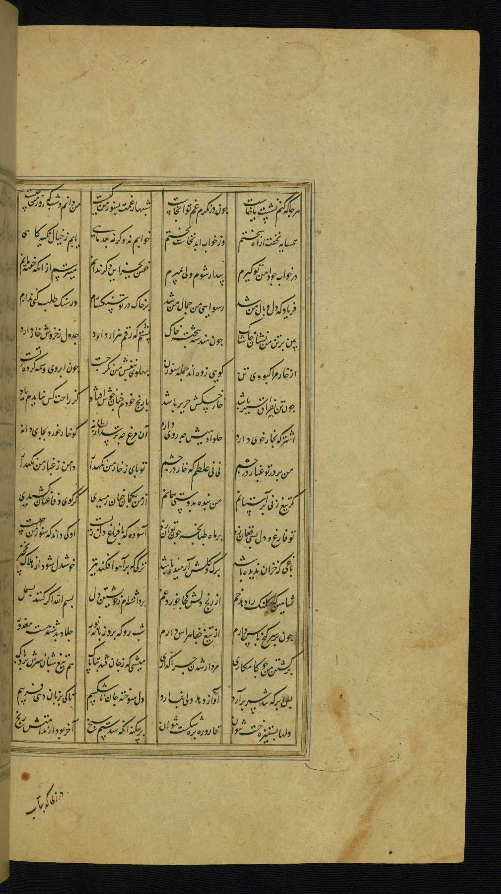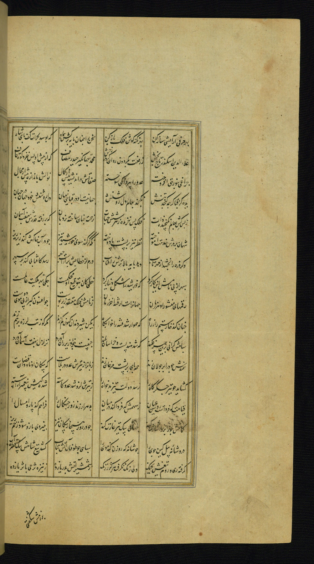 This is an illustrated and illuminated Safavid copy of the Khamsah (quintet) of Amīr Khusraw Dihlavī (d. 725 AH / 1325 CE), written by Pīr Ḥusayn al-Kātib al-Shīrāzī in 935 AH / 1529 CE. The codex opens with a double-page illuminated frontispiece with verses in honor of the poet Mir (Amir) Khusraw (fols. 1b-2a). There are four illuminated incipit pages introducing the individual poems, and thirteen paintings illustrate the text. The lacquer binding, which is not original to the manuscript, has a hunting scene on the upper and lower boards. The lower board is inscribed yā Shāh Najaf (oh, King of Najaf, i.e. ʿAlī) and is dated 1271 AH / 1854 CE.