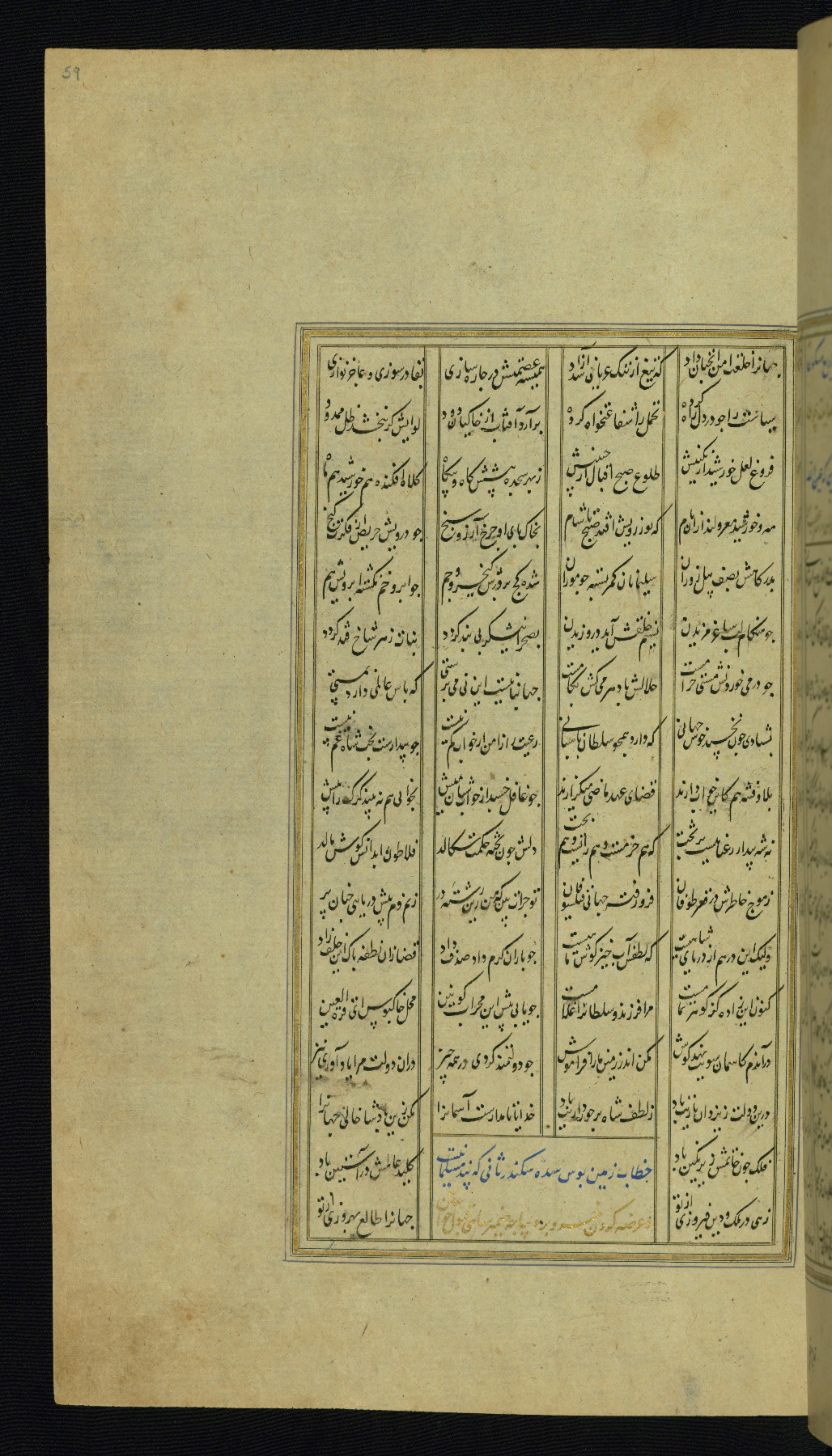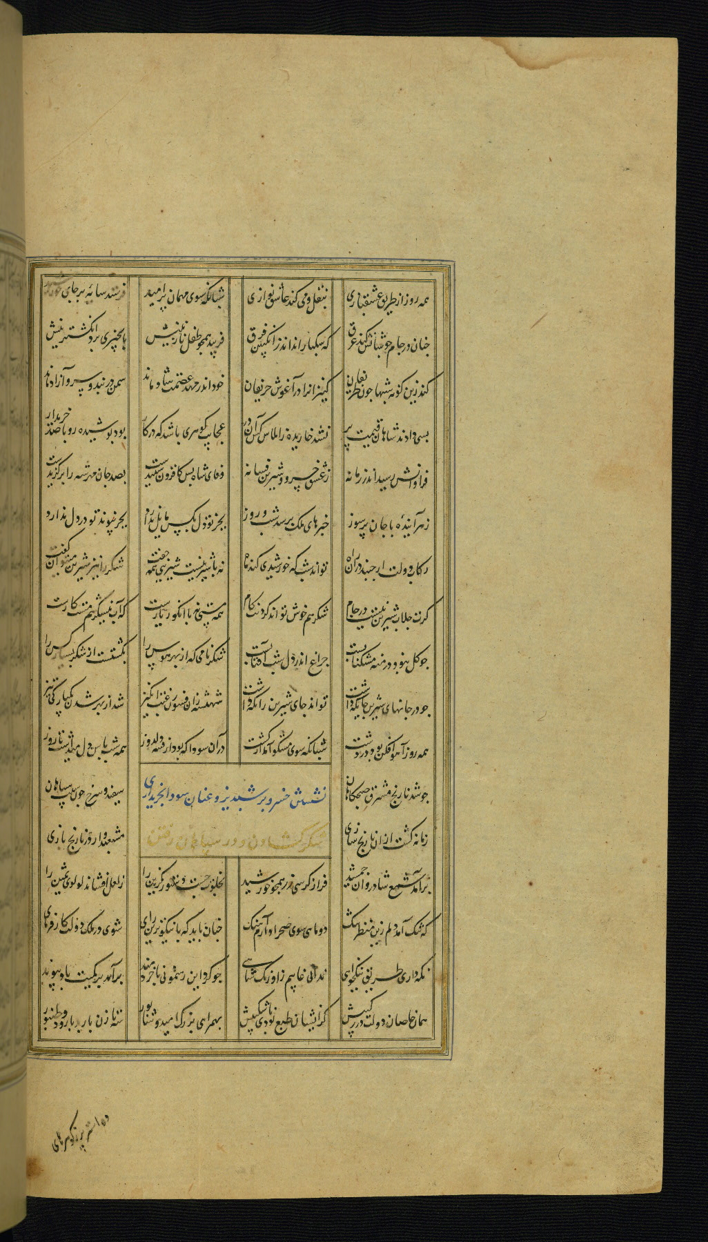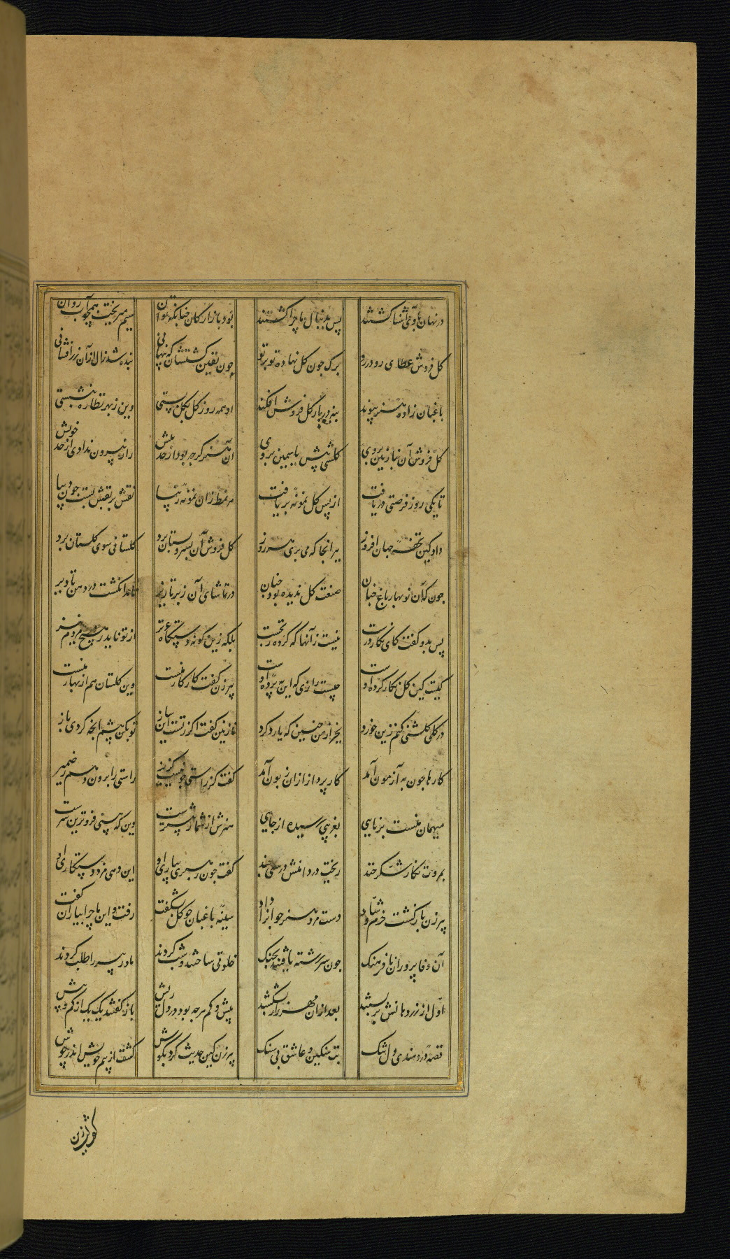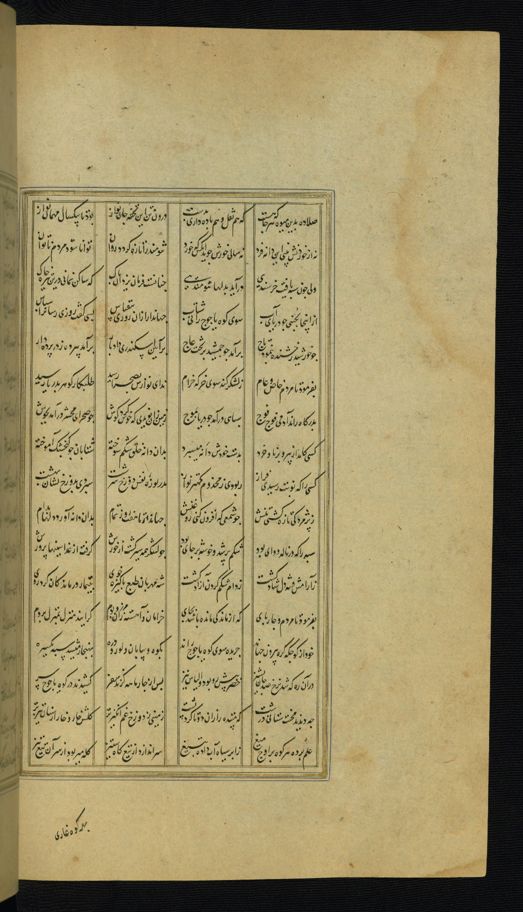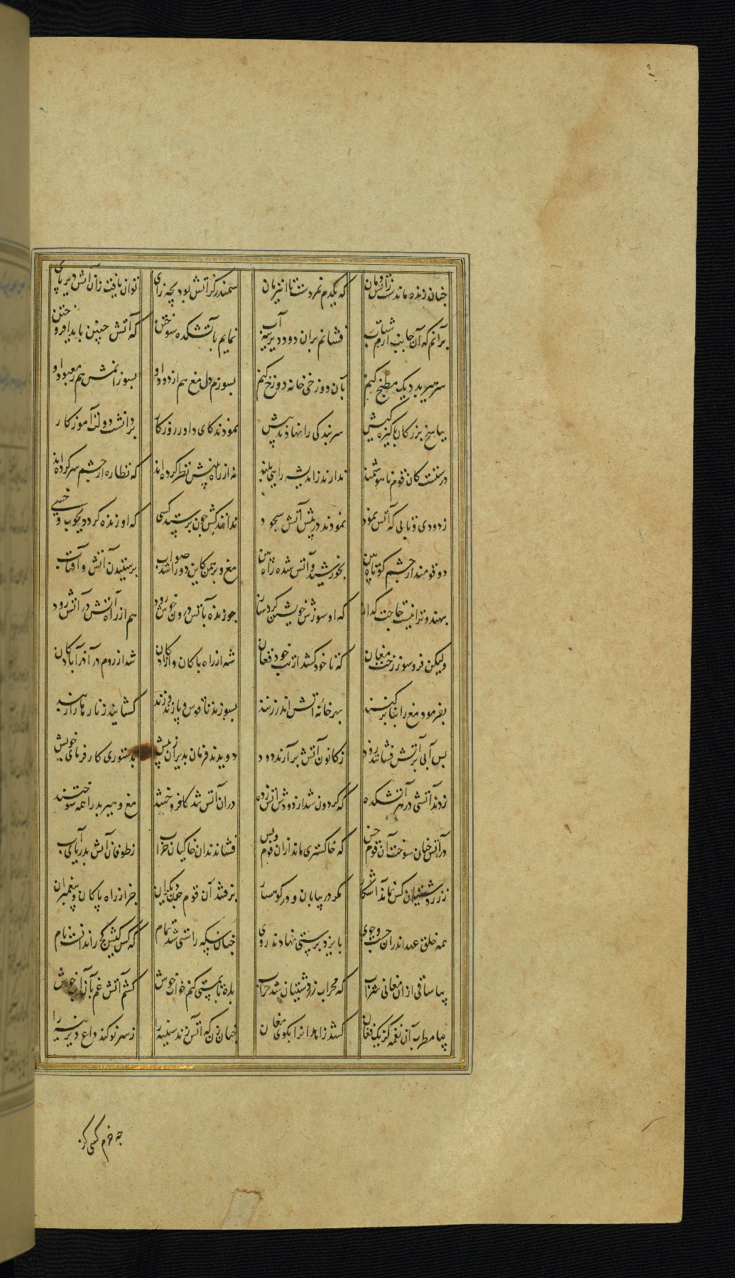 This is an illustrated and illuminated Safavid copy of the Khamsah (quintet) of Amīr Khusraw Dihlavī (d. 725 AH / 1325 CE), written by Pīr Ḥusayn al-Kātib al-Shīrāzī in 935 AH / 1529 CE. The codex opens with a double-page illuminated frontispiece with verses in honor of the poet Mir (Amir) Khusraw (fols. 1b-2a). There are four illuminated incipit pages introducing the individual poems, and thirteen paintings illustrate the text. The lacquer binding, which is not original to the manuscript, has a hunting scene on the upper and lower boards. The lower board is inscribed yā Shāh Najaf (oh, King of Najaf, i.e. ʿAlī) and is dated 1271 AH / 1854 CE.