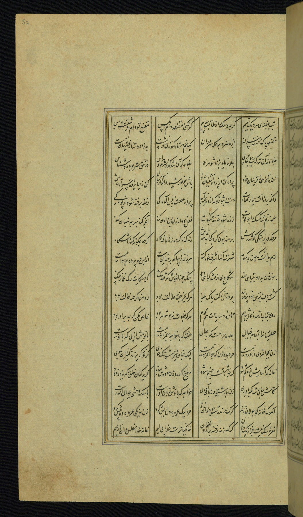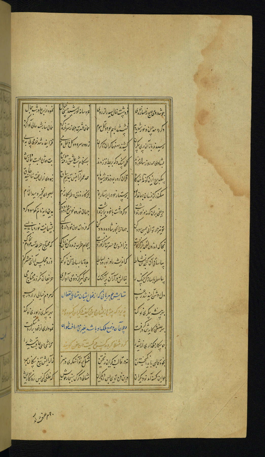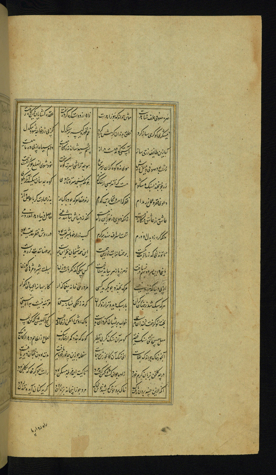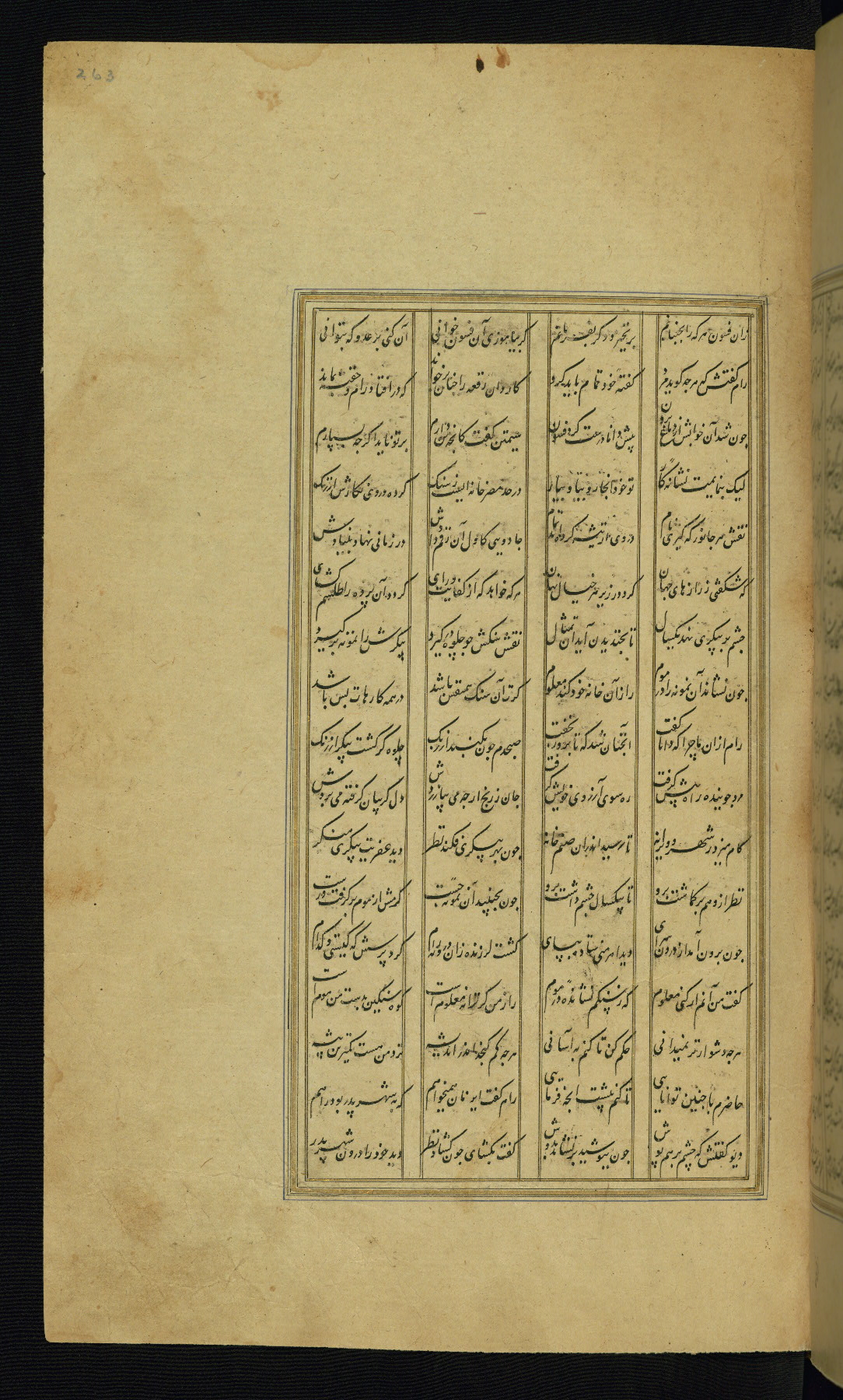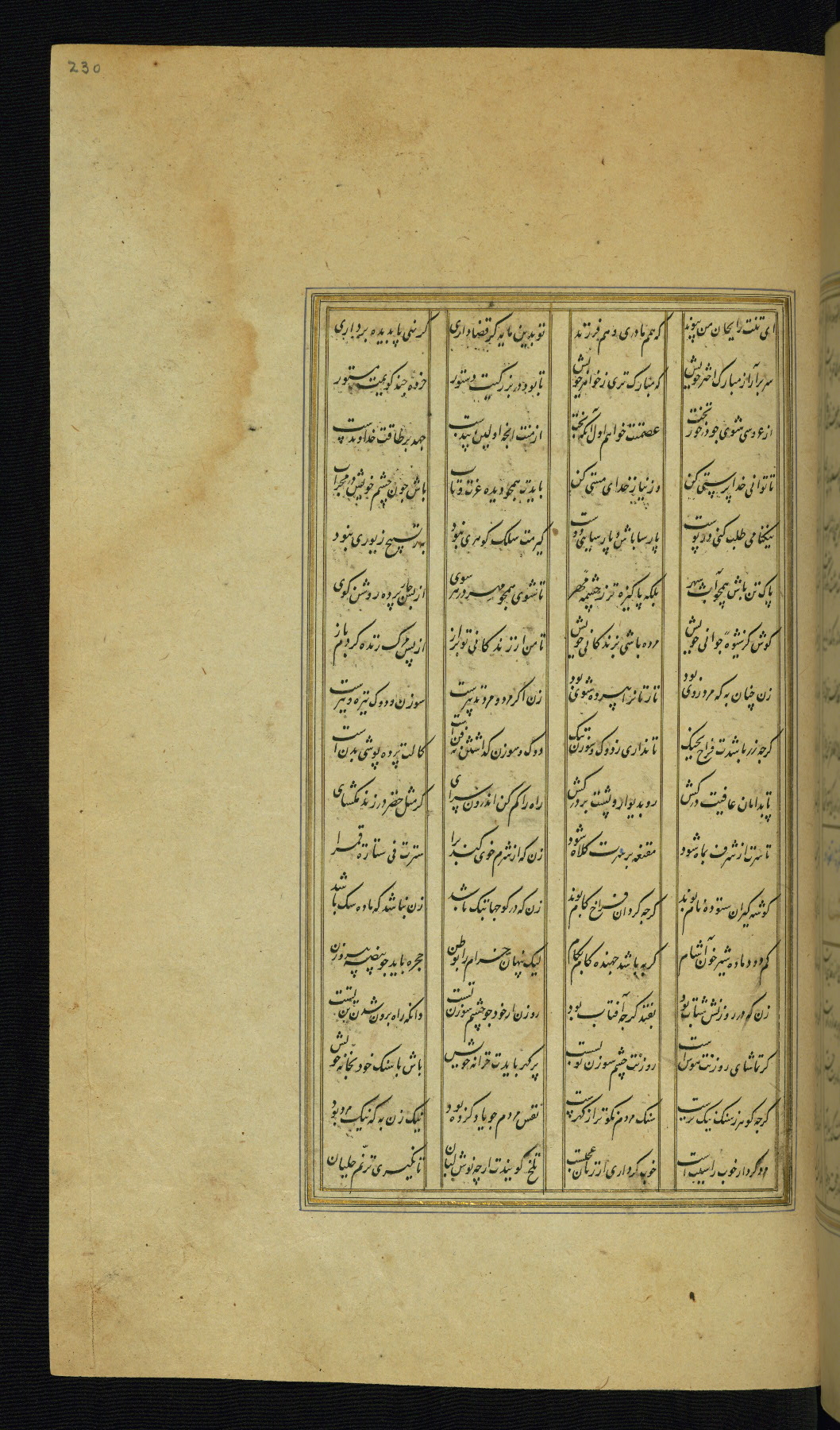 This is an illustrated and illuminated Safavid copy of the Khamsah (quintet) of Amīr Khusraw Dihlavī (d. 725 AH / 1325 CE), written by Pīr Ḥusayn al-Kātib al-Shīrāzī in 935 AH / 1529 CE. The codex opens with a double-page illuminated frontispiece with verses in honor of the poet Mir (Amir) Khusraw (fols. 1b-2a). There are four illuminated incipit pages introducing the individual poems, and thirteen paintings illustrate the text. The lacquer binding, which is not original to the manuscript, has a hunting scene on the upper and lower boards. The lower board is inscribed yā Shāh Najaf (oh, King of Najaf, i.e. ʿAlī) and is dated 1271 AH / 1854 CE.