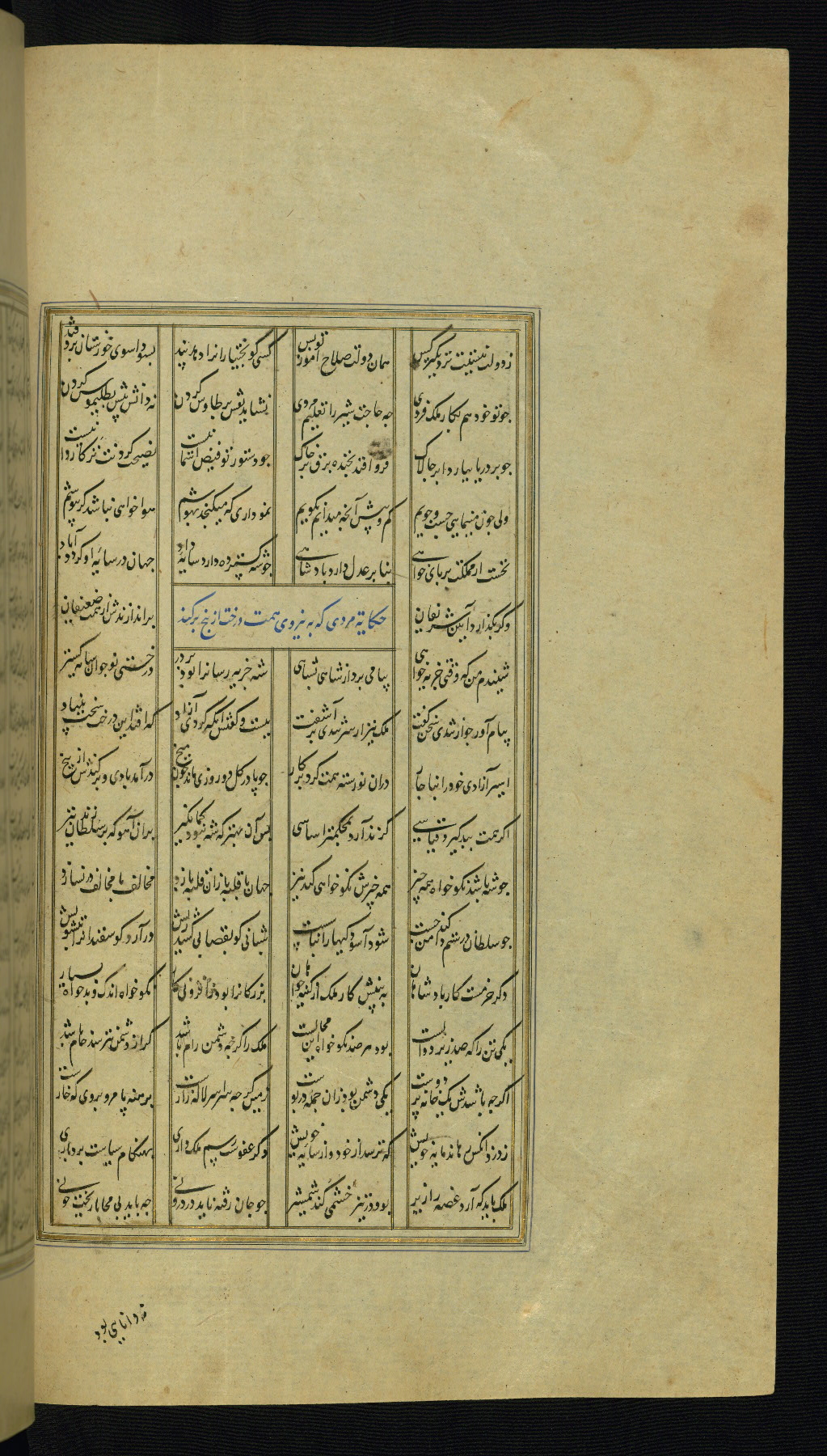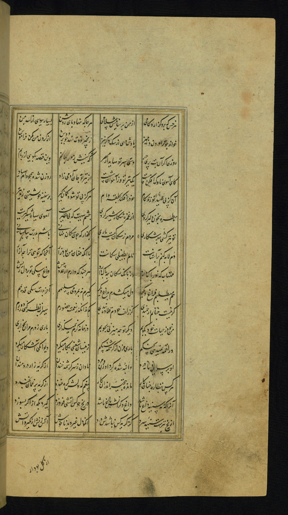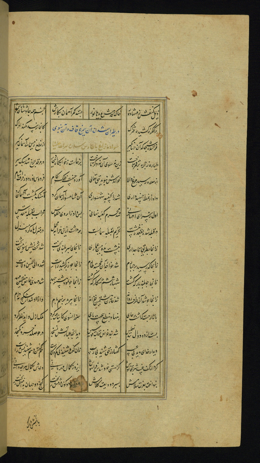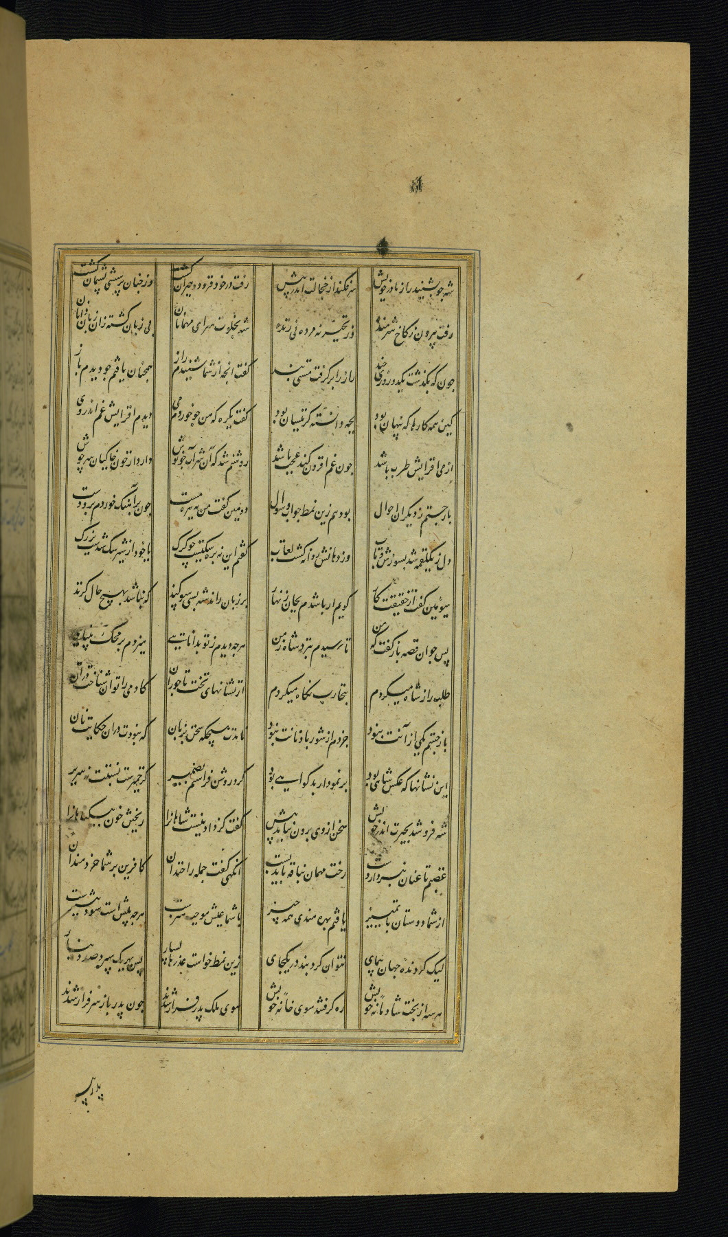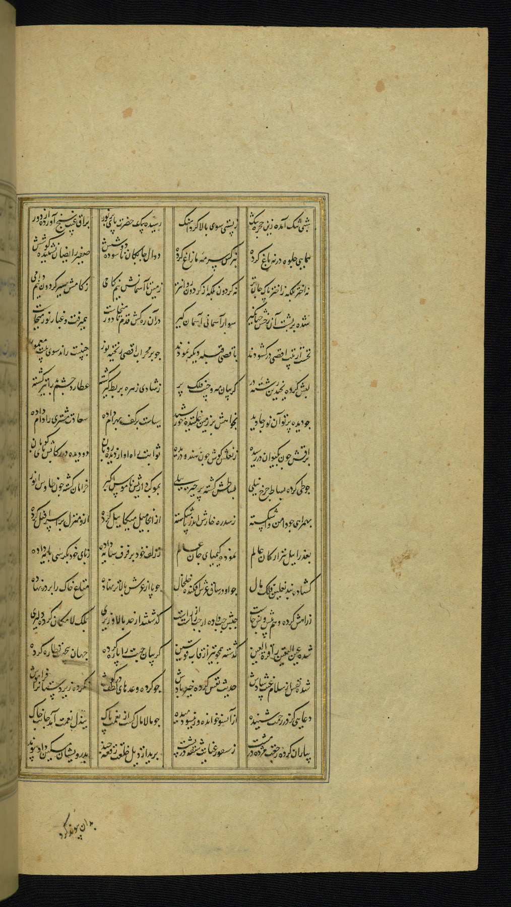 This is an illustrated and illuminated Safavid copy of the Khamsah (quintet) of Amīr Khusraw Dihlavī (d. 725 AH / 1325 CE), written by Pīr Ḥusayn al-Kātib al-Shīrāzī in 935 AH / 1529 CE. The codex opens with a double-page illuminated frontispiece with verses in honor of the poet Mir (Amir) Khusraw (fols. 1b-2a). There are four illuminated incipit pages introducing the individual poems, and thirteen paintings illustrate the text. The lacquer binding, which is not original to the manuscript, has a hunting scene on the upper and lower boards. The lower board is inscribed yā Shāh Najaf (oh, King of Najaf, i.e. ʿAlī) and is dated 1271 AH / 1854 CE.