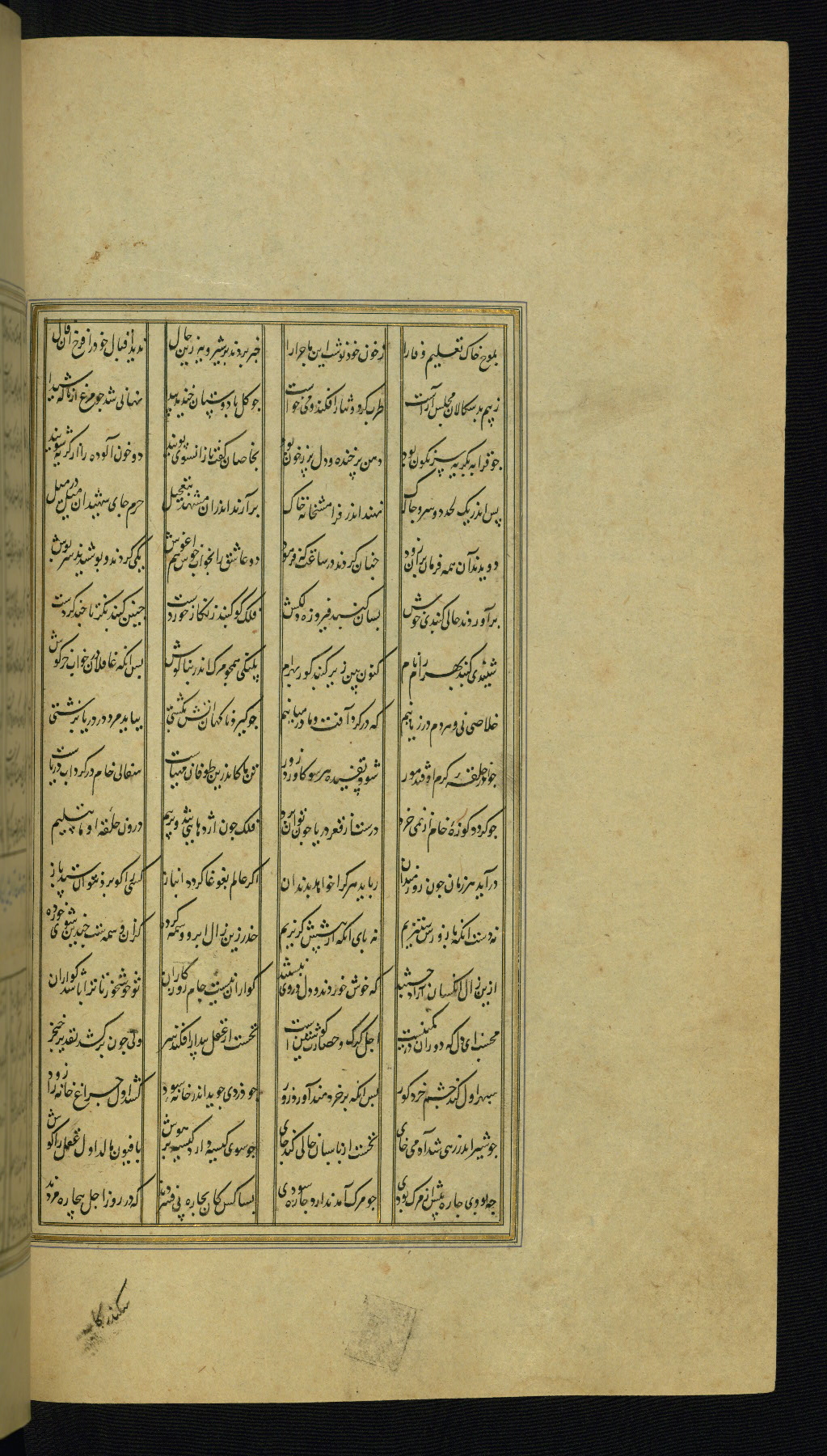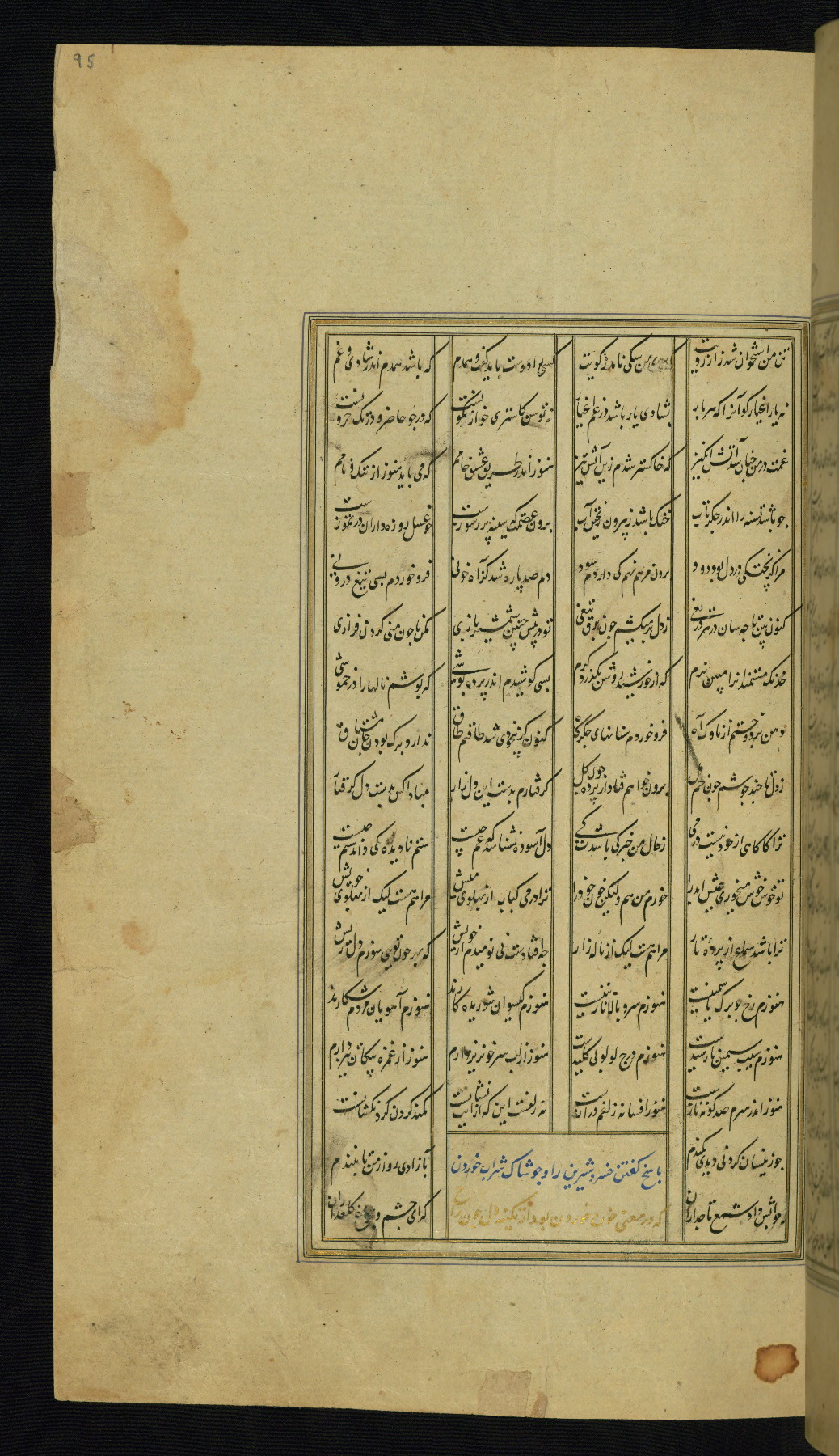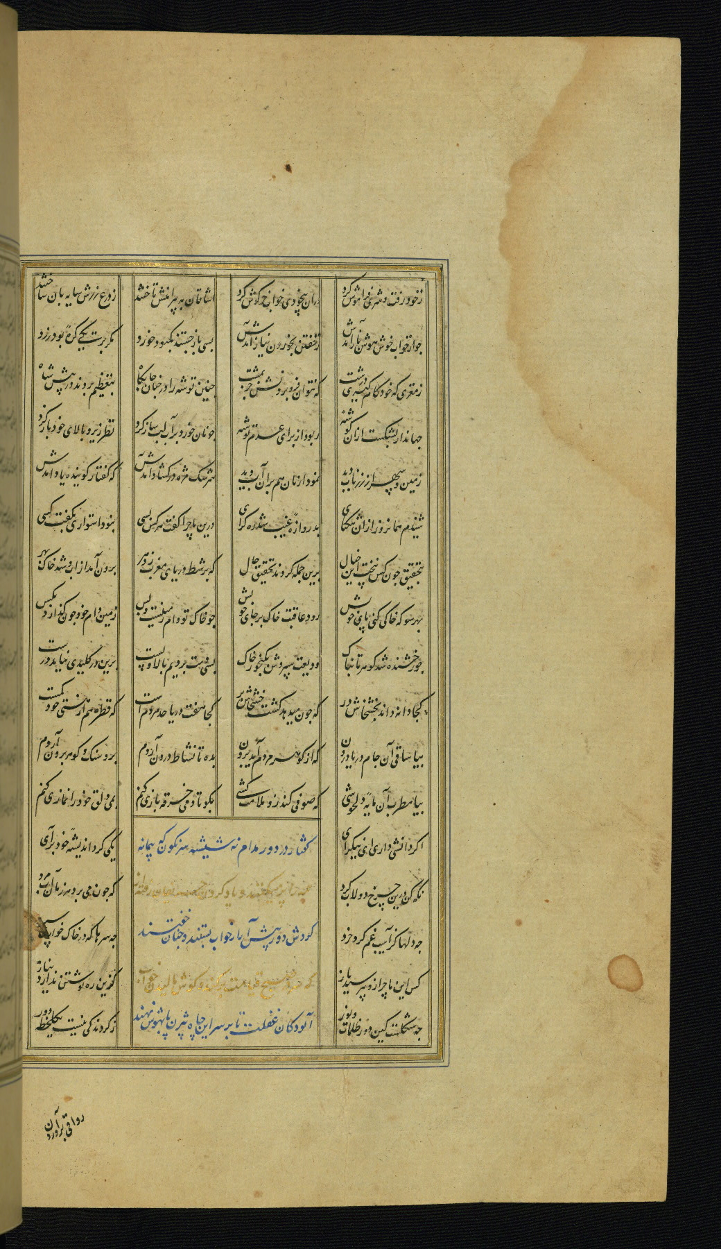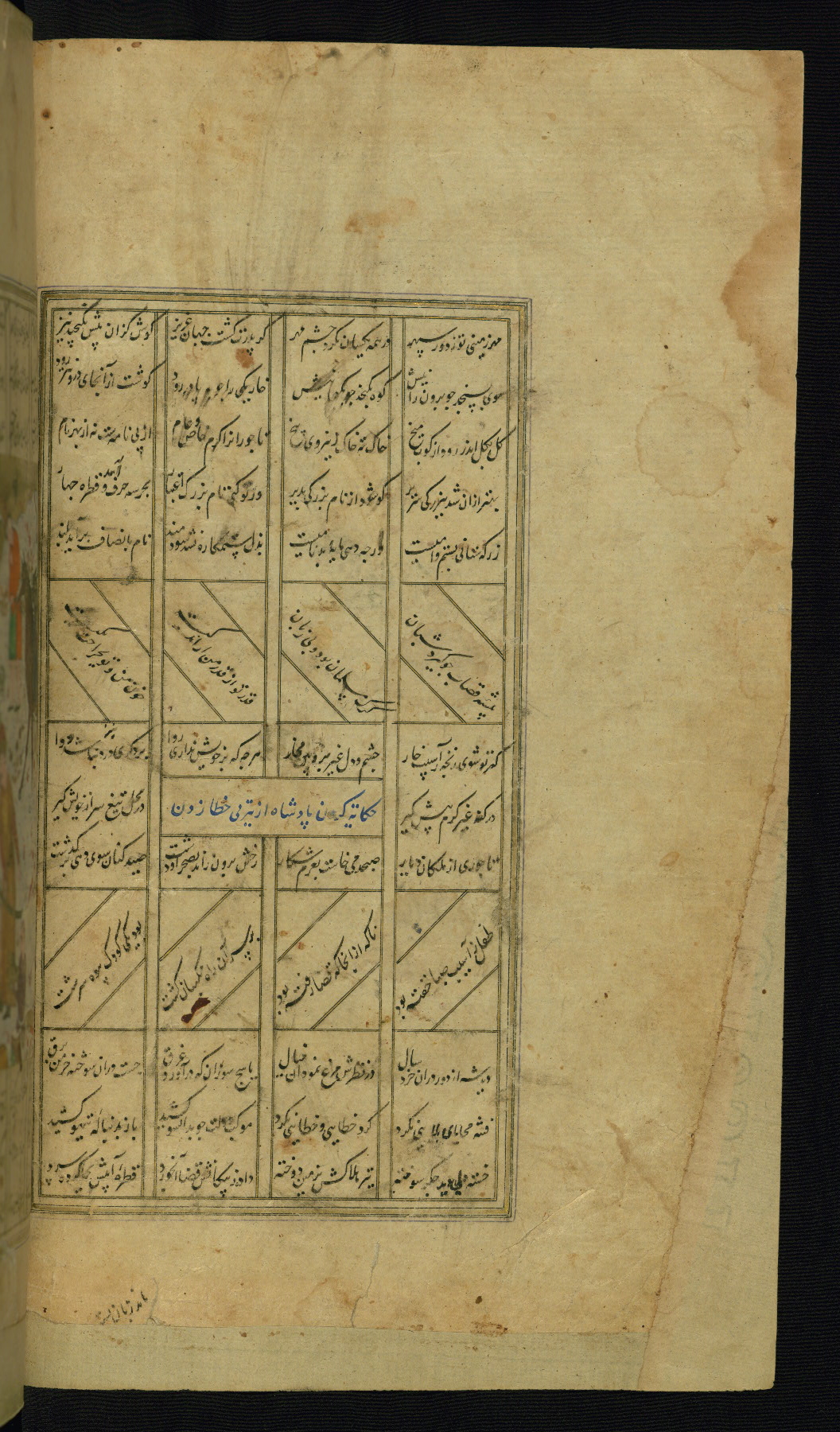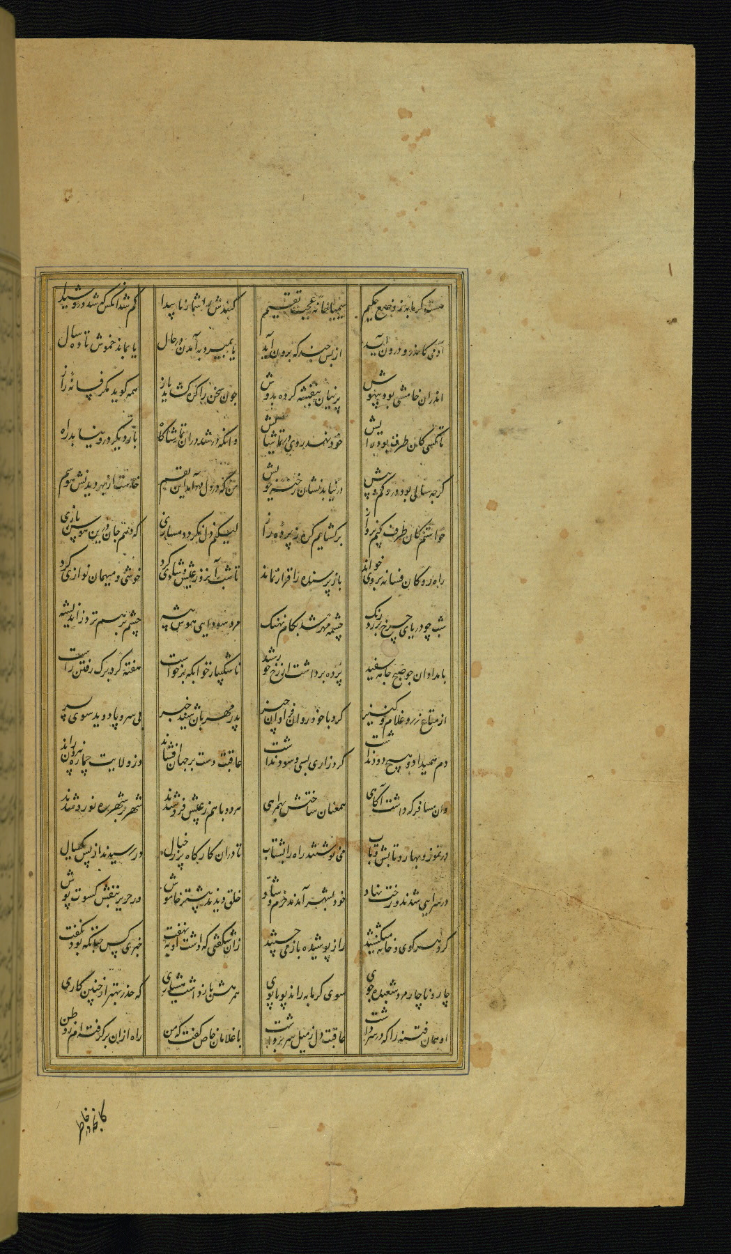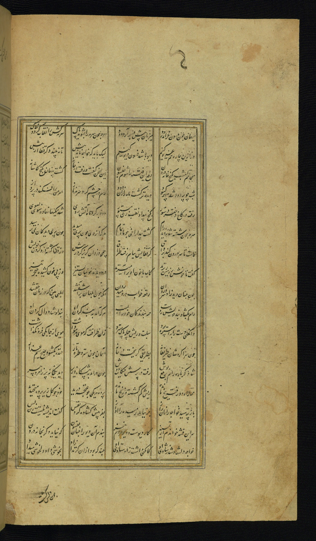 This is an illustrated and illuminated Safavid copy of the Khamsah (quintet) of Amīr Khusraw Dihlavī (d. 725 AH / 1325 CE), written by Pīr Ḥusayn al-Kātib al-Shīrāzī in 935 AH / 1529 CE. The codex opens with a double-page illuminated frontispiece with verses in honor of the poet Mir (Amir) Khusraw (fols. 1b-2a). There are four illuminated incipit pages introducing the individual poems, and thirteen paintings illustrate the text. The lacquer binding, which is not original to the manuscript, has a hunting scene on the upper and lower boards. The lower board is inscribed yā Shāh Najaf (oh, King of Najaf, i.e. ʿAlī) and is dated 1271 AH / 1854 CE.