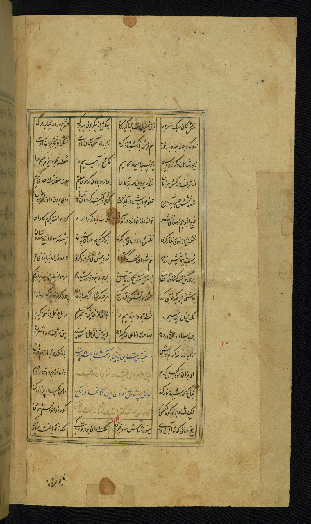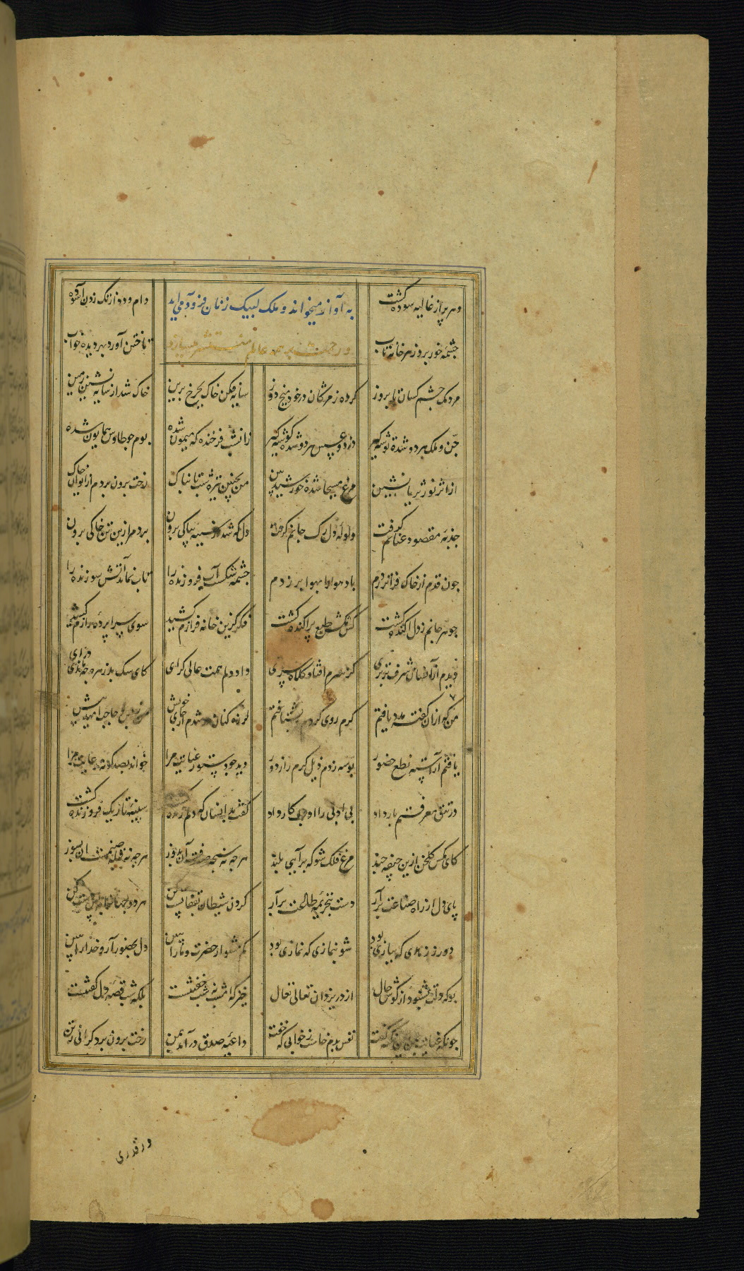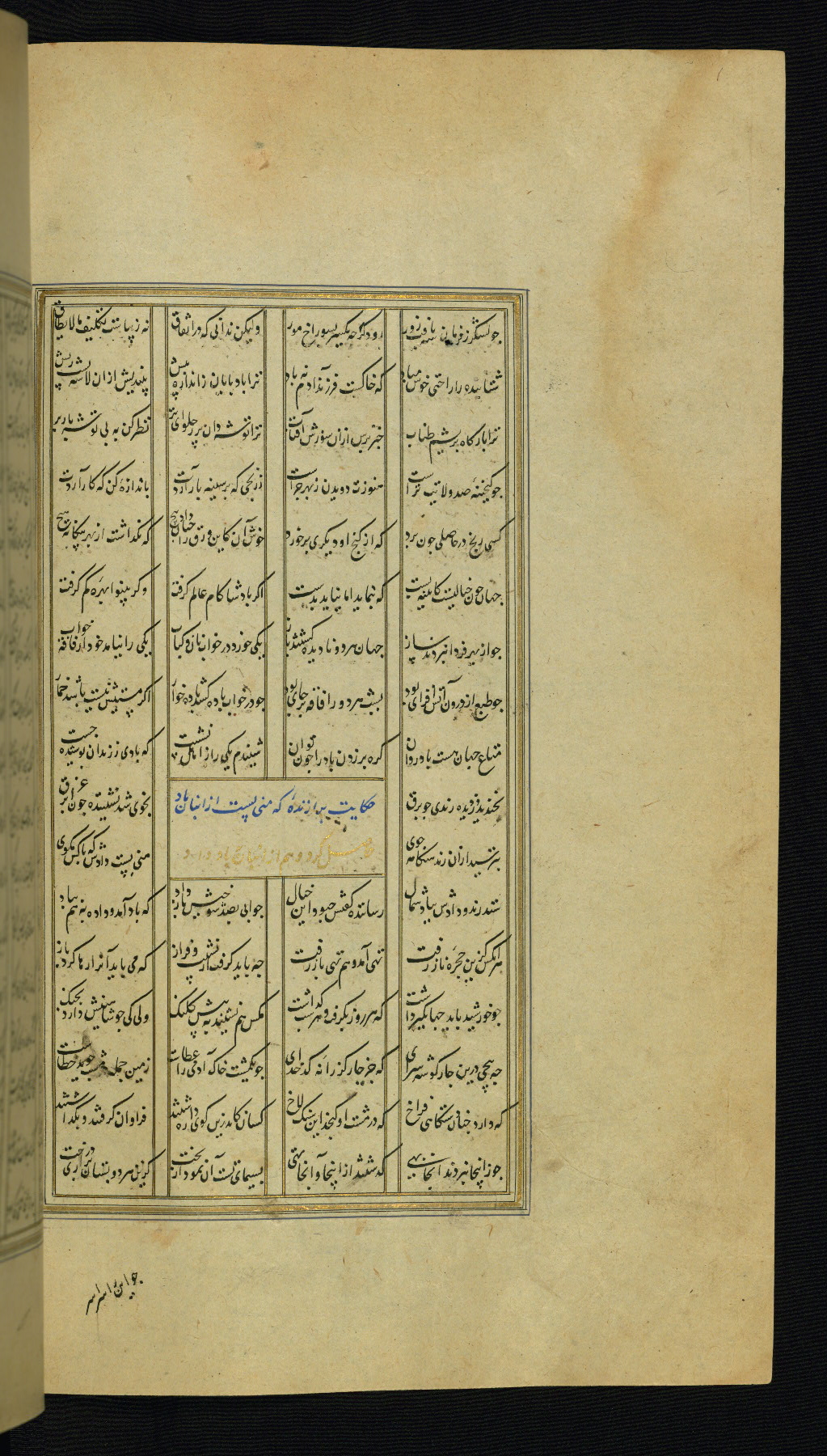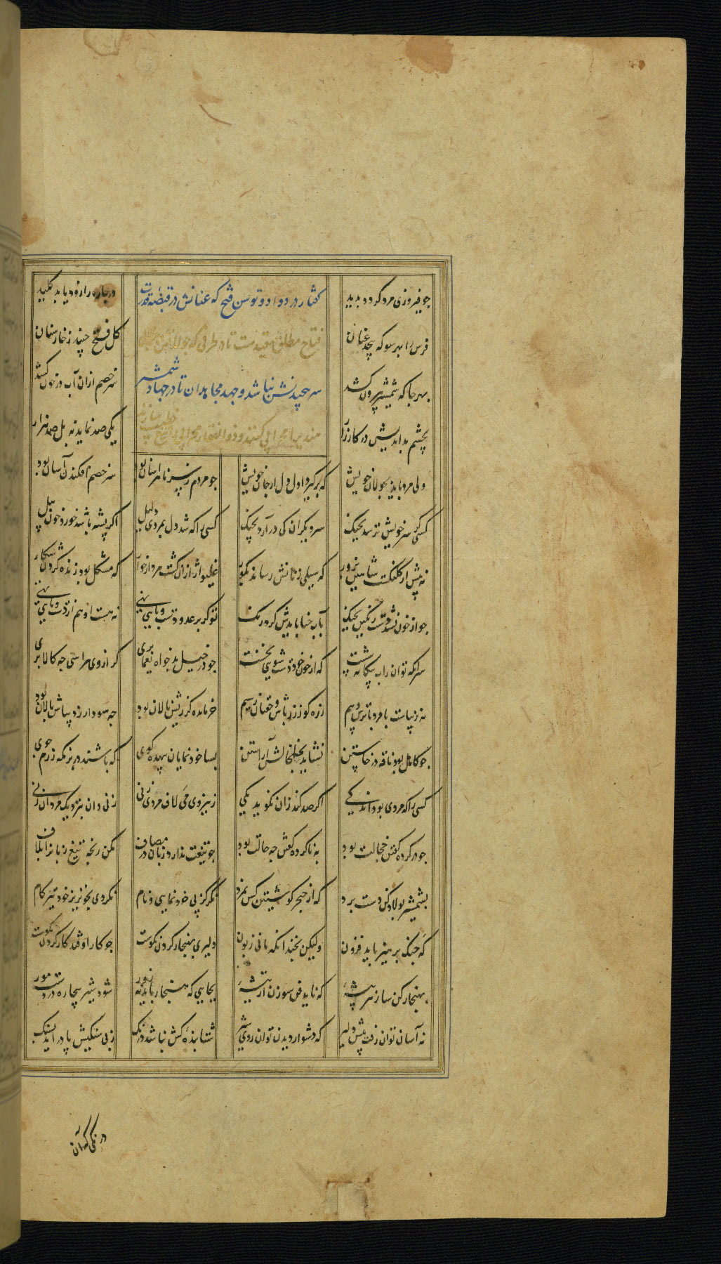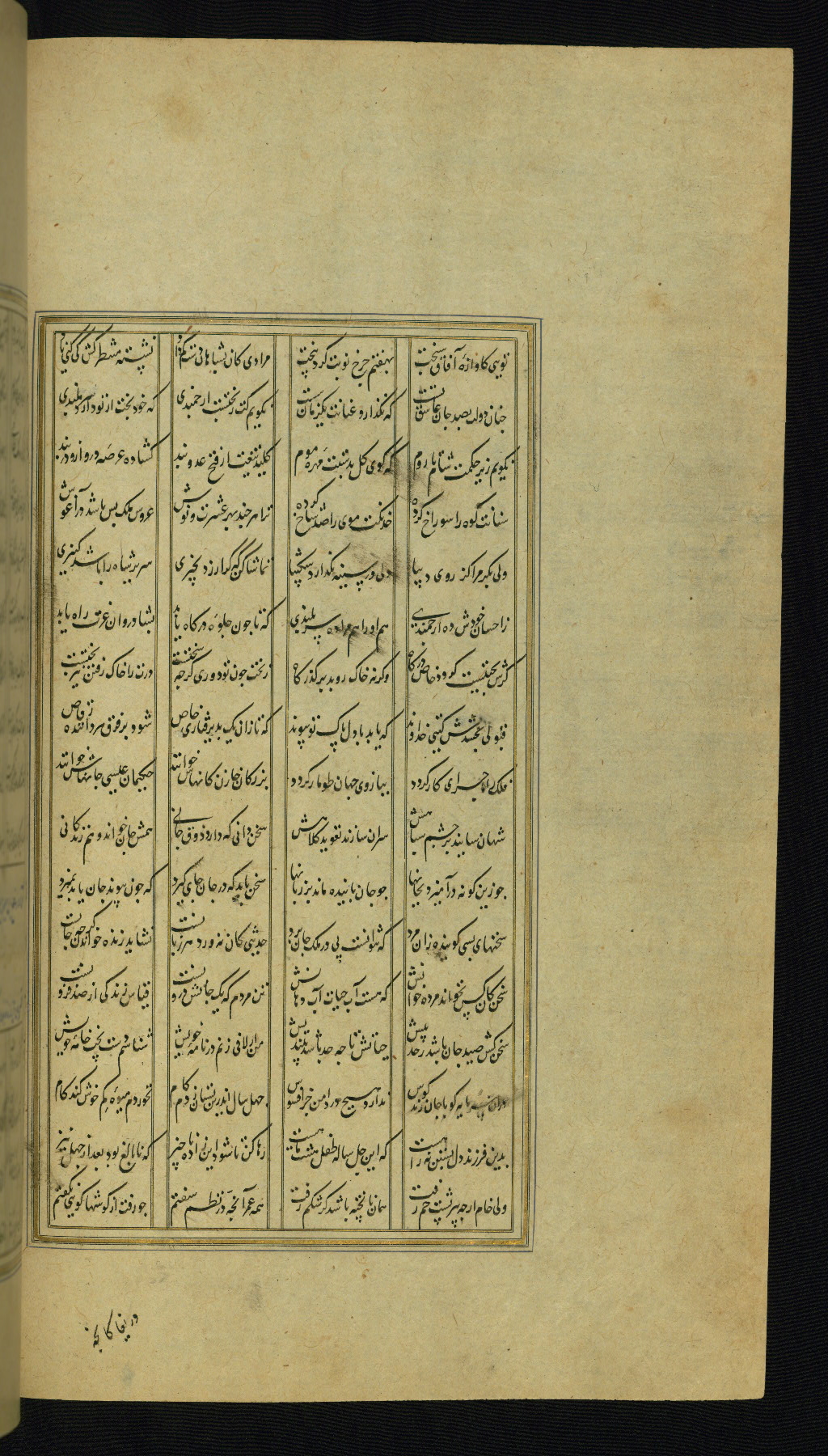 This is an illustrated and illuminated Safavid copy of the Khamsah (quintet) of Amīr Khusraw Dihlavī (d. 725 AH / 1325 CE), written by Pīr Ḥusayn al-Kātib al-Shīrāzī in 935 AH / 1529 CE. The codex opens with a double-page illuminated frontispiece with verses in honor of the poet Mir (Amir) Khusraw (fols. 1b-2a). There are four illuminated incipit pages introducing the individual poems, and thirteen paintings illustrate the text. The lacquer binding, which is not original to the manuscript, has a hunting scene on the upper and lower boards. The lower board is inscribed yā Shāh Najaf (oh, King of Najaf, i.e. ʿAlī) and is dated 1271 AH / 1854 CE.
