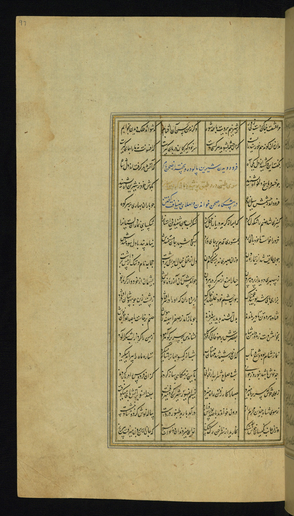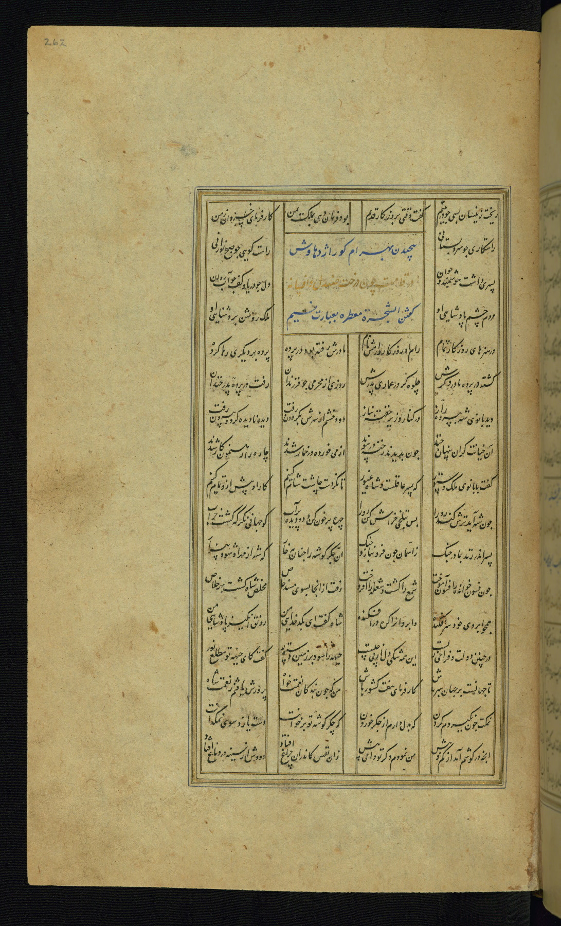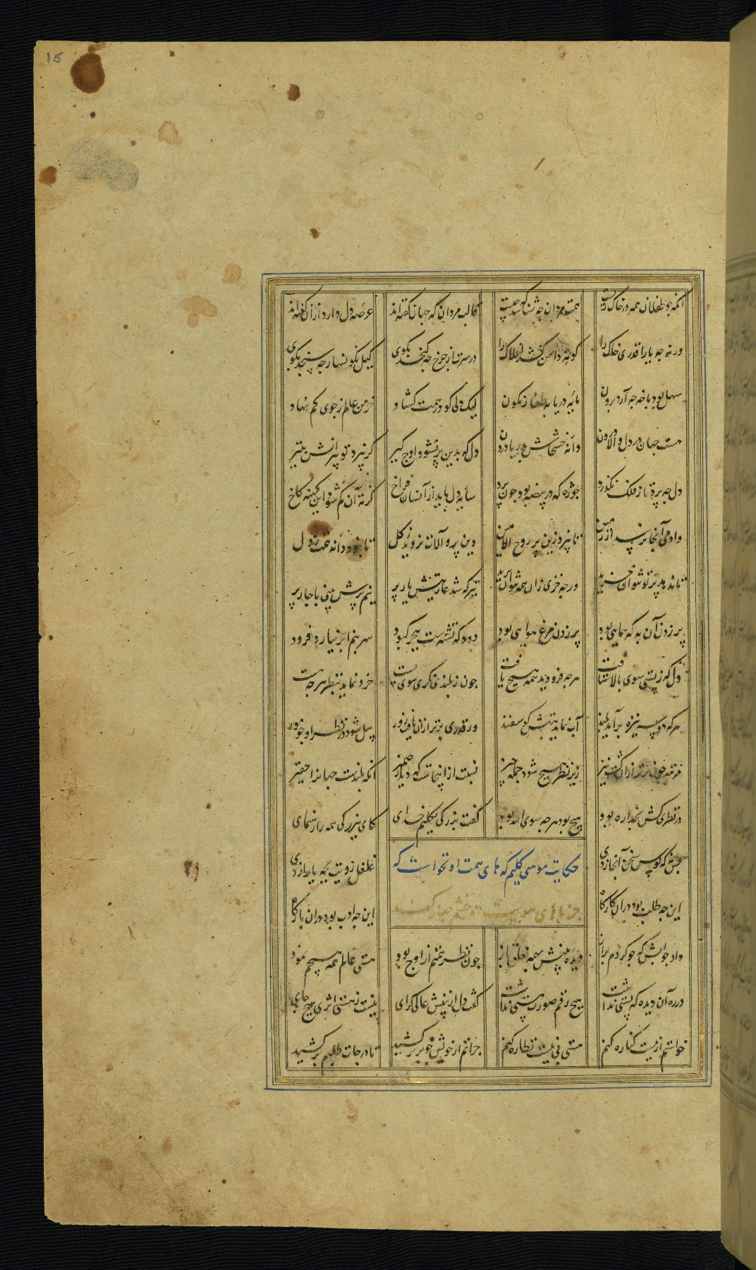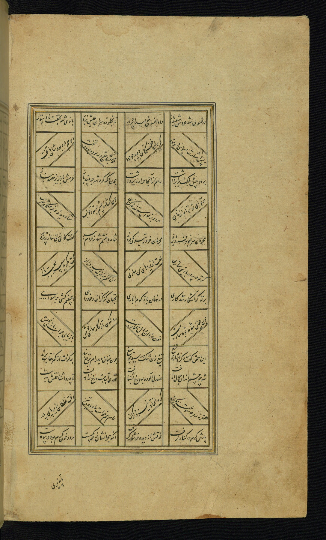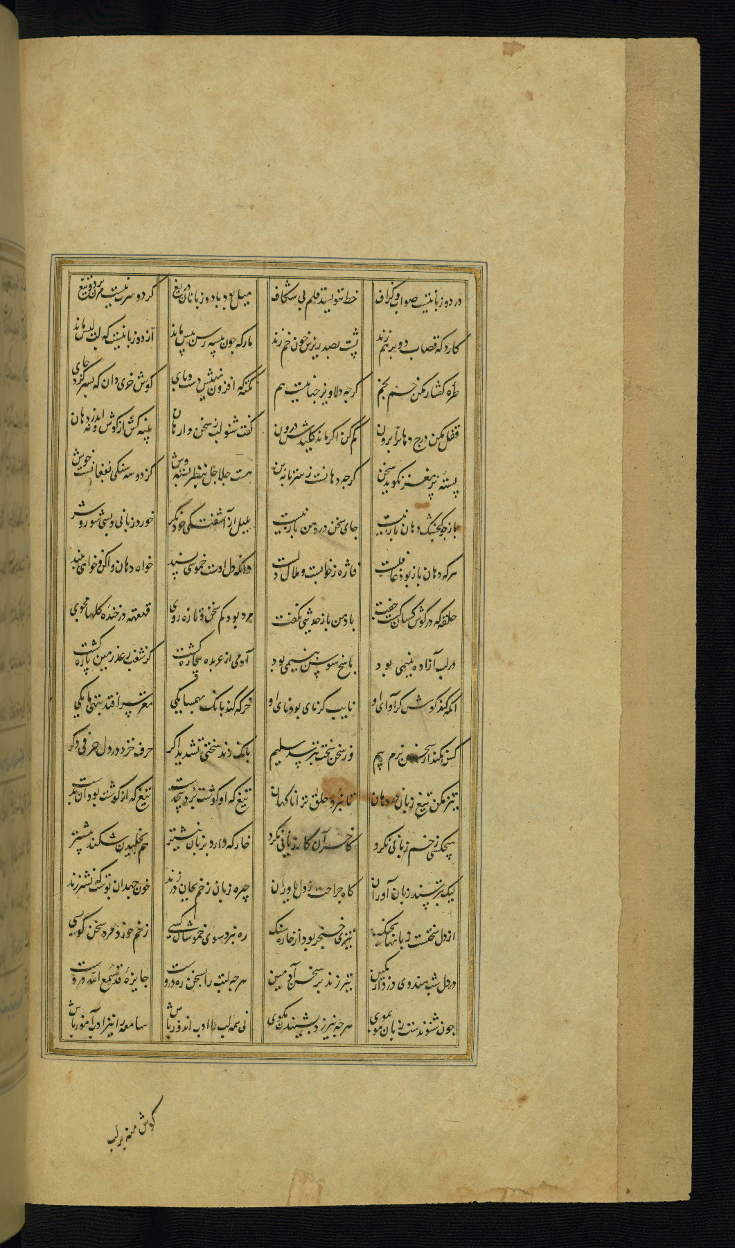 This is an illustrated and illuminated Safavid copy of the Khamsah (quintet) of Amīr Khusraw Dihlavī (d. 725 AH / 1325 CE), written by Pīr Ḥusayn al-Kātib al-Shīrāzī in 935 AH / 1529 CE. The codex opens with a double-page illuminated frontispiece with verses in honor of the poet Mir (Amir) Khusraw (fols. 1b-2a). There are four illuminated incipit pages introducing the individual poems, and thirteen paintings illustrate the text. The lacquer binding, which is not original to the manuscript, has a hunting scene on the upper and lower boards. The lower board is inscribed yā Shāh Najaf (oh, King of Najaf, i.e. ʿAlī) and is dated 1271 AH / 1854 CE.