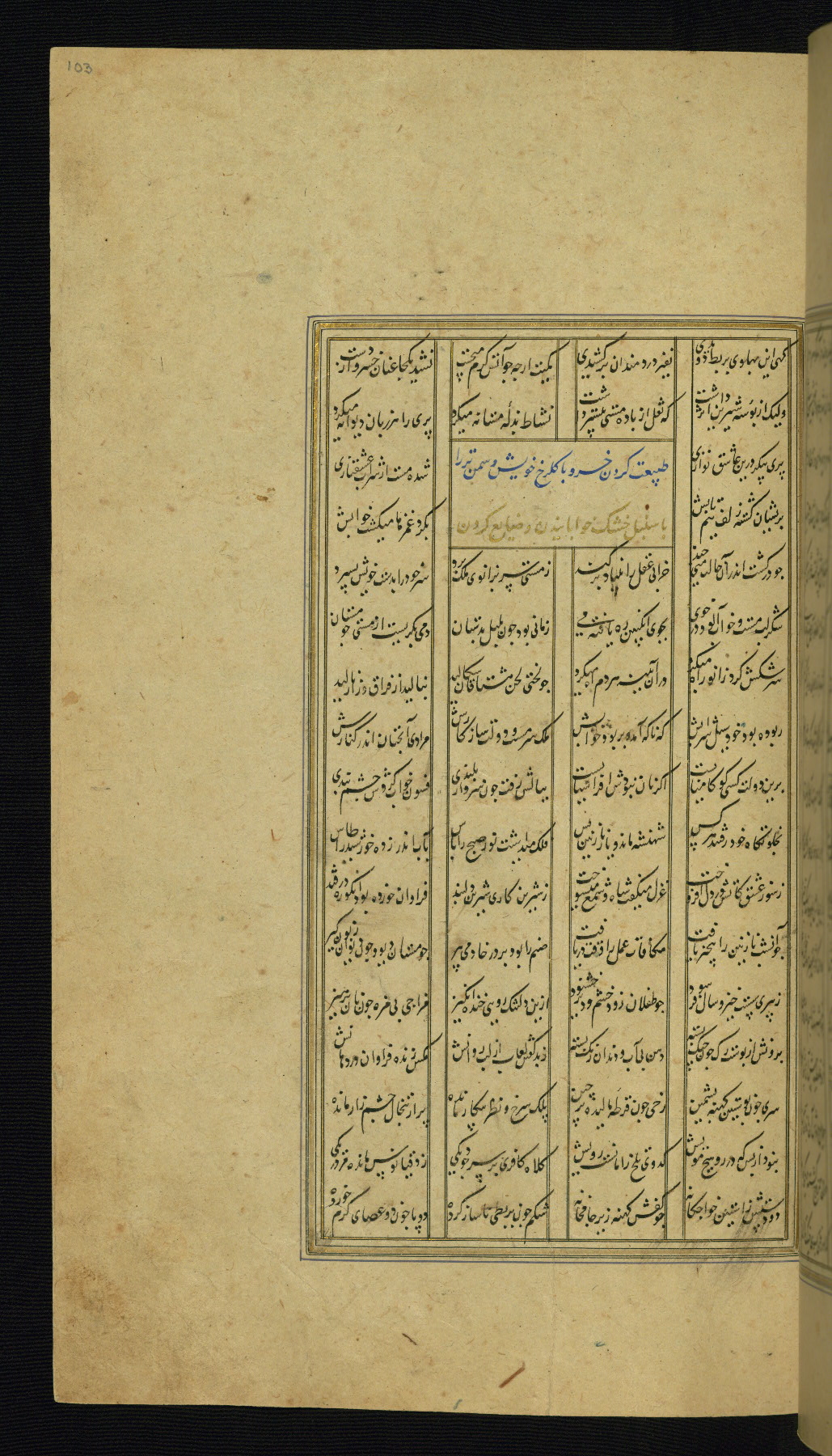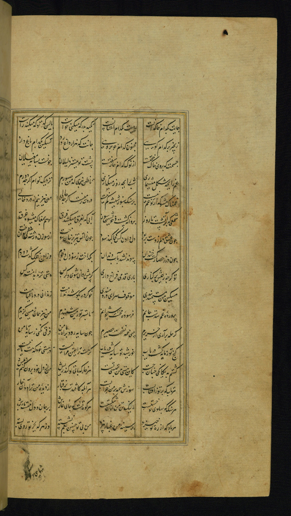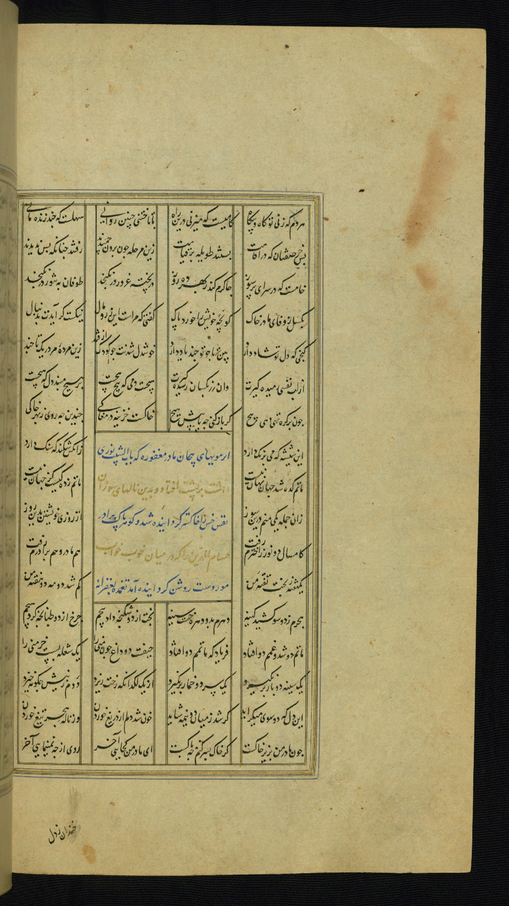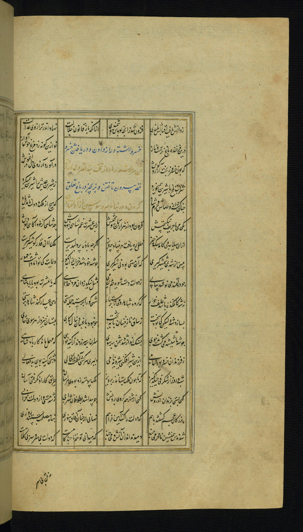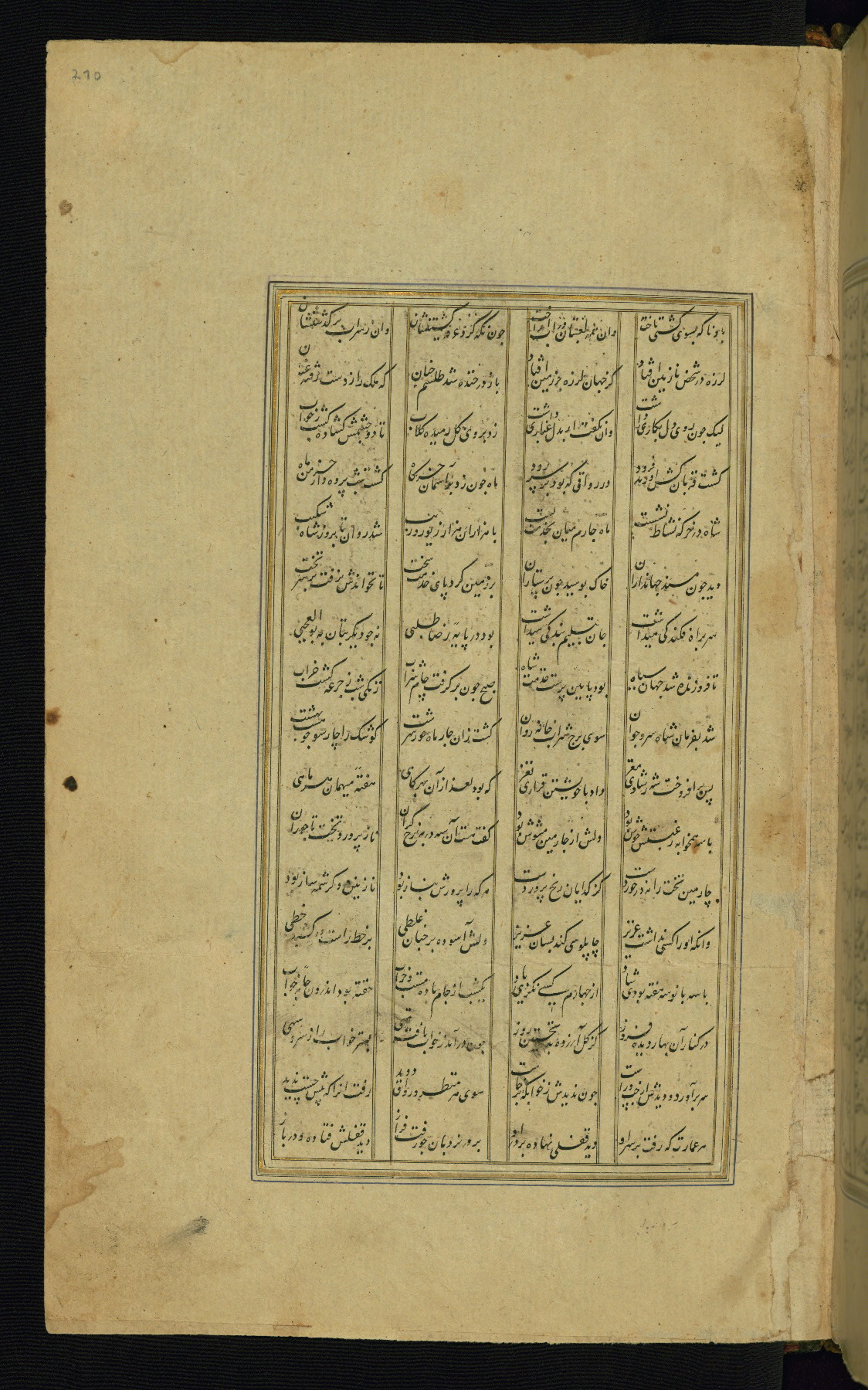 This is an illustrated and illuminated Safavid copy of the Khamsah (quintet) of Amīr Khusraw Dihlavī (d. 725 AH / 1325 CE), written by Pīr Ḥusayn al-Kātib al-Shīrāzī in 935 AH / 1529 CE. The codex opens with a double-page illuminated frontispiece with verses in honor of the poet Mir (Amir) Khusraw (fols. 1b-2a). There are four illuminated incipit pages introducing the individual poems, and thirteen paintings illustrate the text. The lacquer binding, which is not original to the manuscript, has a hunting scene on the upper and lower boards. The lower board is inscribed yā Shāh Najaf (oh, King of Najaf, i.e. ʿAlī) and is dated 1271 AH / 1854 CE.